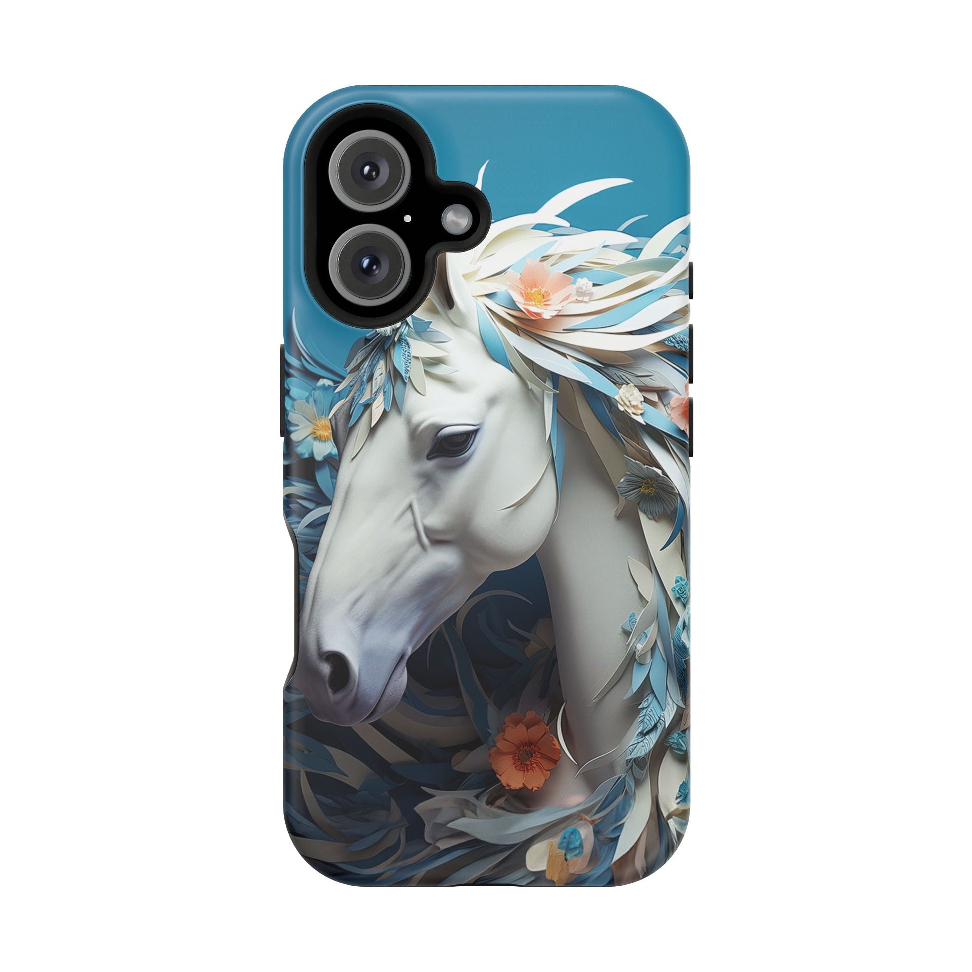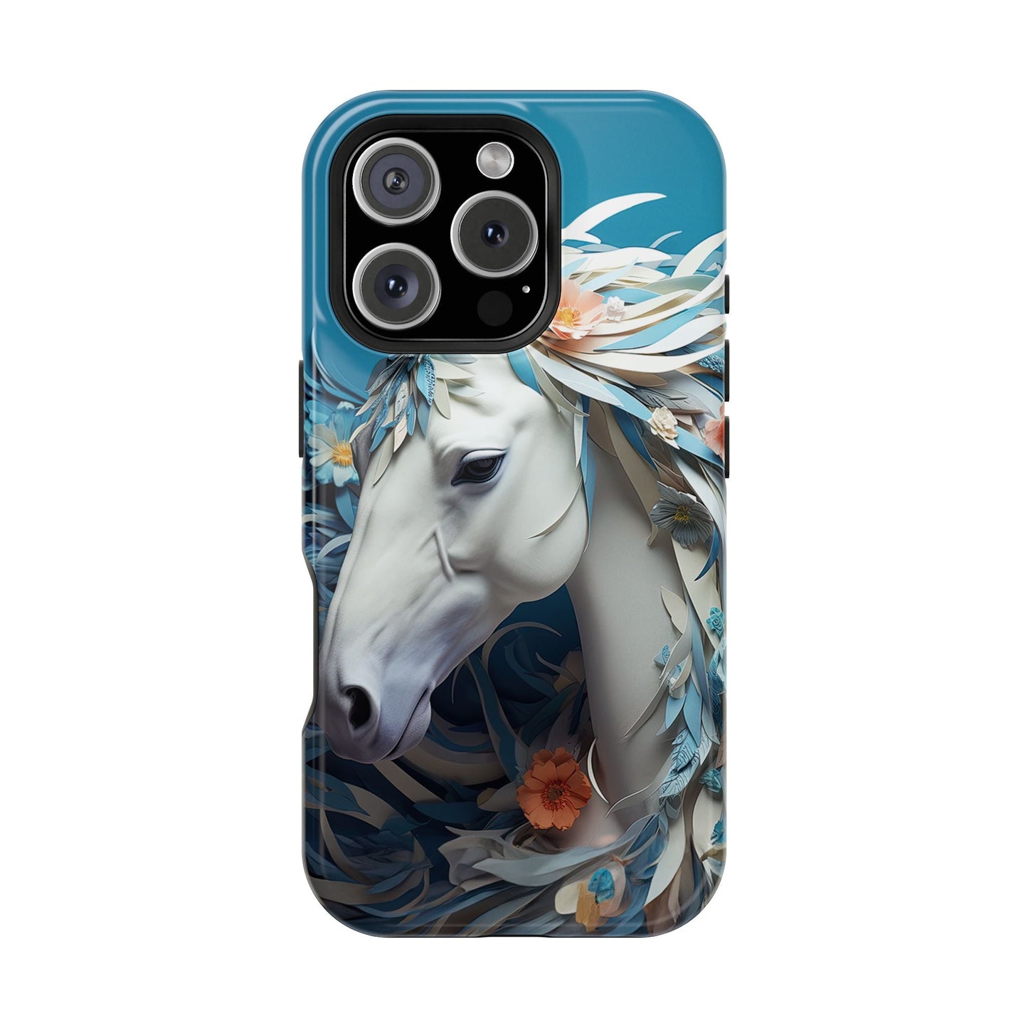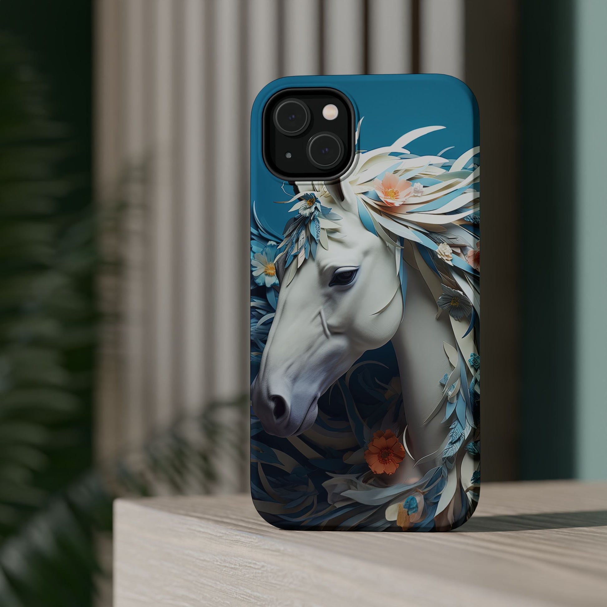 Embrace the beauty of nature with our Floral Horse MagSafe iPhone Case! This enchanting design features a graceful white horse adorned with a vibrant mane of paper flowers, set against a serene blue backdrop. It's a captivating scene that brings a touch of elegance and tranquility to your phone. Crafted with a dual-layer design, combining a shock-absorbing TPU inner layer and a sturdy polycarbonate outer shell, this case provides reliable protection against everyday bumps and drops. With its slim and lightweight profile, this case is perfect for those who want to keep their phone stylish and protected without adding bulk.