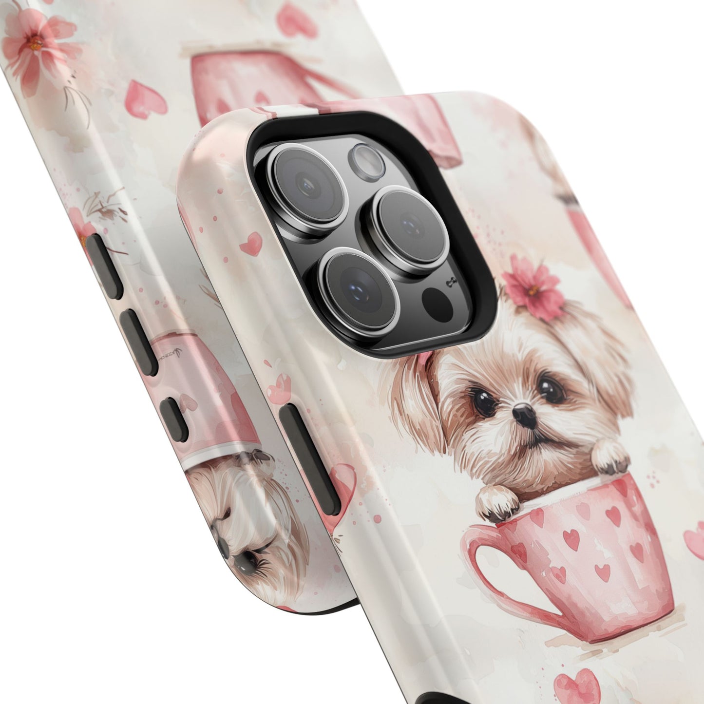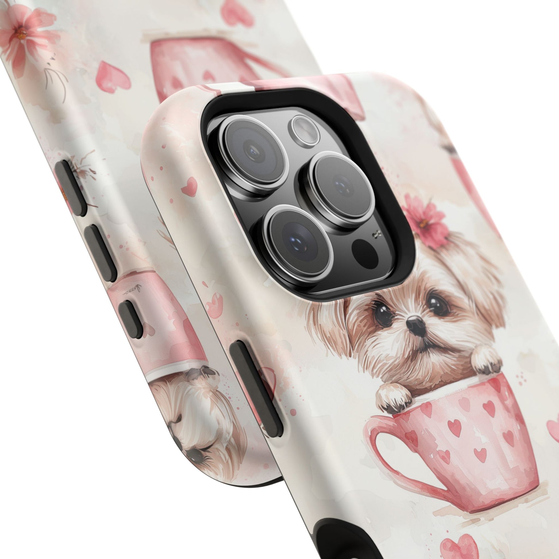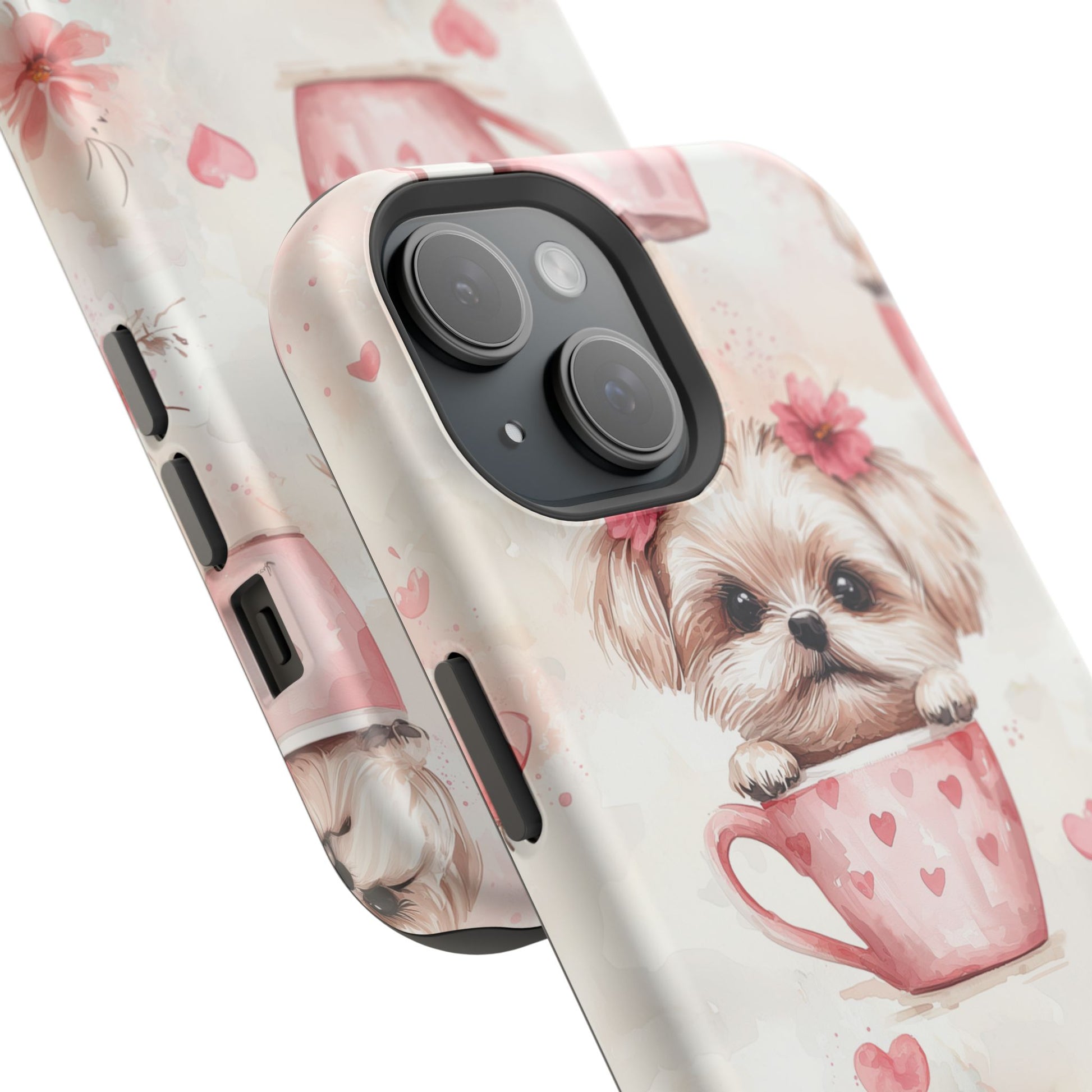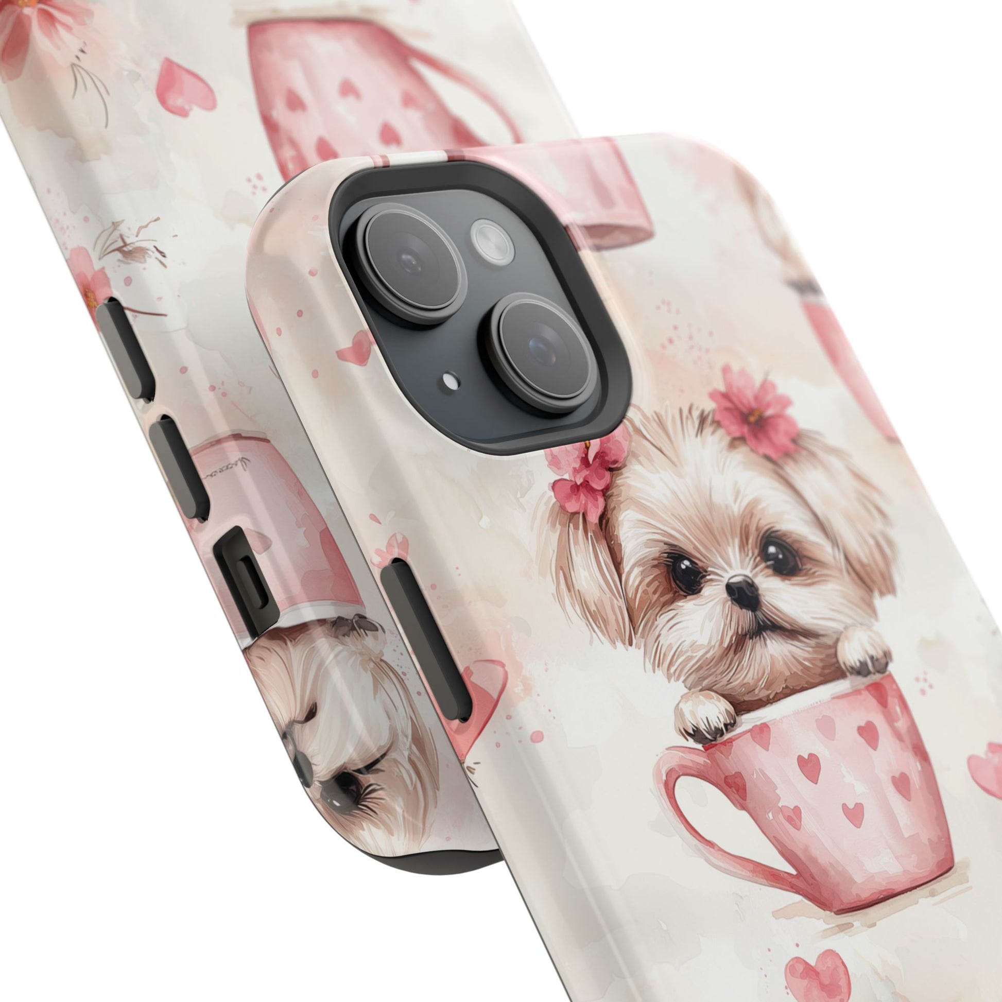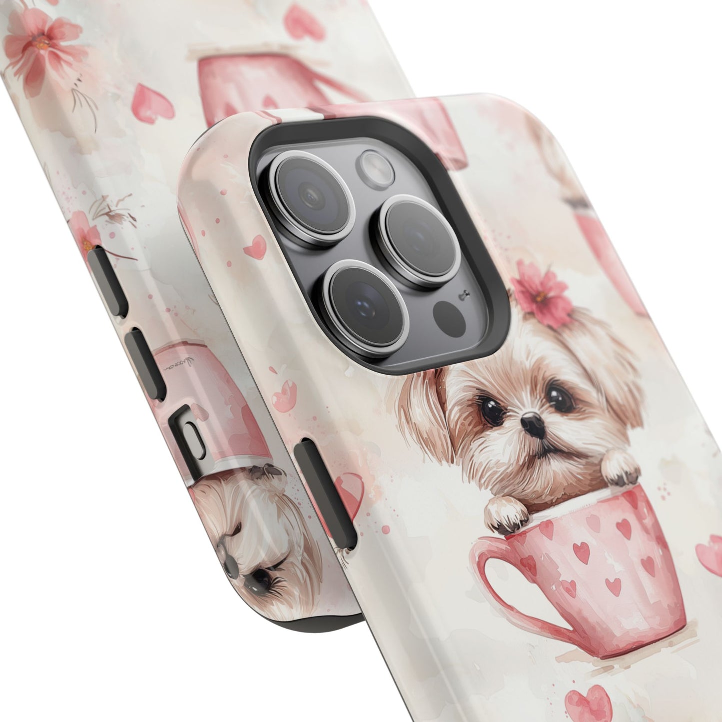Floral Puppy in Teacup MagSafe iPhone Case – Cute Pink Flower Design, Tough Dual-Layer Protection
