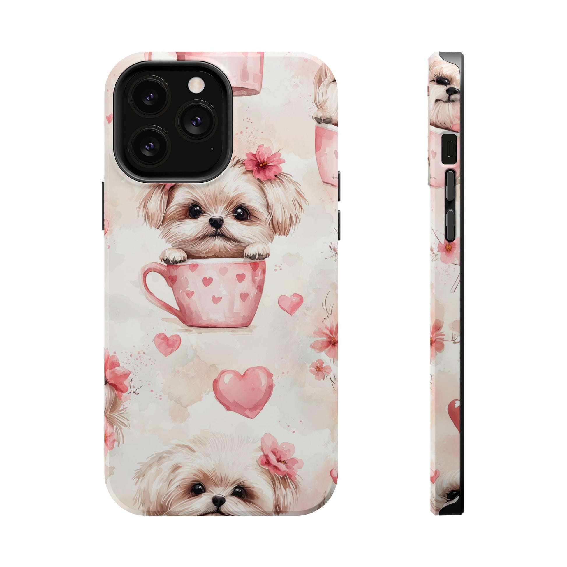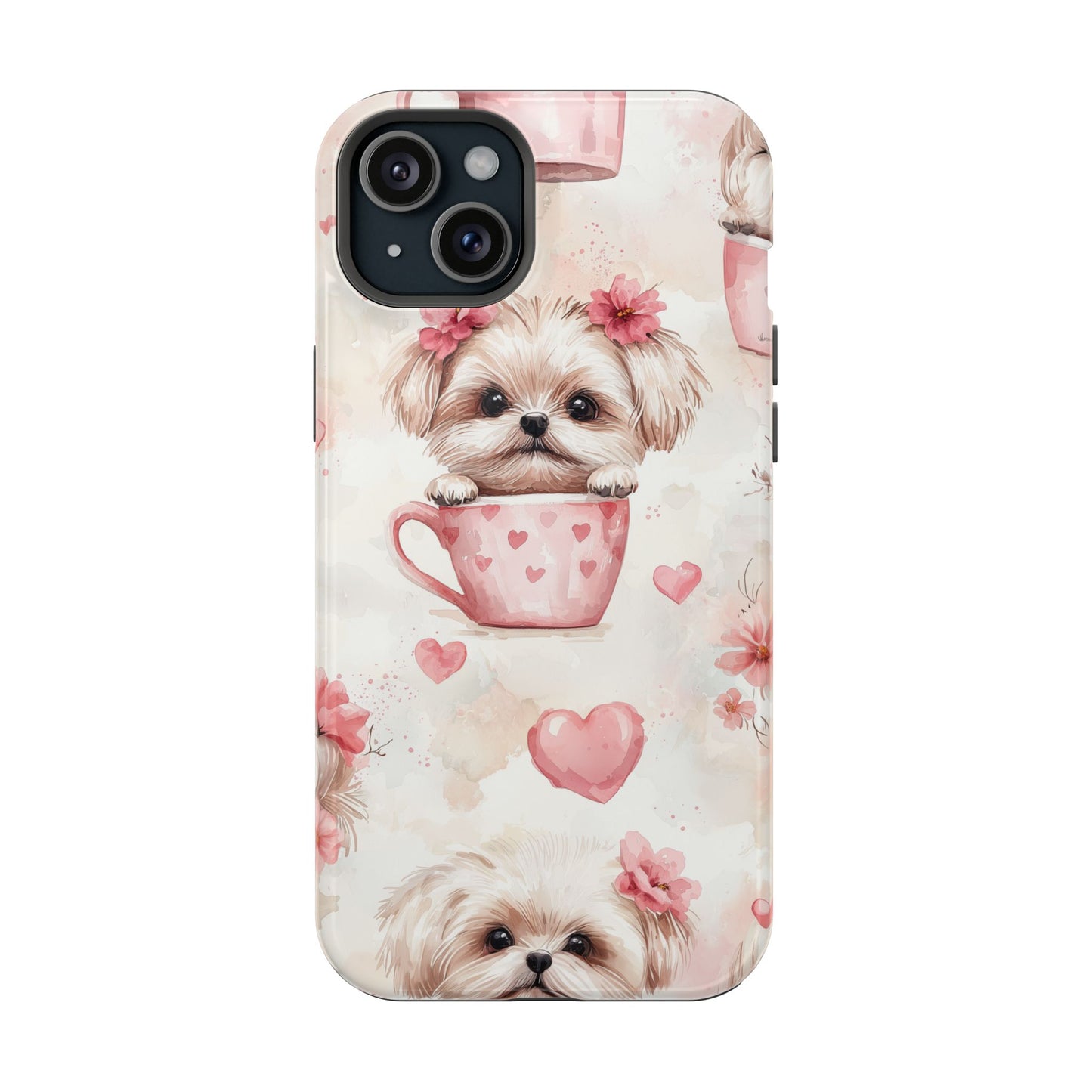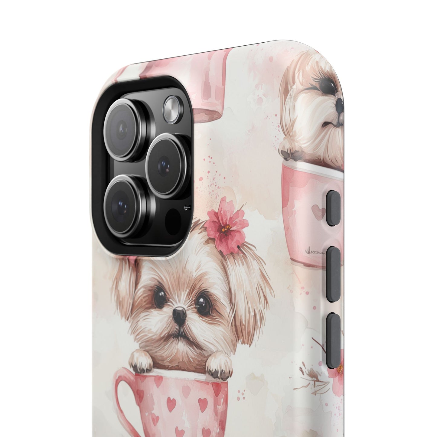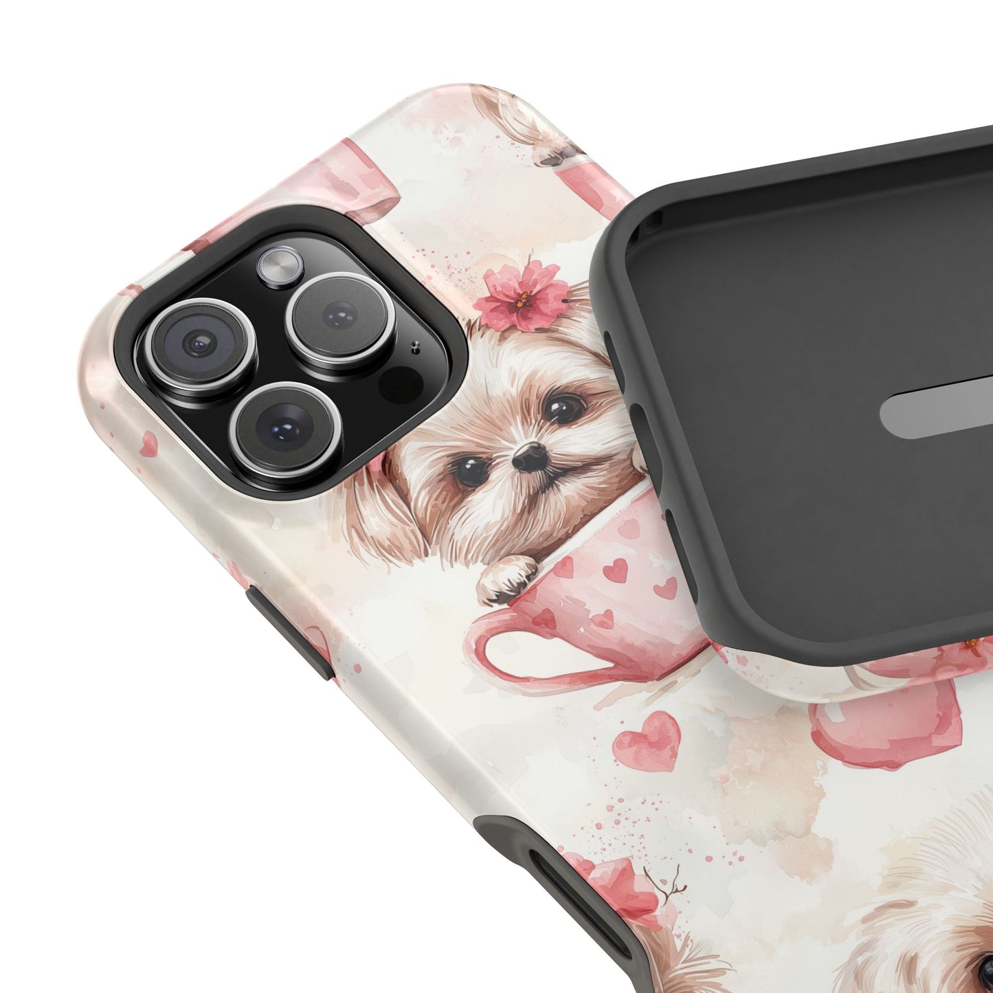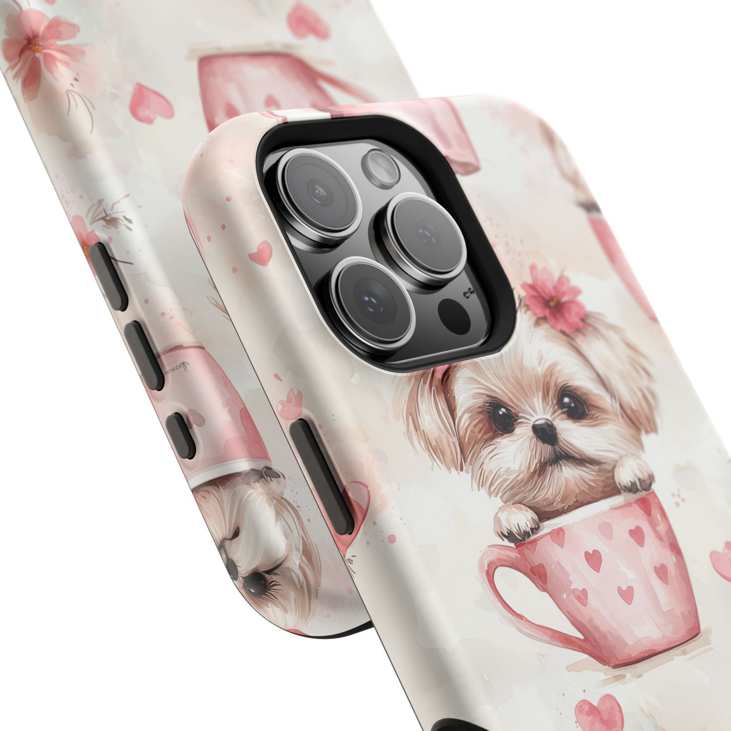 Floral Puppy in Teacup MagSafe iPhone Case – Cute Pink Flower Design, Tough Dual-Layer Protection