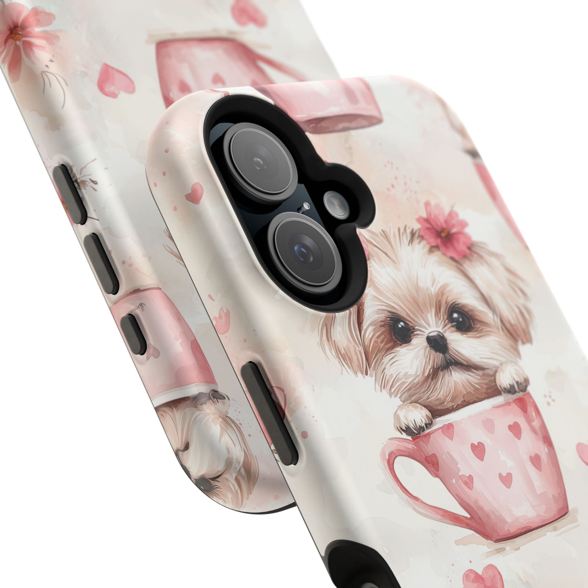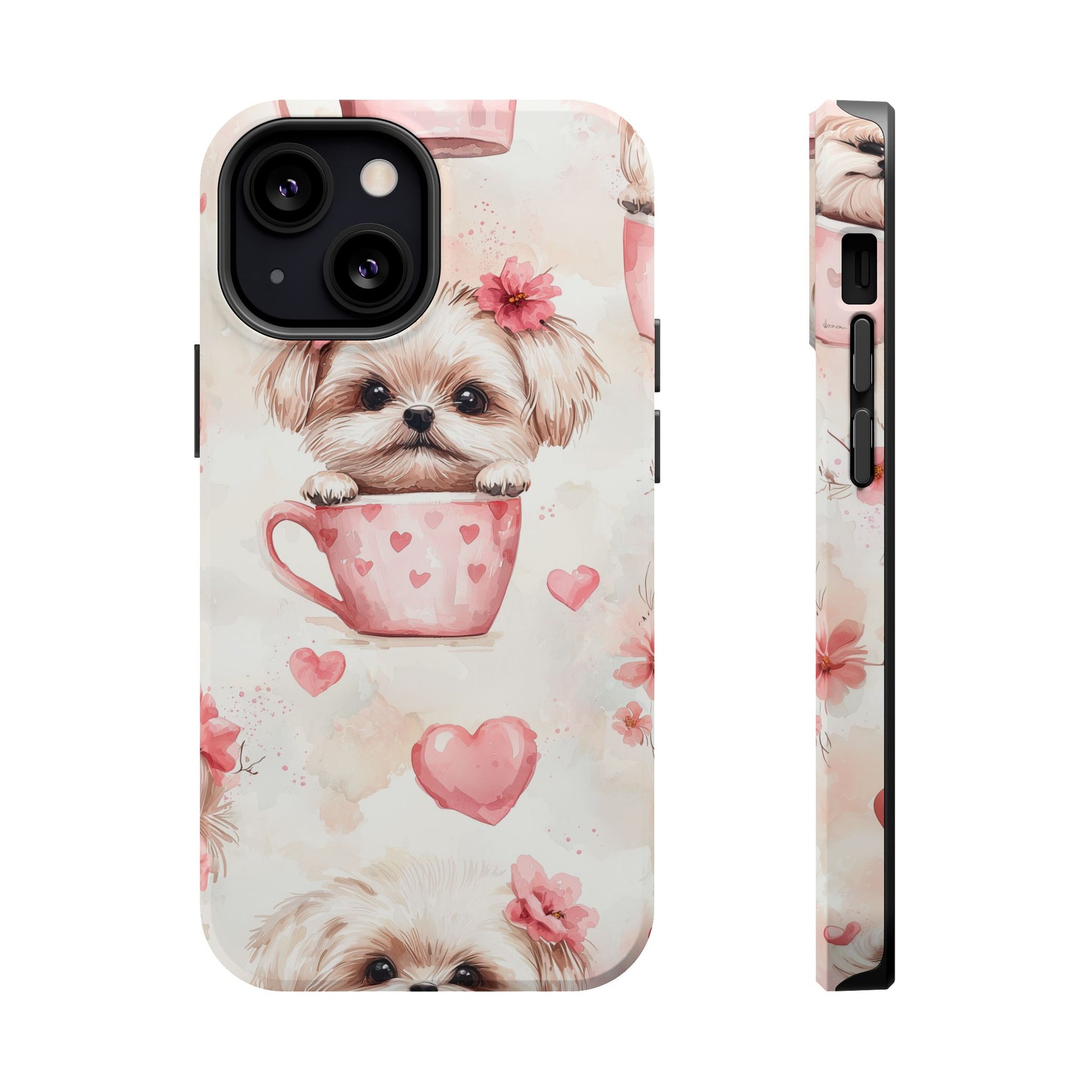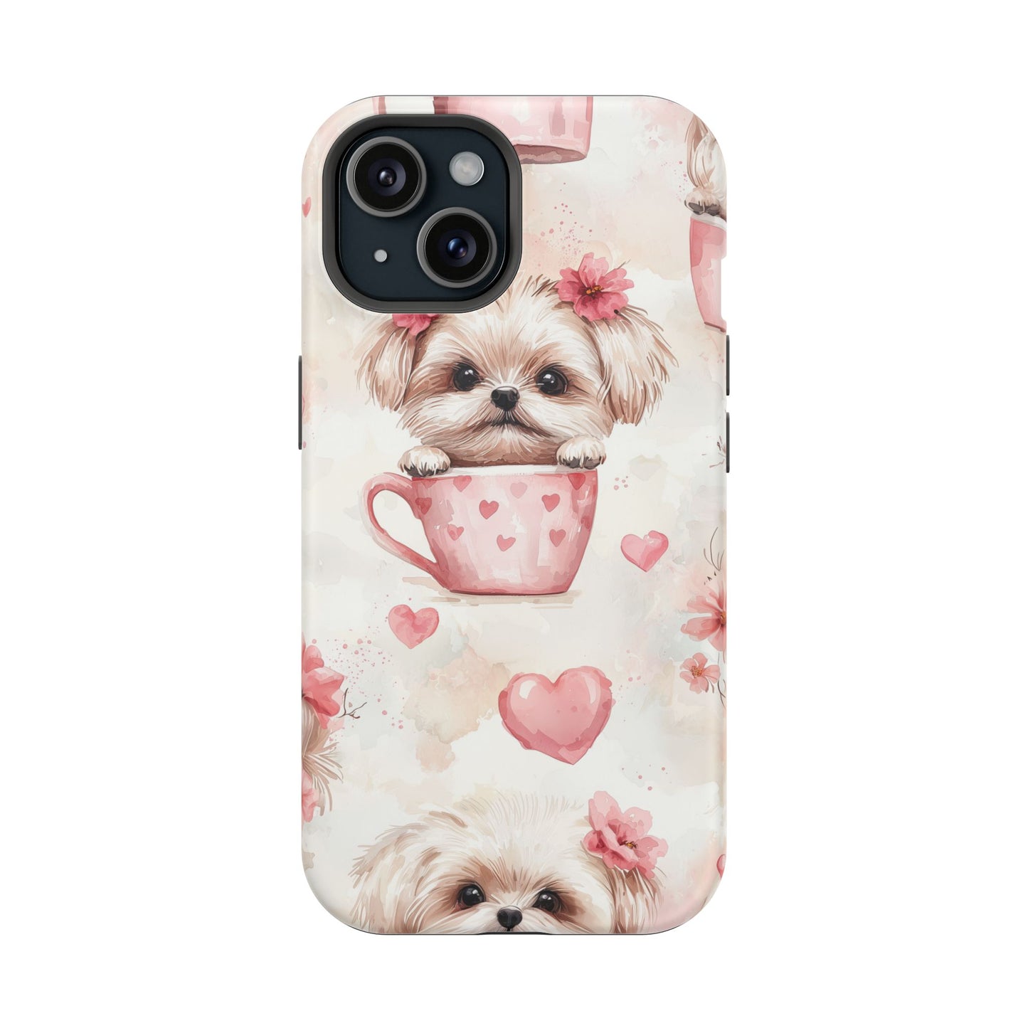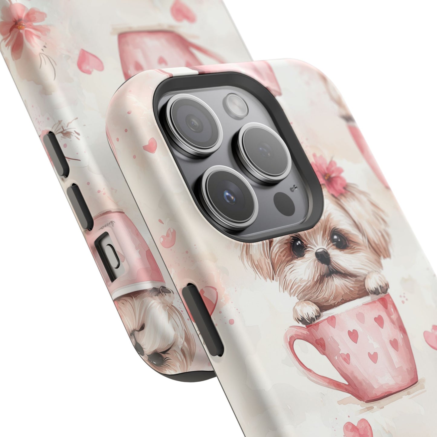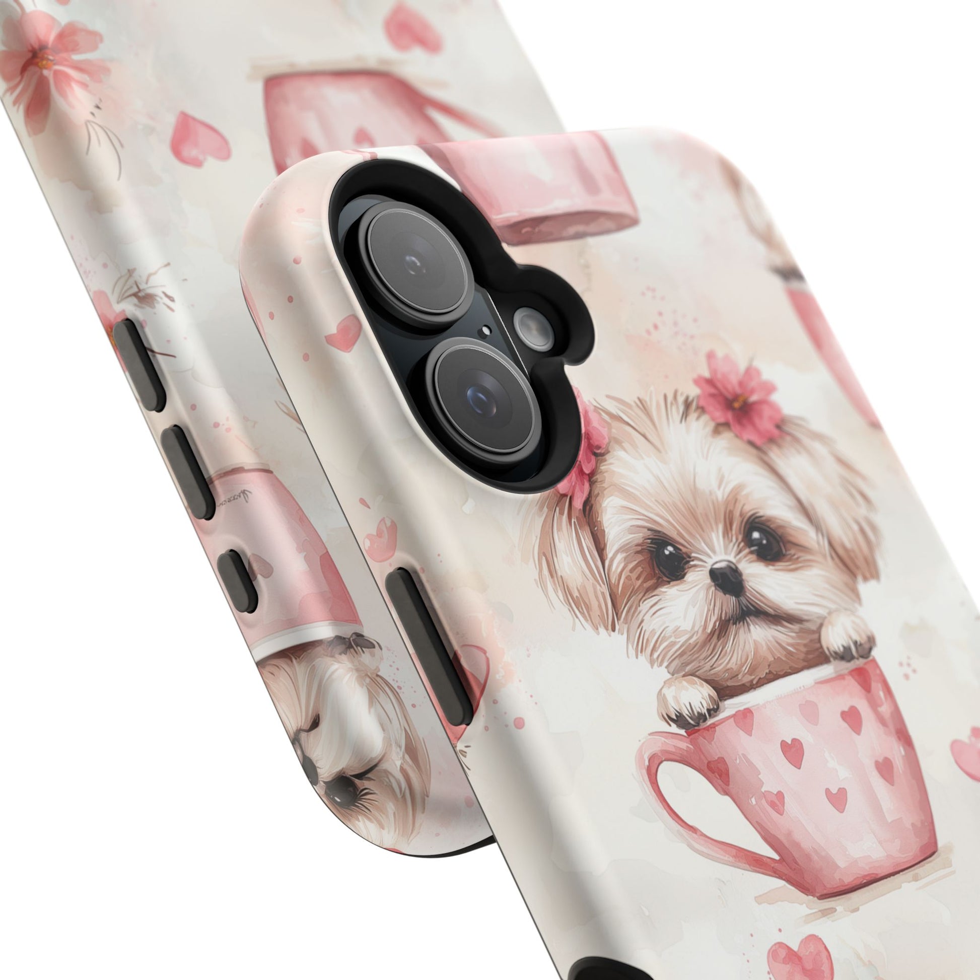 Floral Puppy in Teacup MagSafe iPhone Case – Cute Pink Flower Design, Tough Dual-Layer Protection