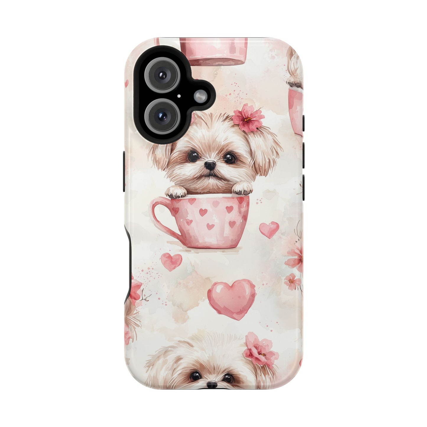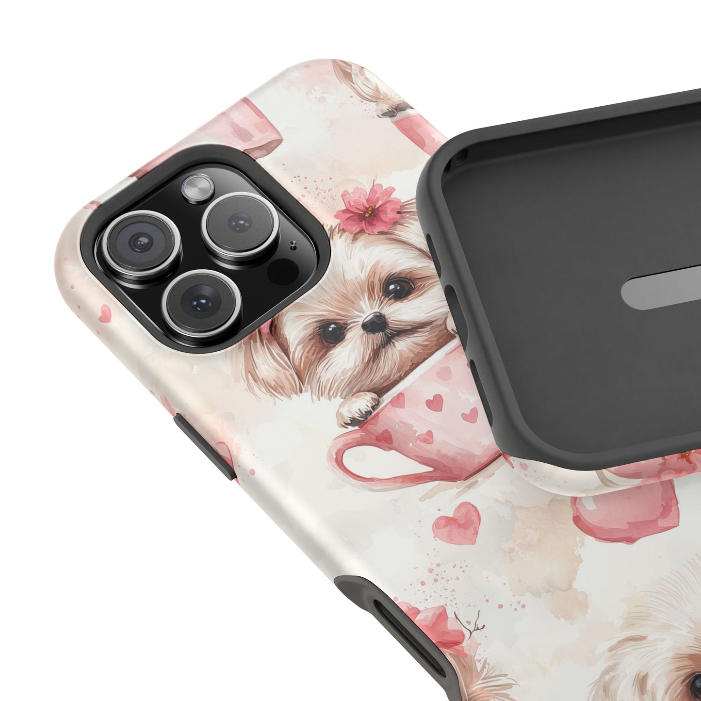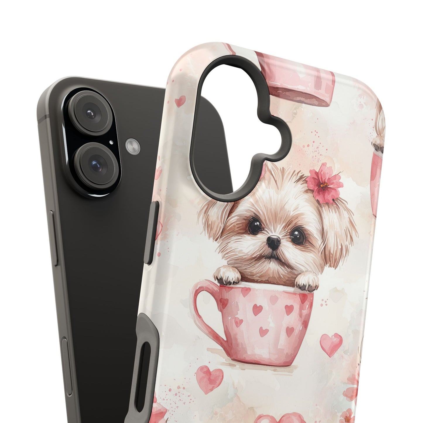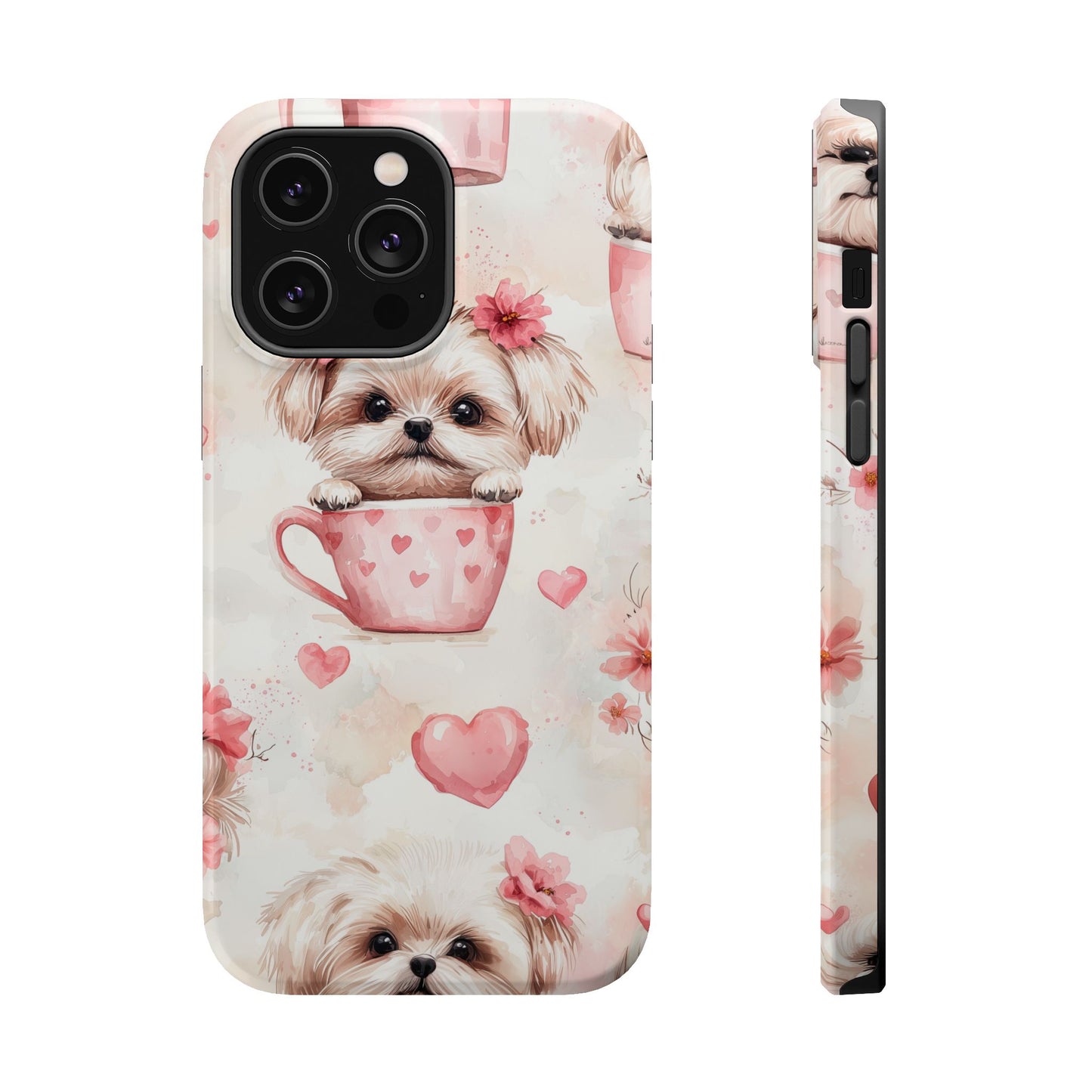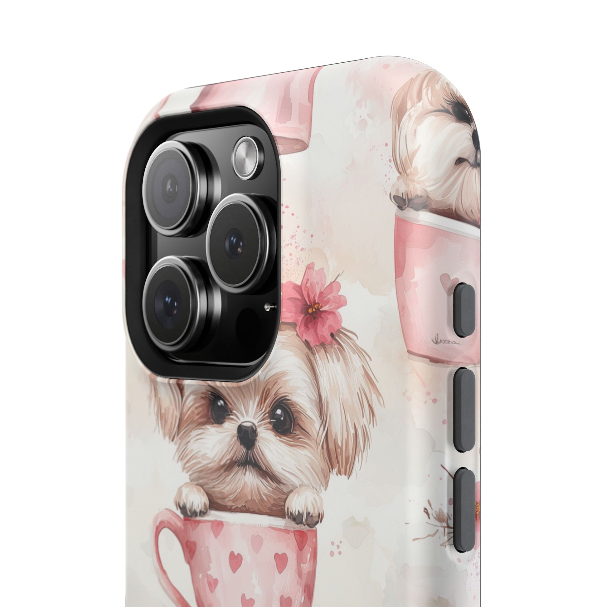 Floral Puppy in Teacup MagSafe iPhone Case – Cute Pink Flower Design, Tough Dual-Layer Protection