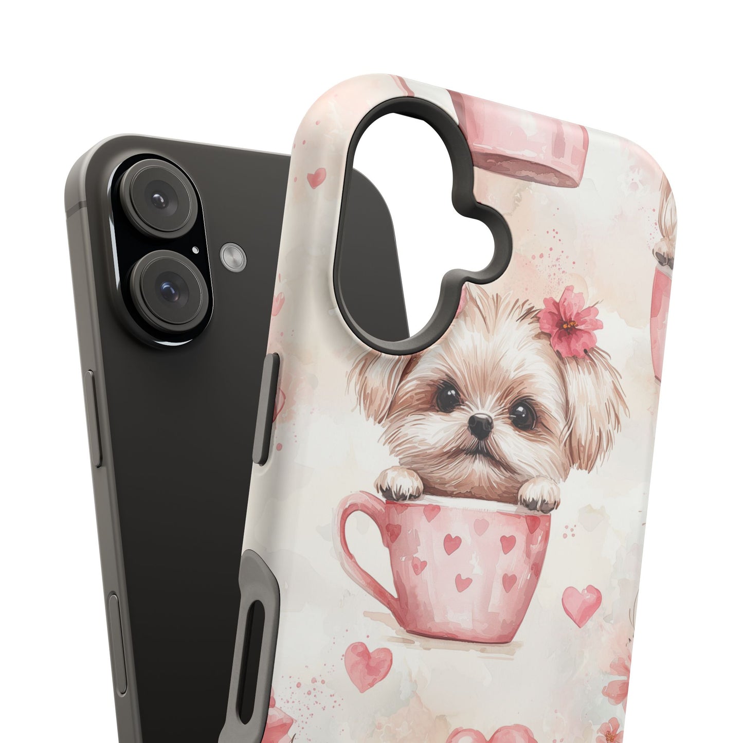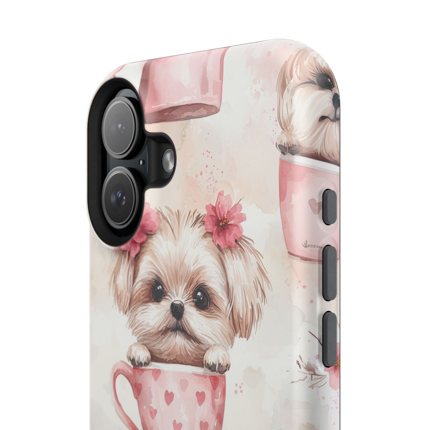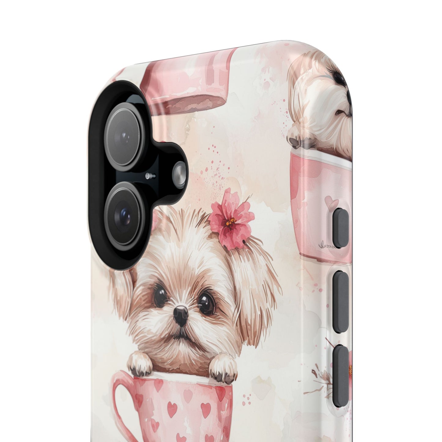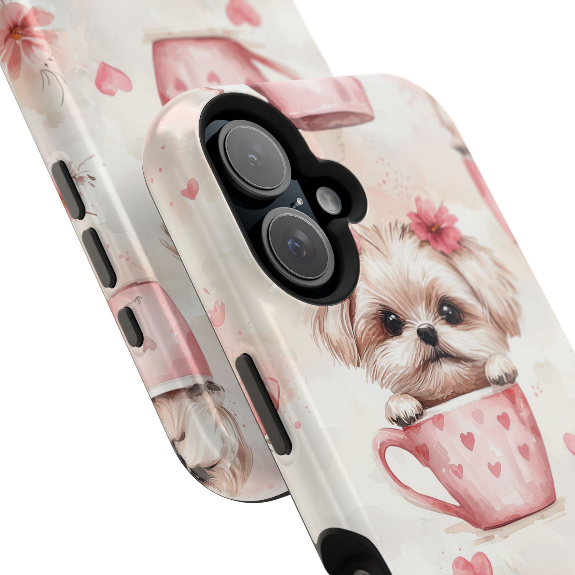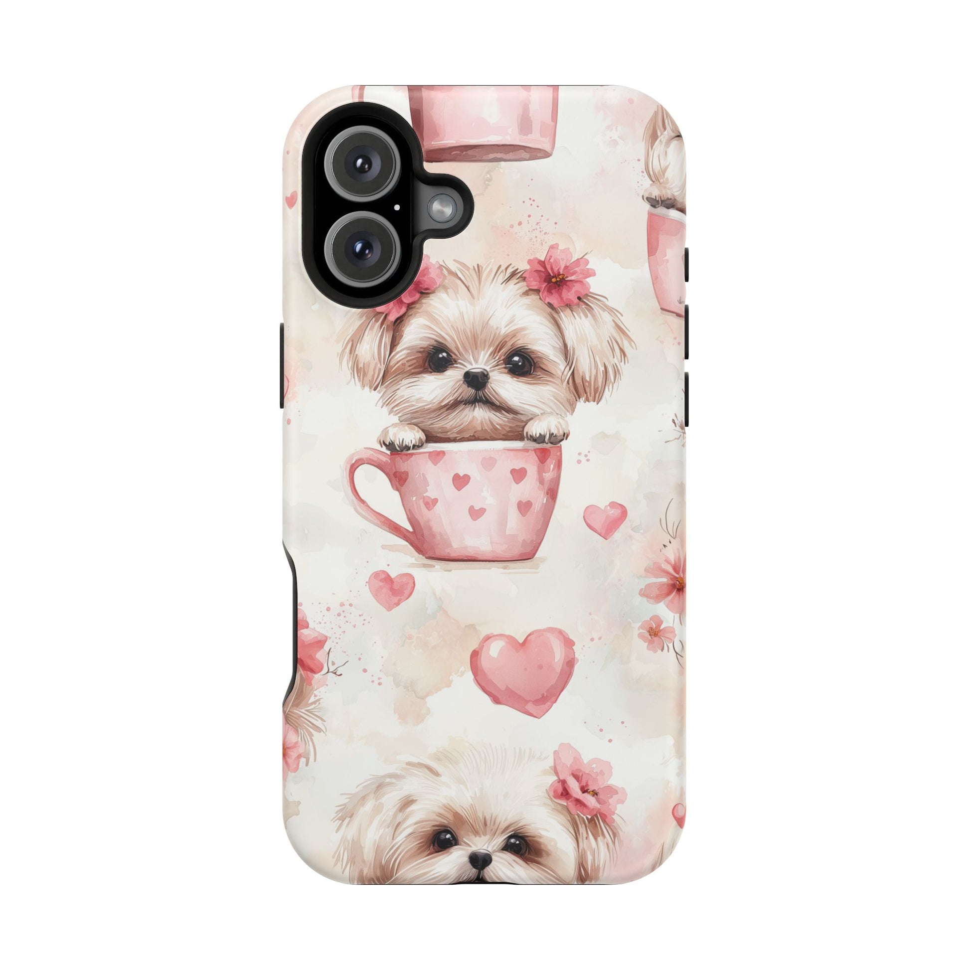 Floral Puppy in Teacup MagSafe iPhone Case – Cute Pink Flower Design, Tough Dual-Layer Protection
