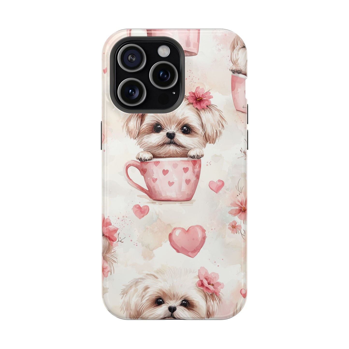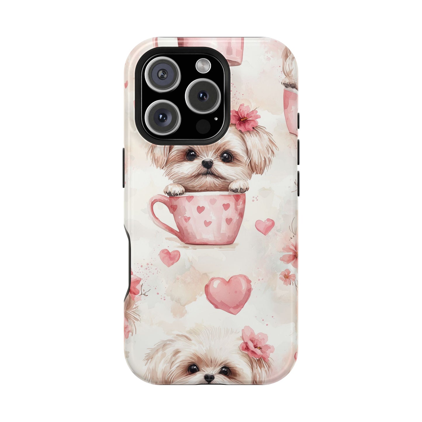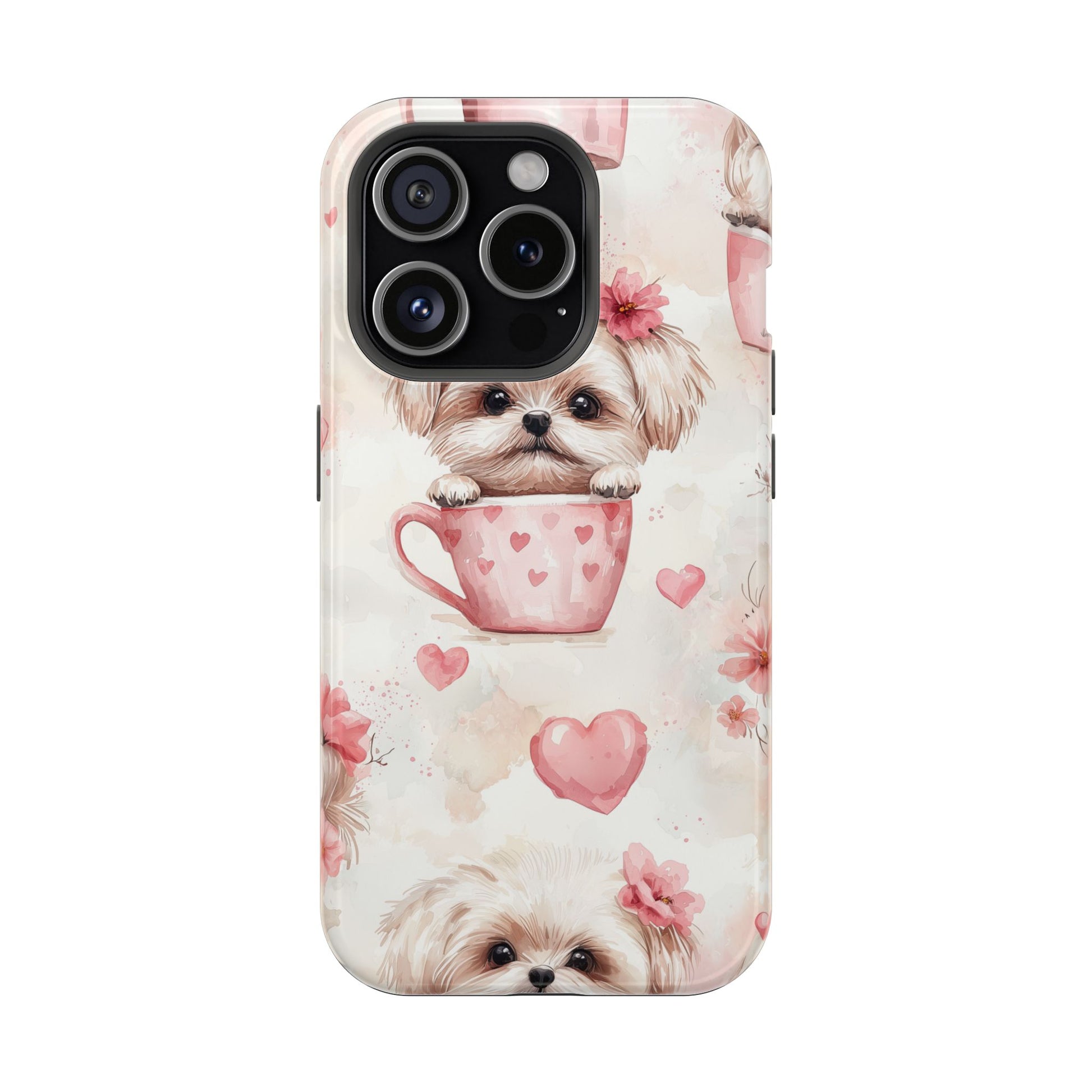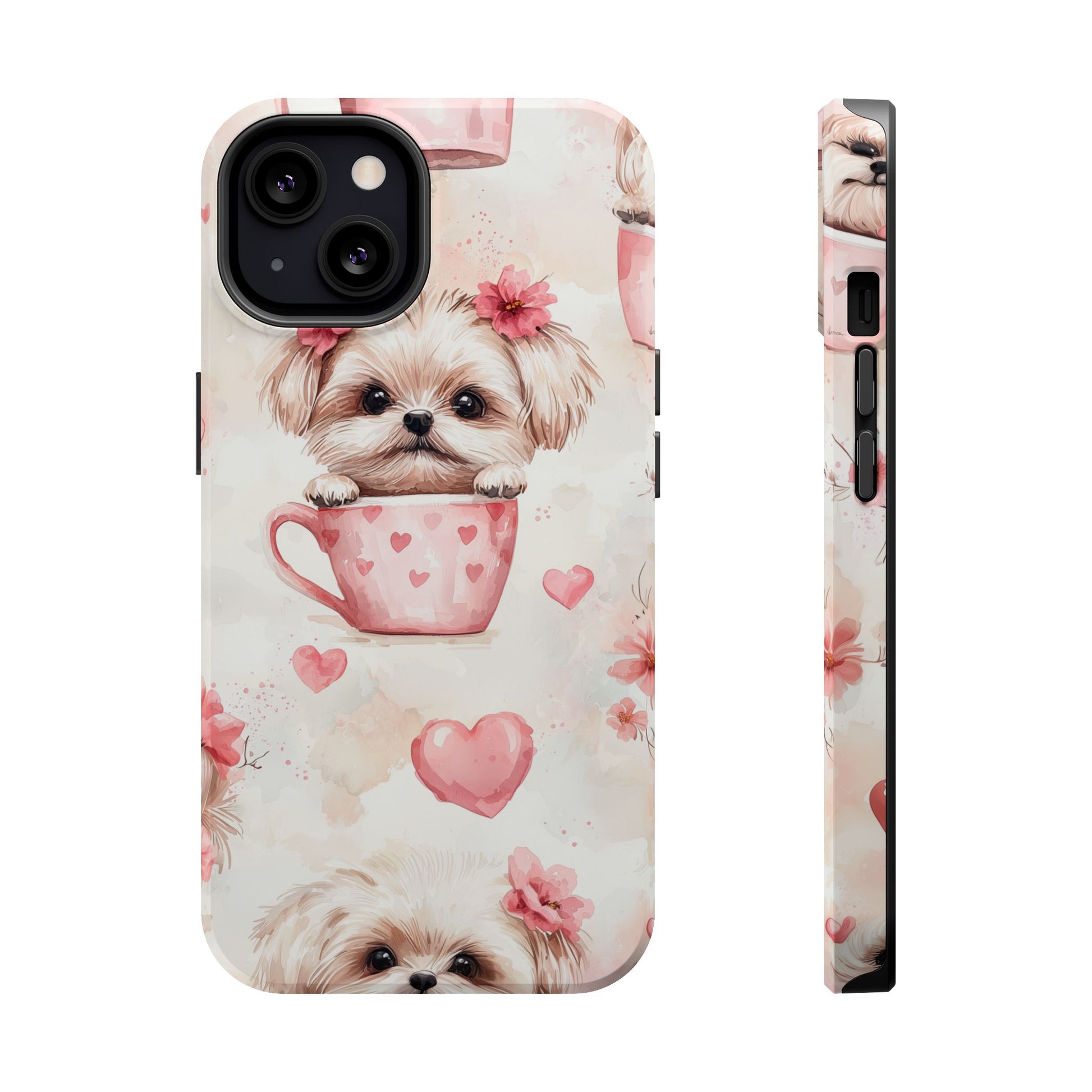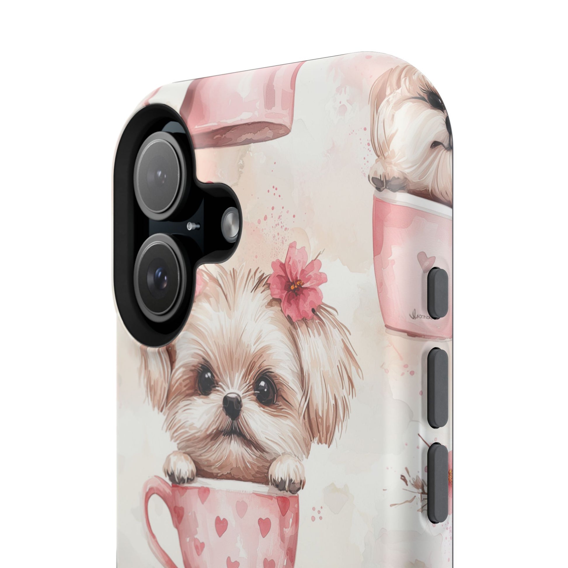 Floral Puppy in Teacup MagSafe iPhone Case – Cute Pink Flower Design, Tough Dual-Layer Protection