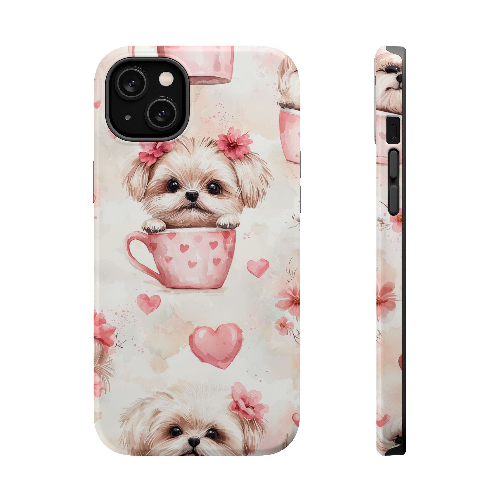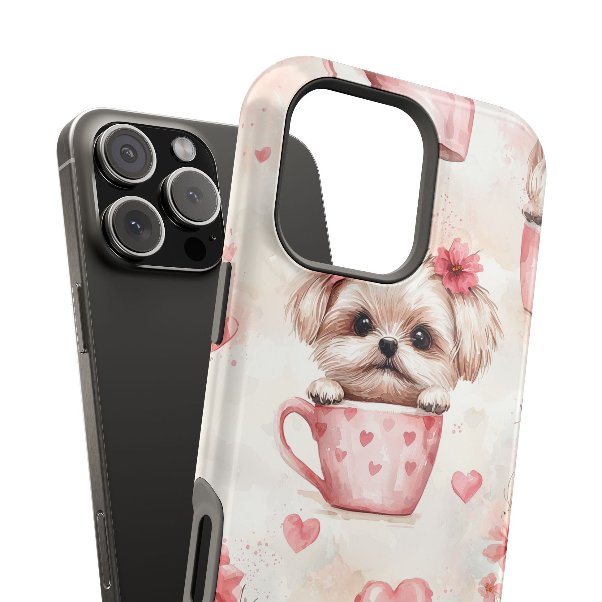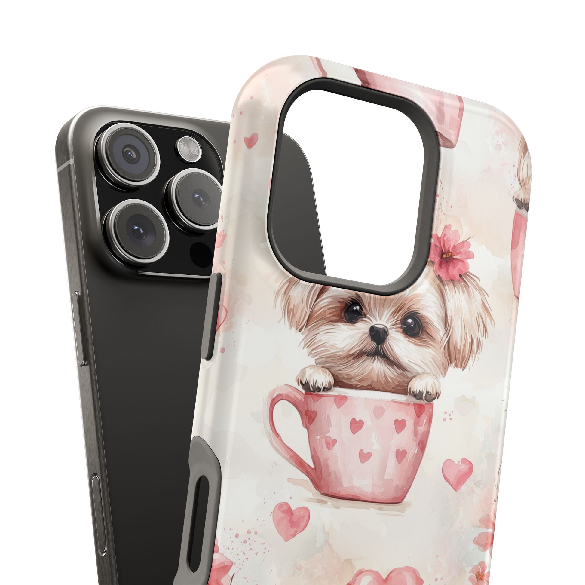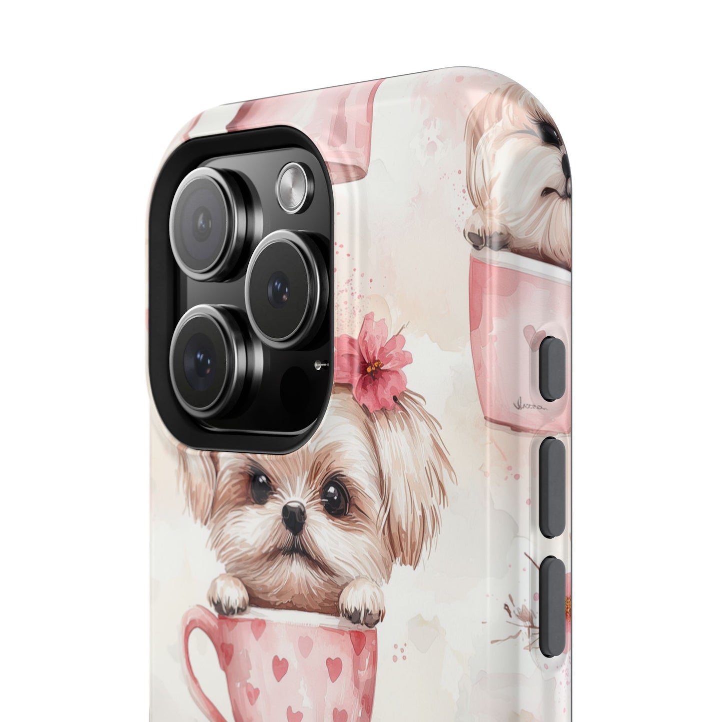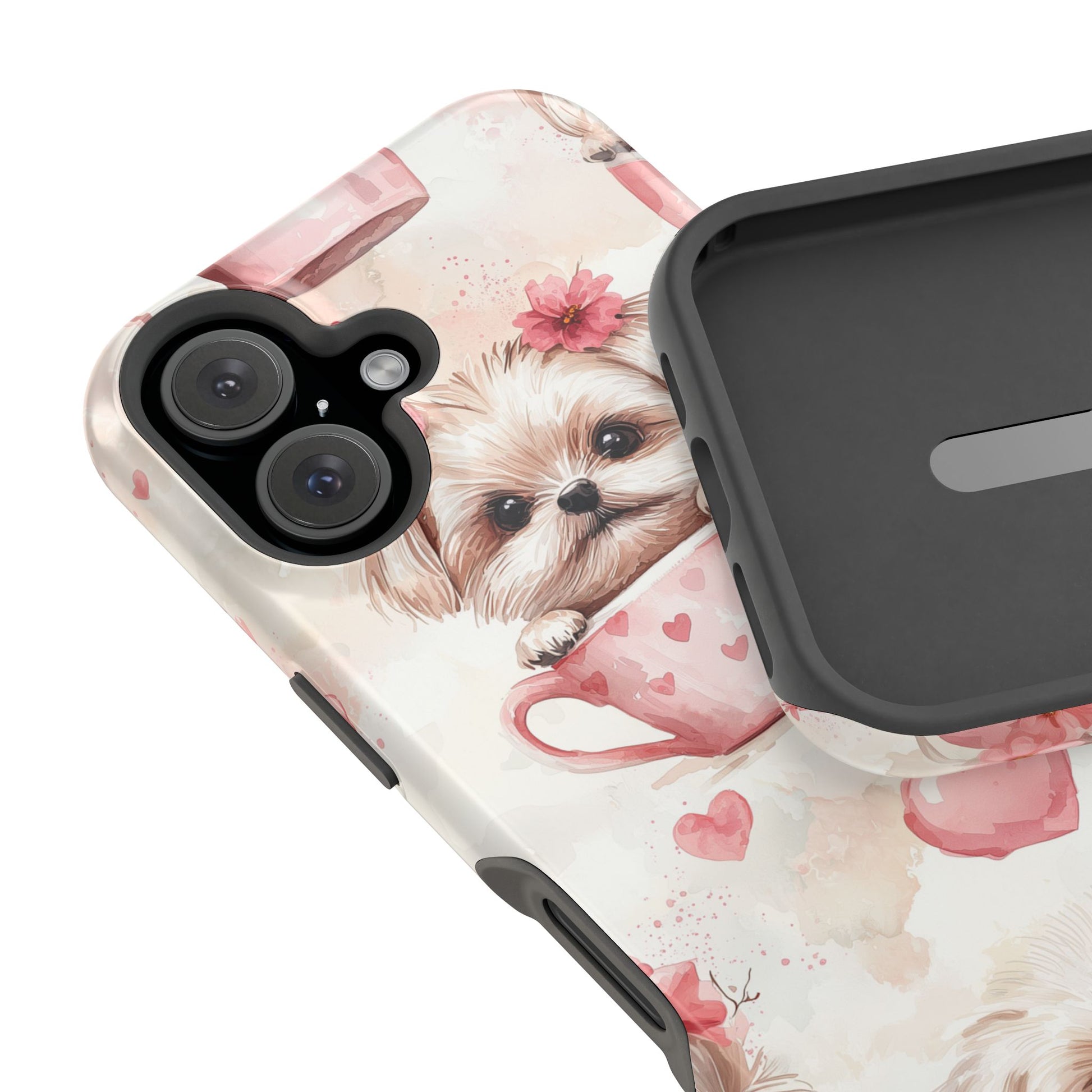 Floral Puppy in Teacup MagSafe iPhone Case – Cute Pink Flower Design, Tough Dual-Layer Protection
