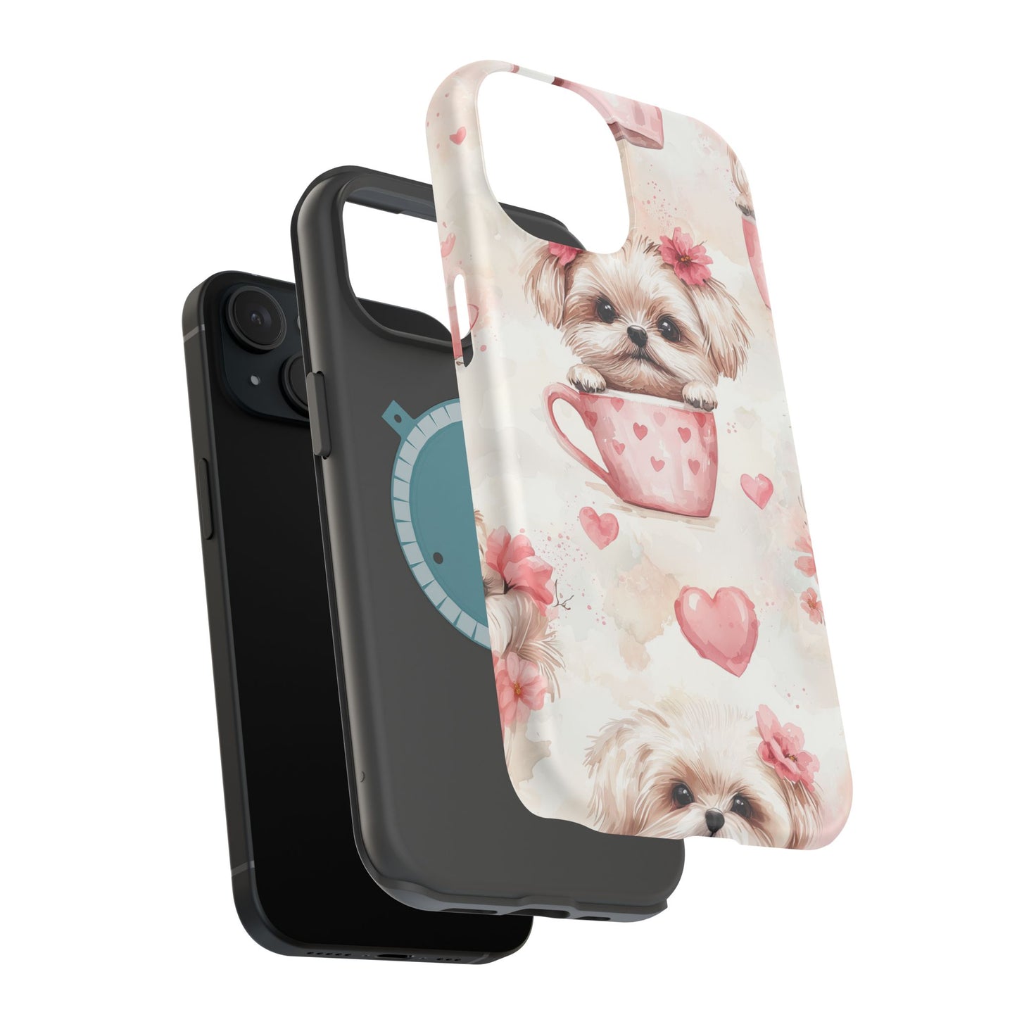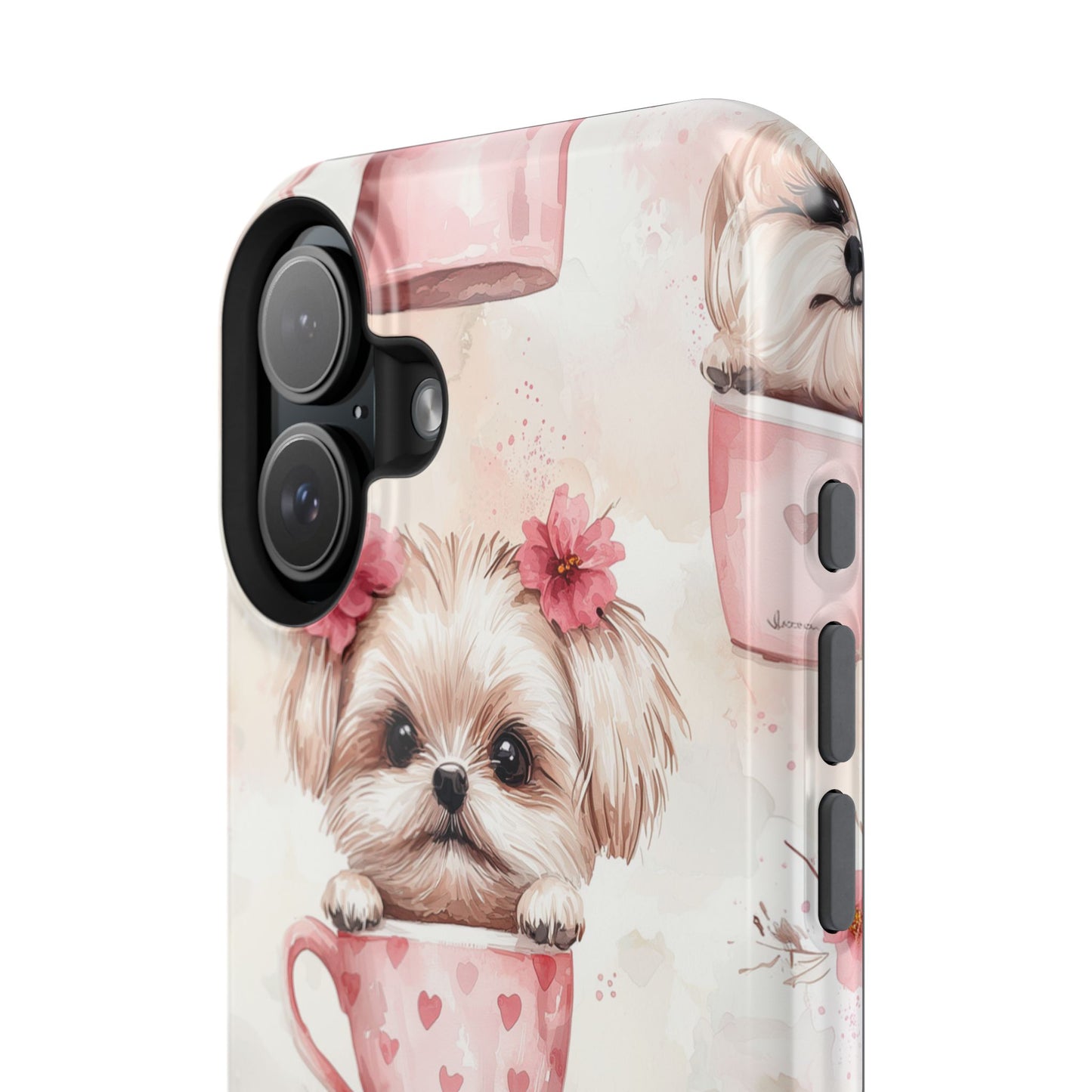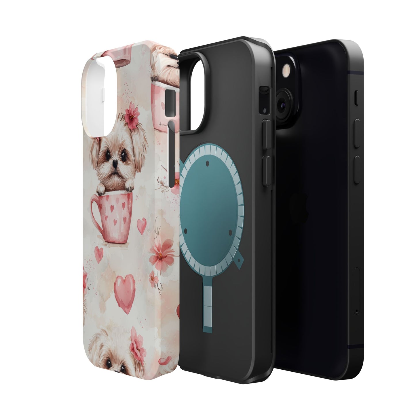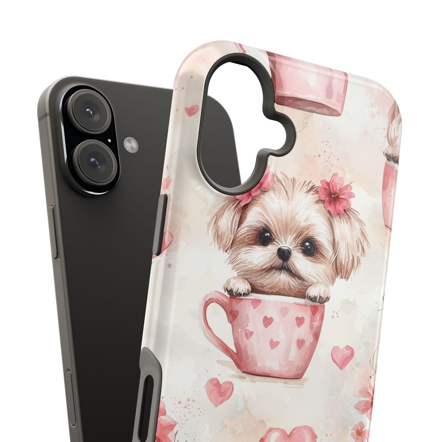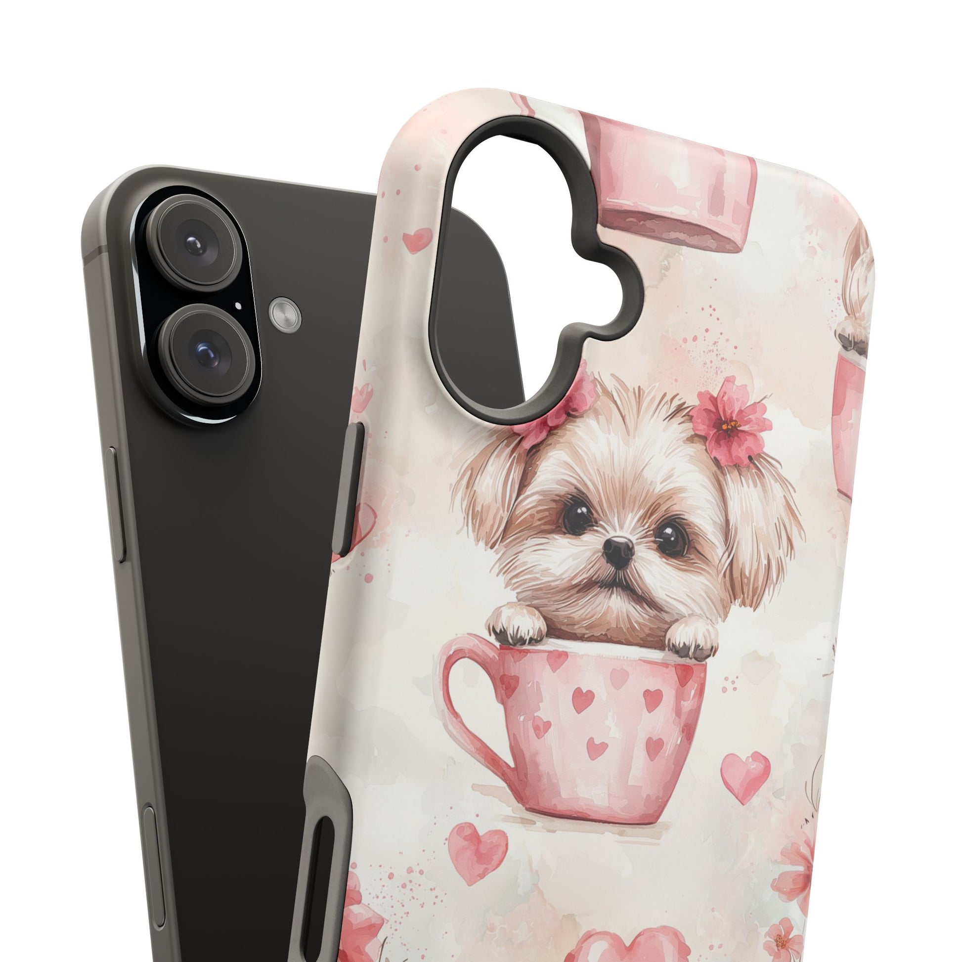 Floral Puppy in Teacup MagSafe iPhone Case – Cute Pink Flower Design, Tough Dual-Layer Protection