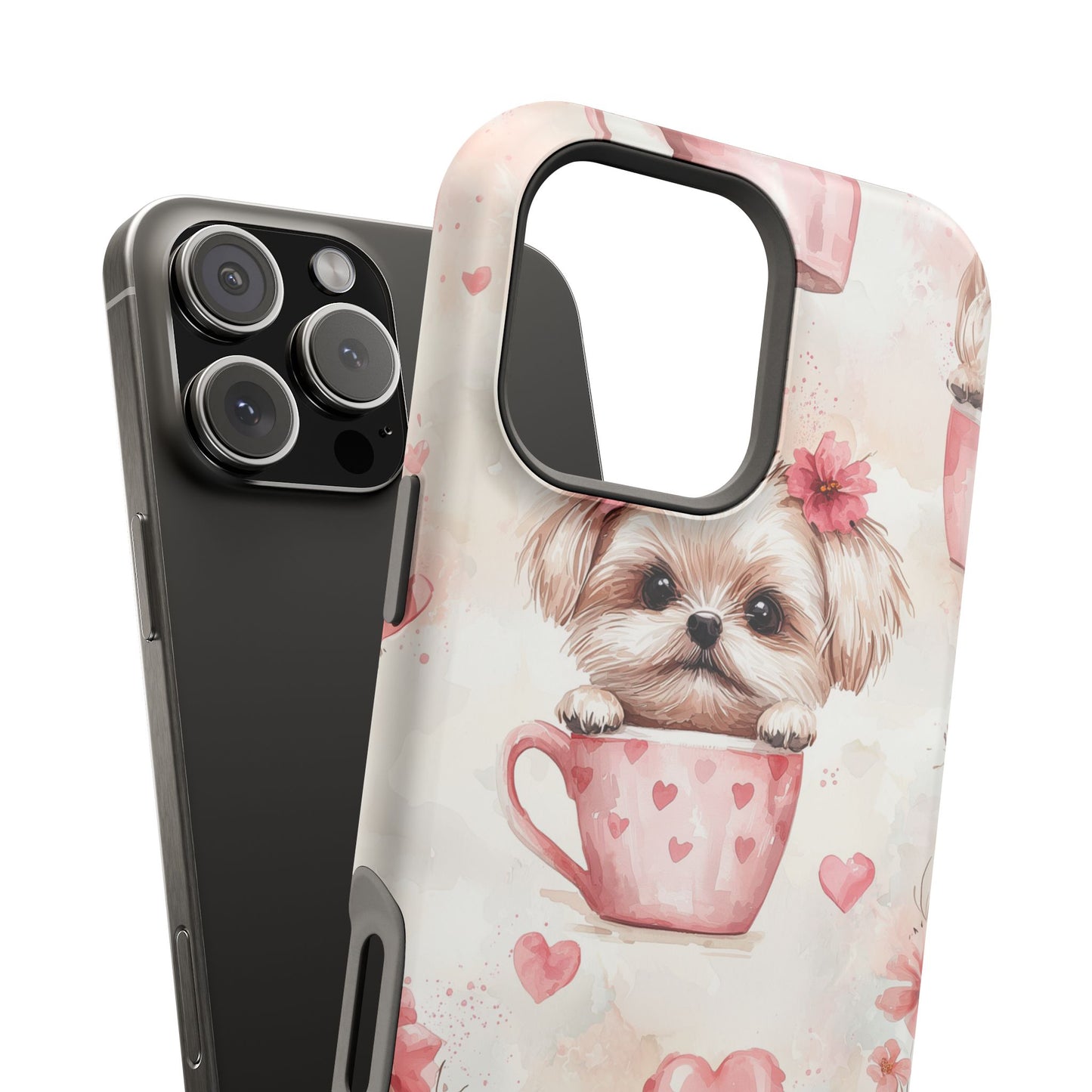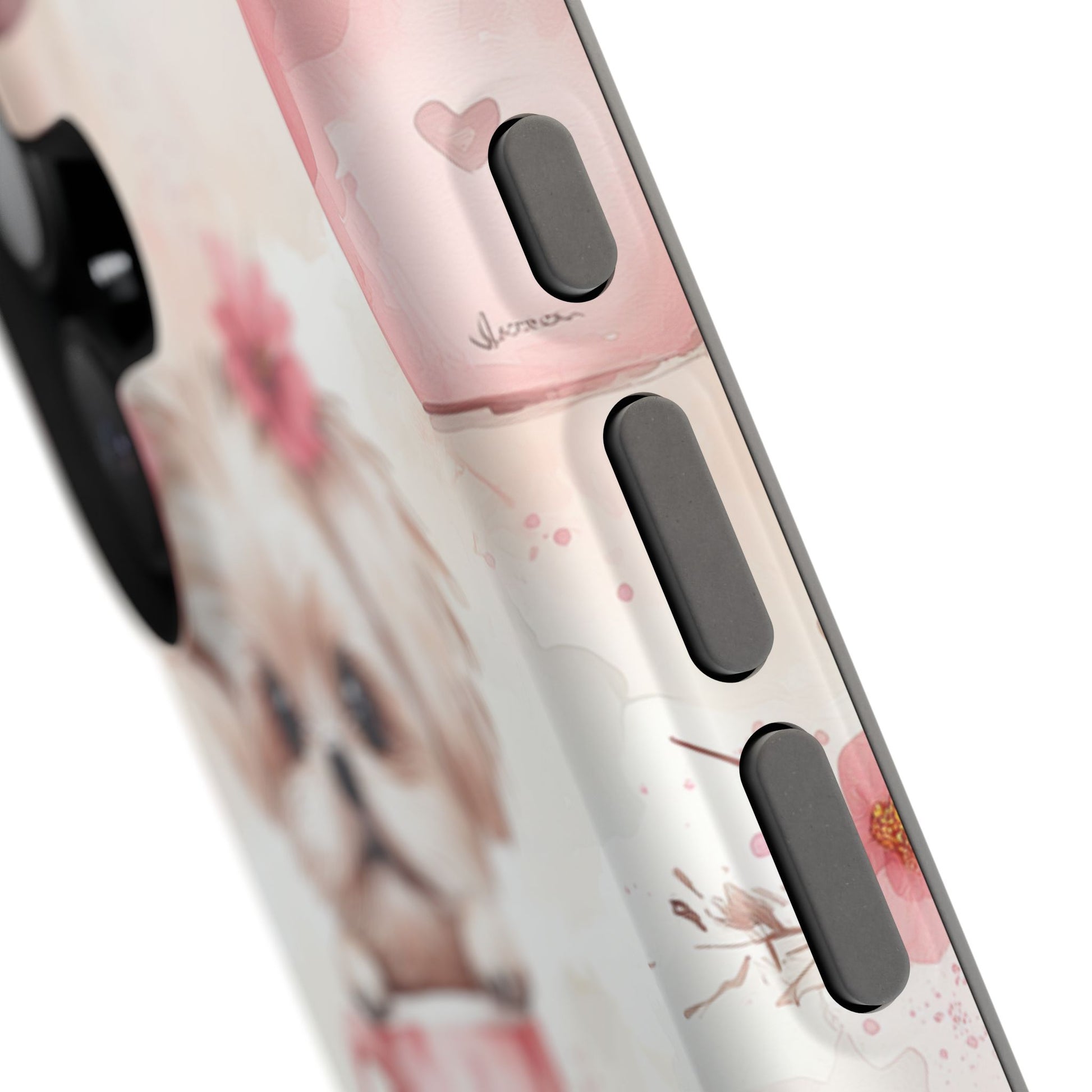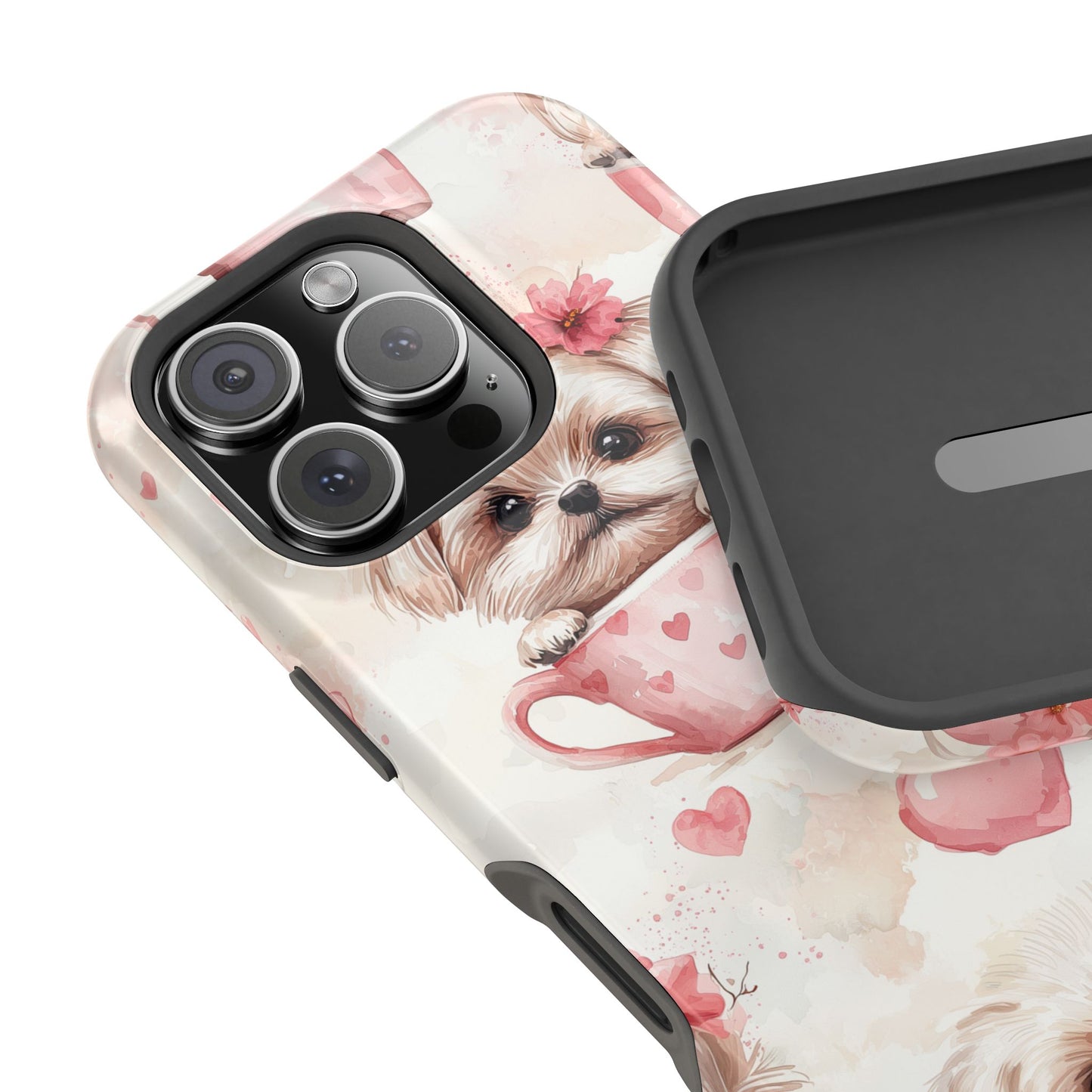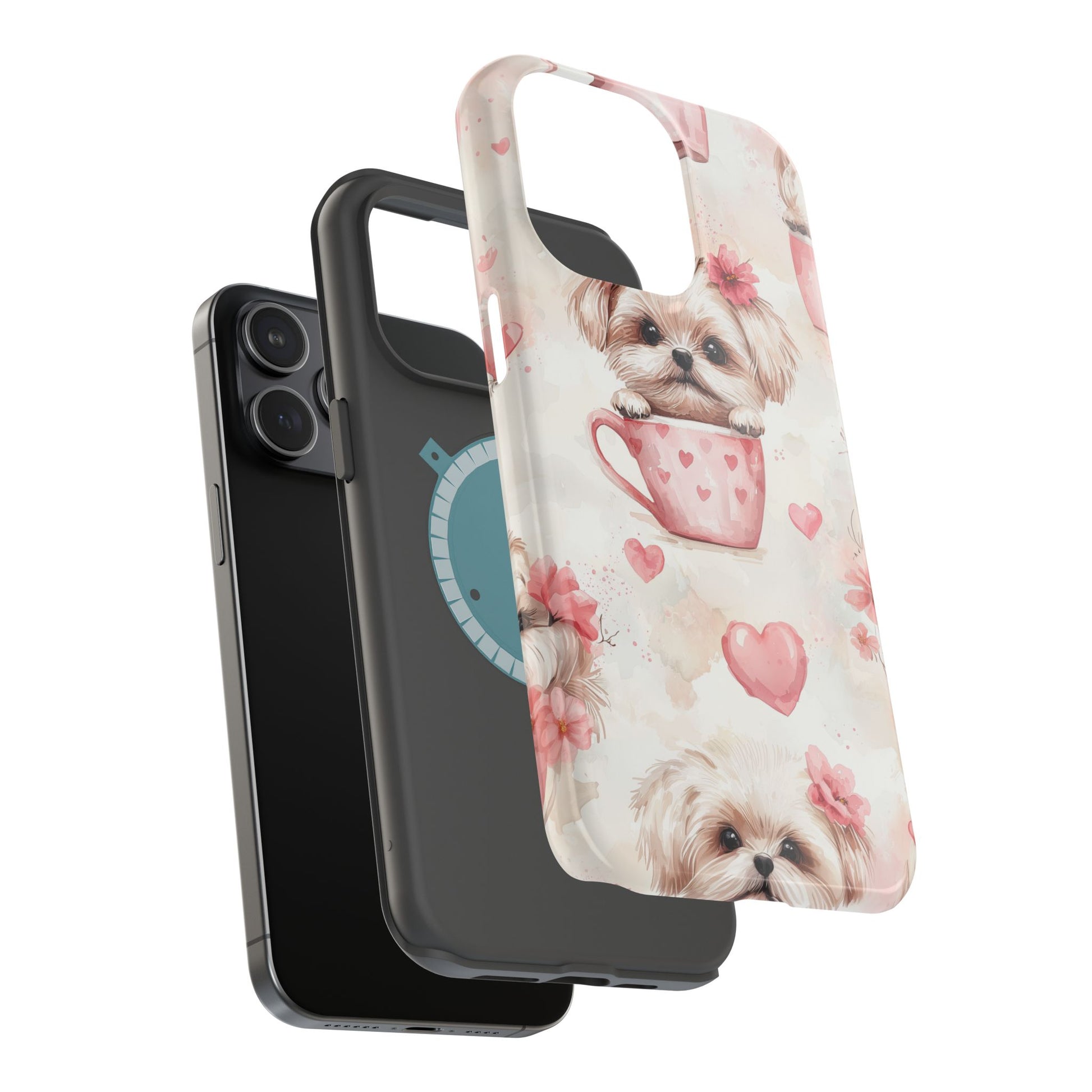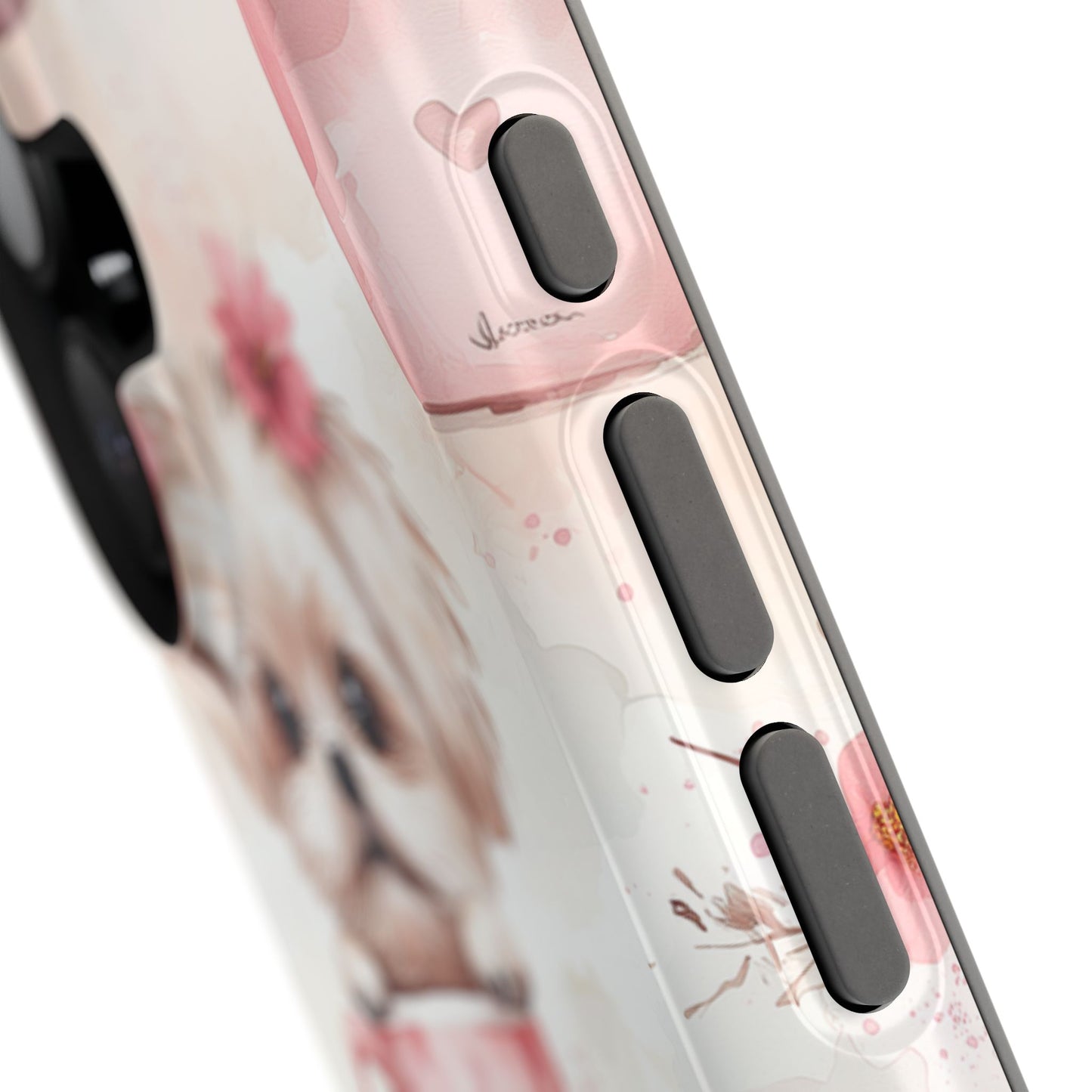 Floral Puppy in Teacup MagSafe iPhone Case – Cute Pink Flower Design, Tough Dual-Layer Protection