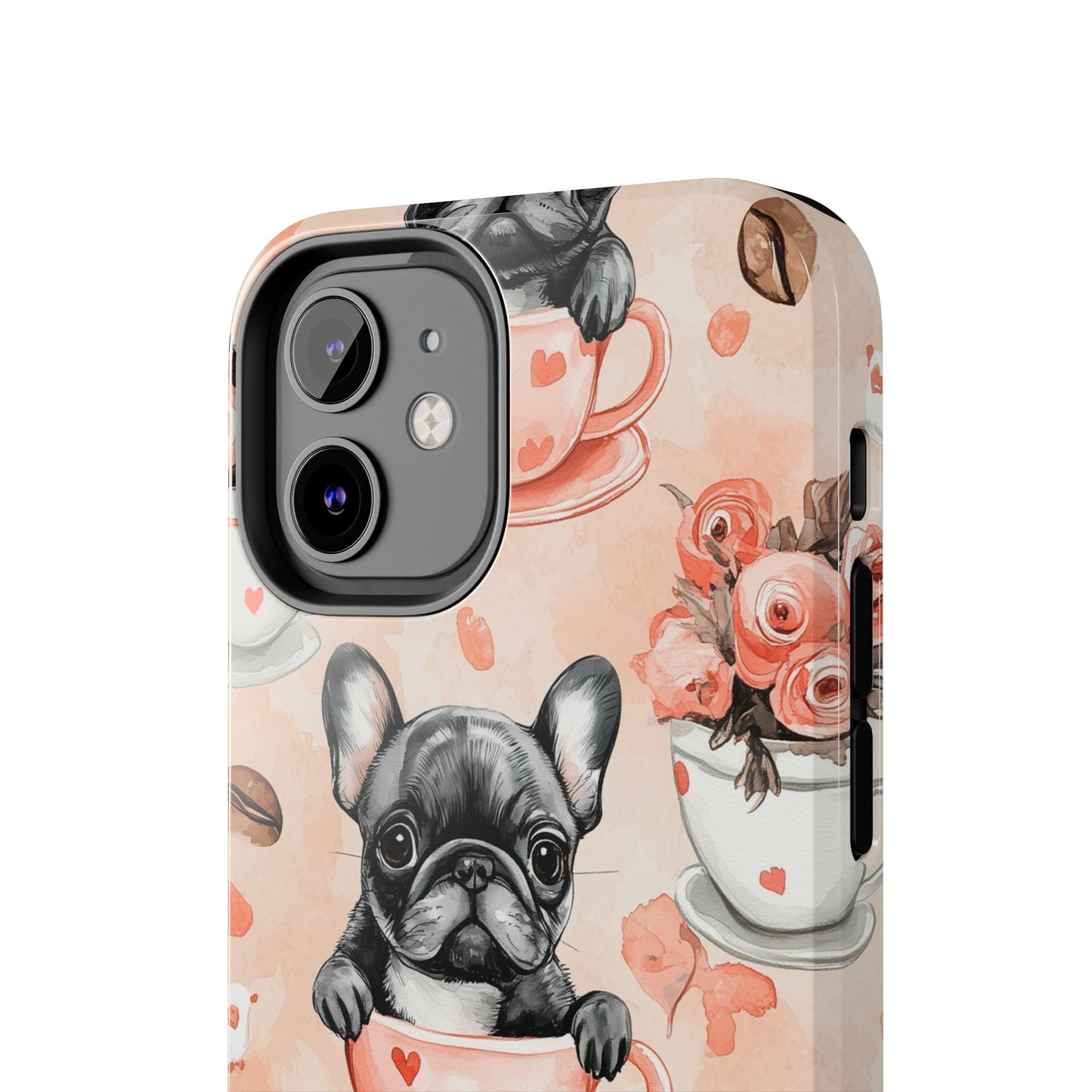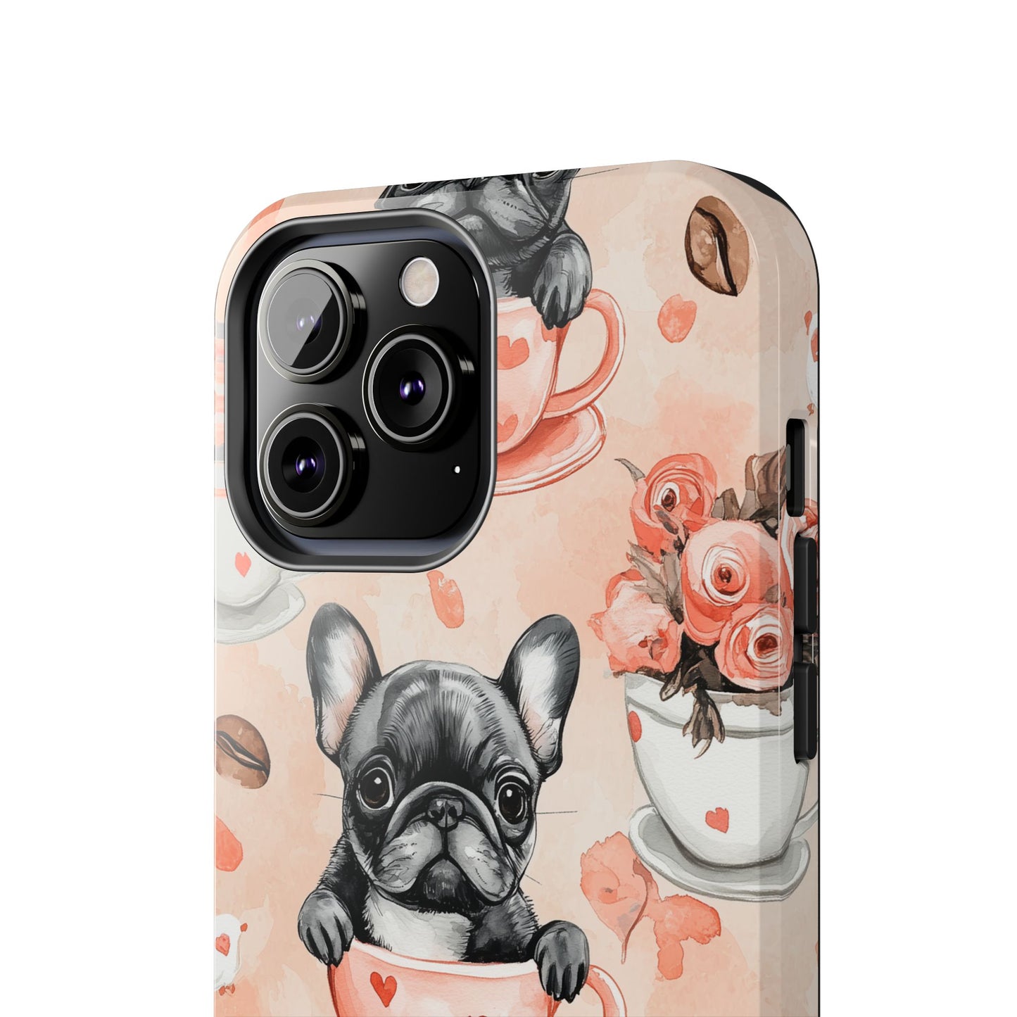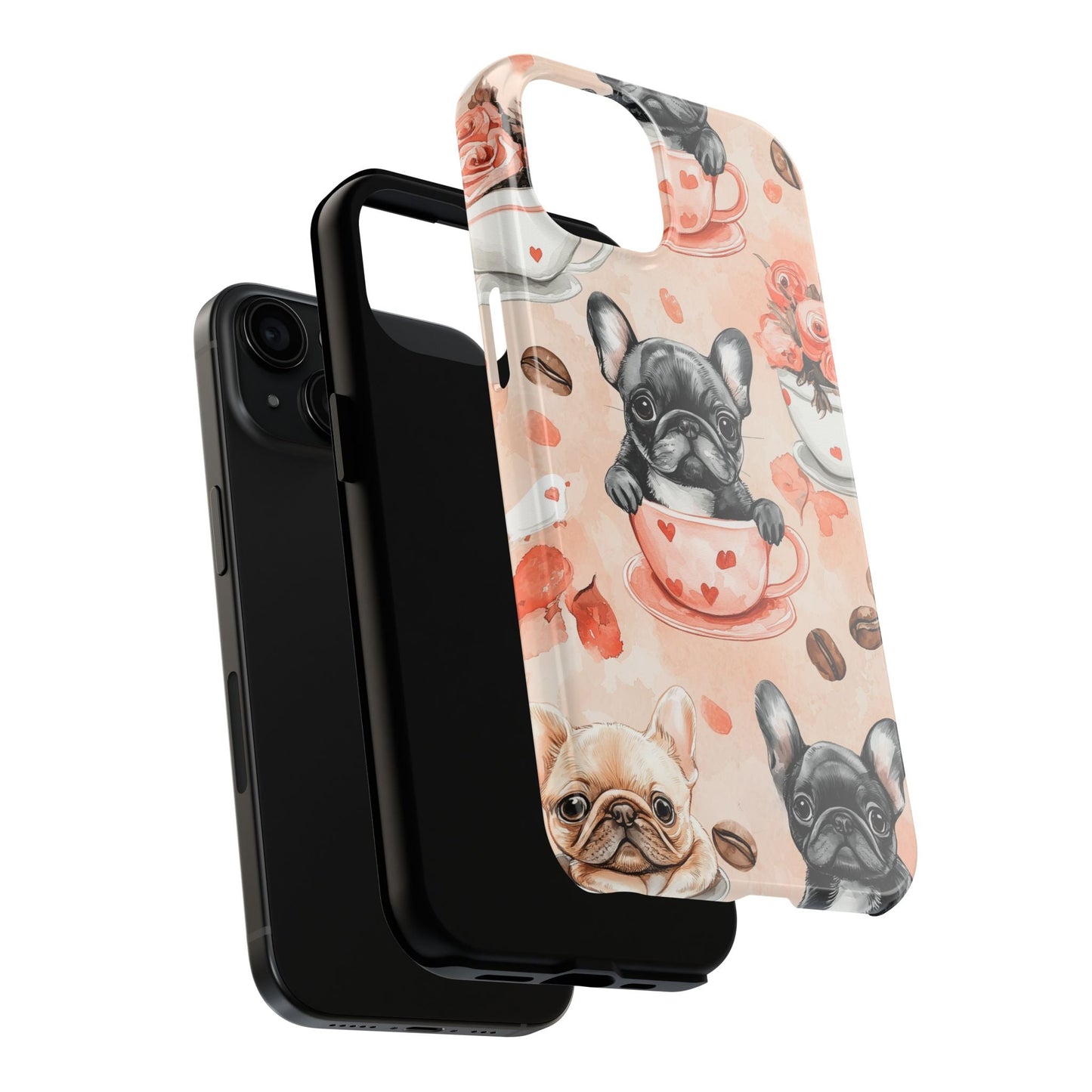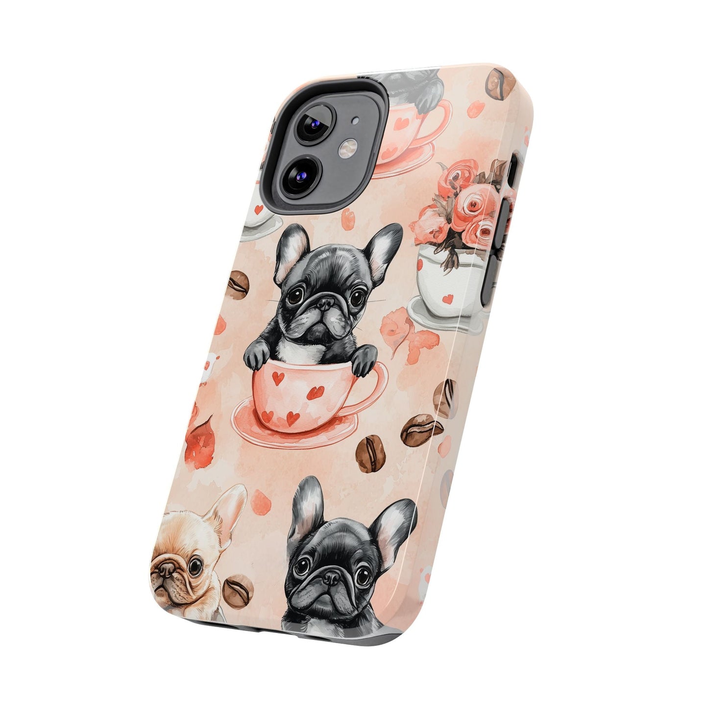 Show off your love for French Bulldogs with this adorable French Bulldogs in Heart iPhone case! Featuring charming black and tan Frenchies nestled in heart-decorated teacups, surrounded by delicate roses, coffee beans, and watercolor-style hearts, this case offers a playful yet elegant touch to your phone. Perfect for dog lovers who enjoy a whimsical, feminine vibe, the slim yet durable case ensures your phone stays safe from everyday bumps and drops while looking stylish.