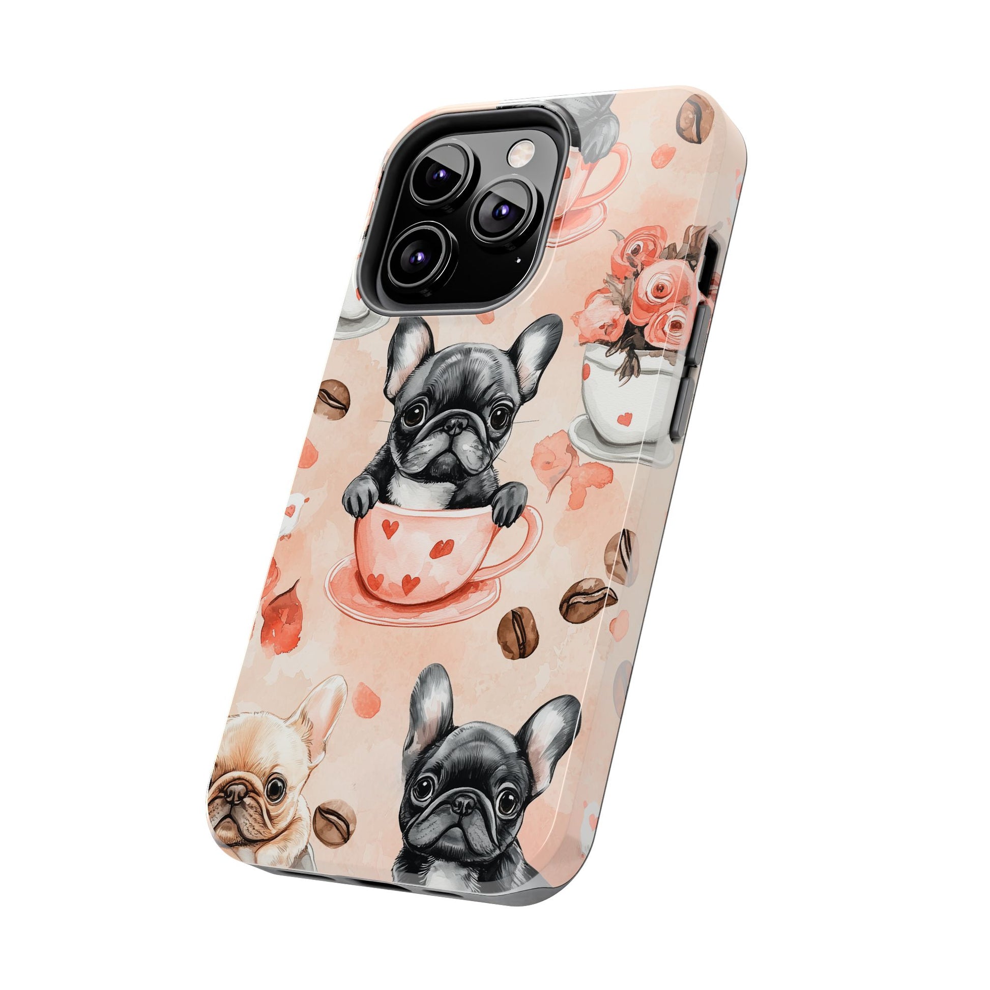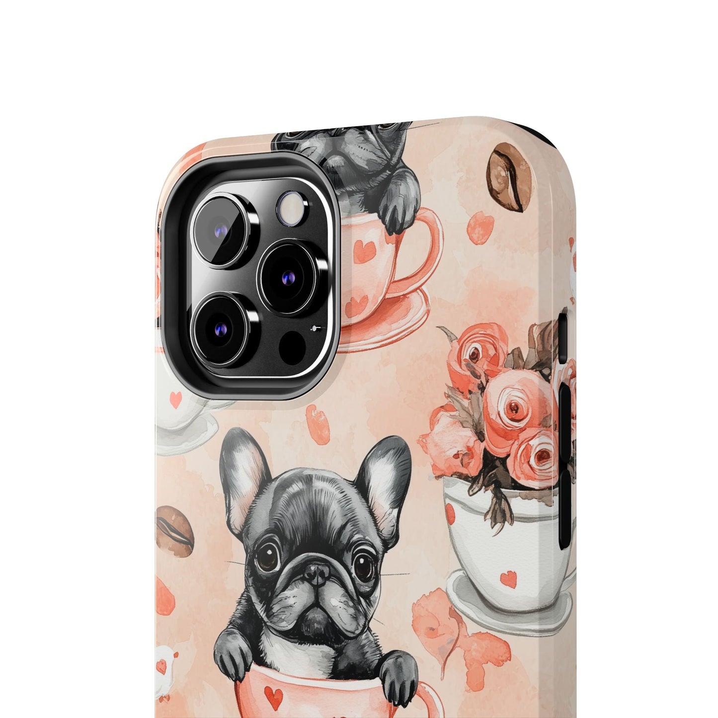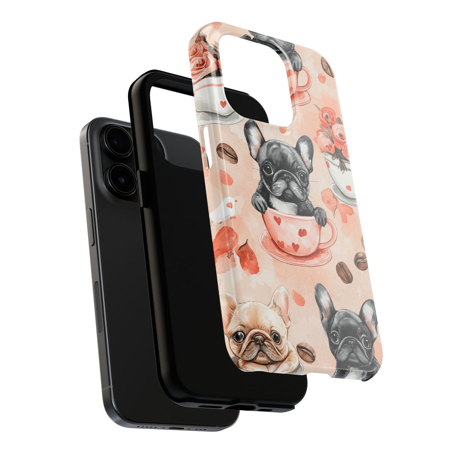 Show off your love for French Bulldogs with this adorable French Bulldogs in Heart iPhone case! Featuring charming black and tan Frenchies nestled in heart-decorated teacups, surrounded by delicate roses, coffee beans, and watercolor-style hearts, this case offers a playful yet elegant touch to your phone. Perfect for dog lovers who enjoy a whimsical, feminine vibe, the slim yet durable case ensures your phone stays safe from everyday bumps and drops while looking stylish.