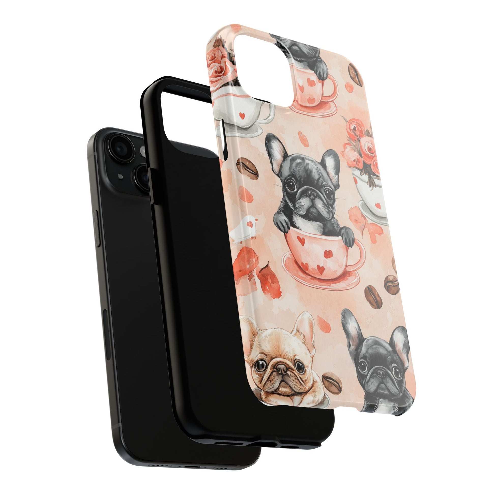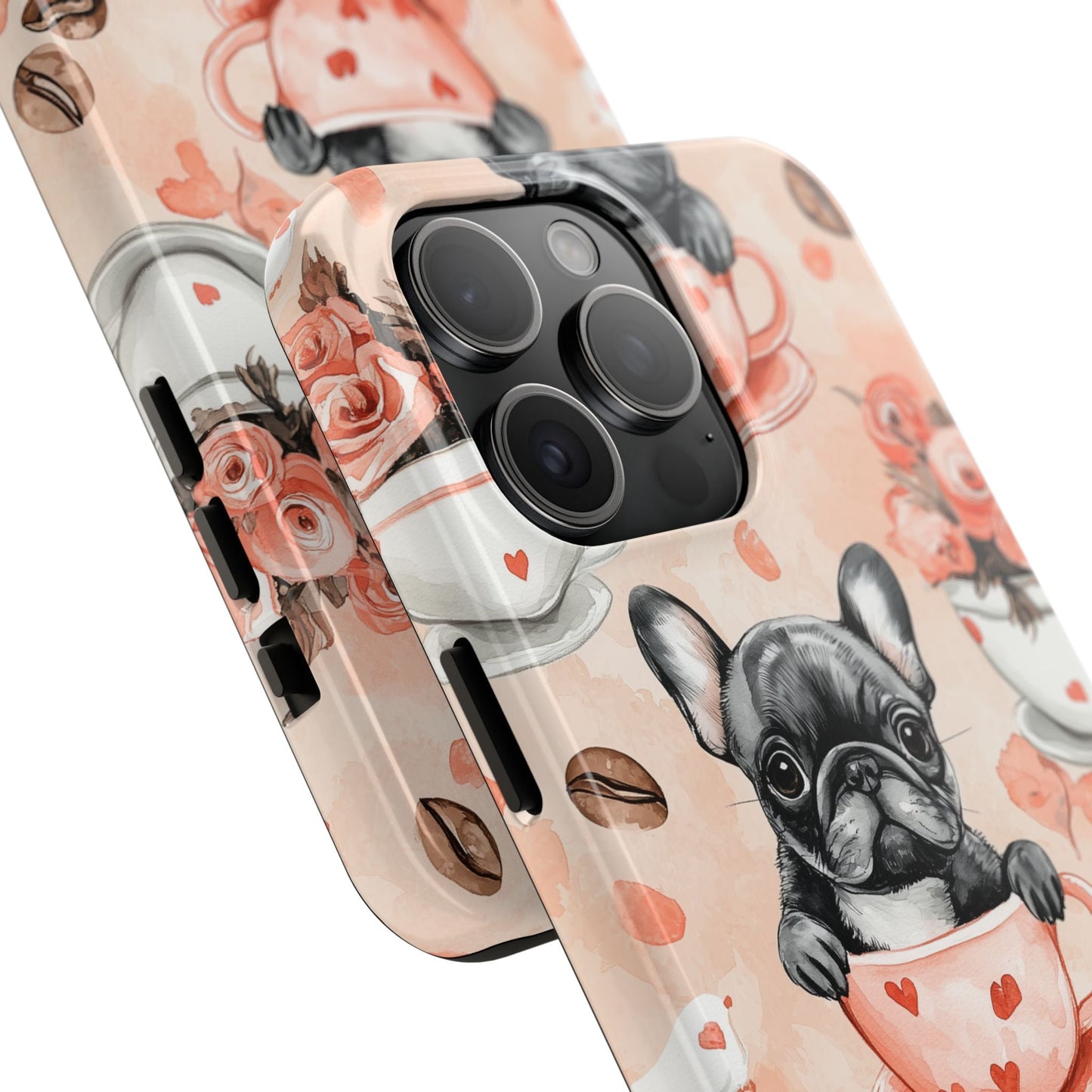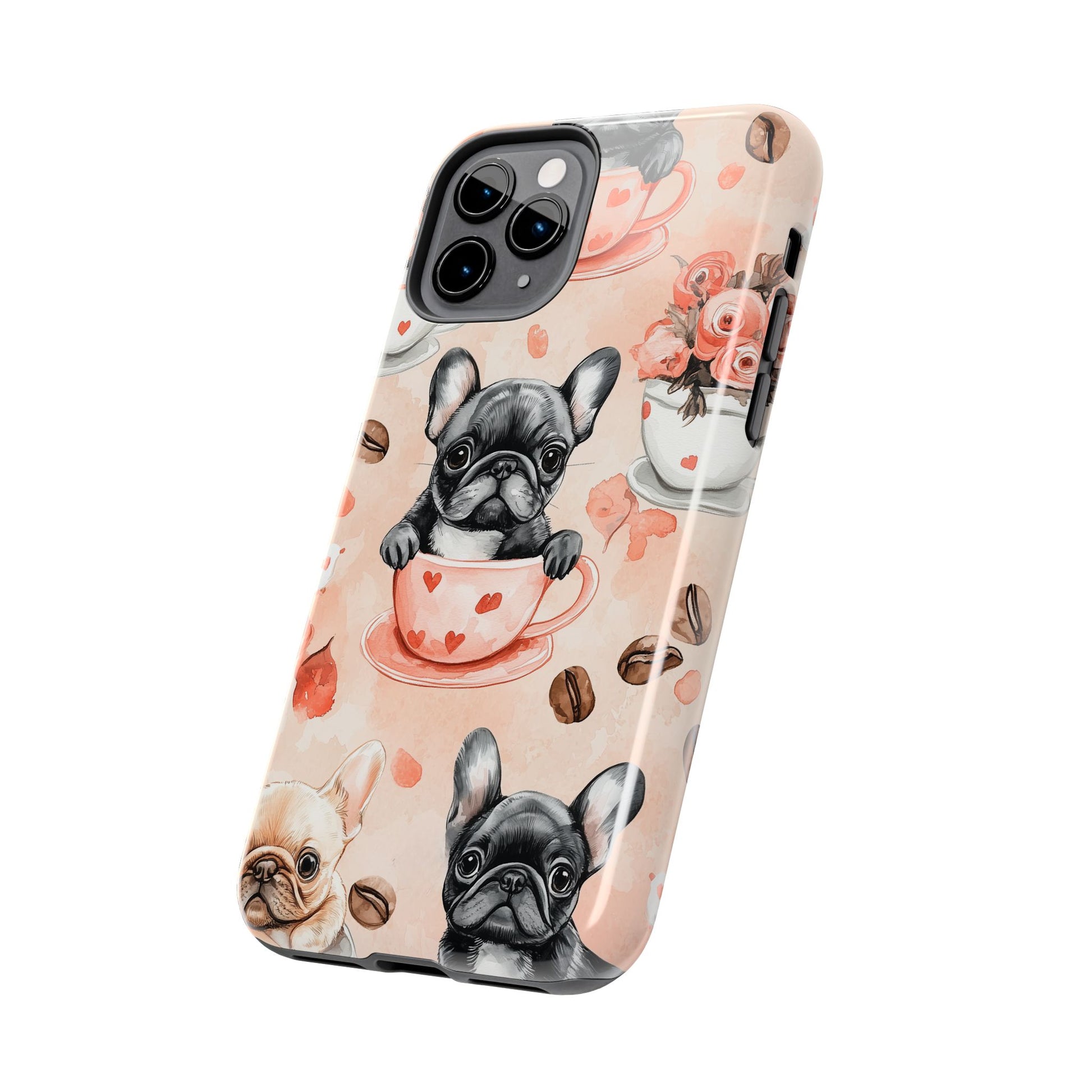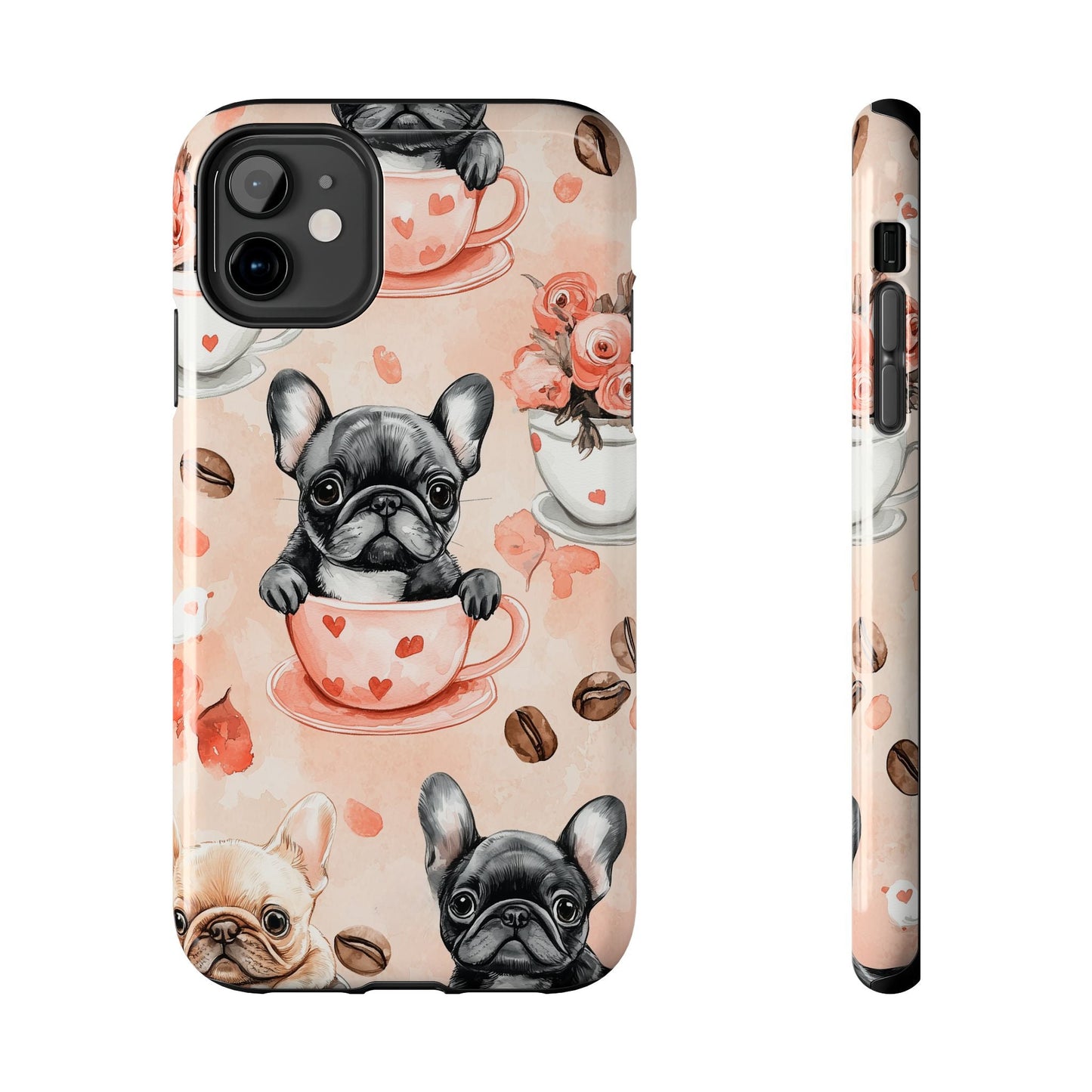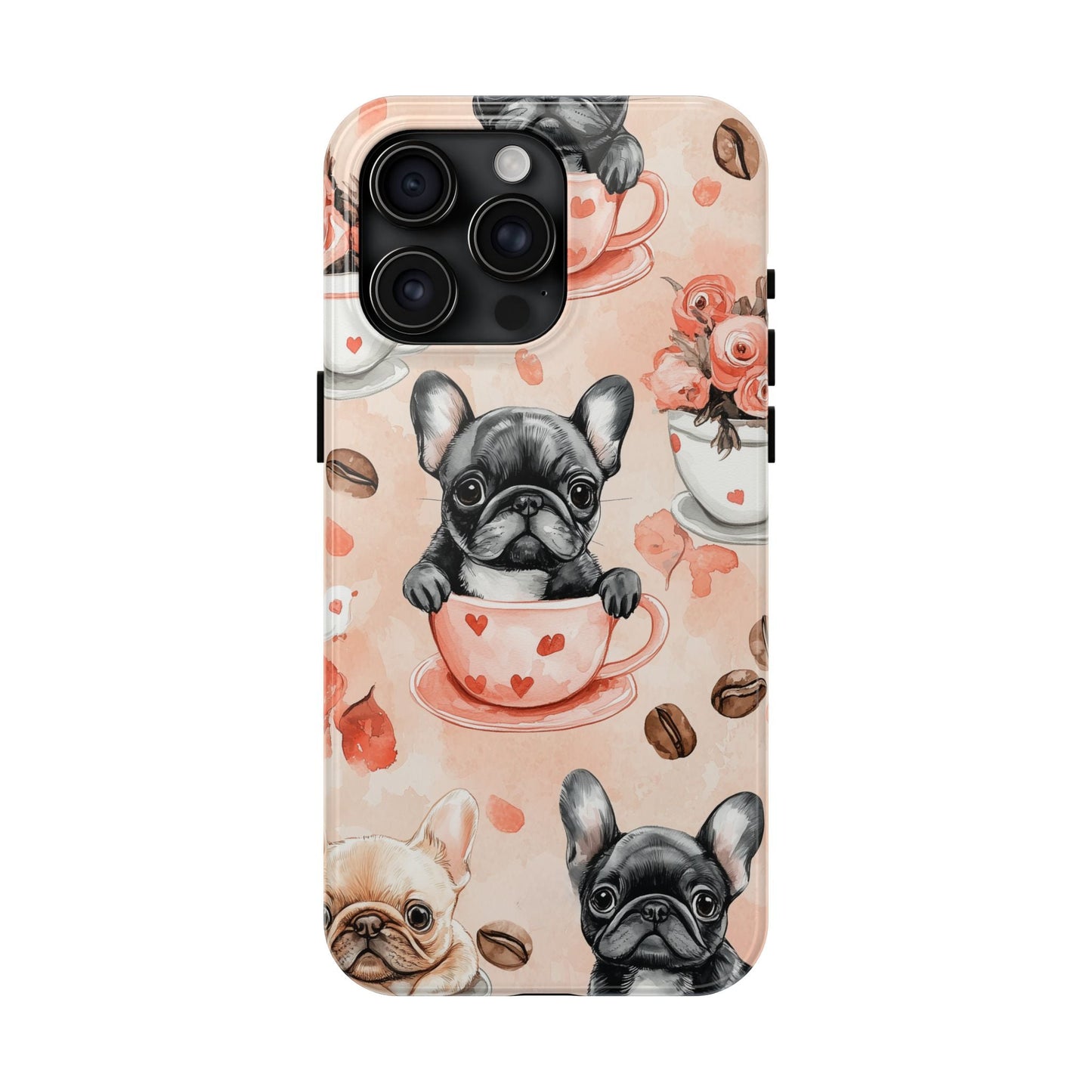Show off your love for French Bulldogs with this adorable French Bulldogs in Heart iPhone case! Featuring charming black and tan Frenchies nestled in heart-decorated teacups, surrounded by delicate roses, coffee beans, and watercolor-style hearts, this case offers a playful yet elegant touch t...