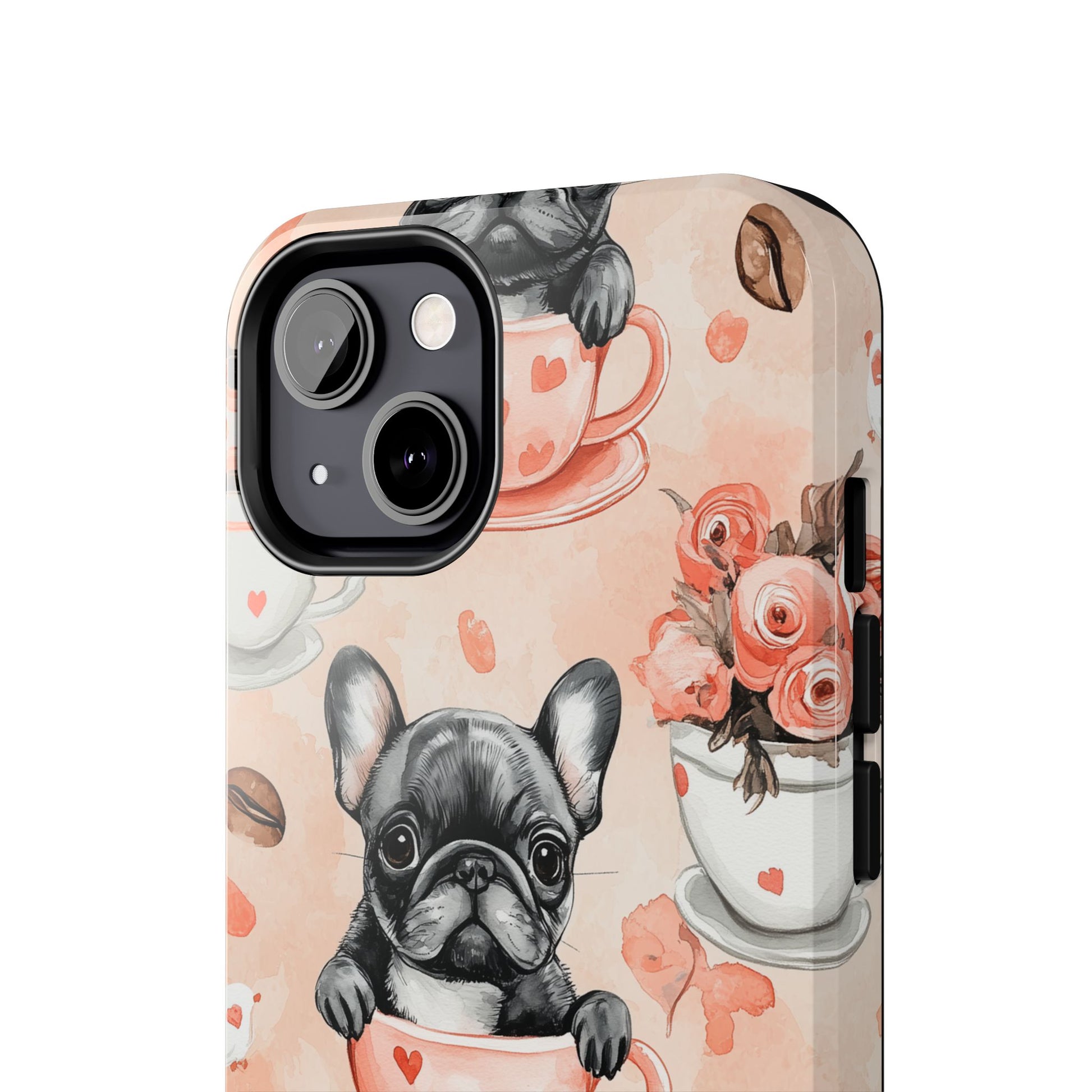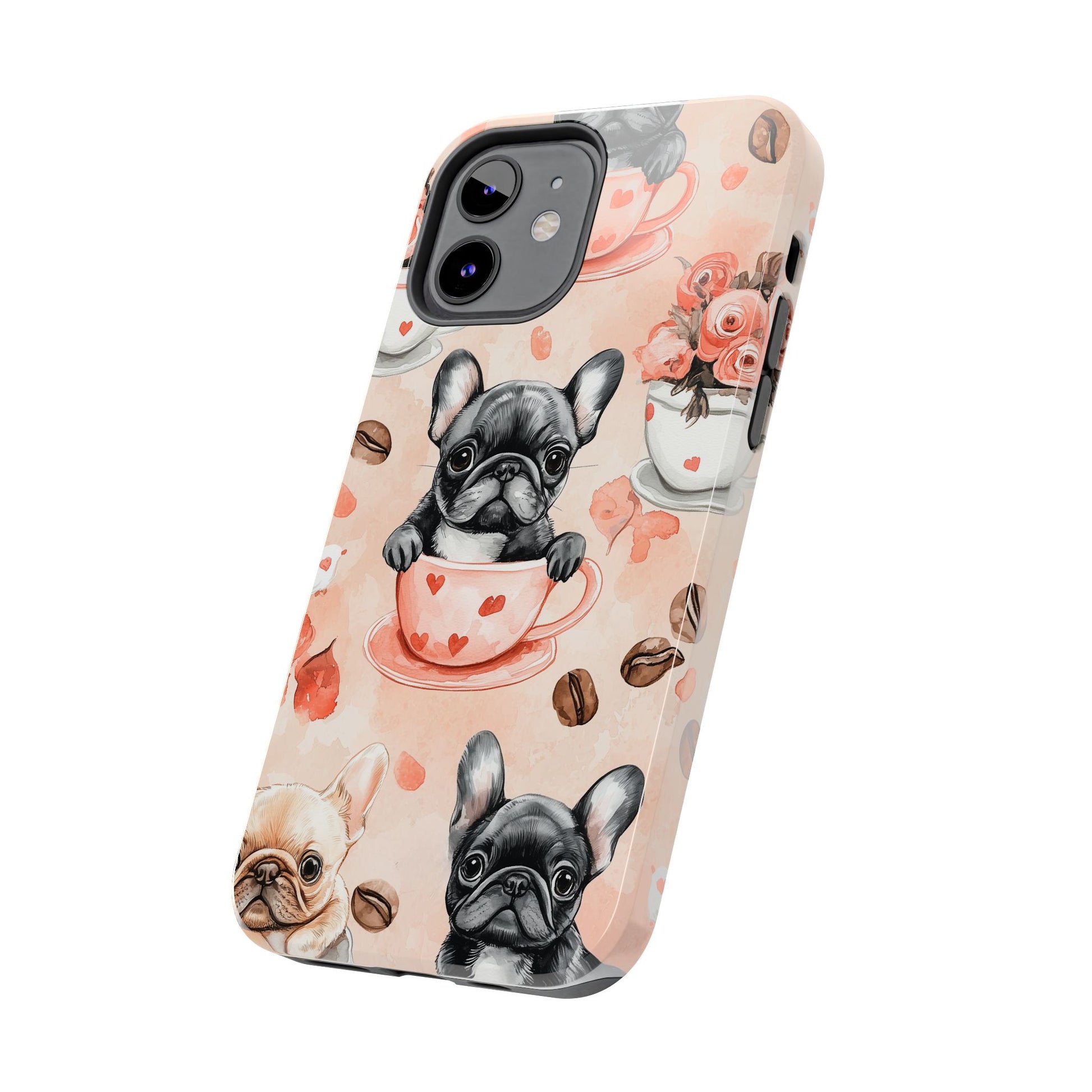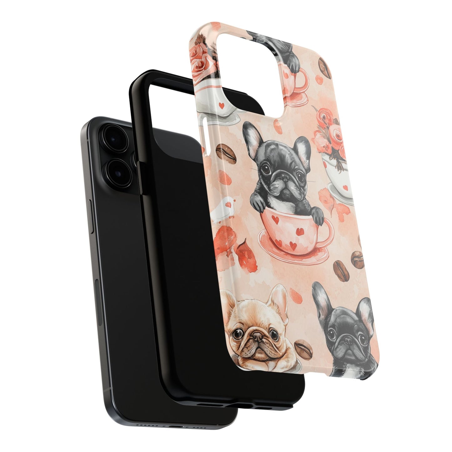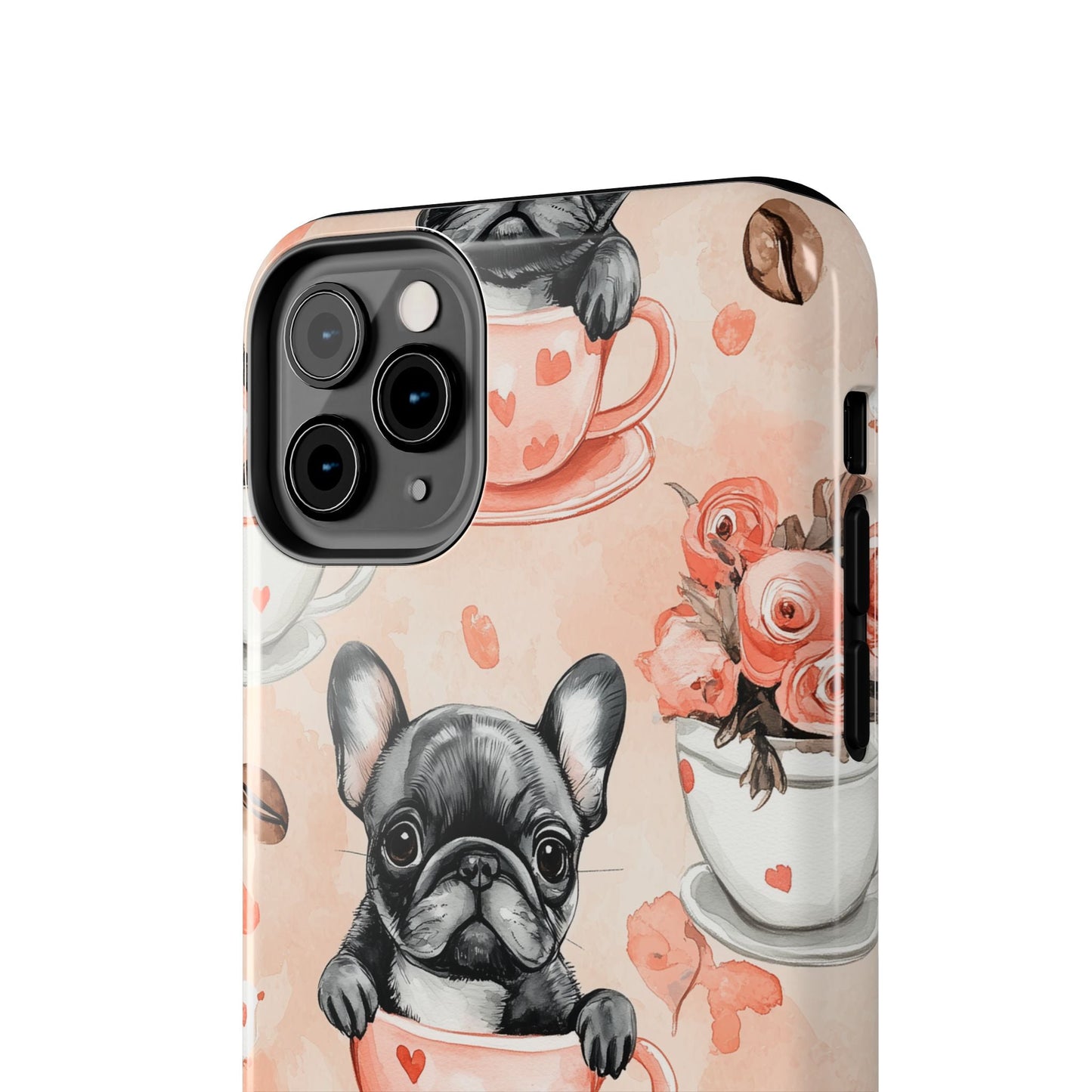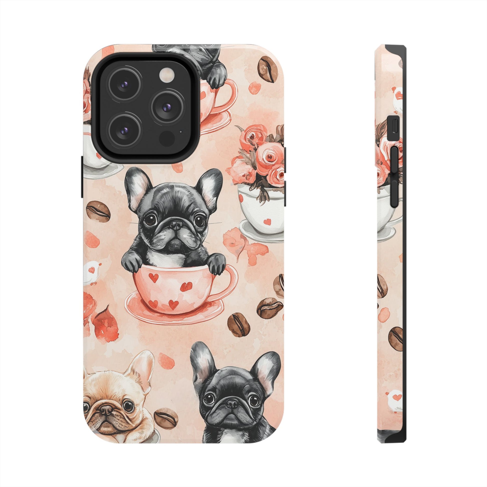 Show off your love for French Bulldogs with this adorable French Bulldogs in Heart iPhone case! Featuring charming black and tan Frenchies nestled in heart-decorated teacups, surrounded by delicate roses, coffee beans, and watercolor-style hearts, this case offers a playful yet elegant touch t...