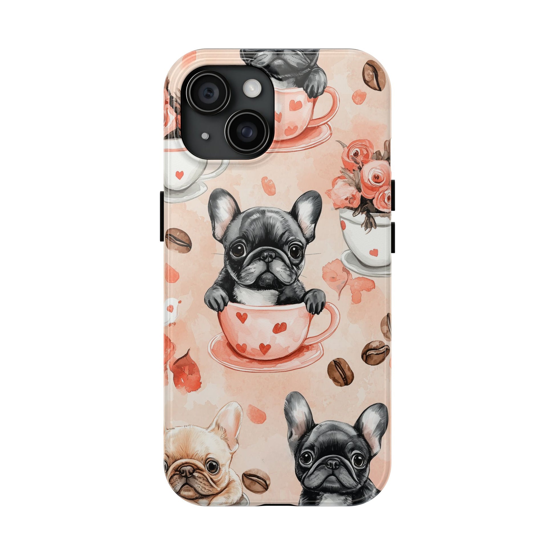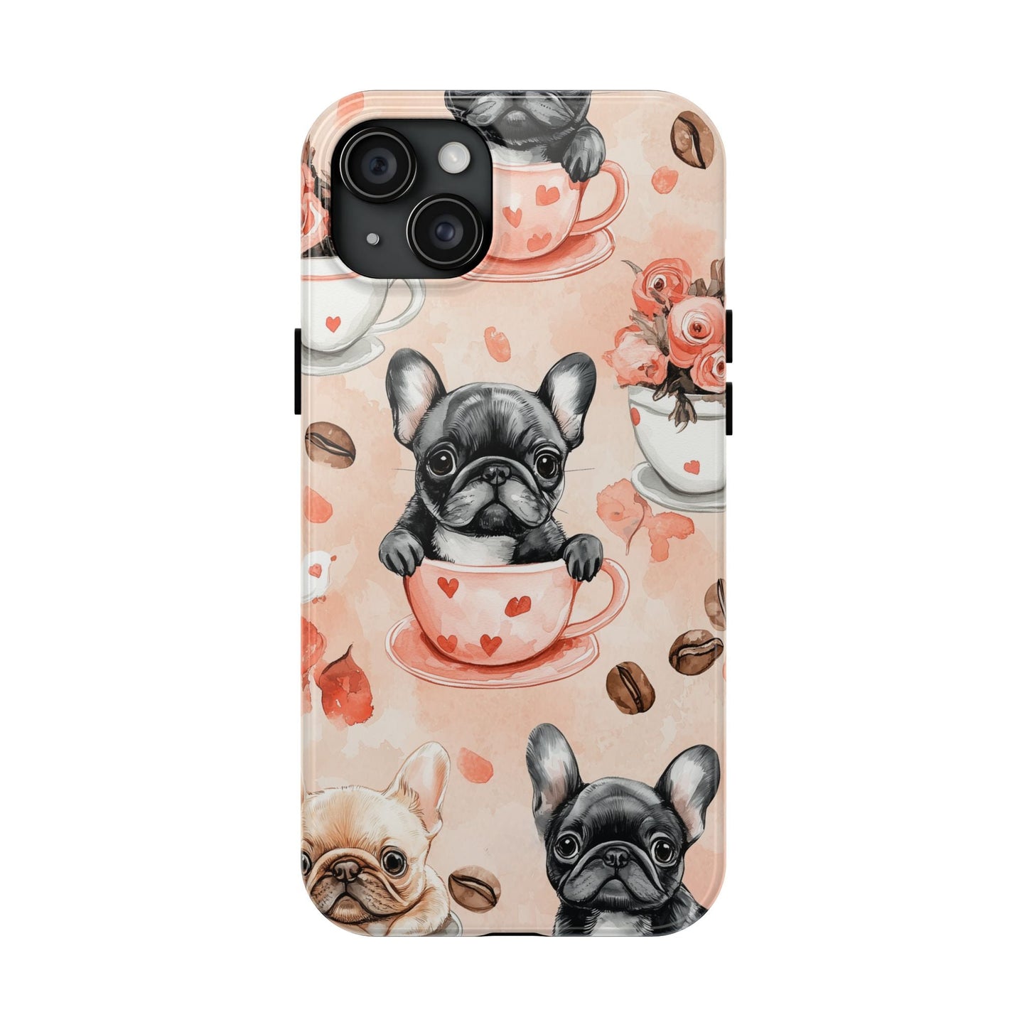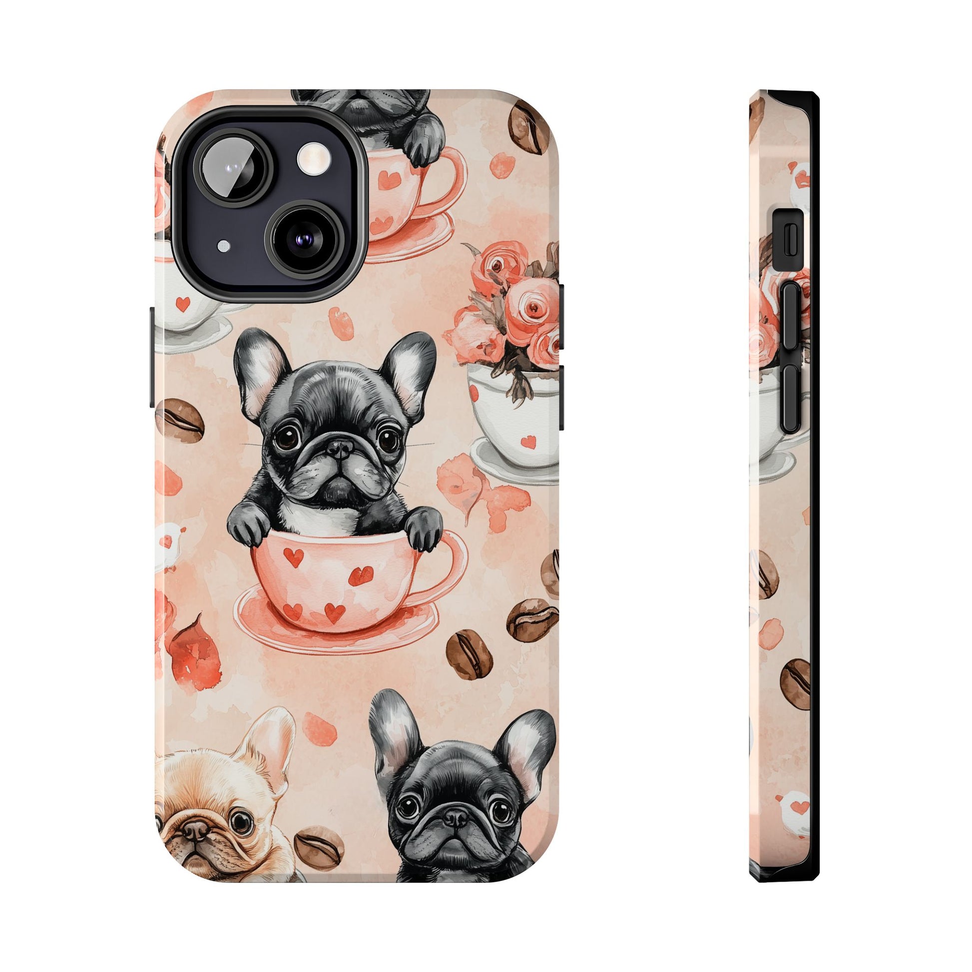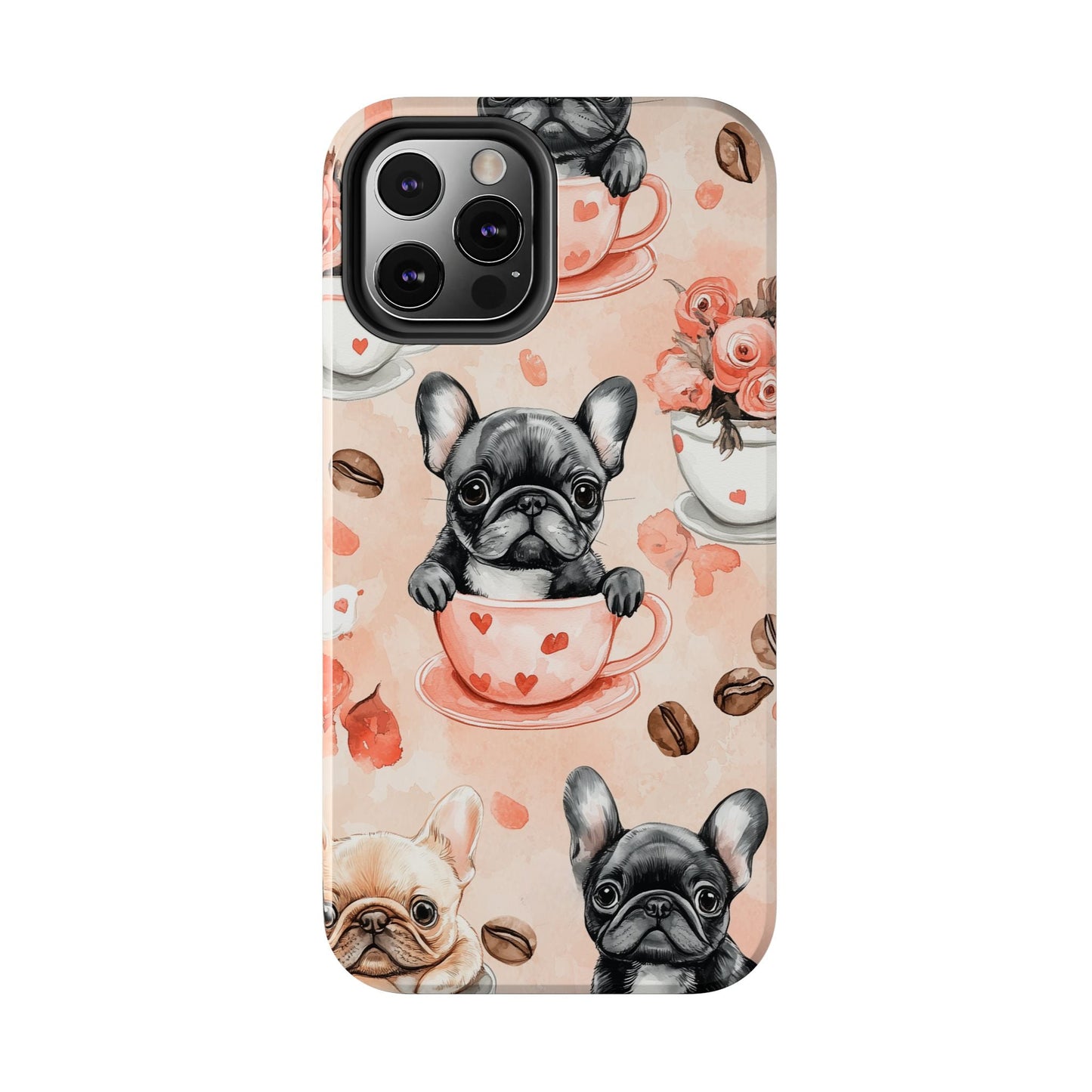 Show off your love for French Bulldogs with this adorable French Bulldogs in Heart iPhone case! Featuring charming black and tan Frenchies nestled in heart-decorated teacups, surrounded by delicate roses, coffee beans, and watercolor-style hearts, this case offers a playful yet elegant touch t...