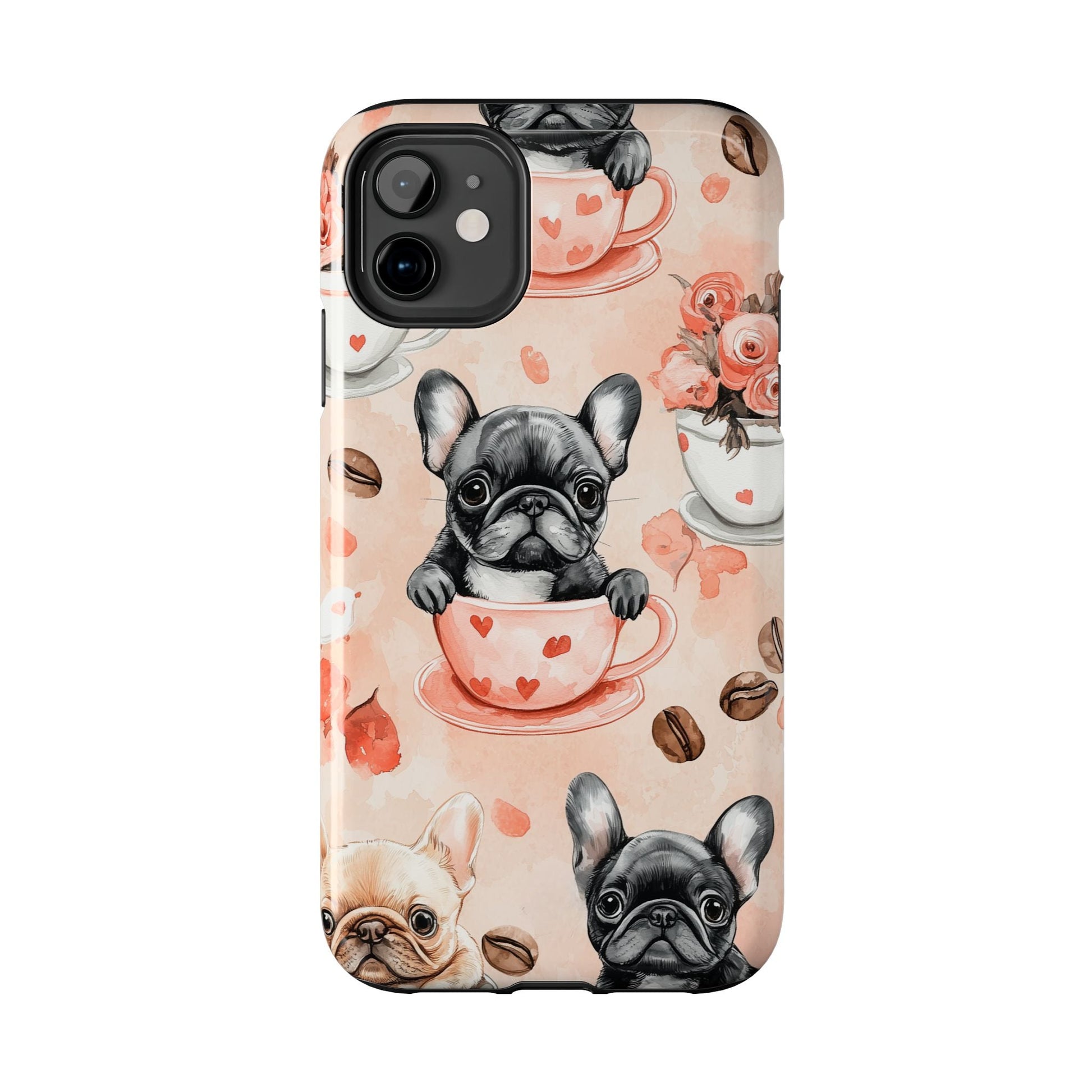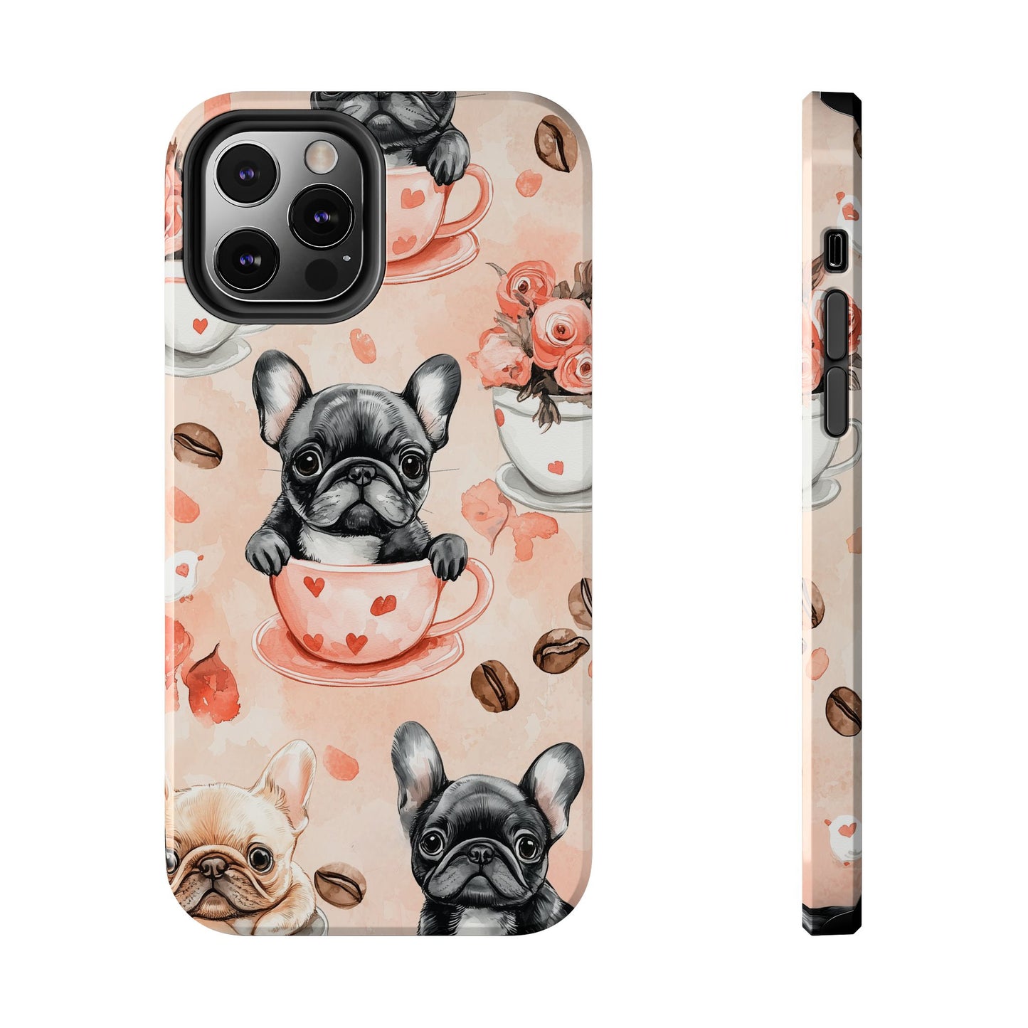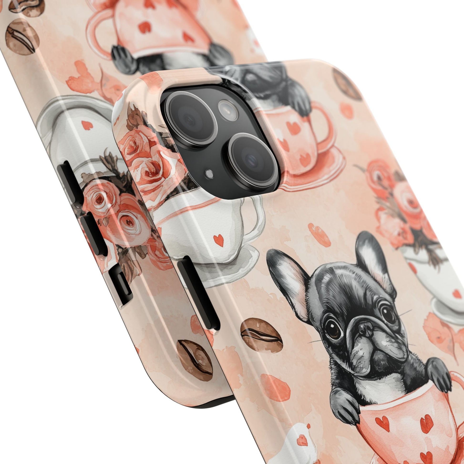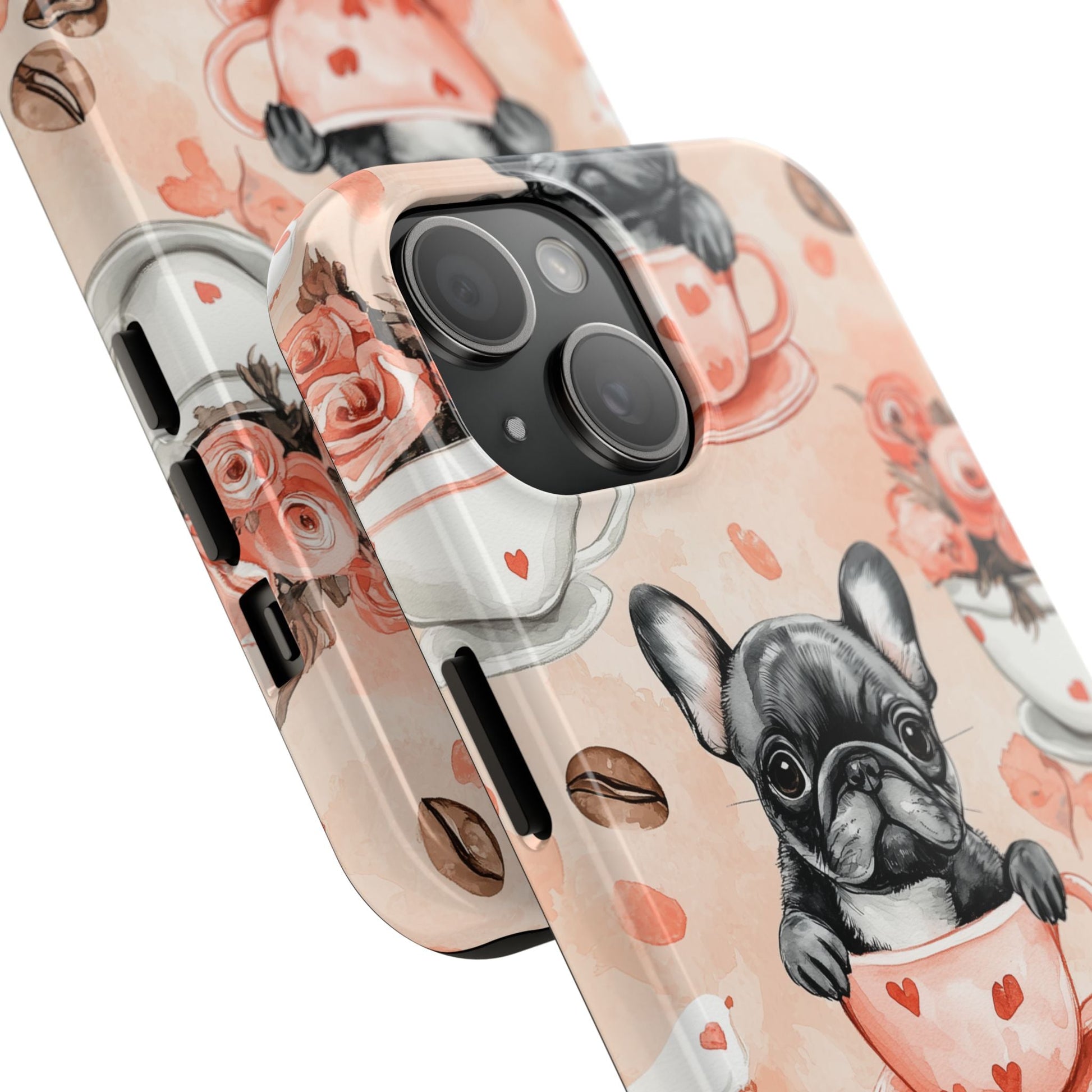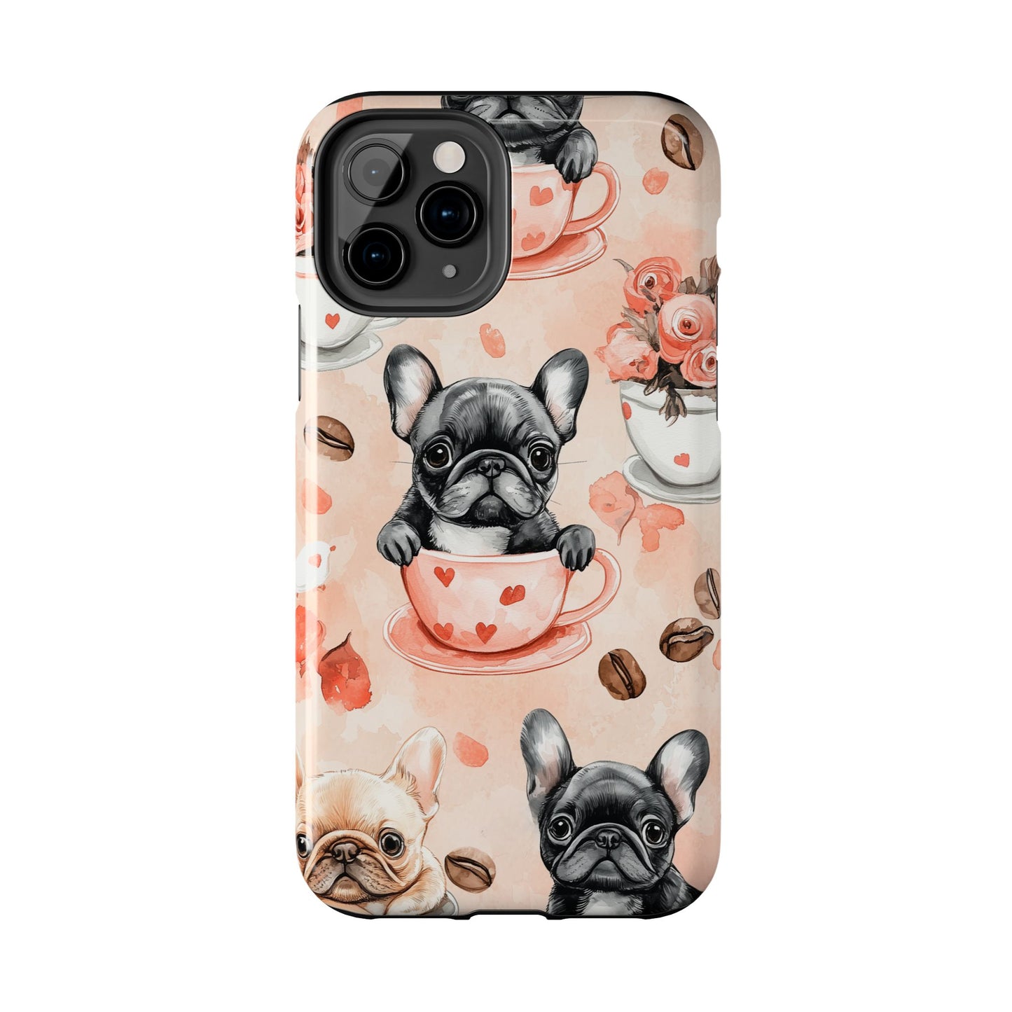 Show off your love for French Bulldogs with this adorable French Bulldogs in Heart iPhone case! Featuring charming black and tan Frenchies nestled in heart-decorated teacups, surrounded by delicate roses, coffee beans, and watercolor-style hearts, this case offers a playful yet elegant touch t...