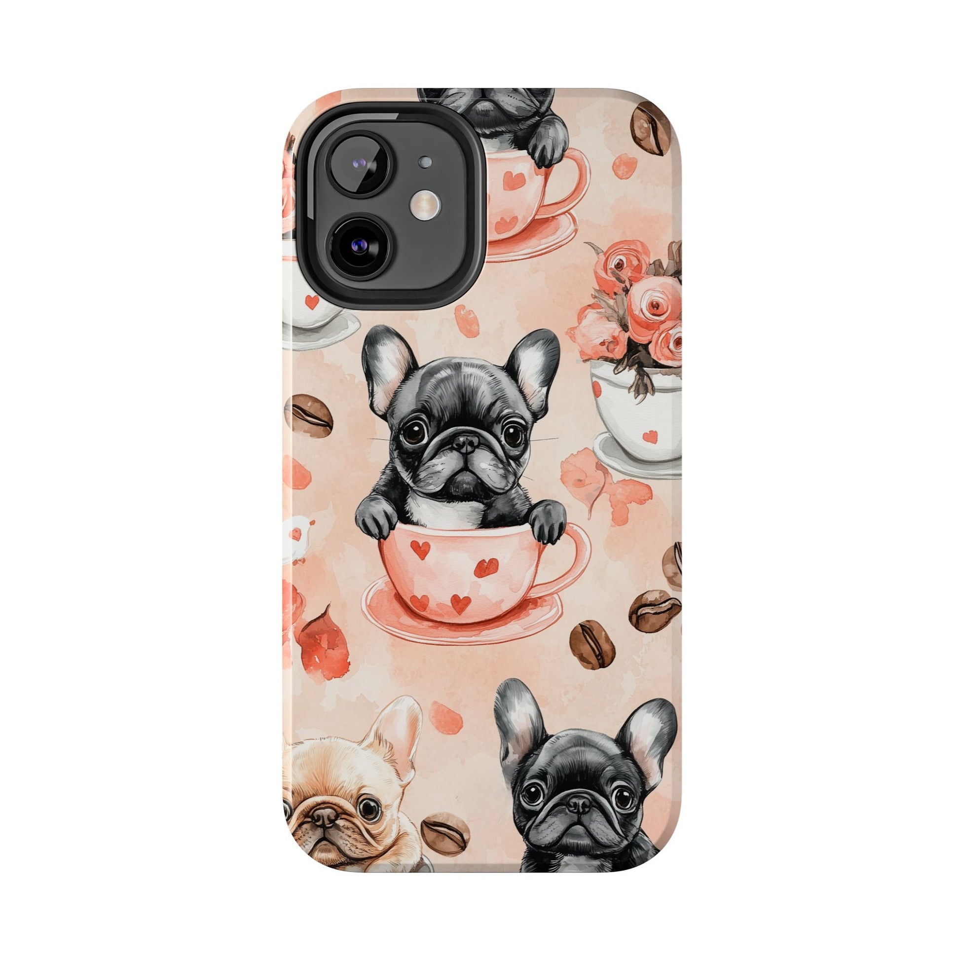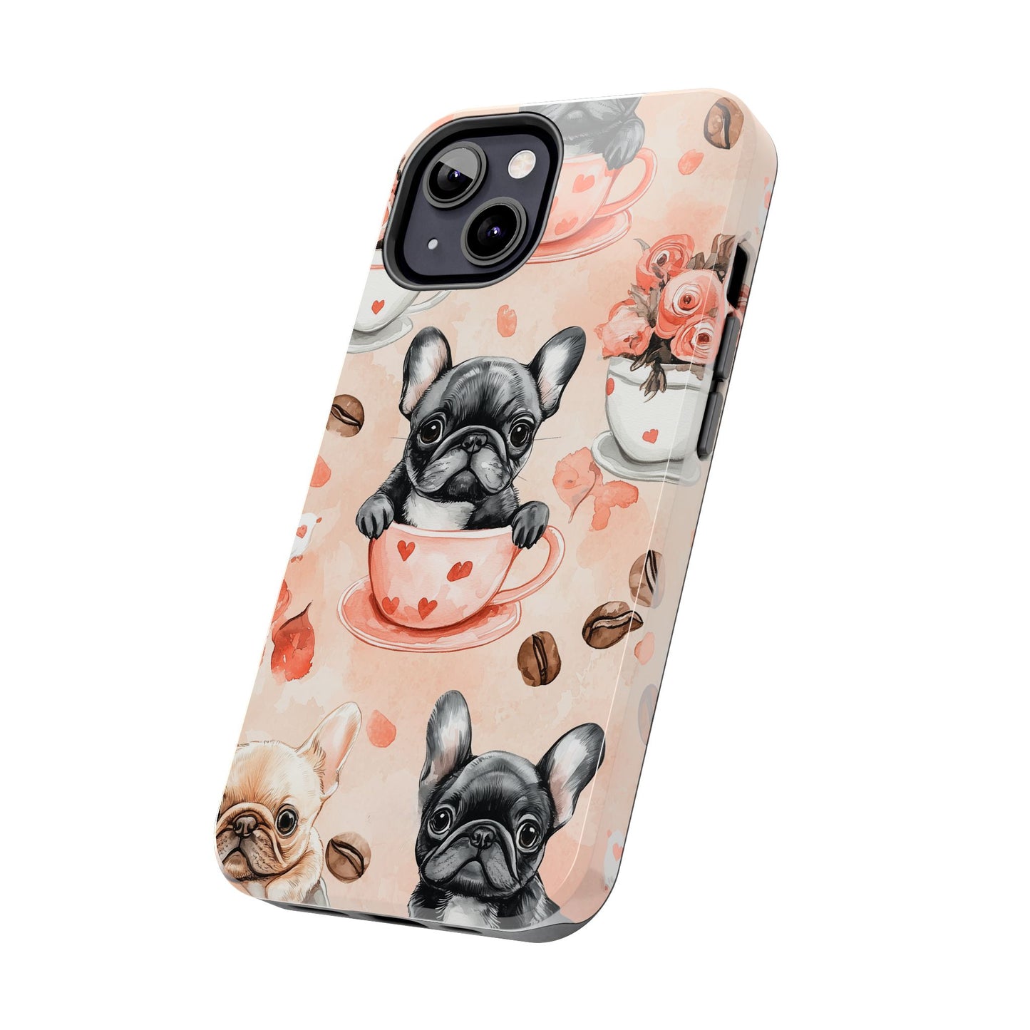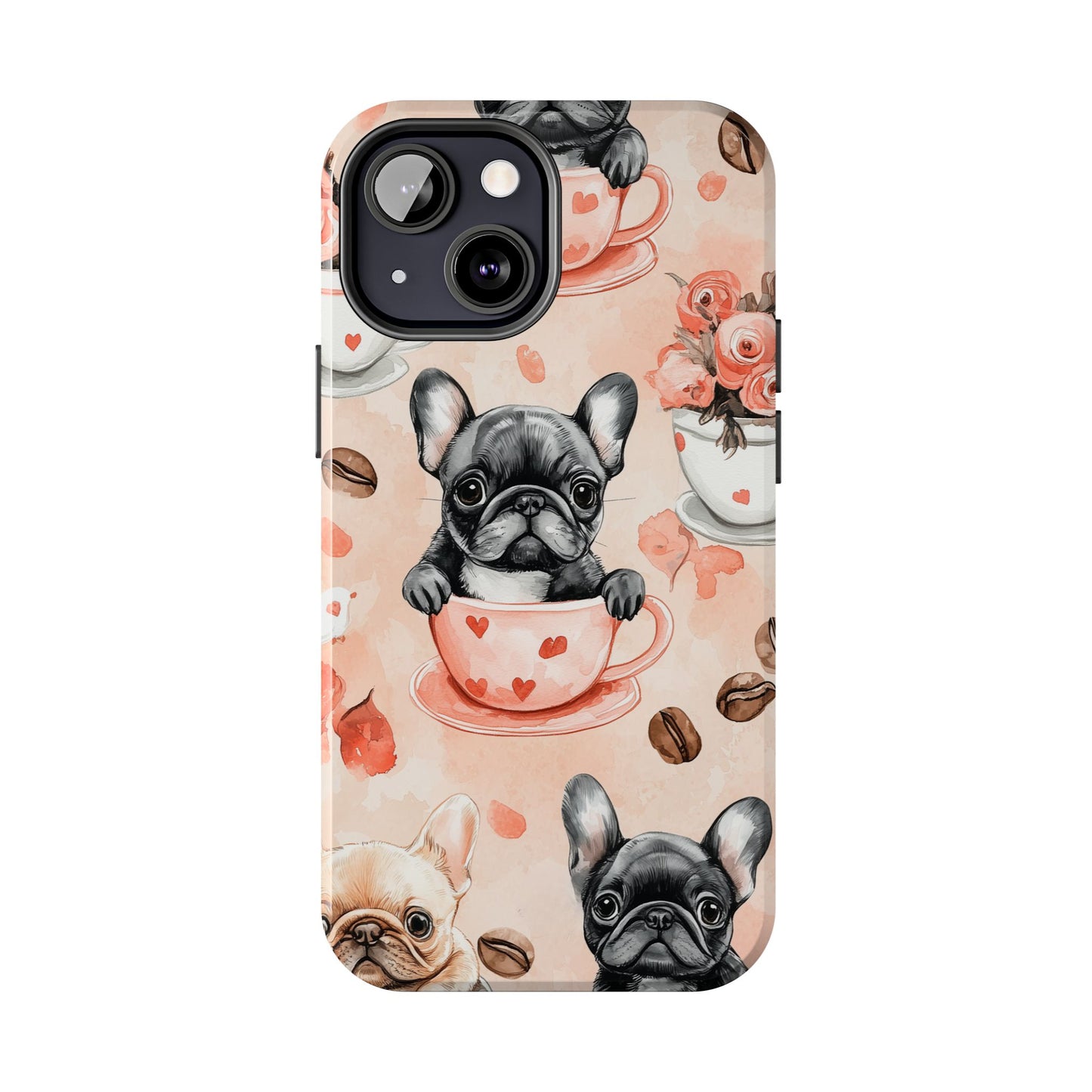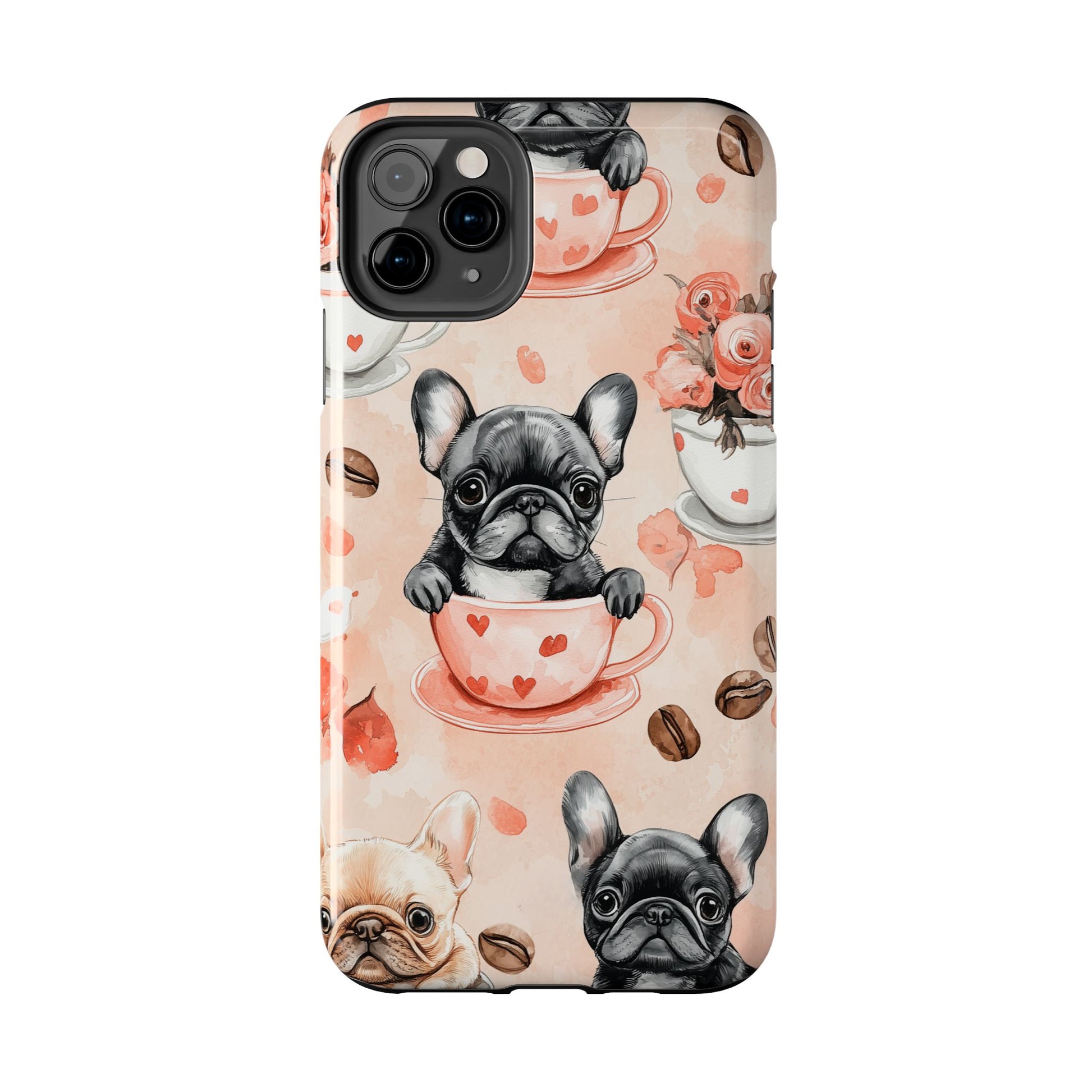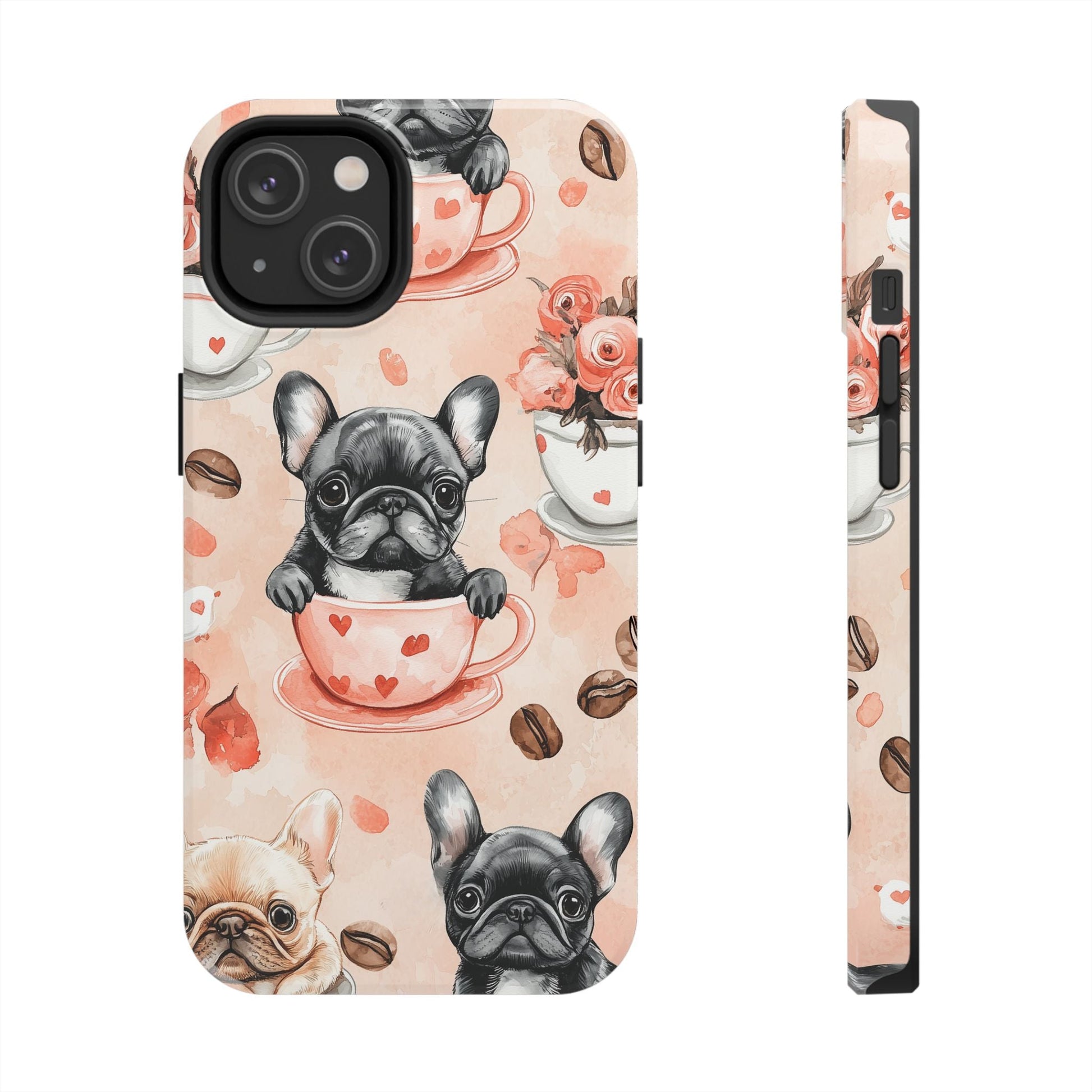 Show off your love for French Bulldogs with this adorable French Bulldogs in Heart iPhone case! Featuring charming black and tan Frenchies nestled in heart-decorated teacups, surrounded by delicate roses, coffee beans, and watercolor-style hearts, this case offers a playful yet elegant touch t...