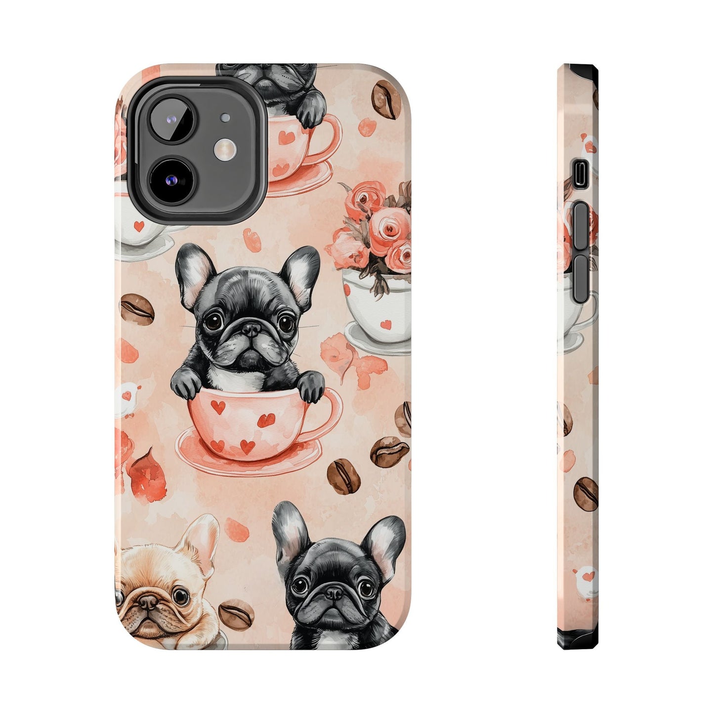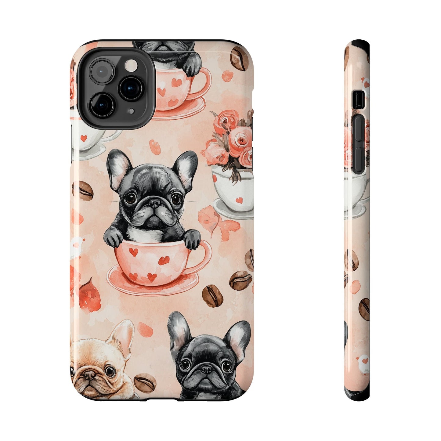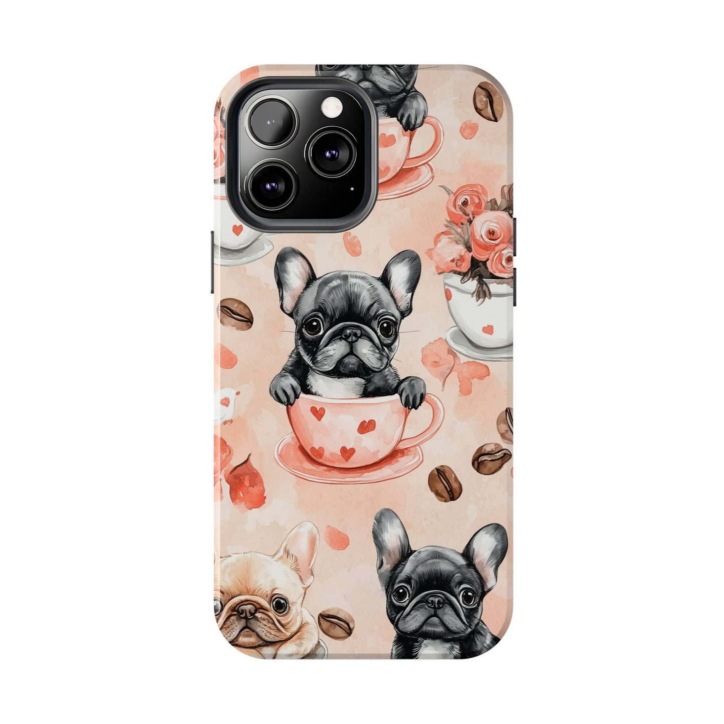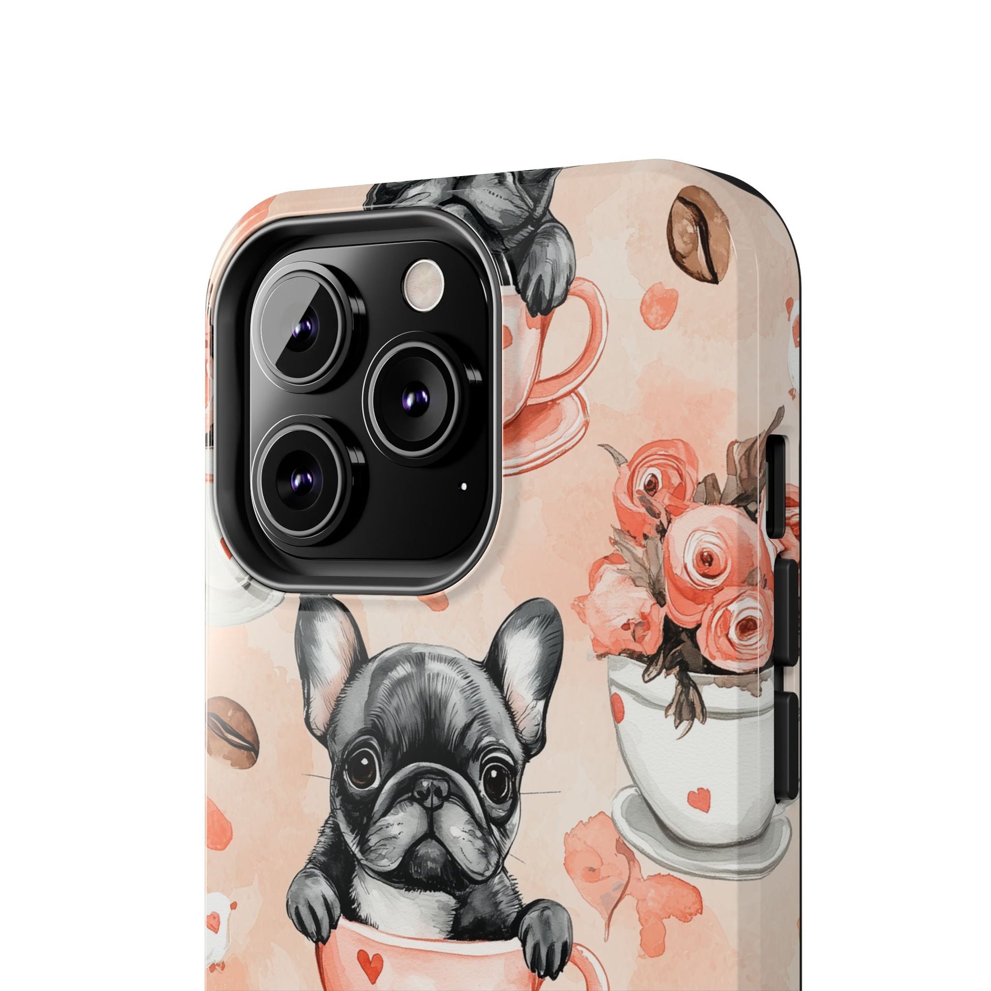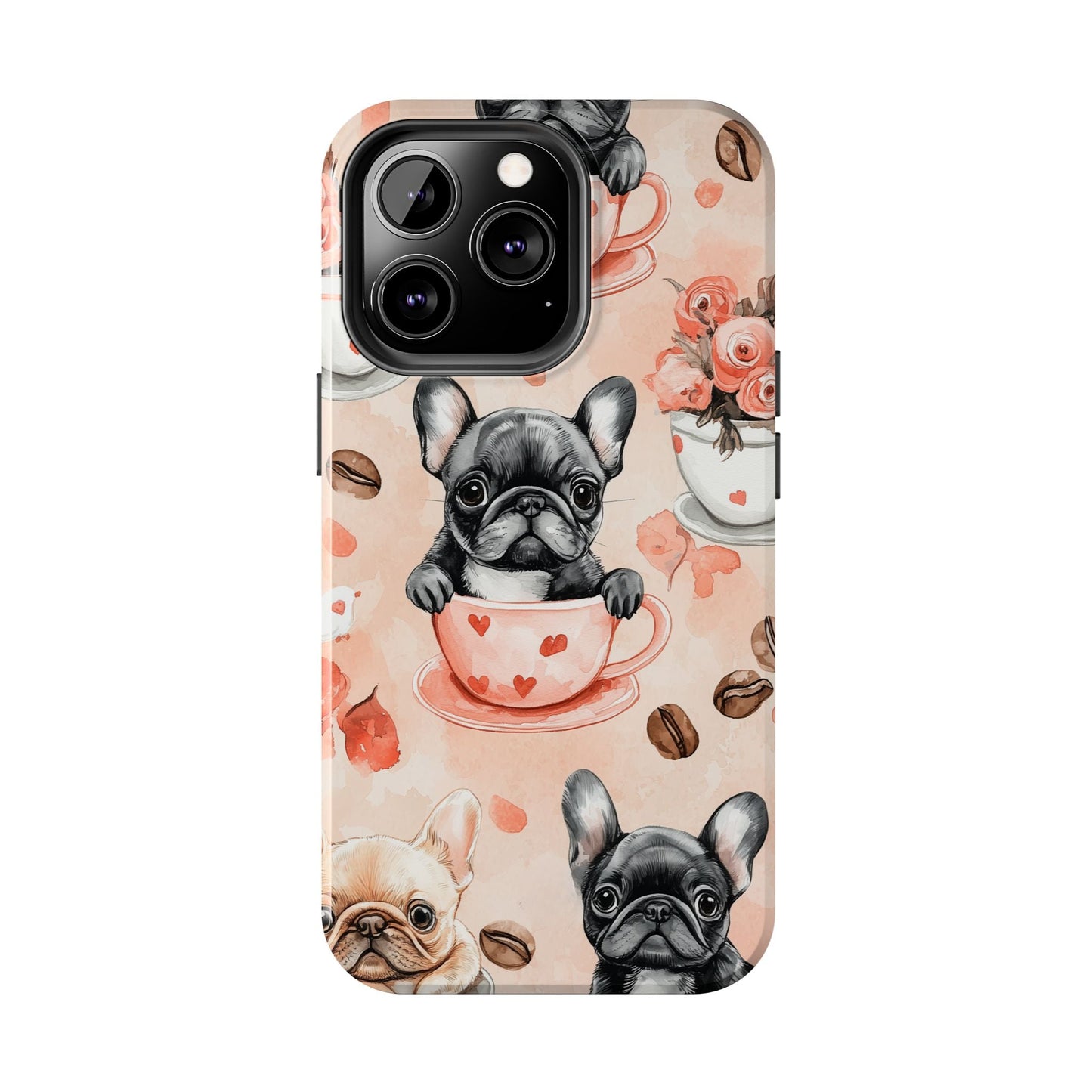 Show off your love for French Bulldogs with this adorable French Bulldogs in Heart iPhone case! Featuring charming black and tan Frenchies nestled in heart-decorated teacups, surrounded by delicate roses, coffee beans, and watercolor-style hearts, this case offers a playful yet elegant touch t...