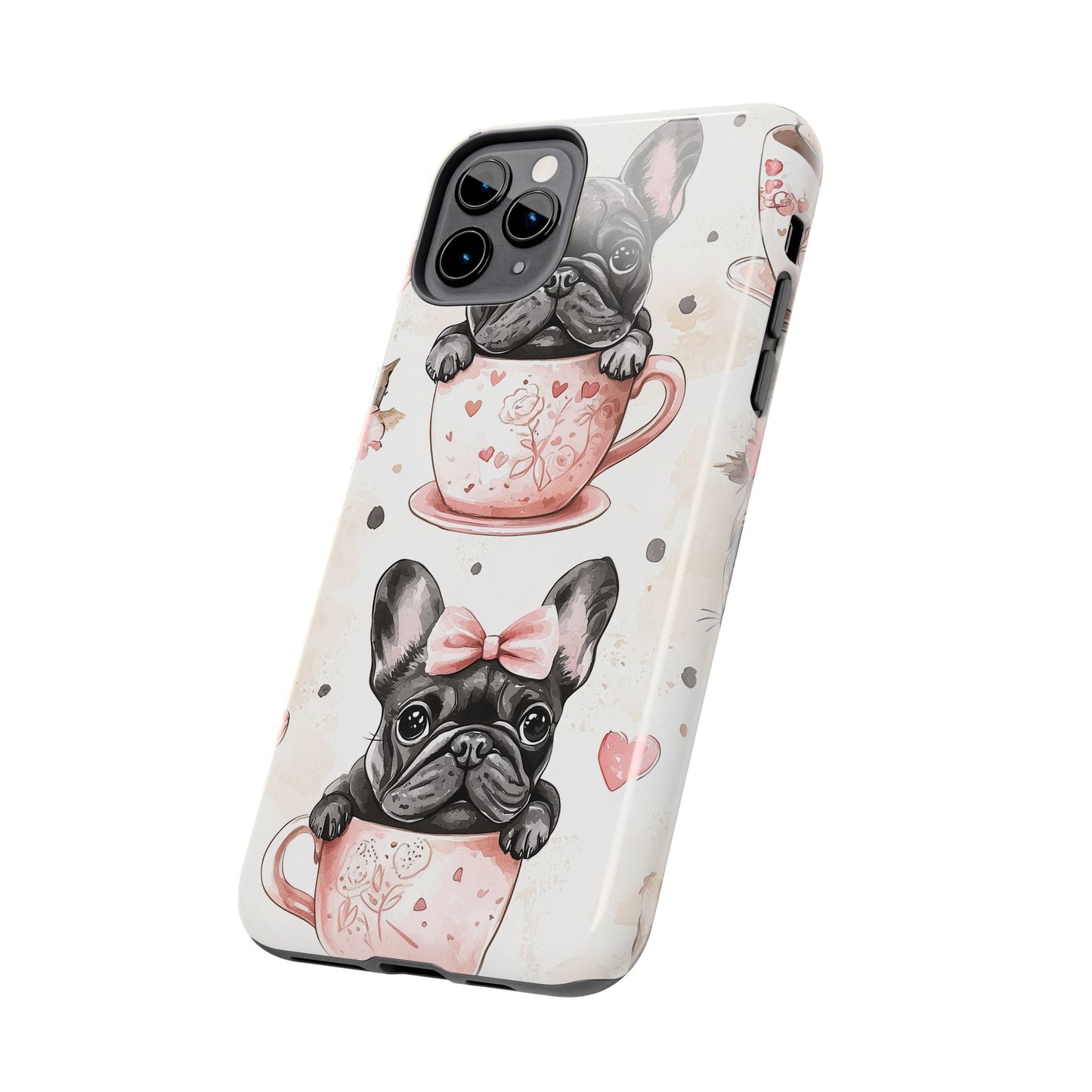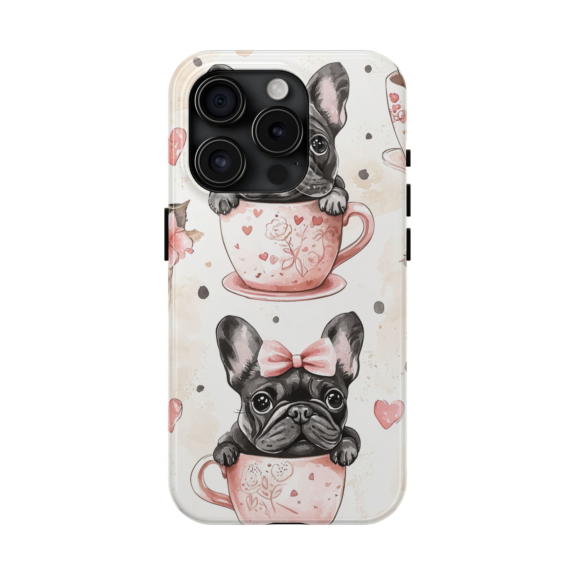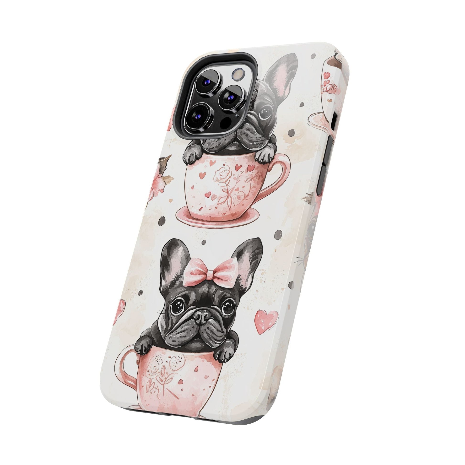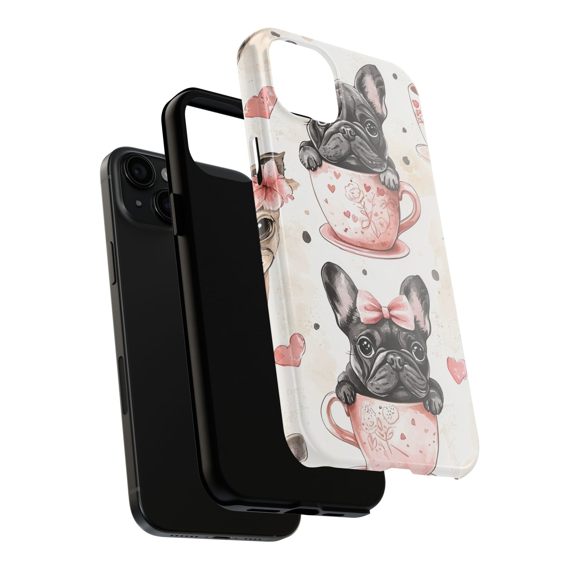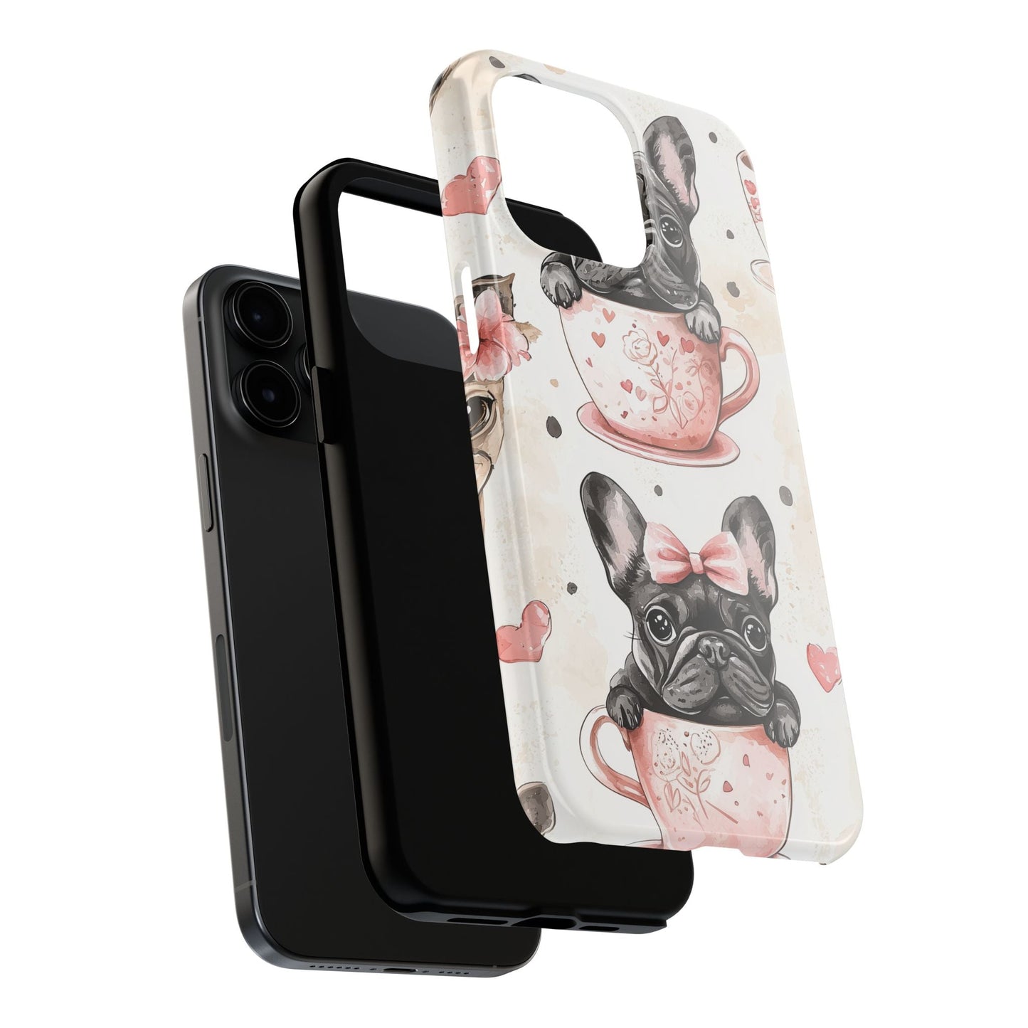 French Bulldogs in Teacups iPhone Case – Cute Dog Design with Hearts & Bows, Shockproof & Slim