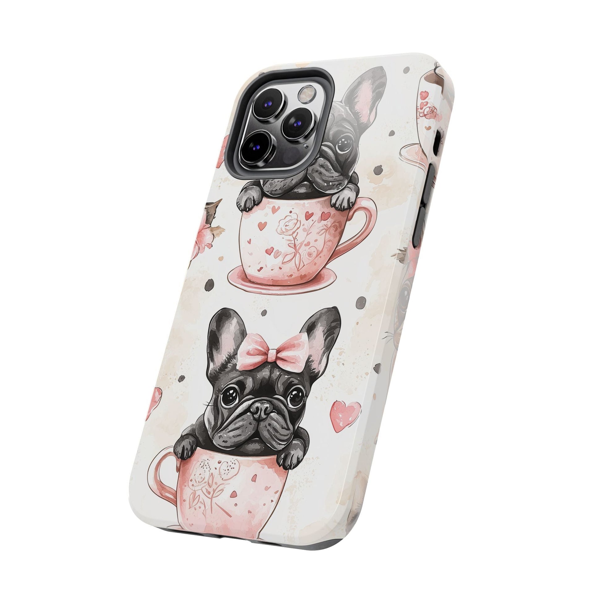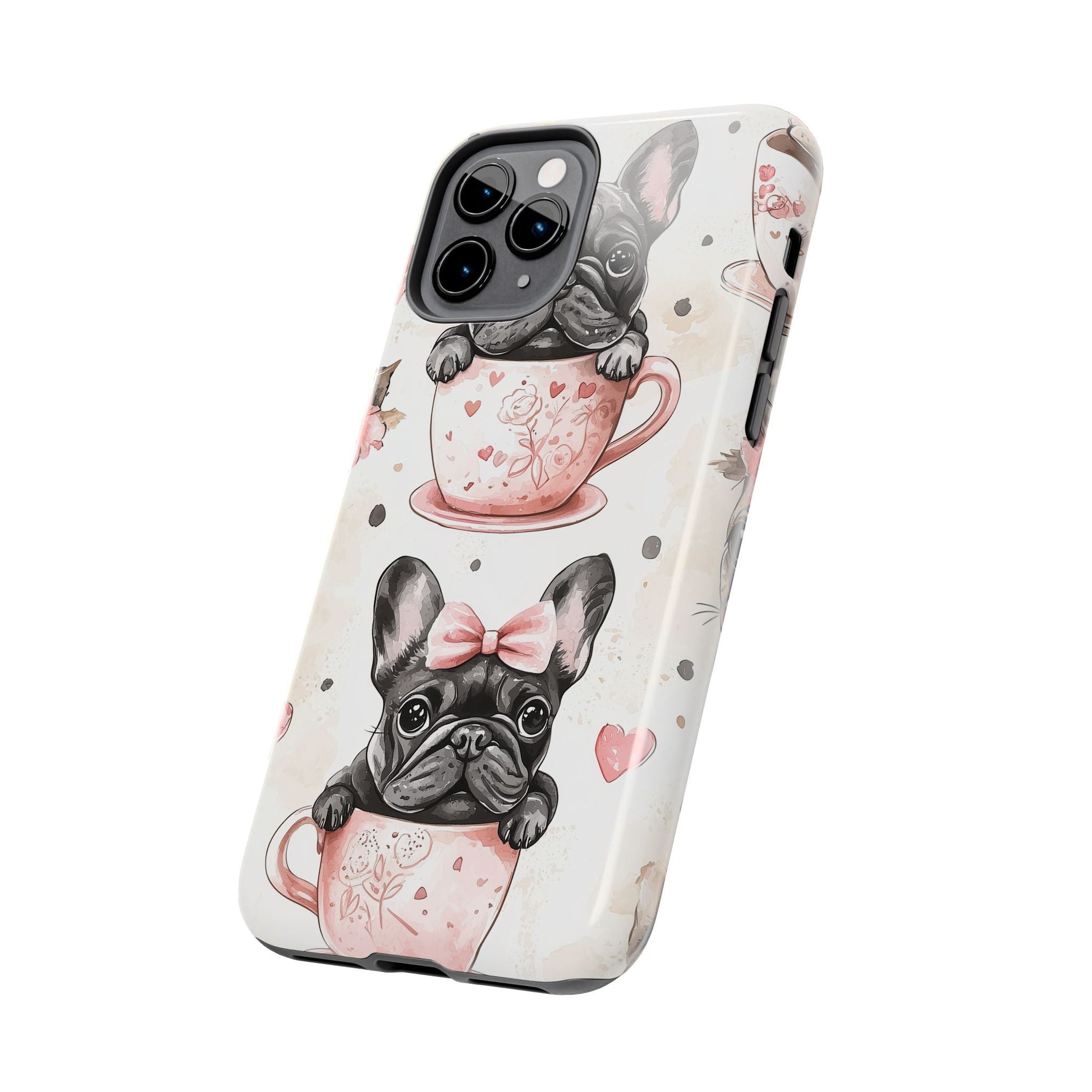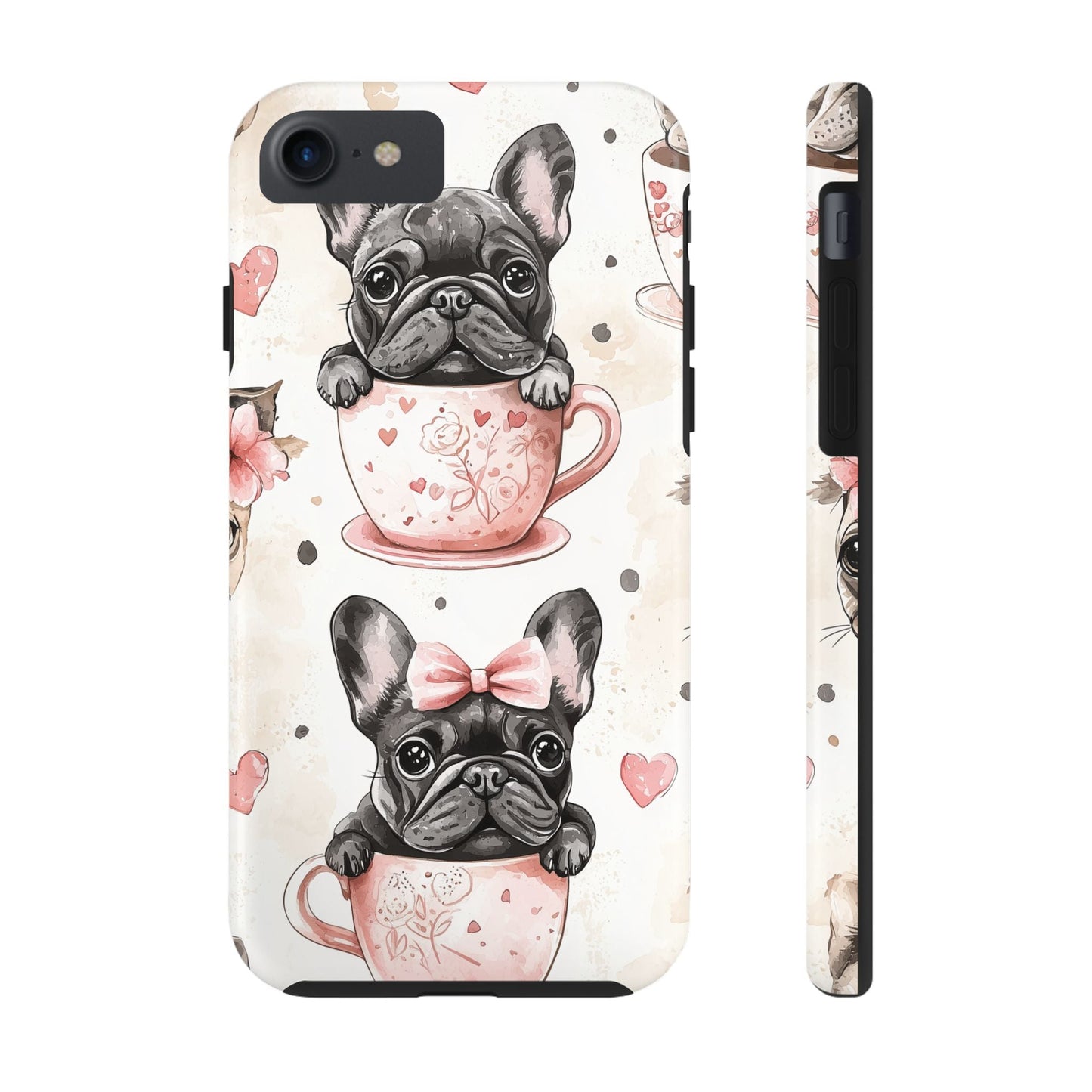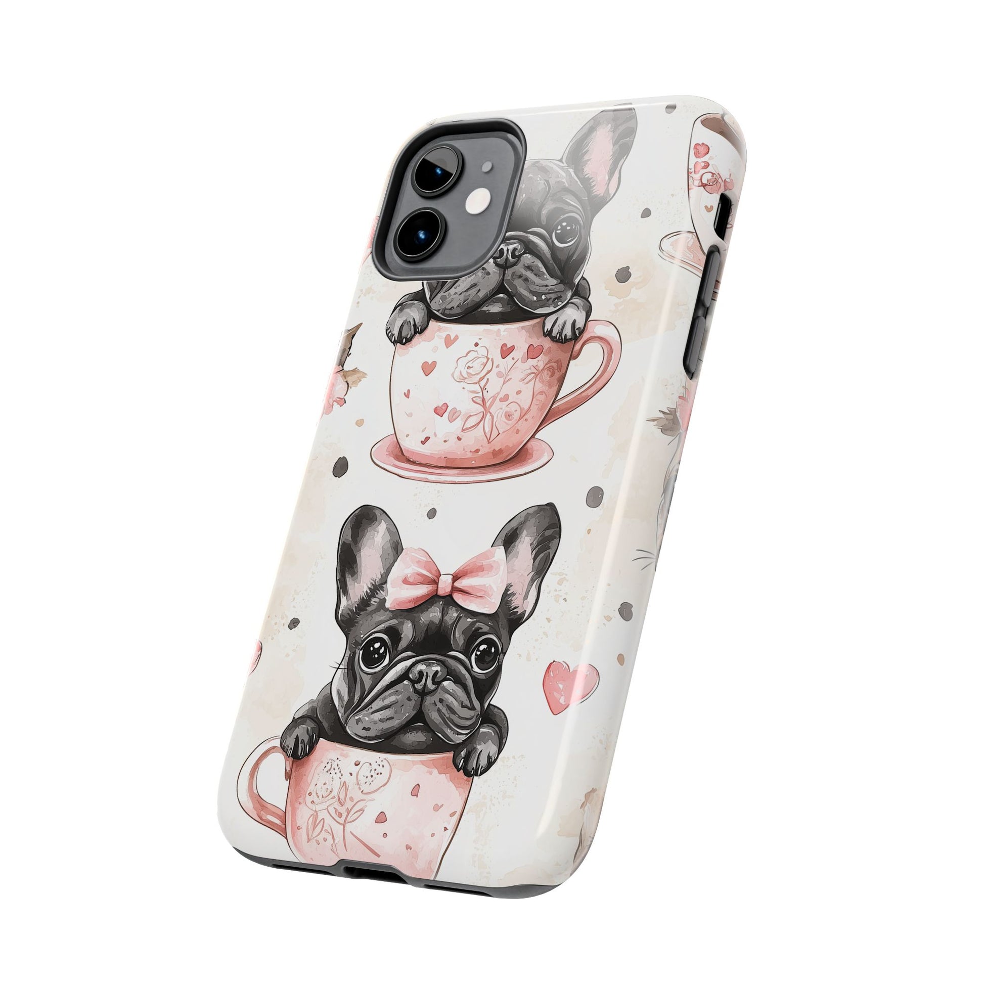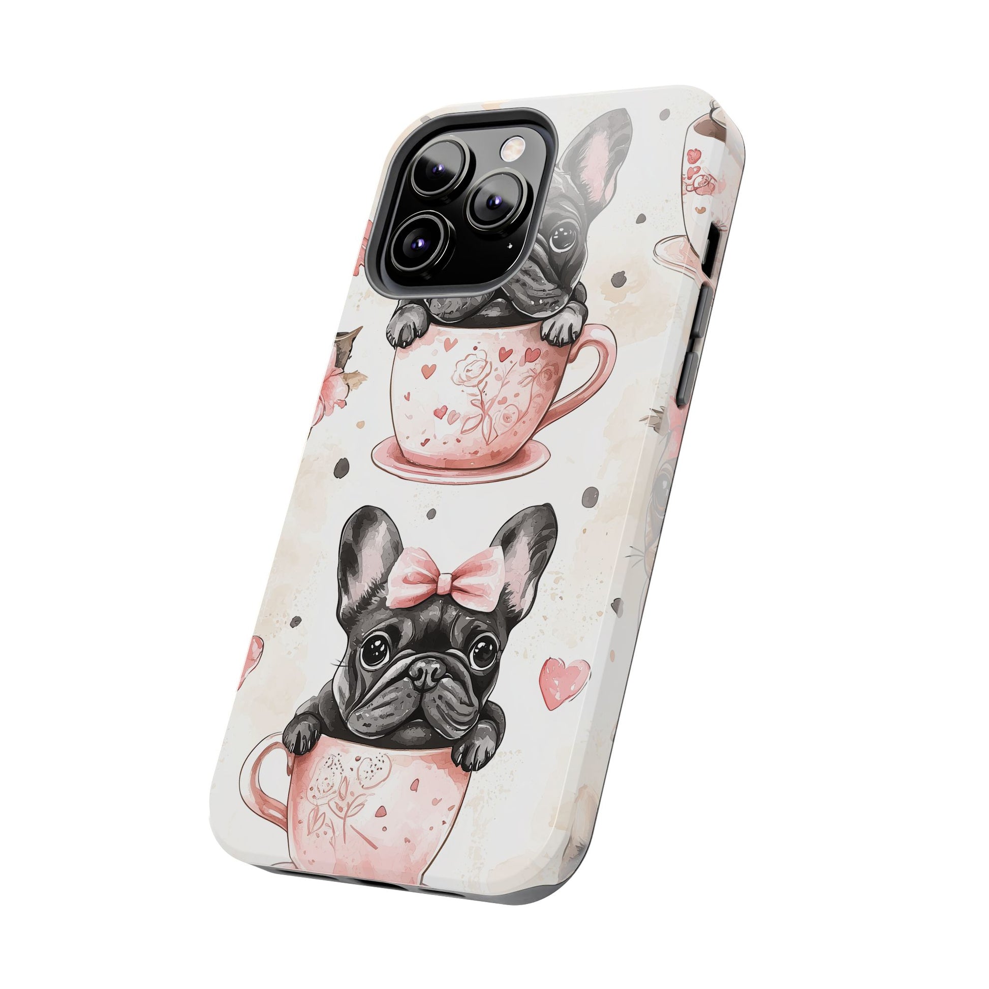 French Bulldogs in Teacups iPhone Case – Cute Dog Design with Hearts & Bows, Shockproof & Slim