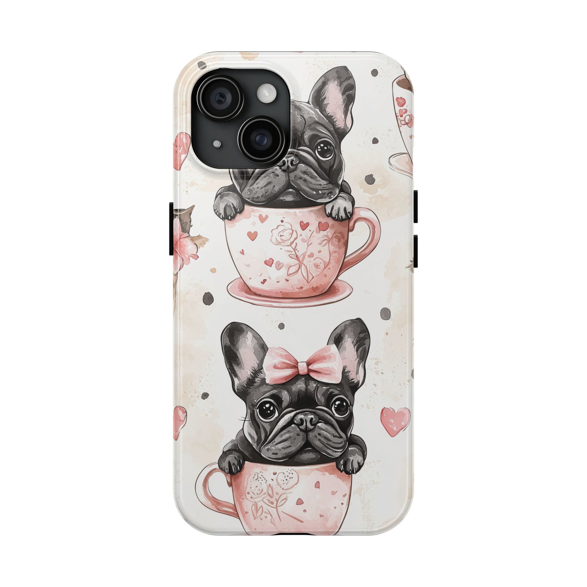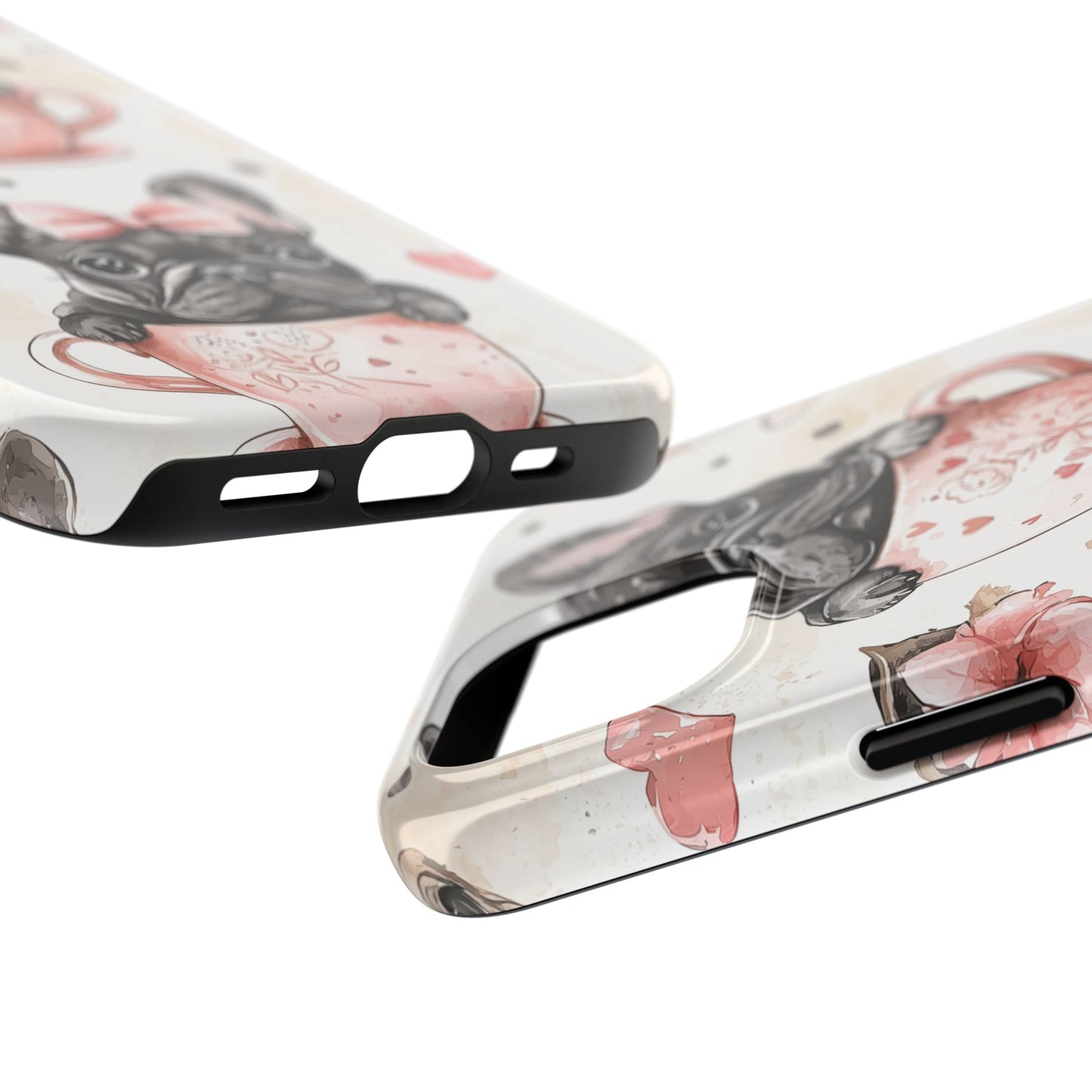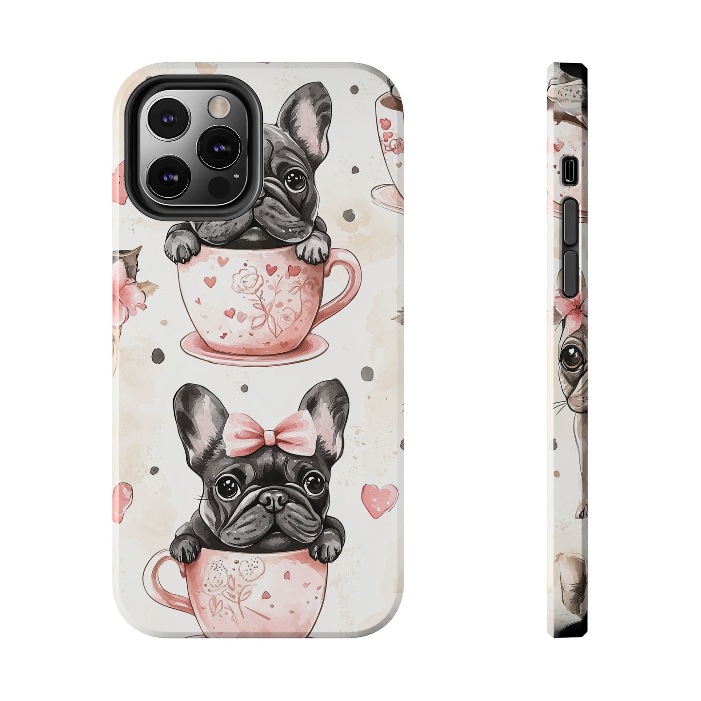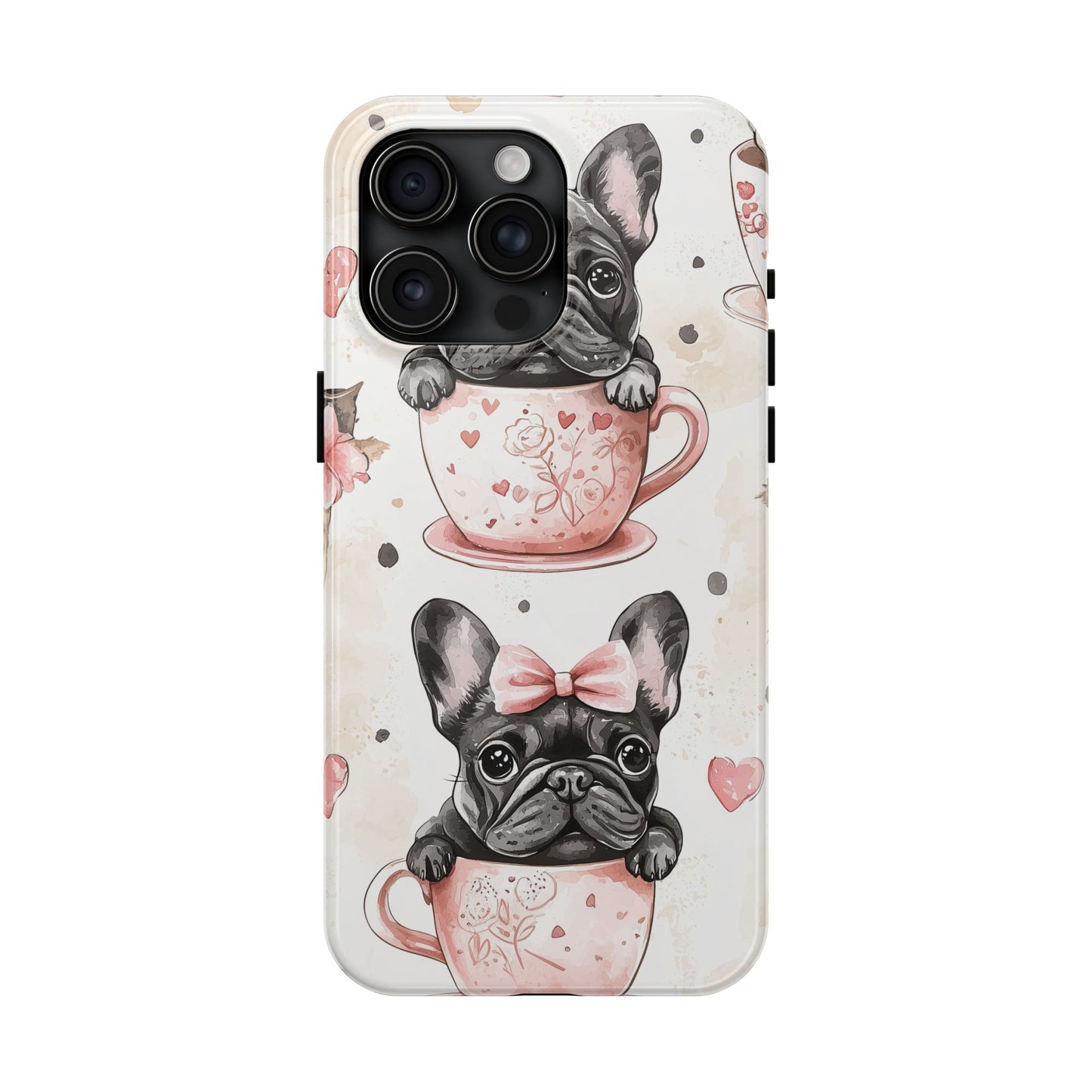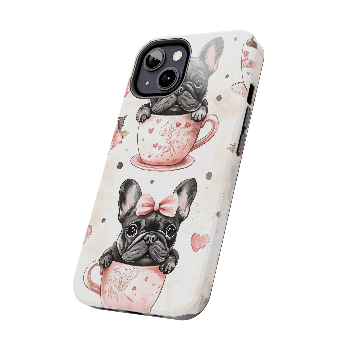 French Bulldogs in Teacups iPhone Case – Cute Dog Design with Hearts & Bows, Shockproof & Slim