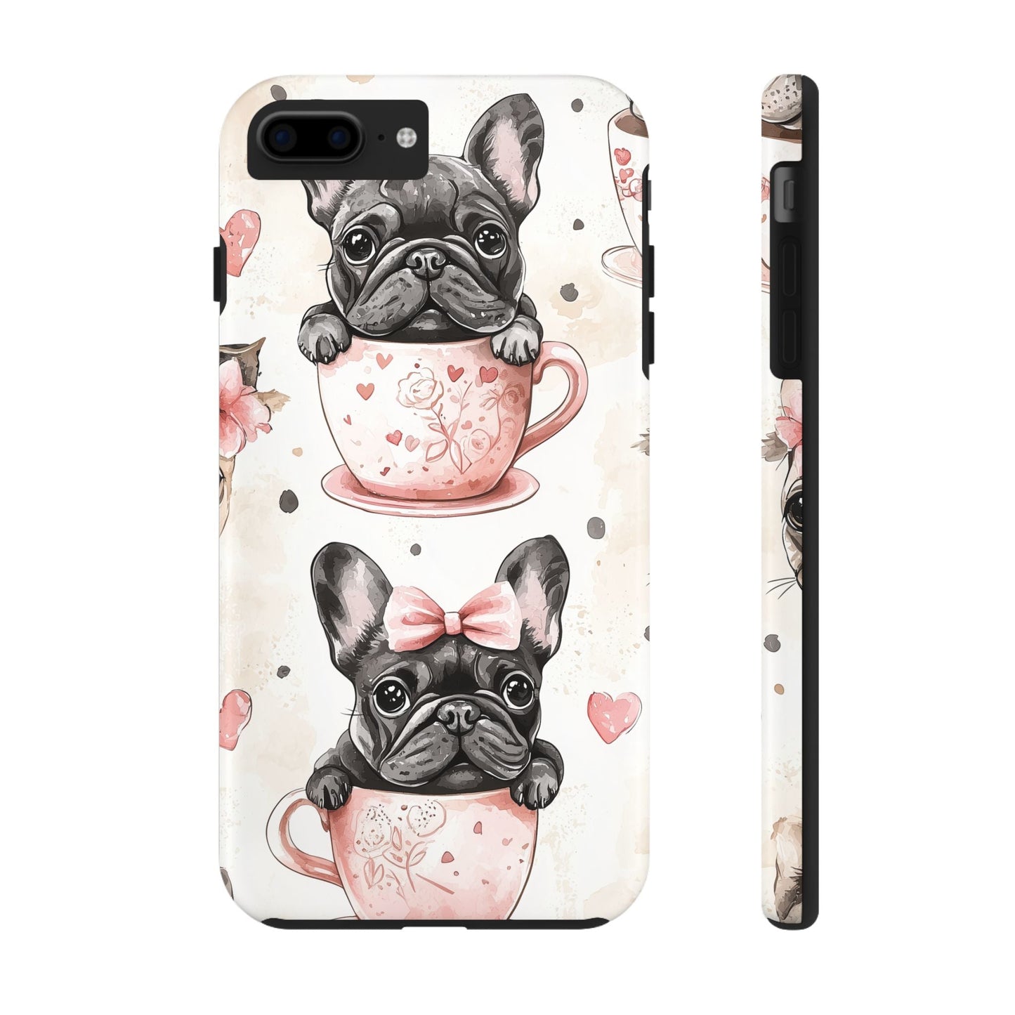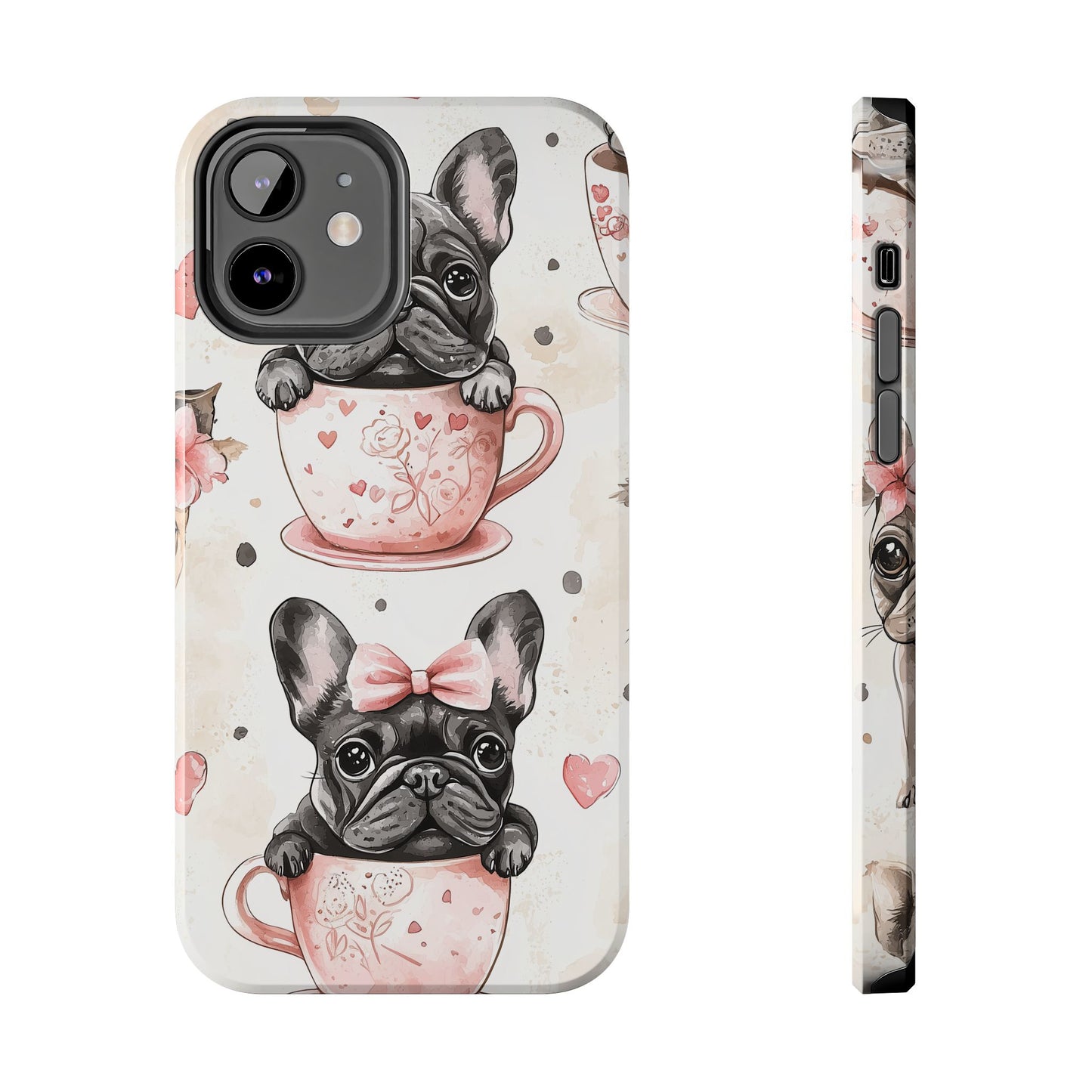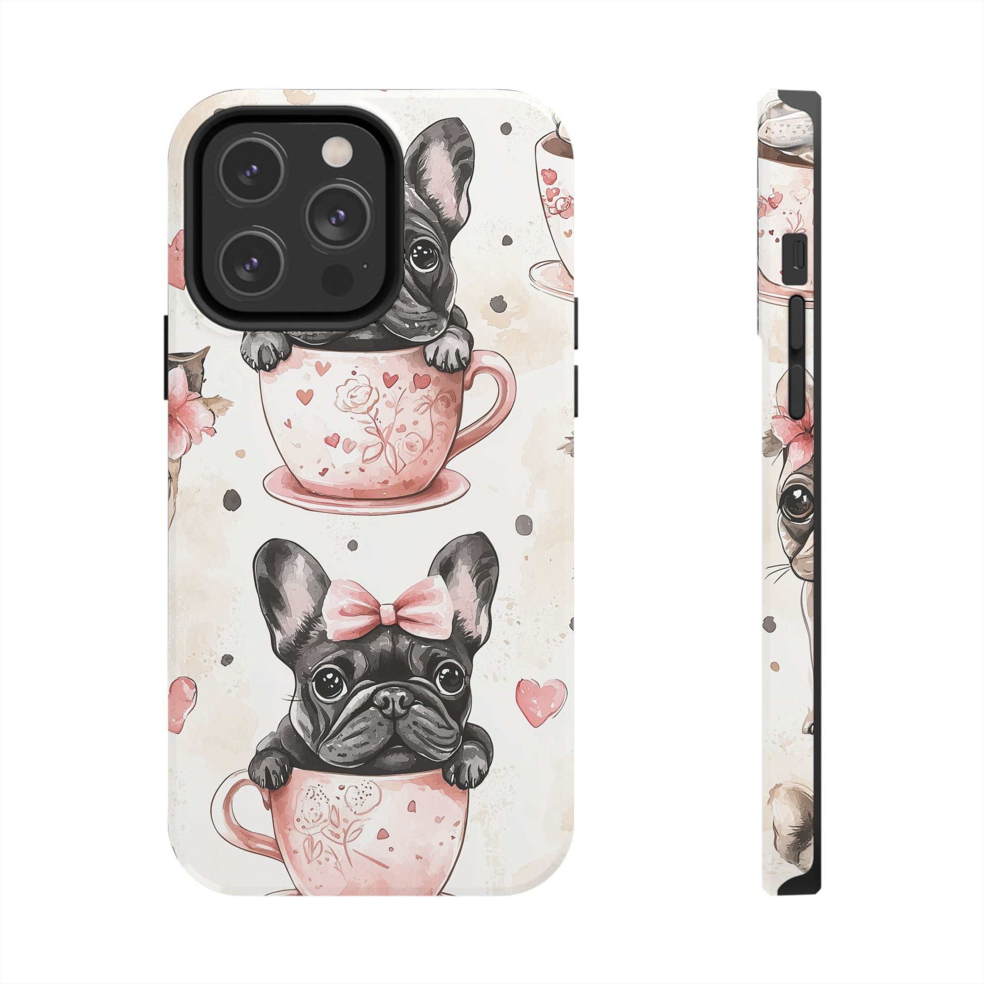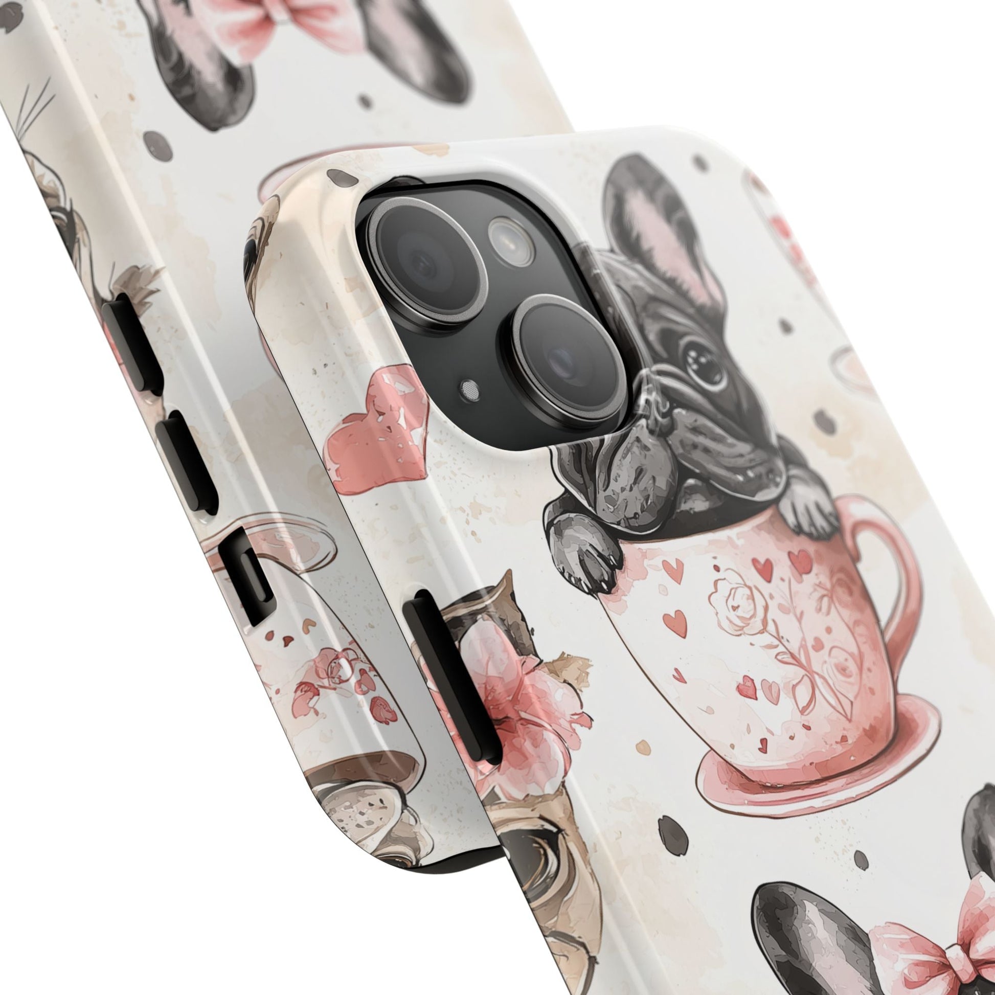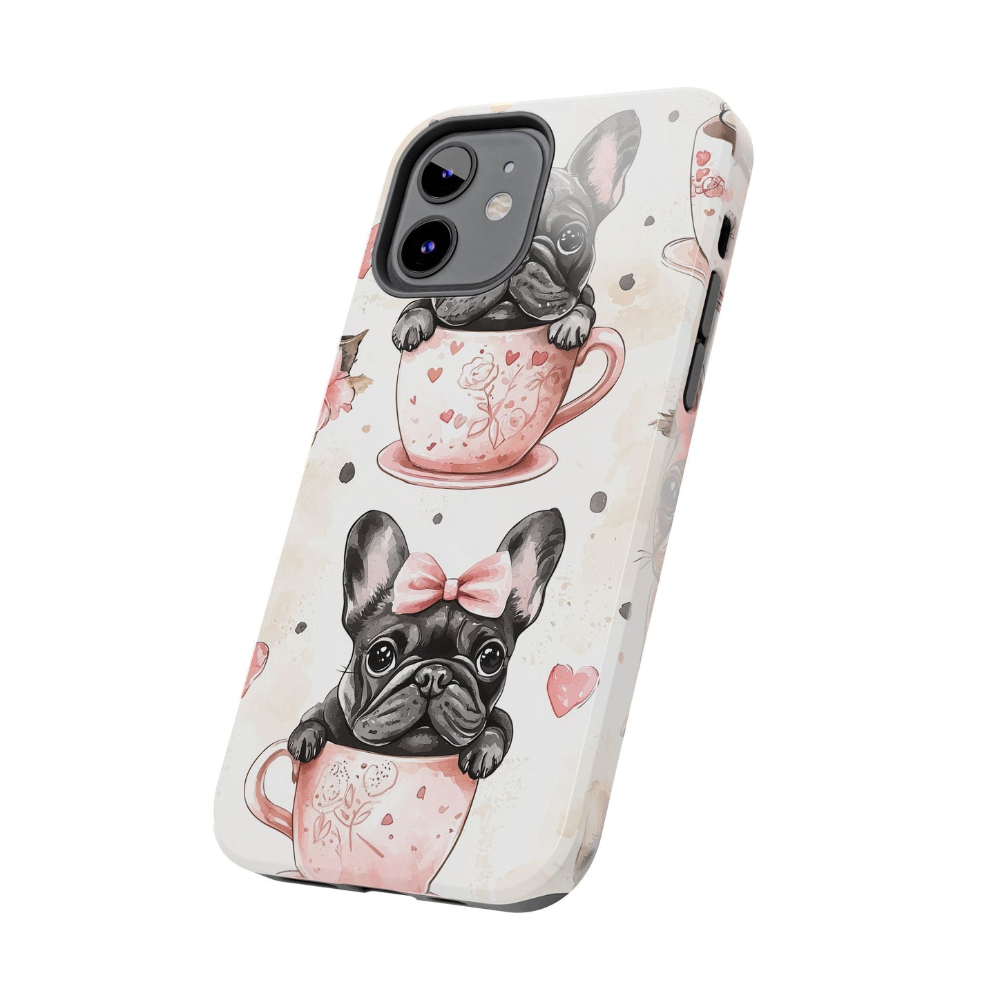 French Bulldogs in Teacups iPhone Case – Cute Dog Design with Hearts & Bows, Shockproof & Slim