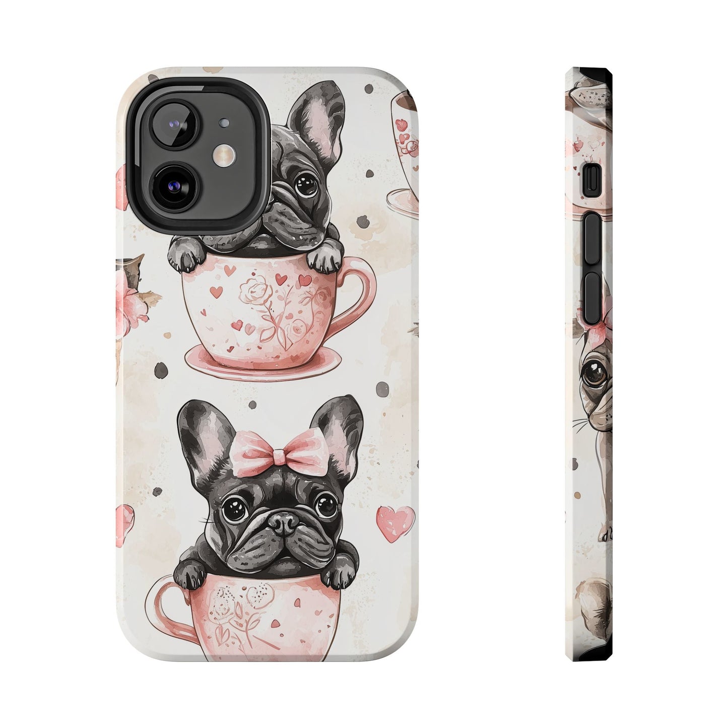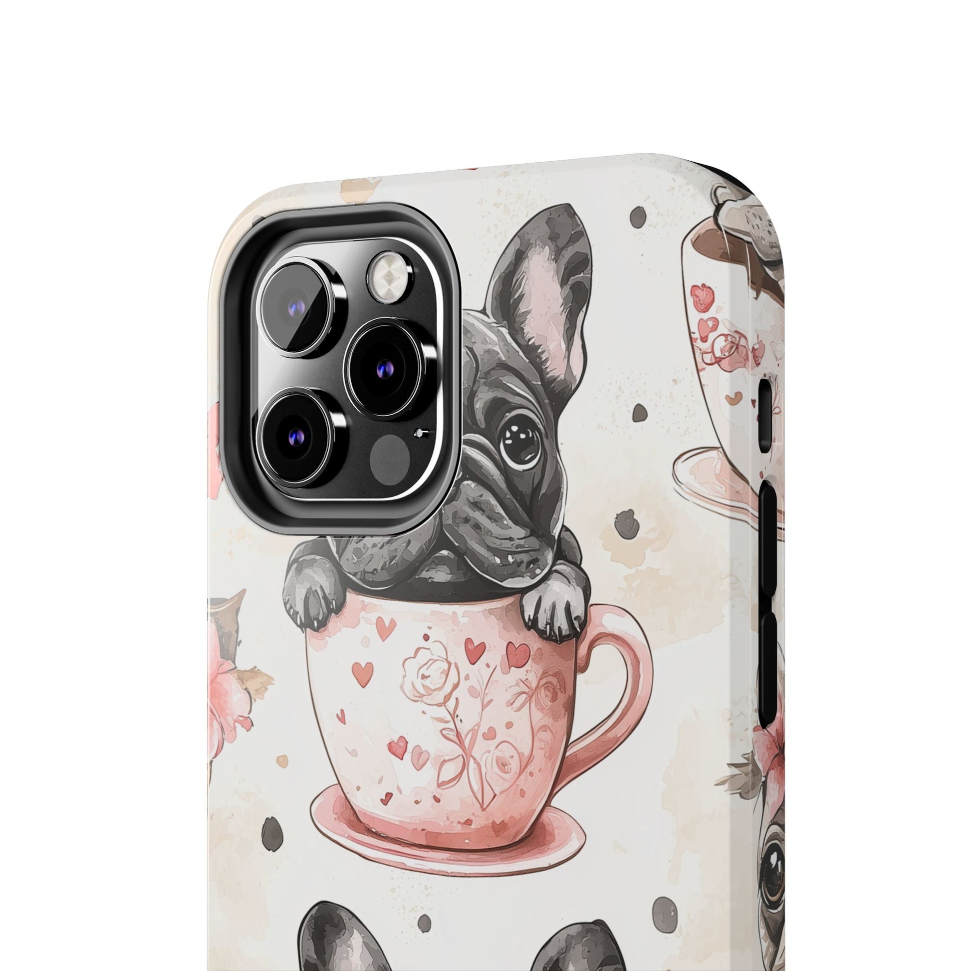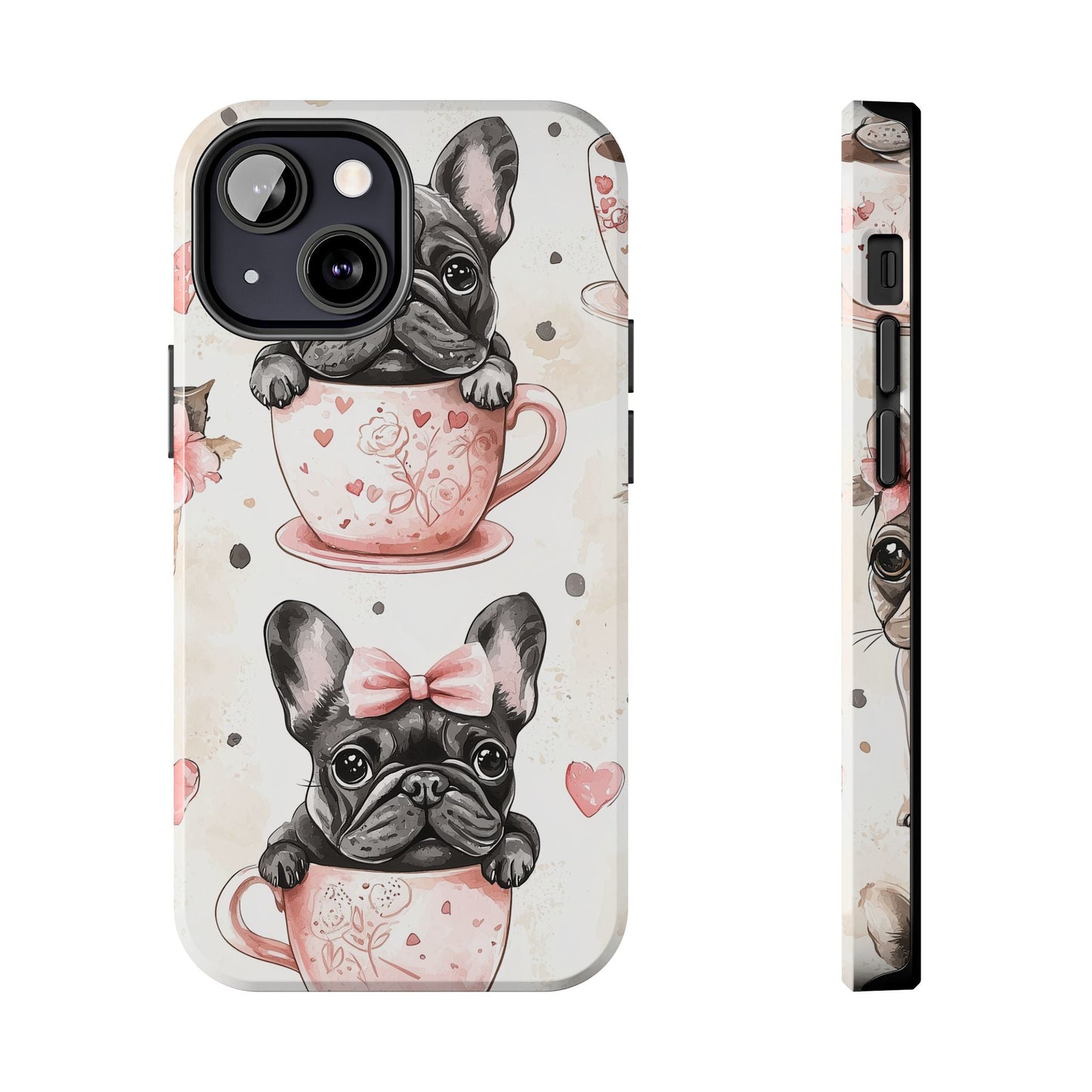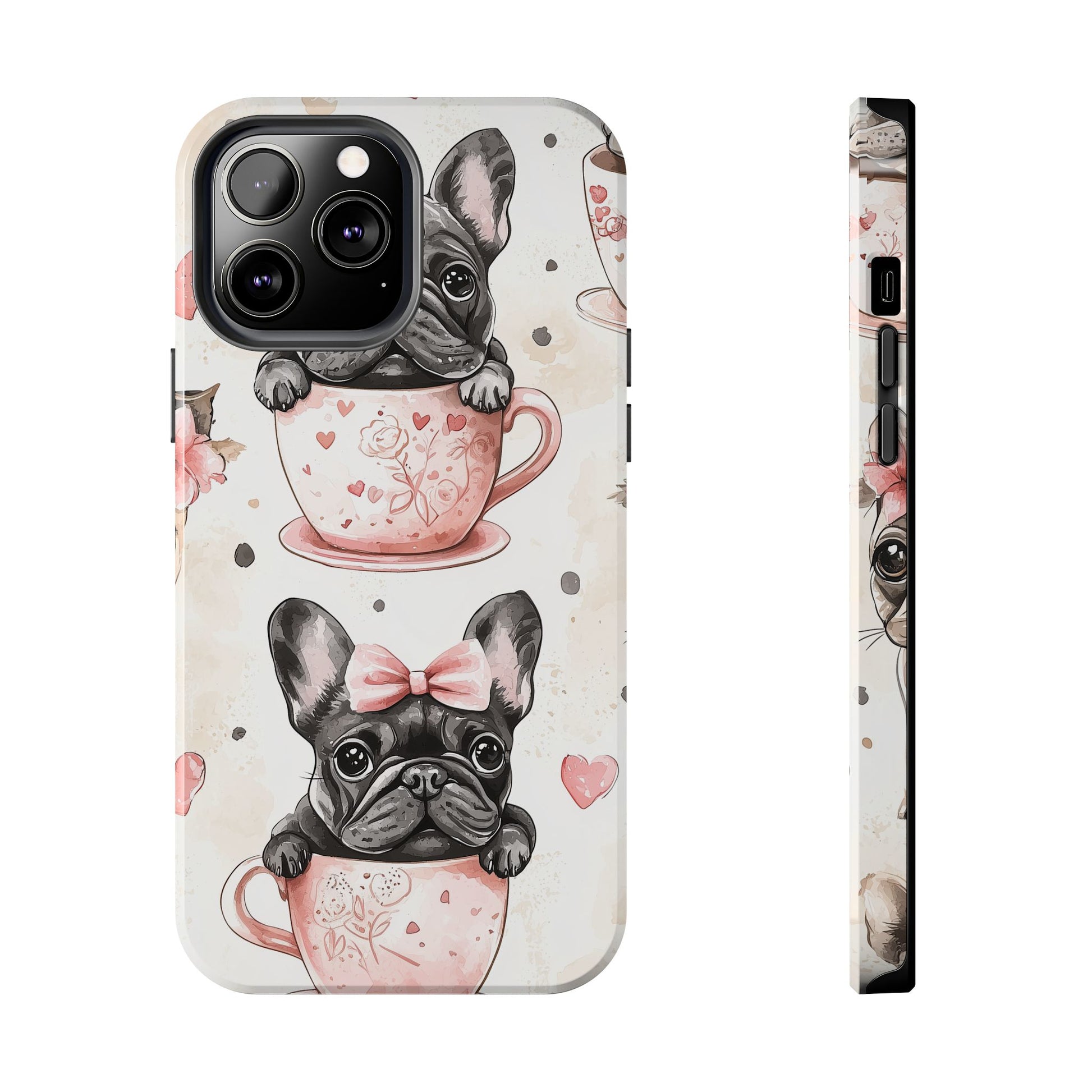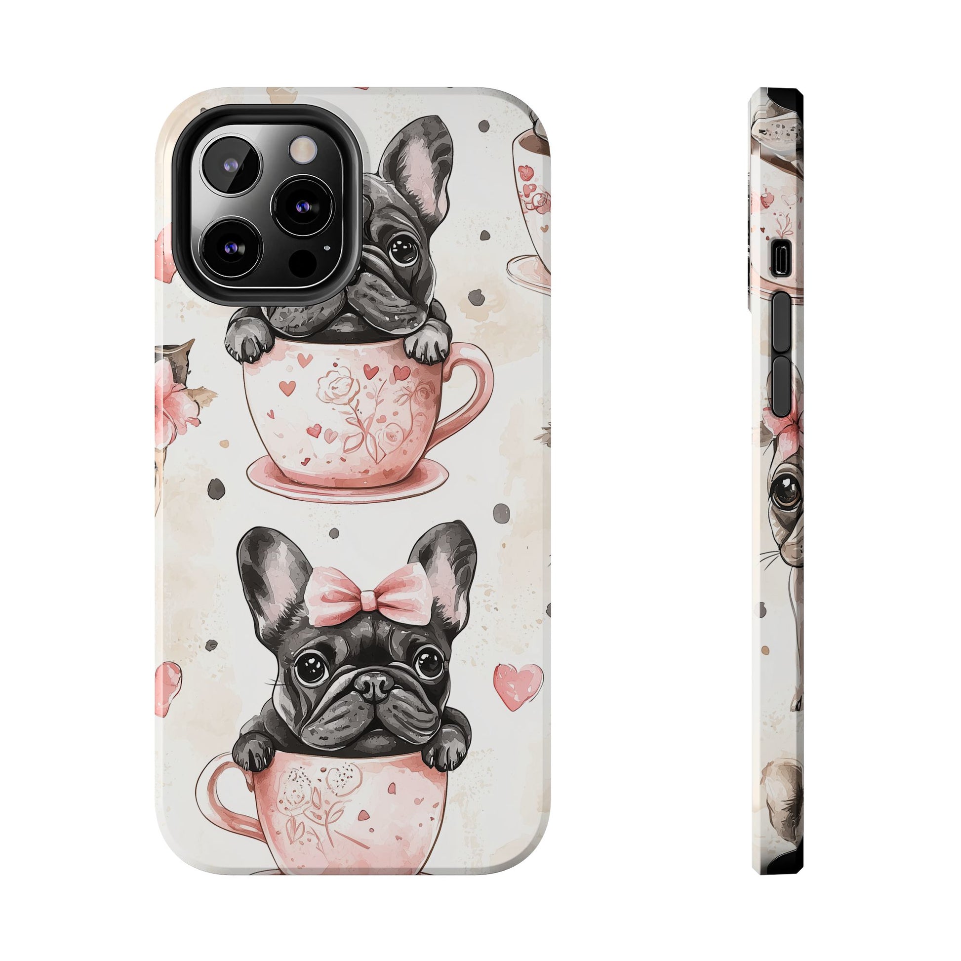 French Bulldogs in Teacups iPhone Case – Cute Dog Design with Hearts & Bows, Shockproof & Slim