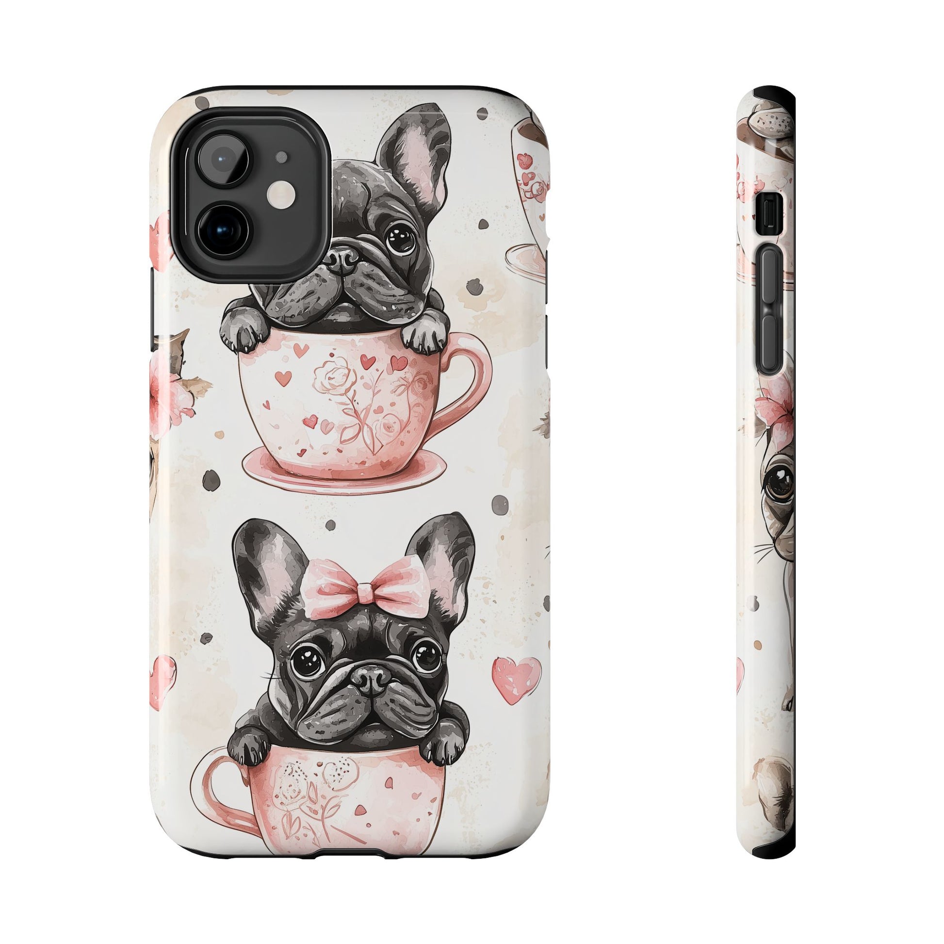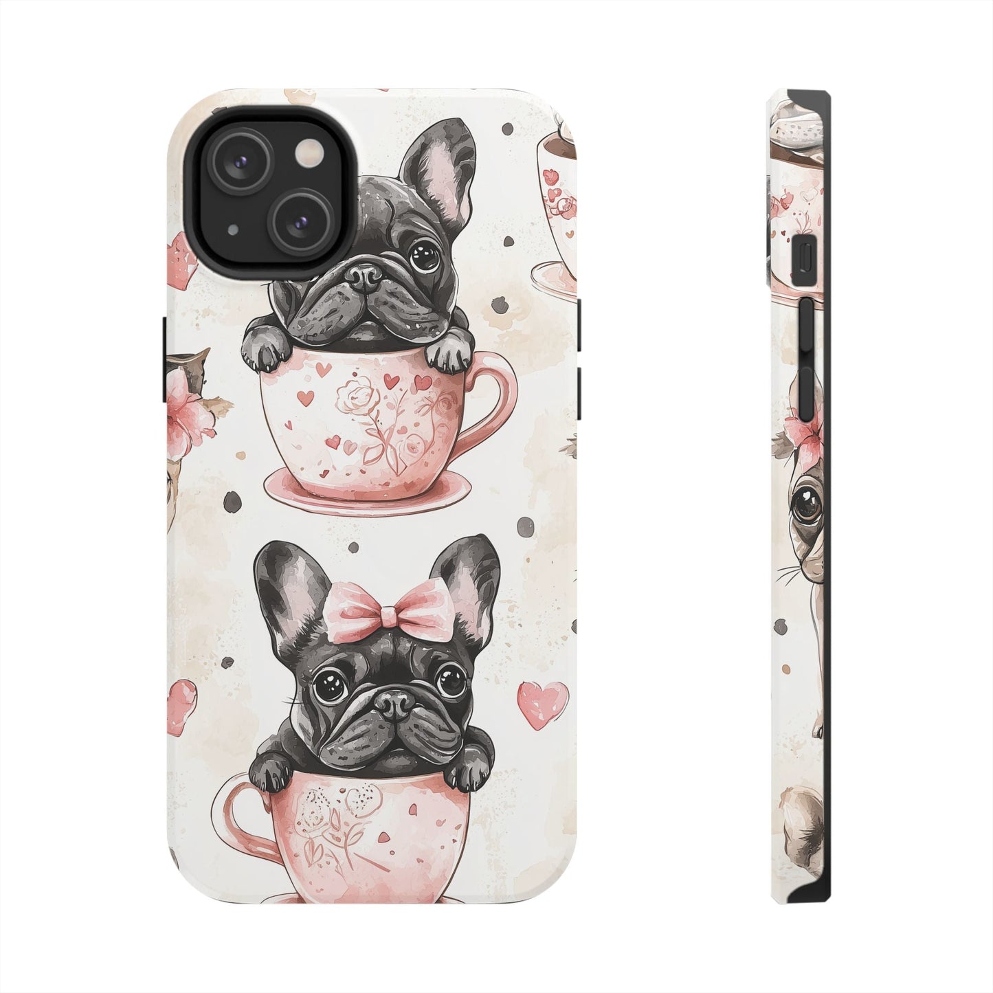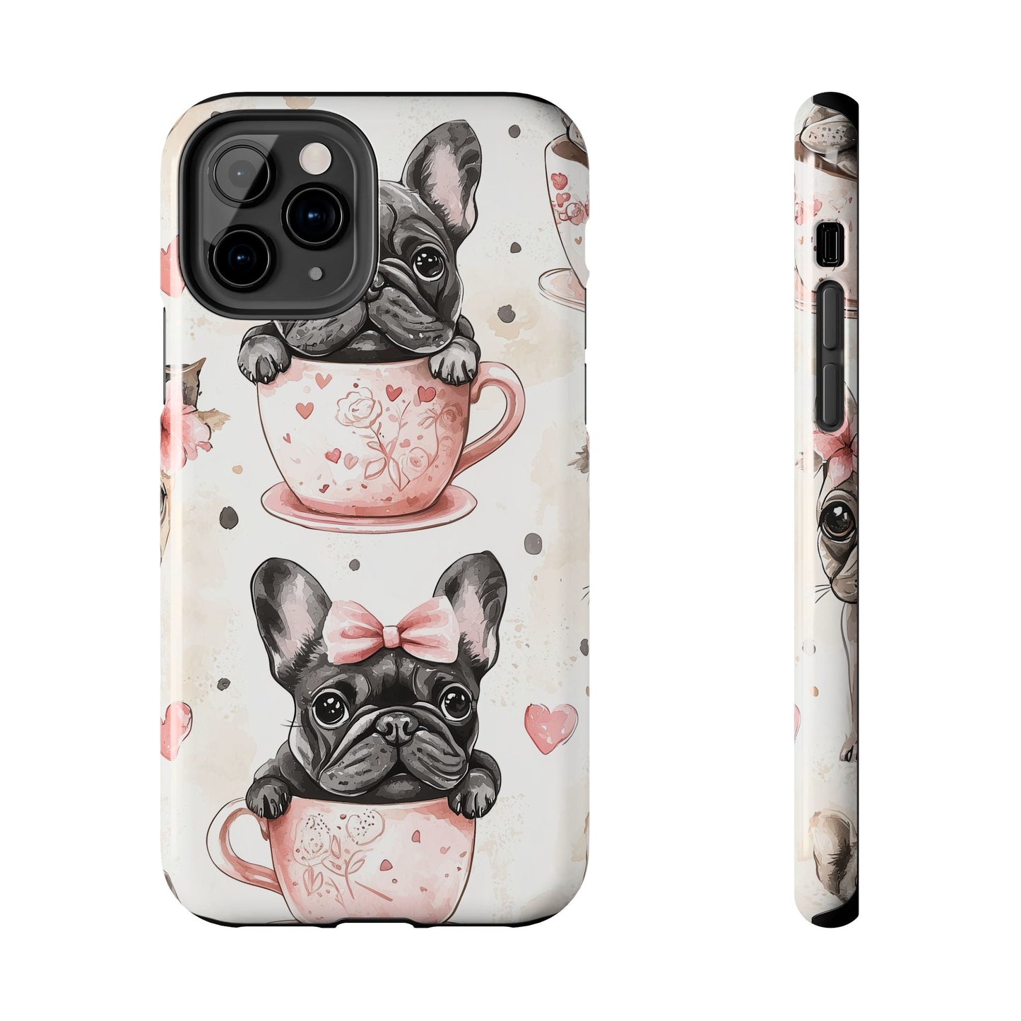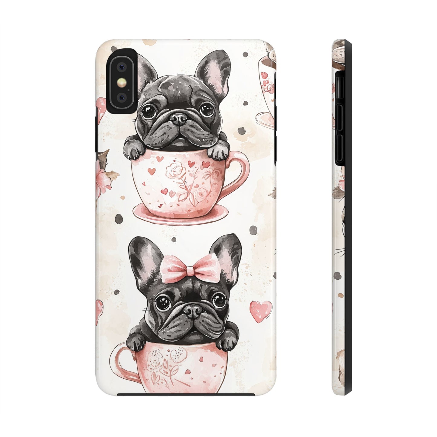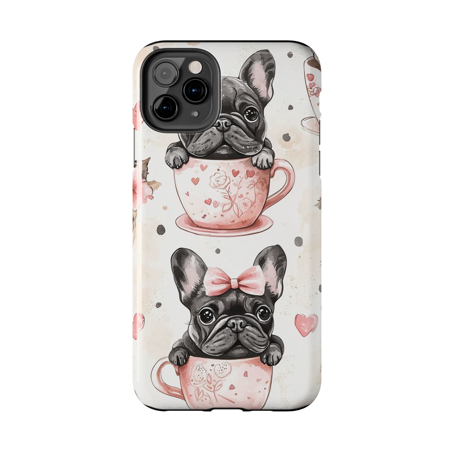 French Bulldogs in Teacups iPhone Case – Cute Dog Design with Hearts & Bows, Shockproof & Slim
