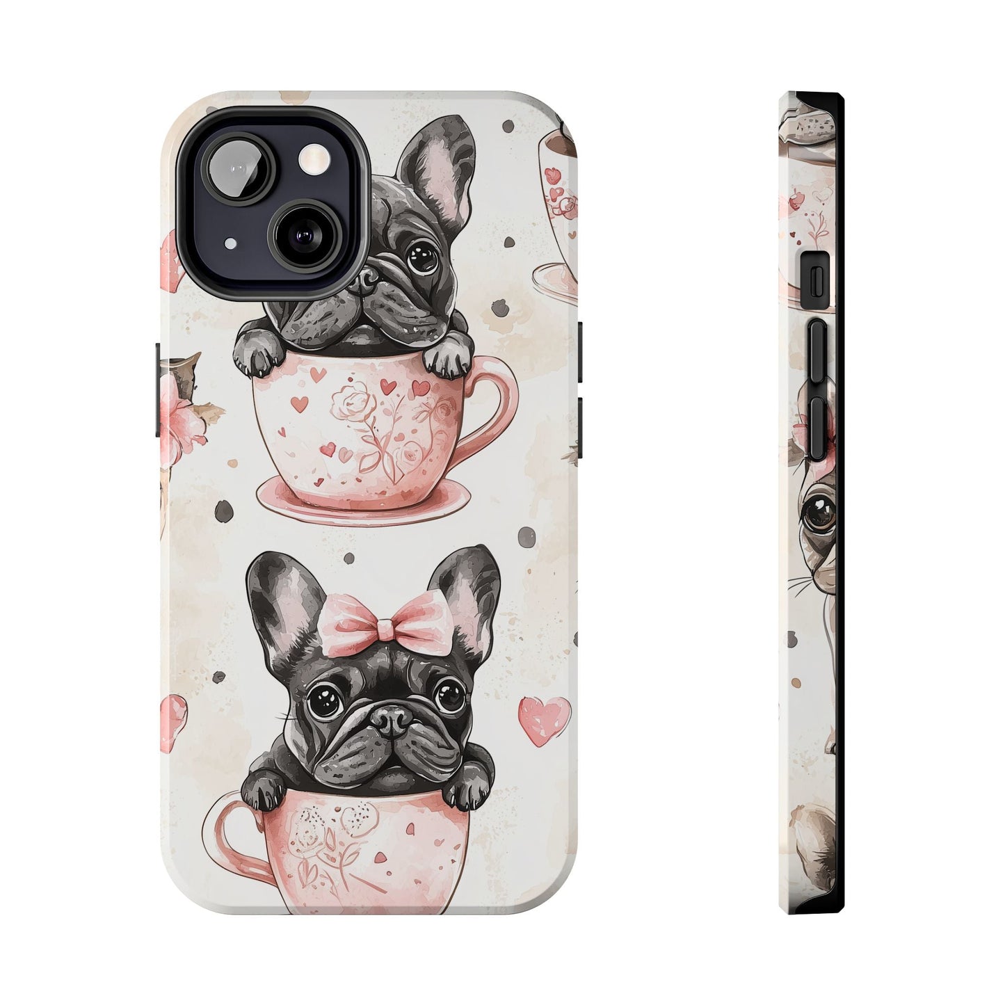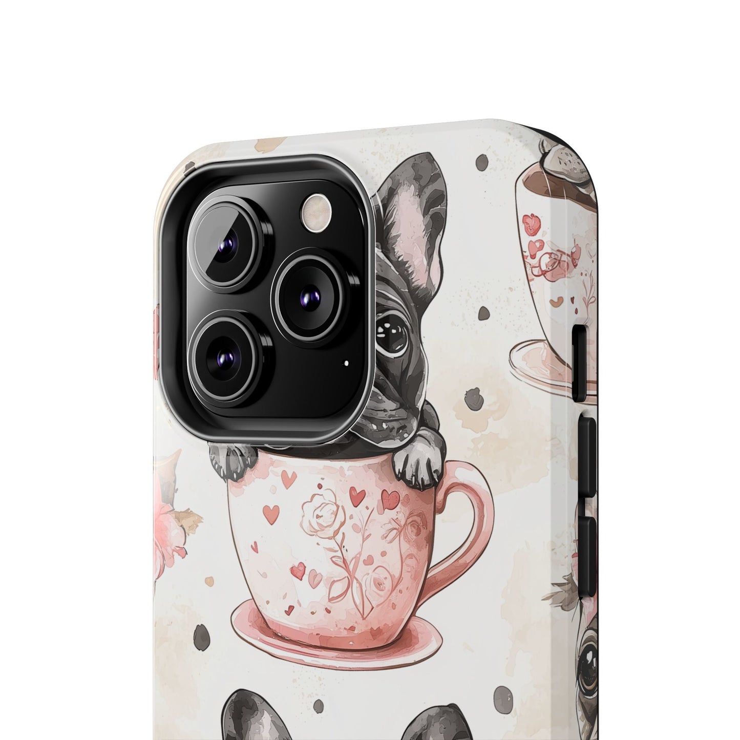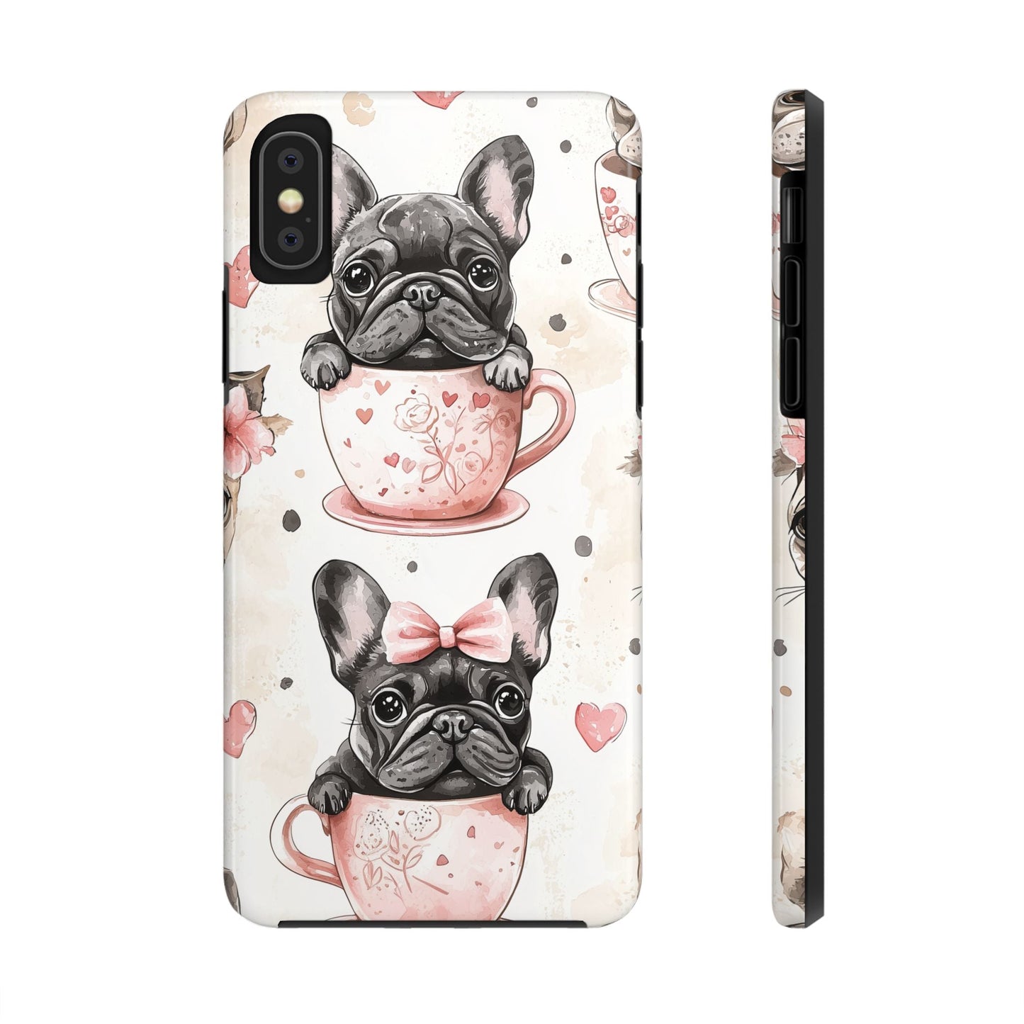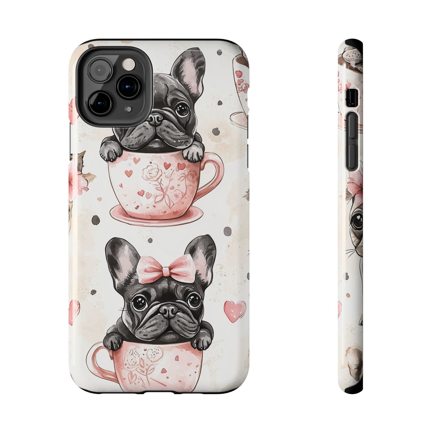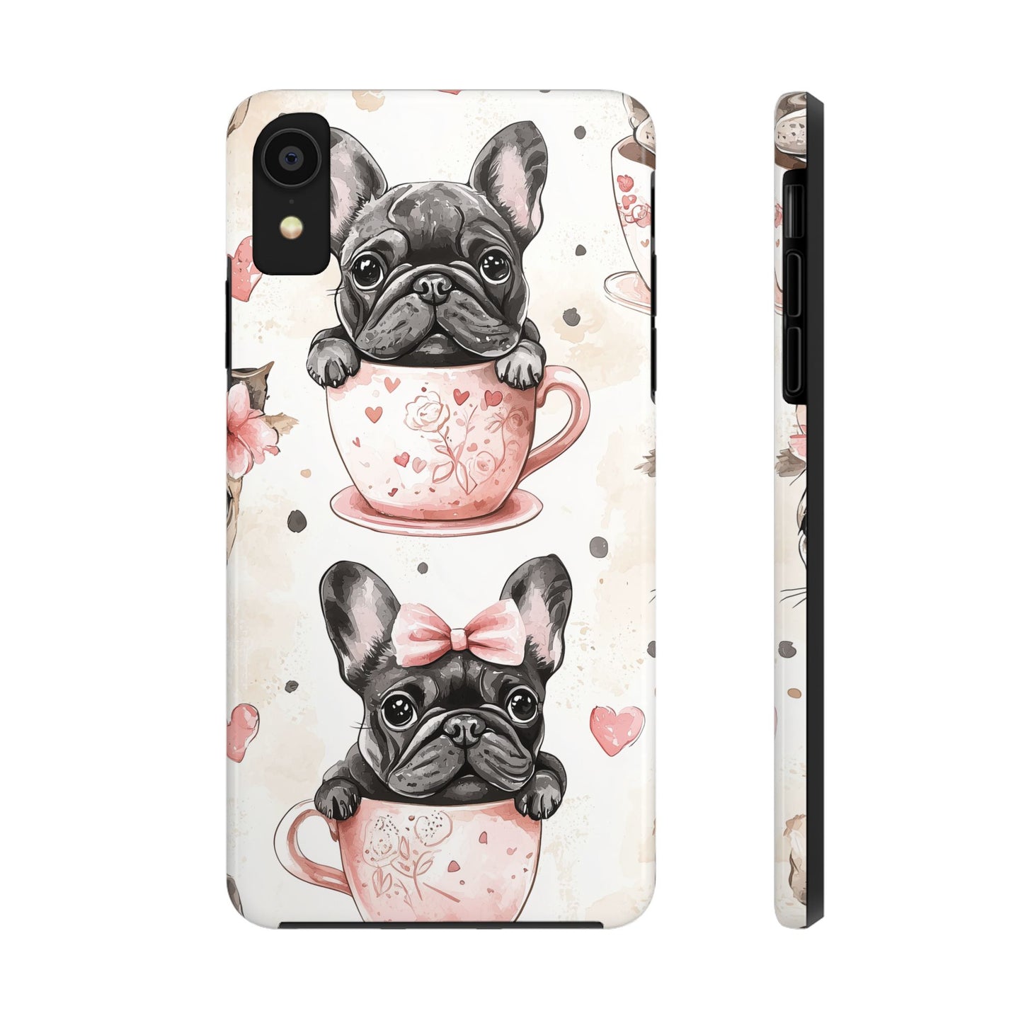 French Bulldogs in Teacups iPhone Case – Cute Dog Design with Hearts & Bows, Shockproof & Slim