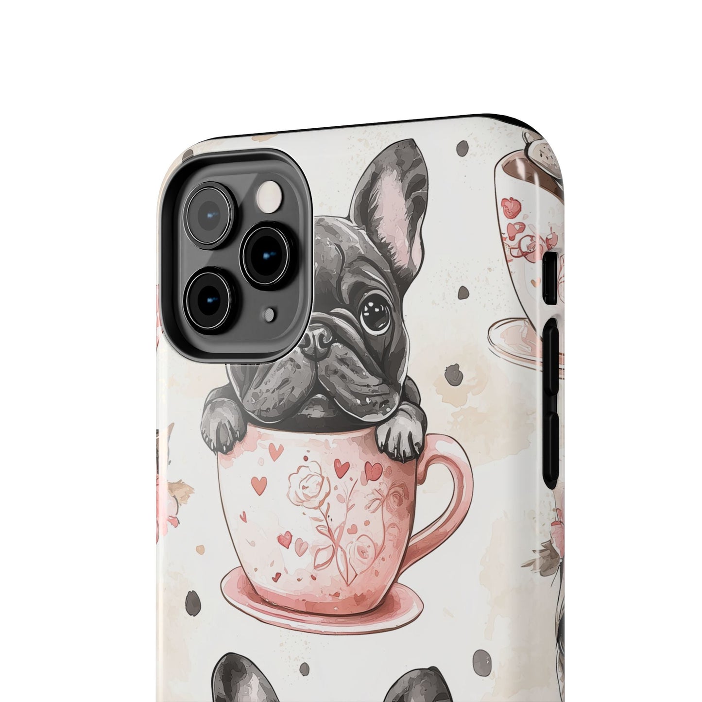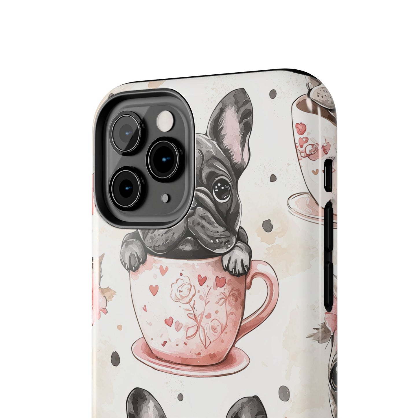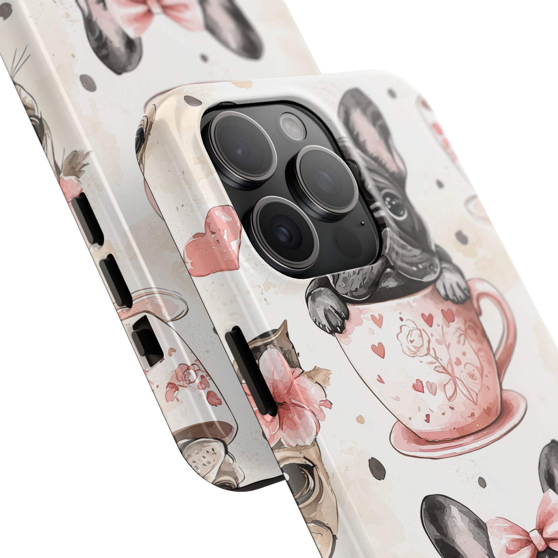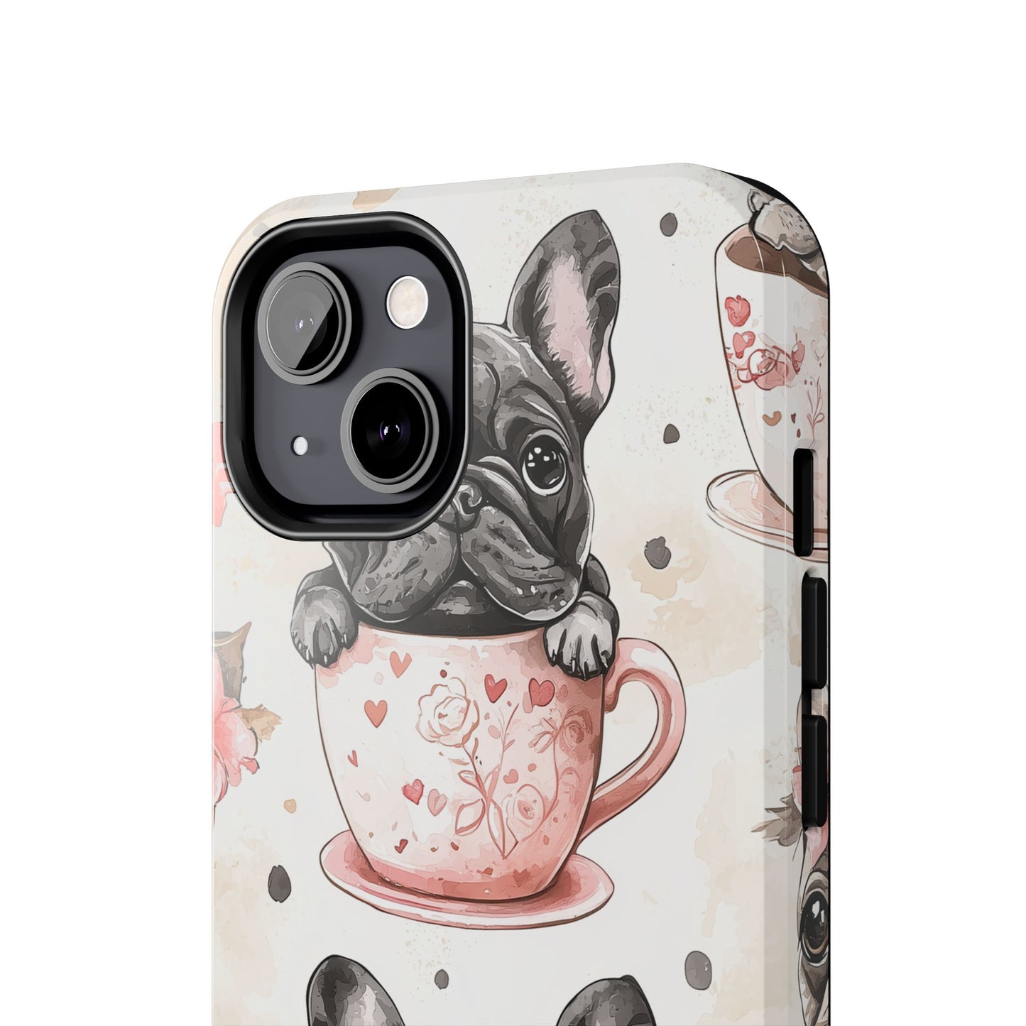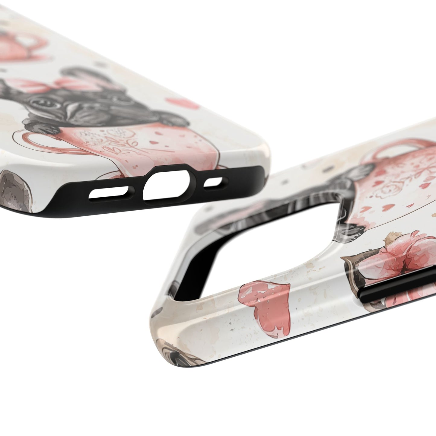 French Bulldogs in Teacups iPhone Case – Cute Dog Design with Hearts & Bows, Shockproof & Slim