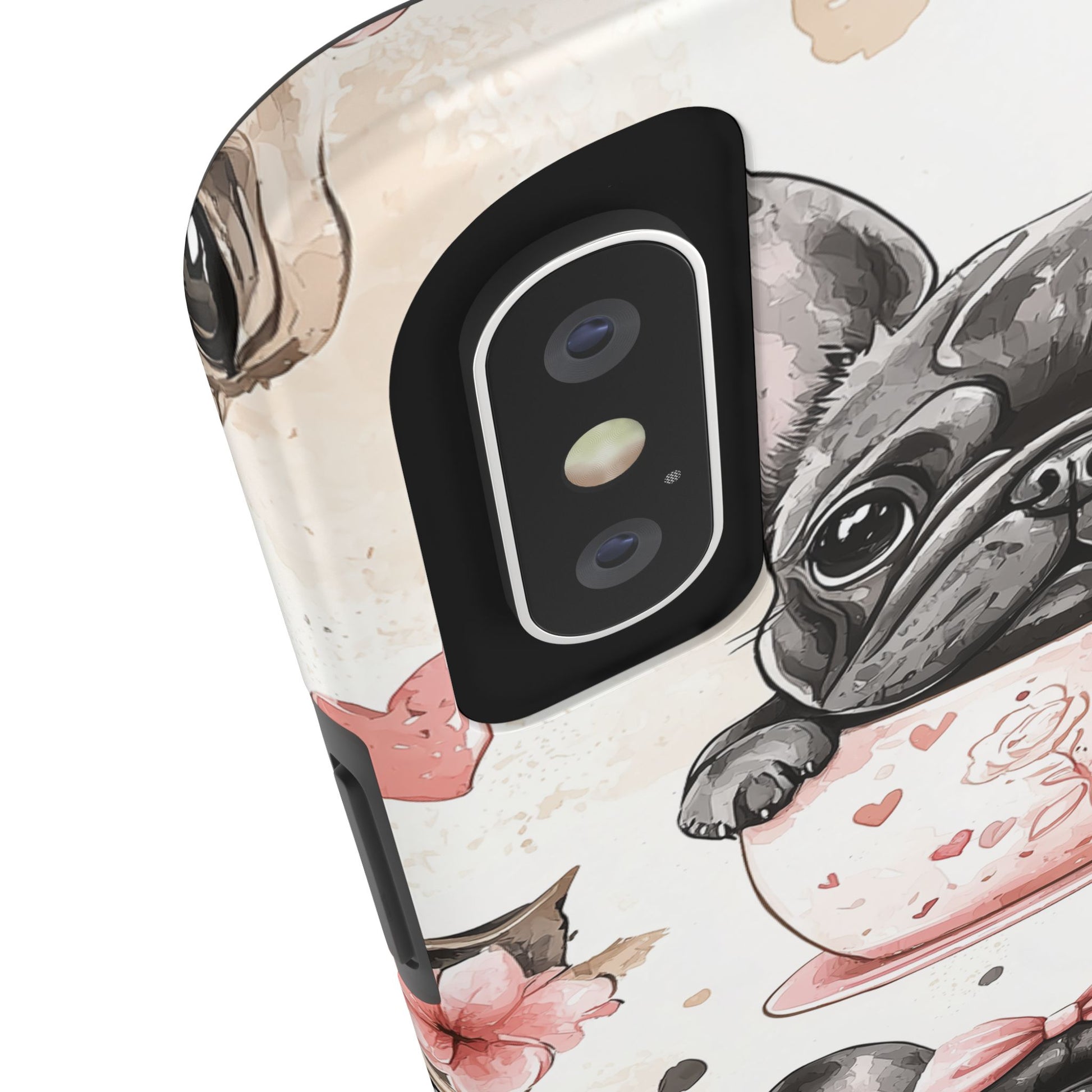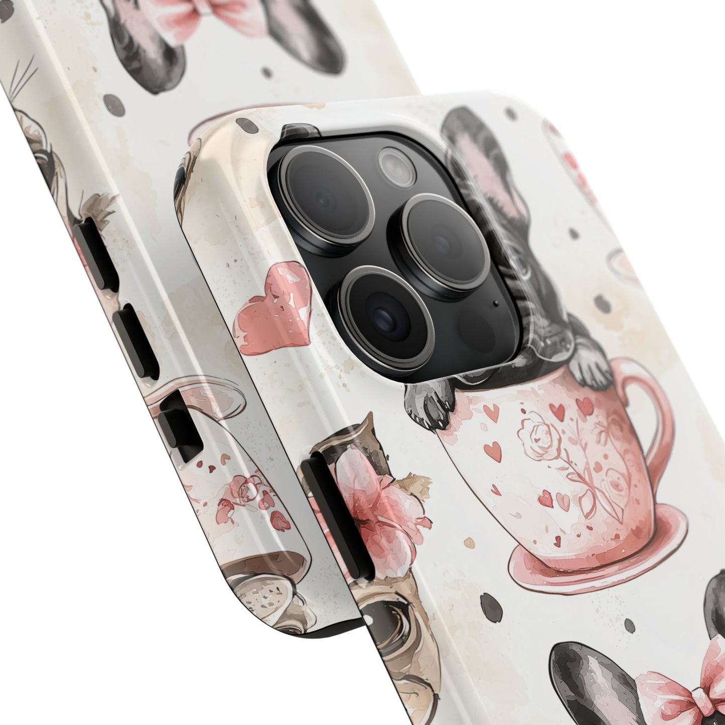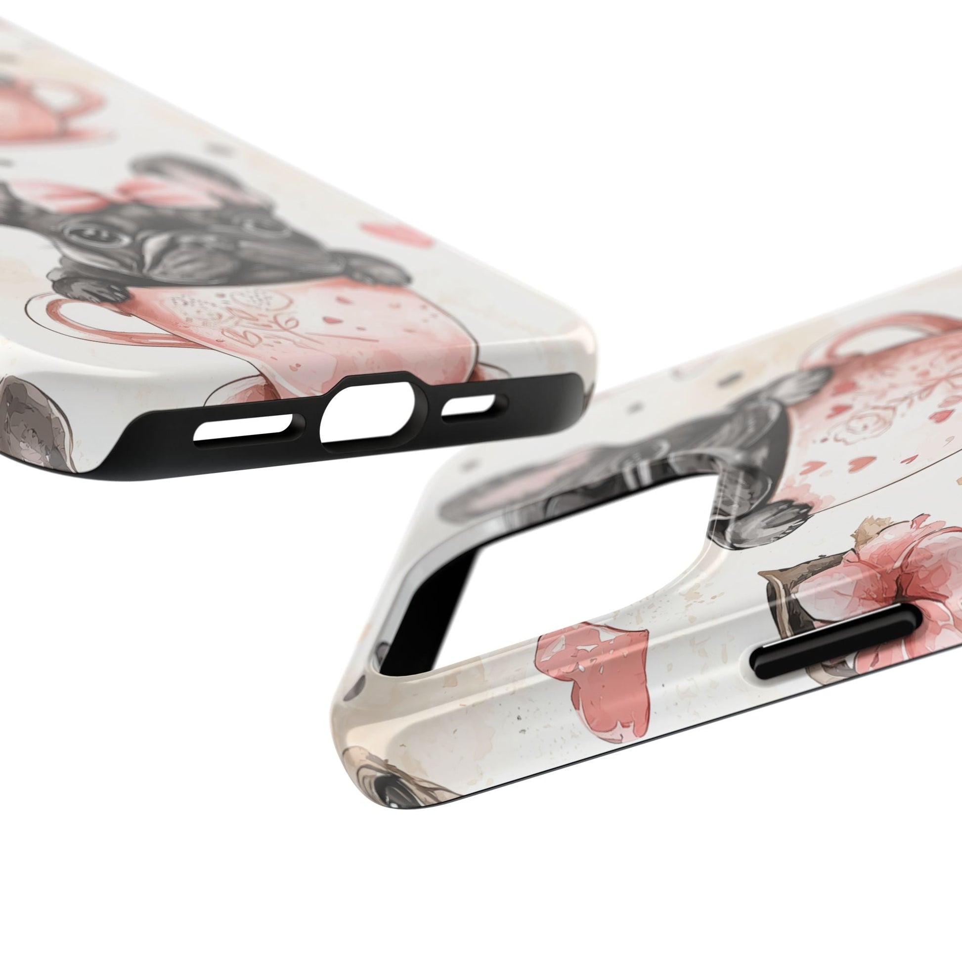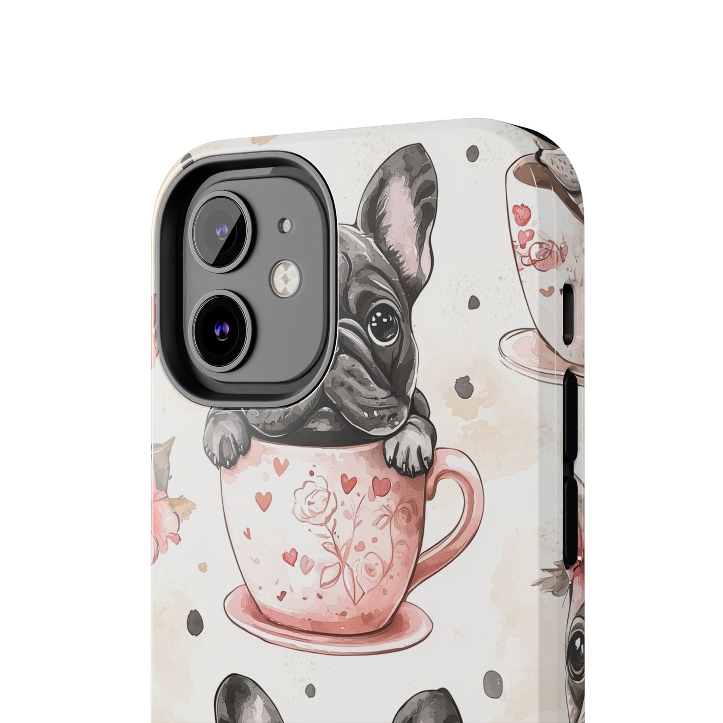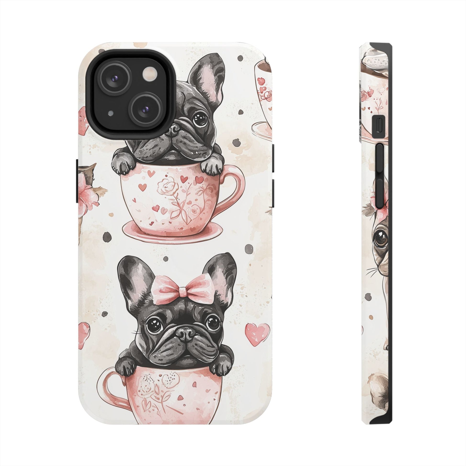 French Bulldogs in Teacups iPhone Case – Cute Dog Design with Hearts & Bows, Shockproof & Slim