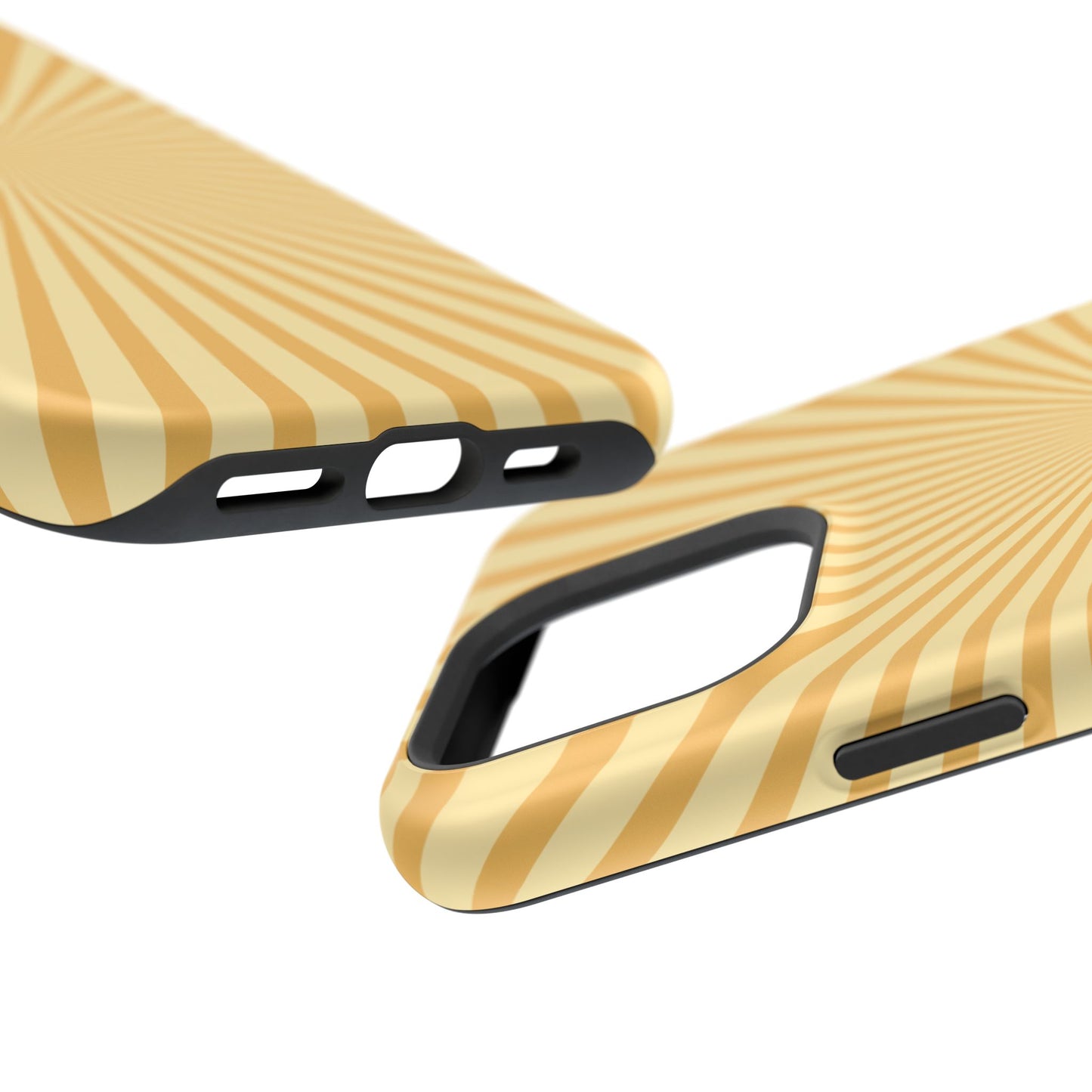 Brighten up your phone with our Golden Sunburst MagSafe iPhone Case, featuring a radiant sunburst pattern in warm golden and soft beige hues. This retro-inspired design captures the timeless energy of 70s aesthetics, adding a cheerful and vintage touch to your style. Built with dual-layer protection, this case offers a reliable safeguard against drops and scratches while maintaining a slim profile that fits comfortably in your hand.