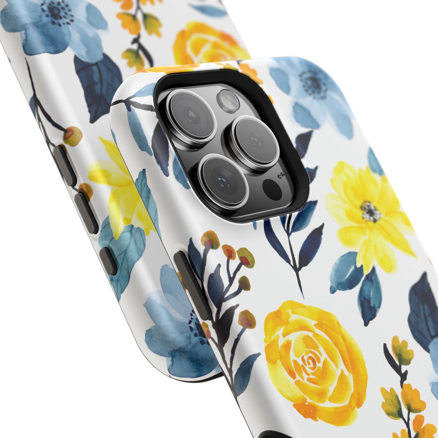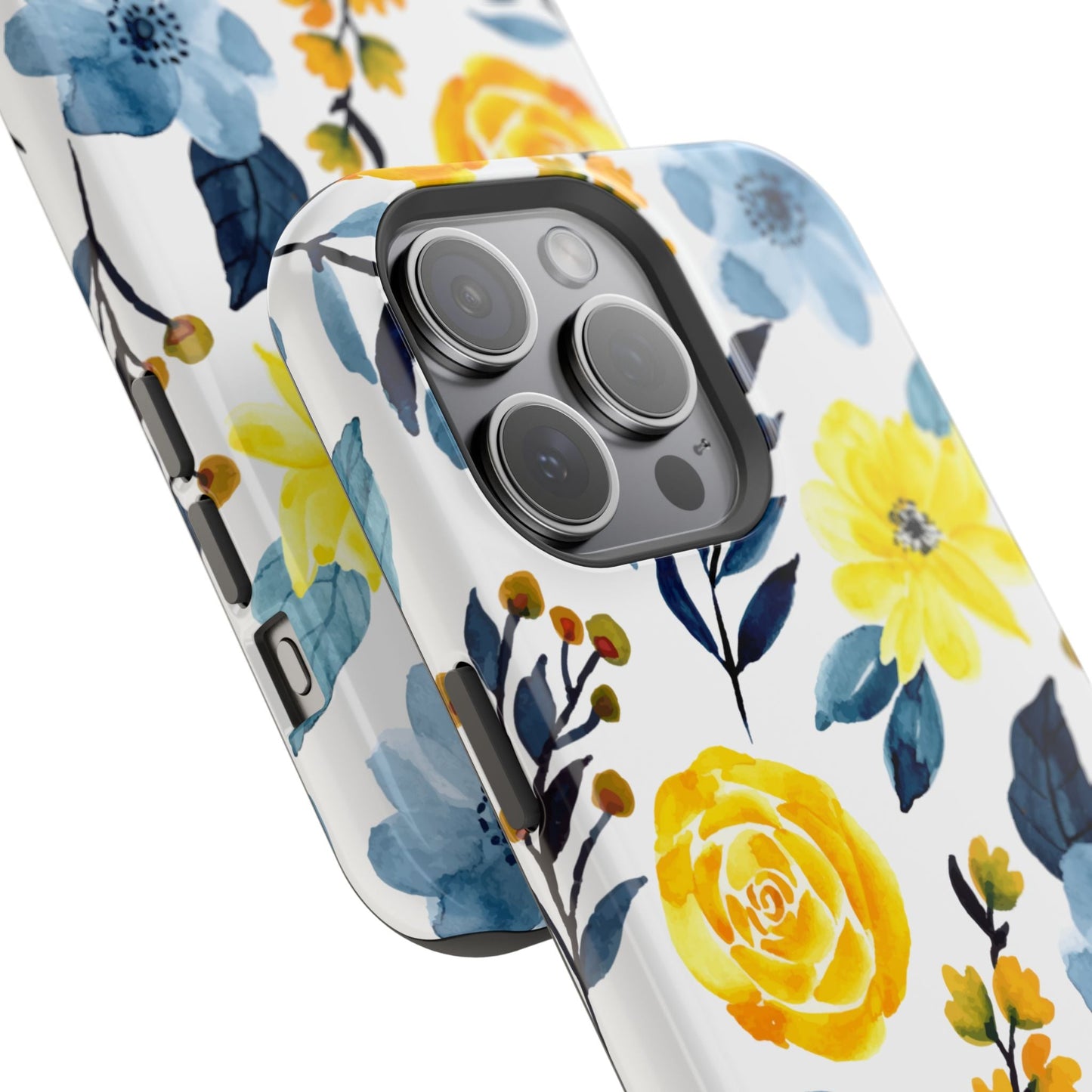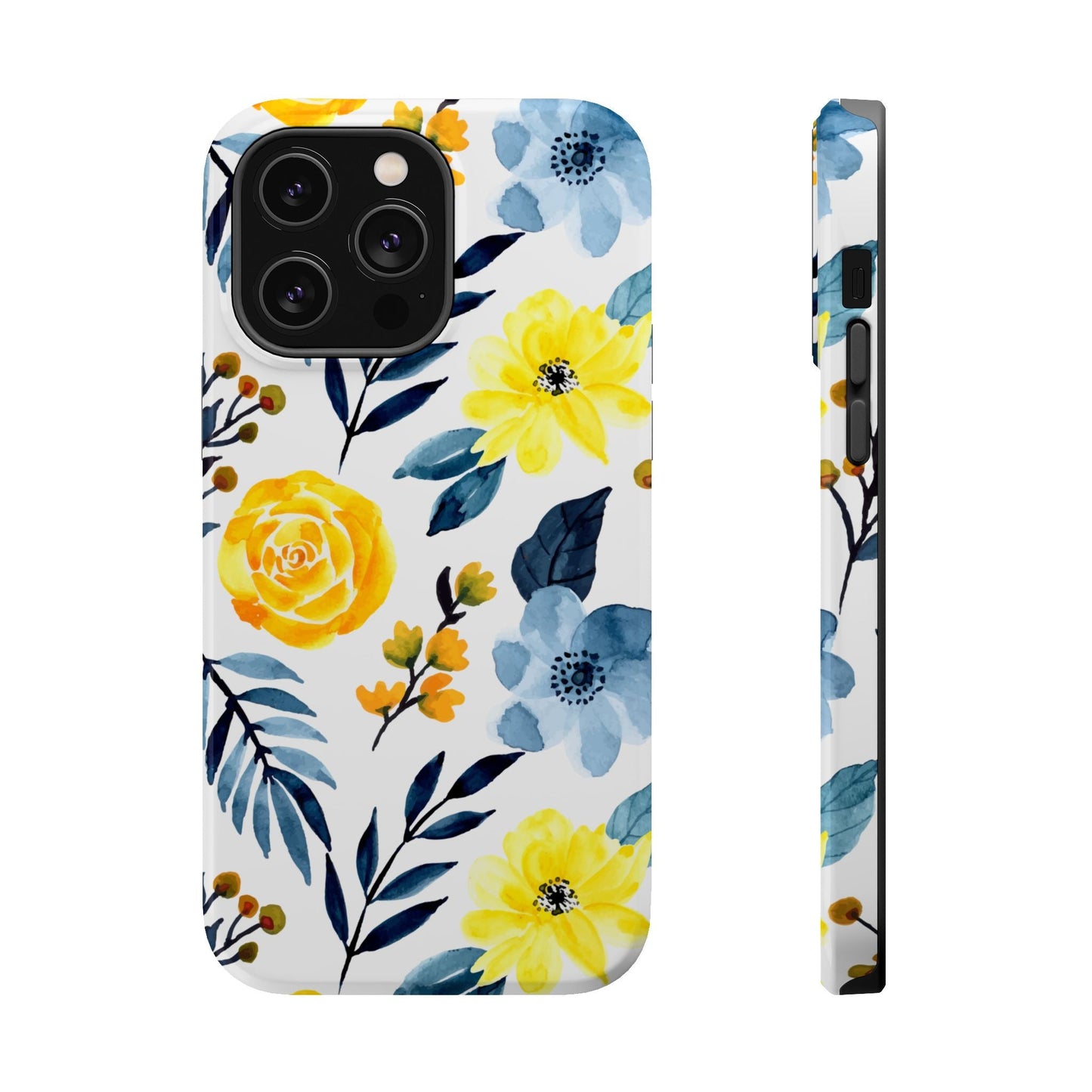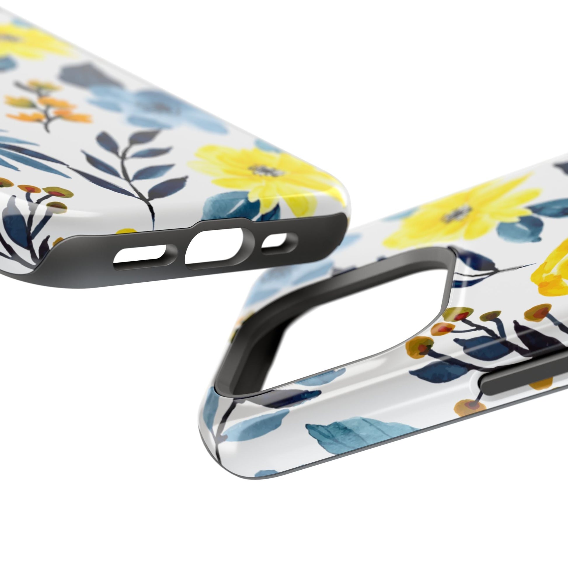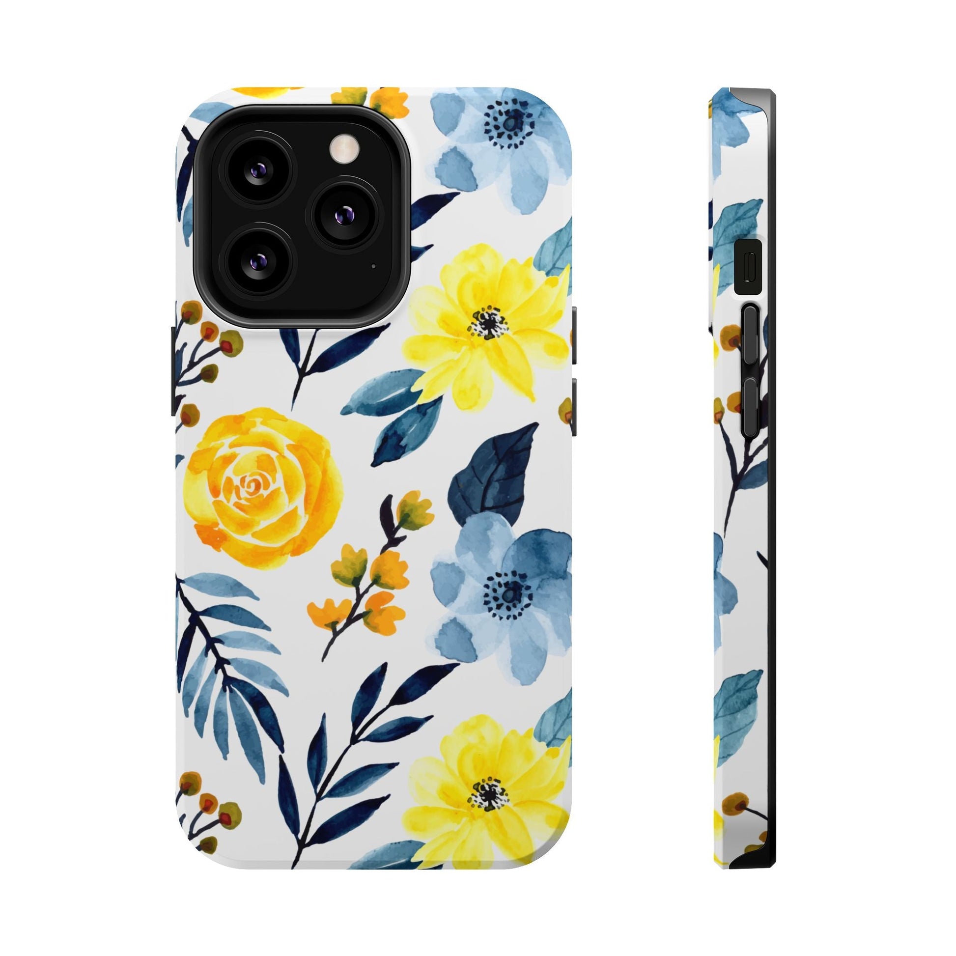 Golden Yellow & Sky Blue Floral – Watercolor Botanical MagSafe iPhone Case