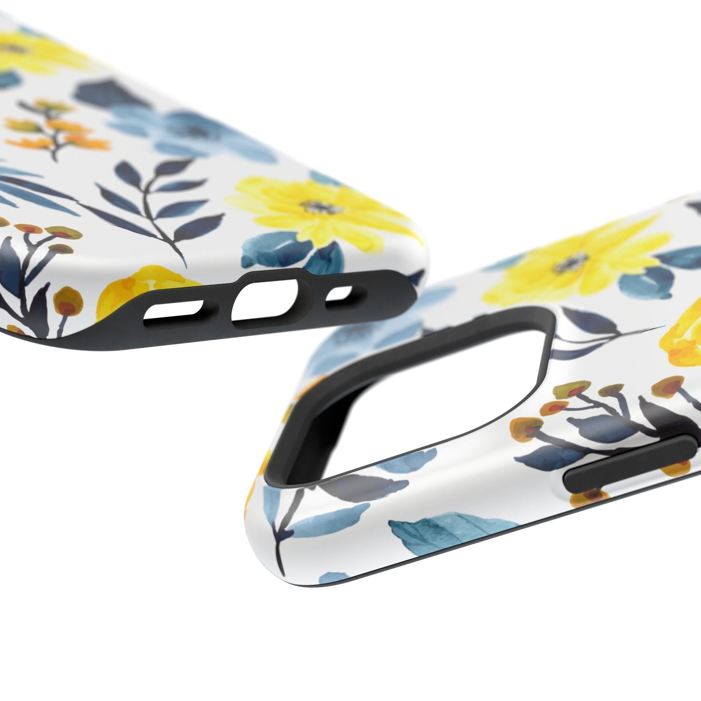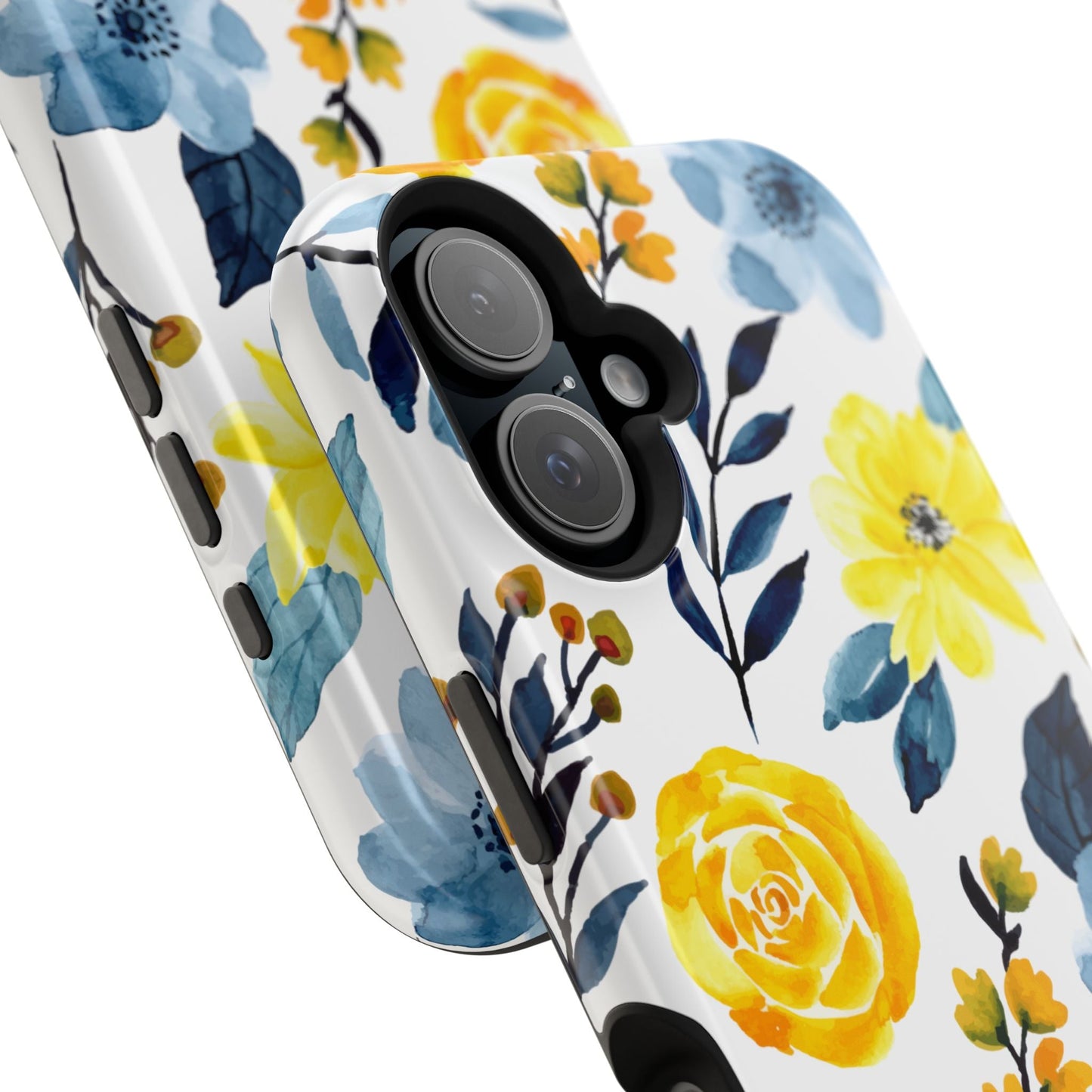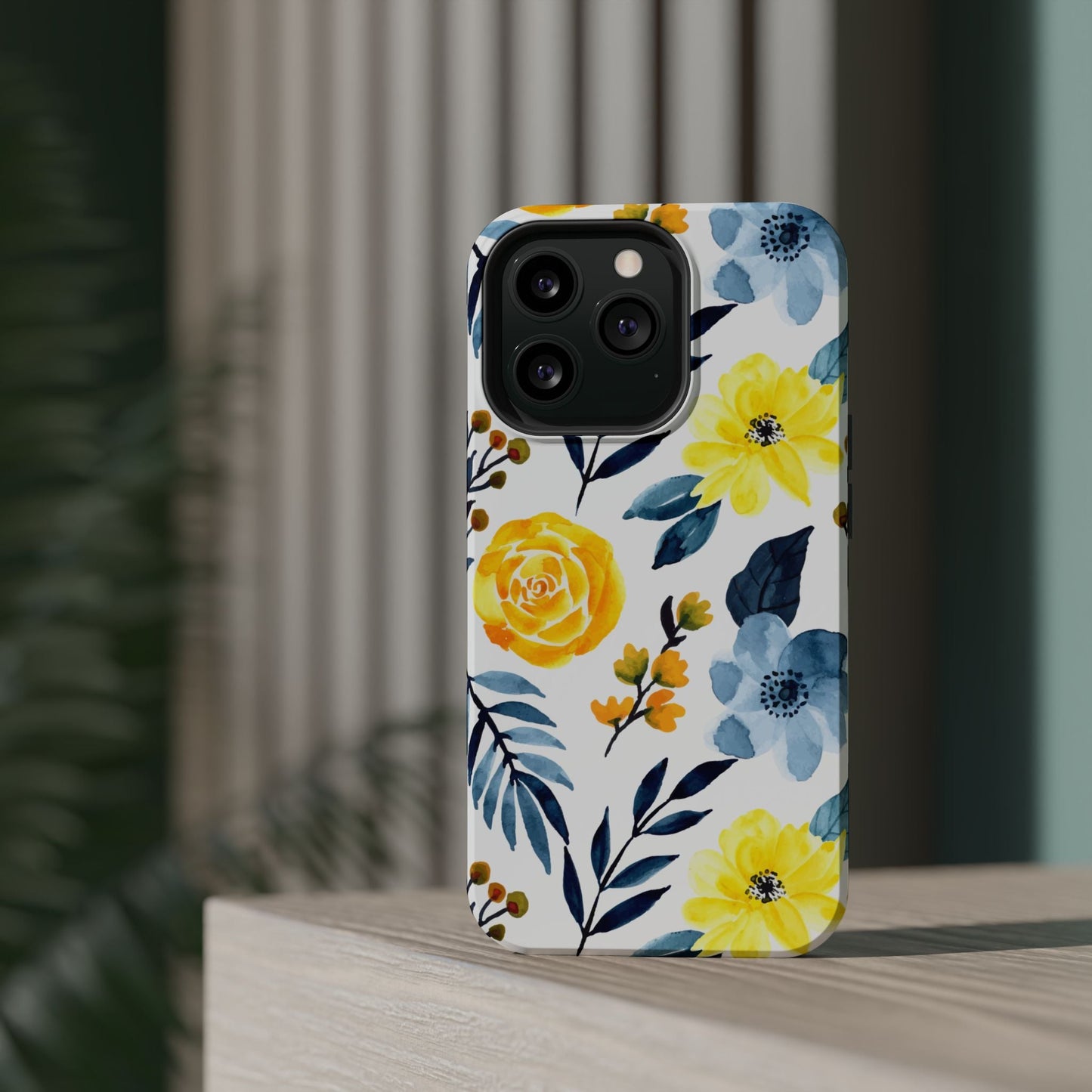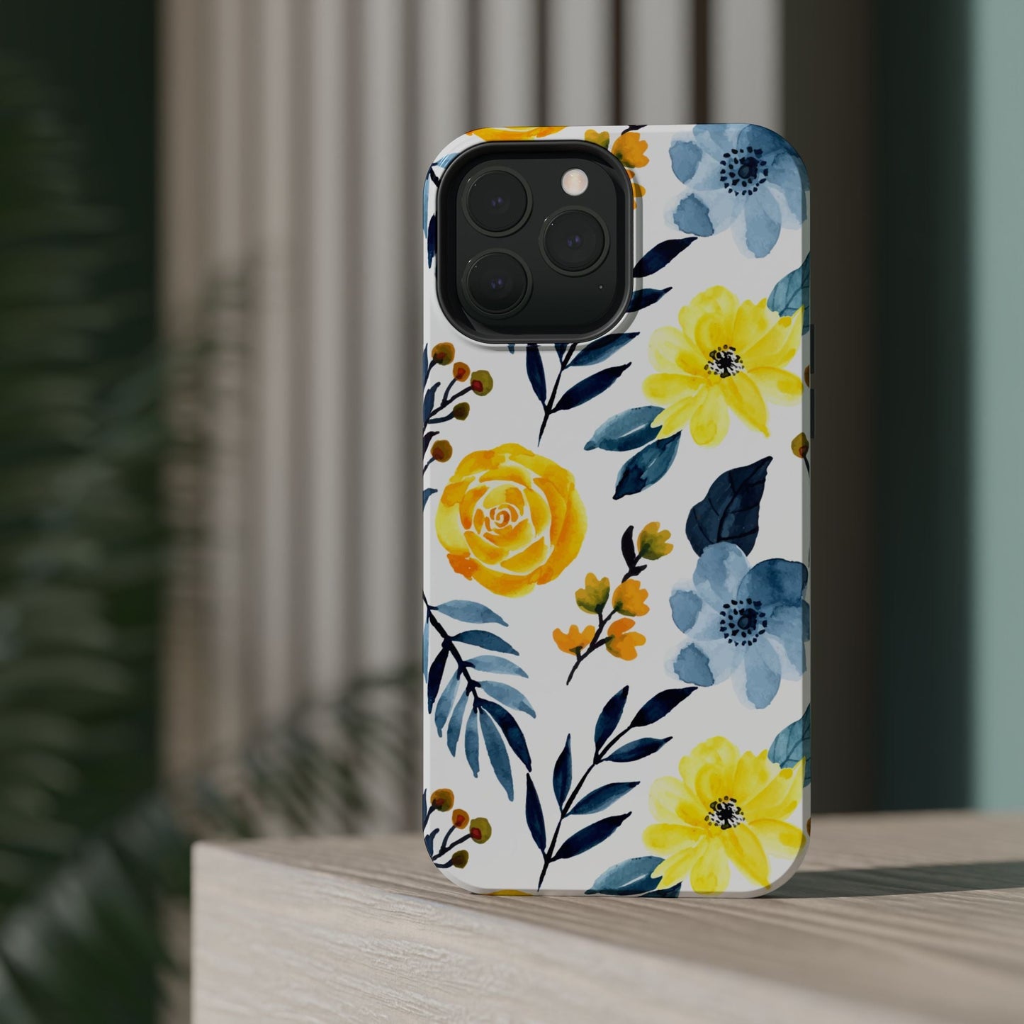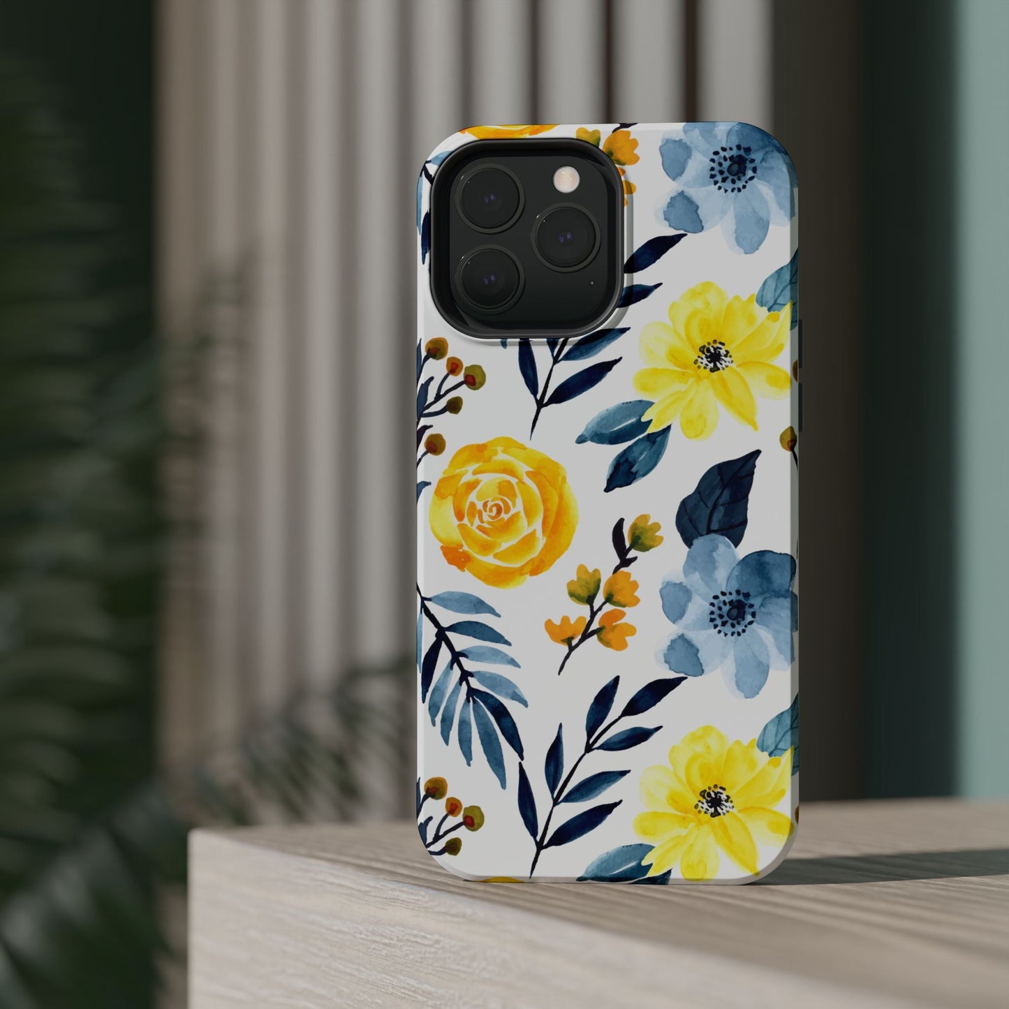 Golden Yellow & Sky Blue Floral – Watercolor Botanical MagSafe iPhone Case