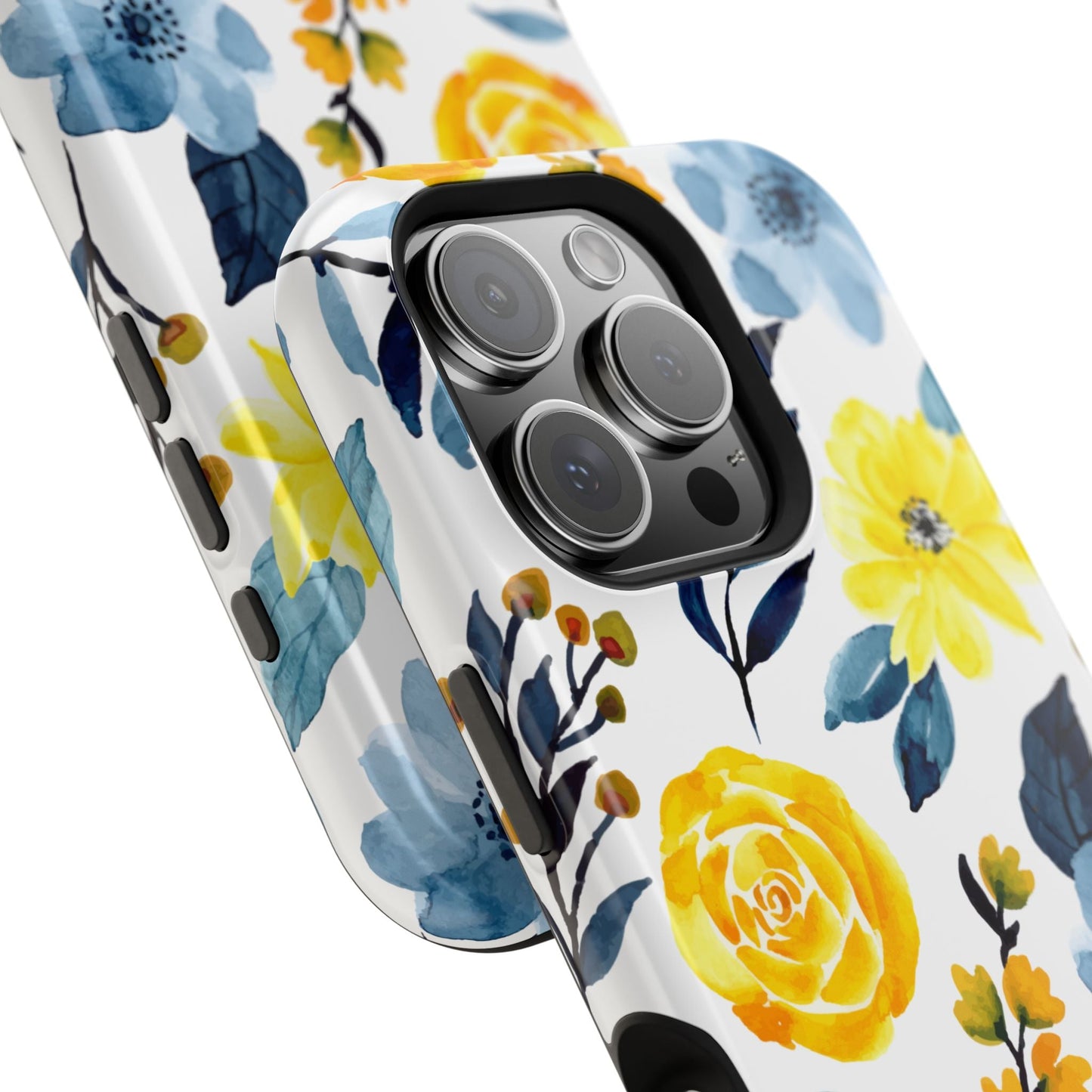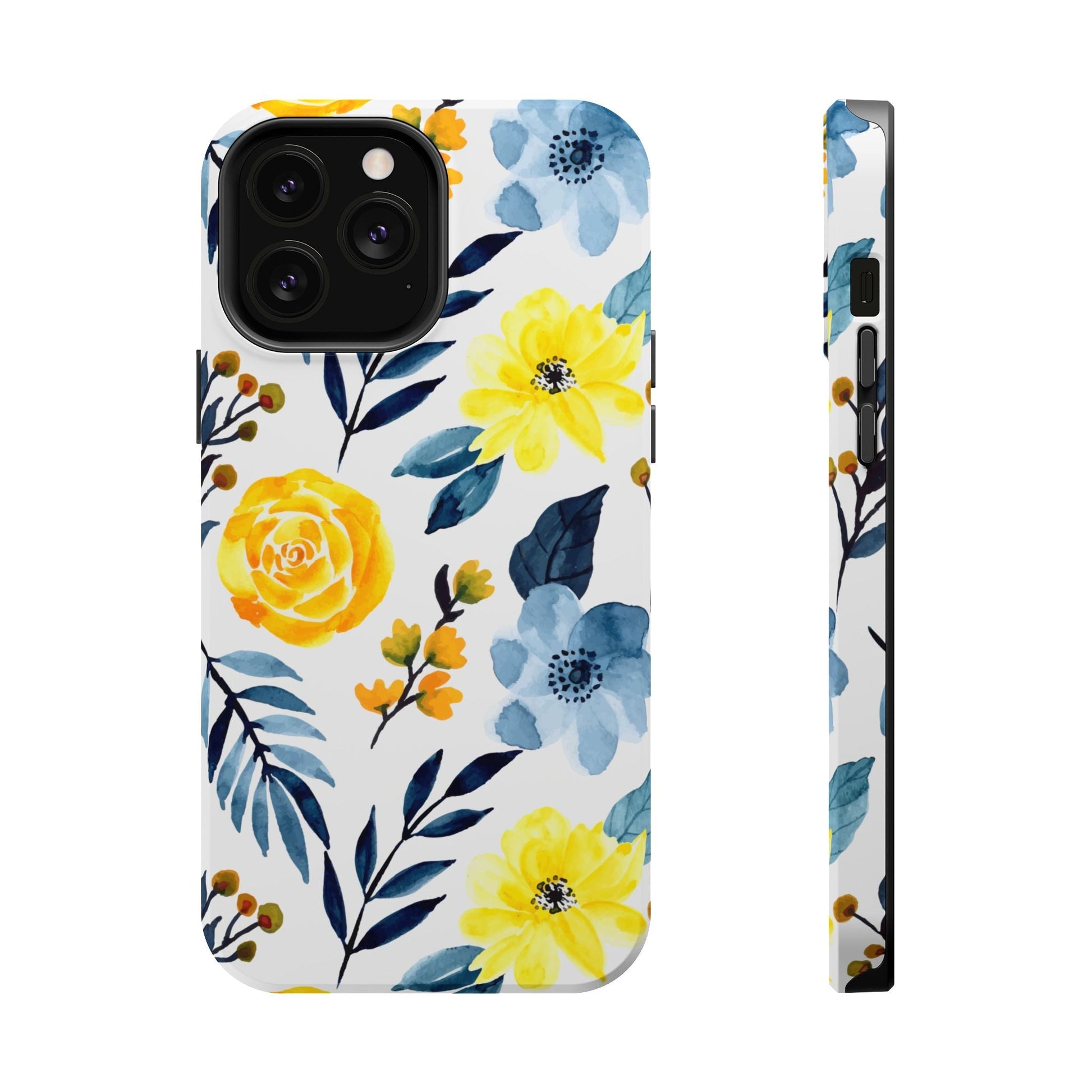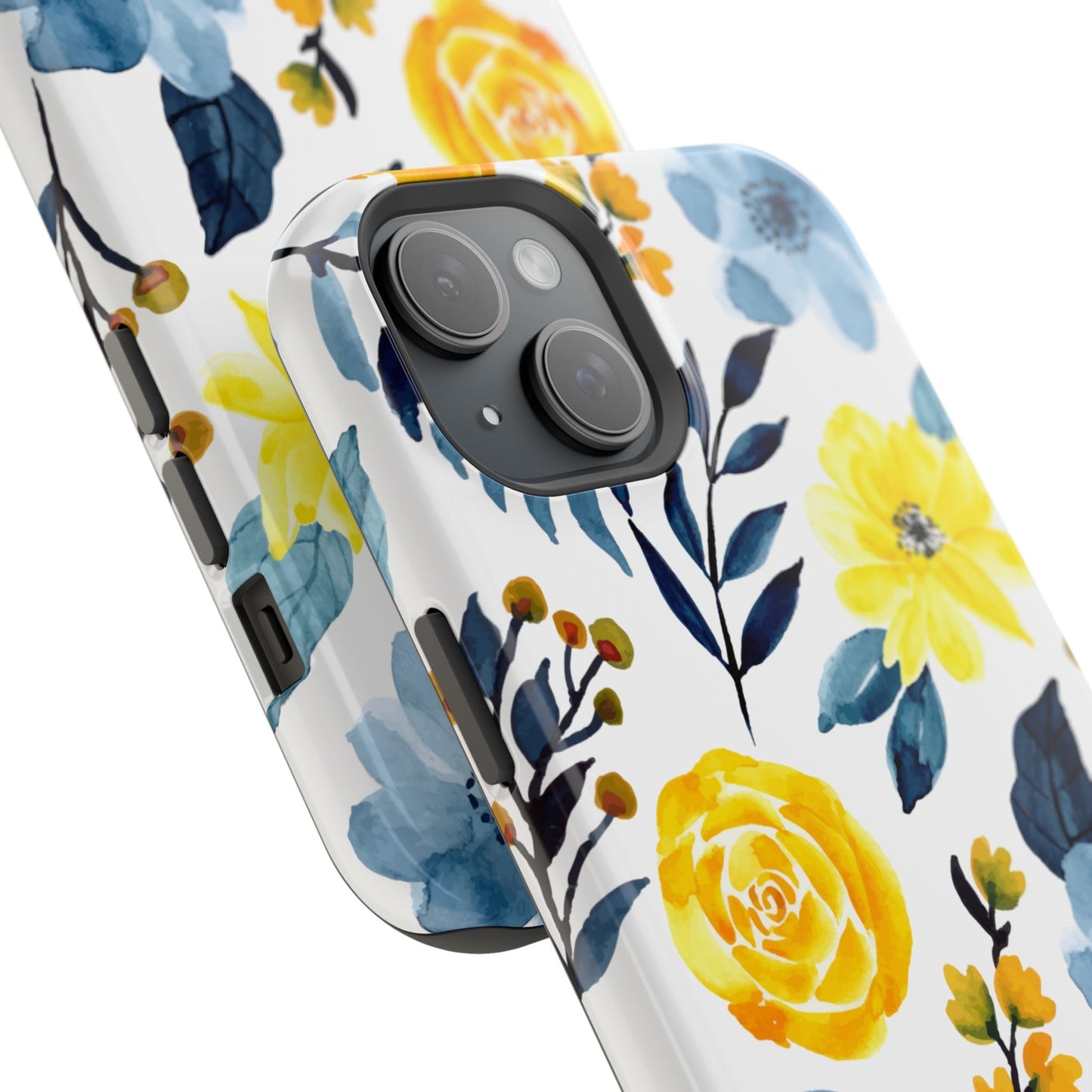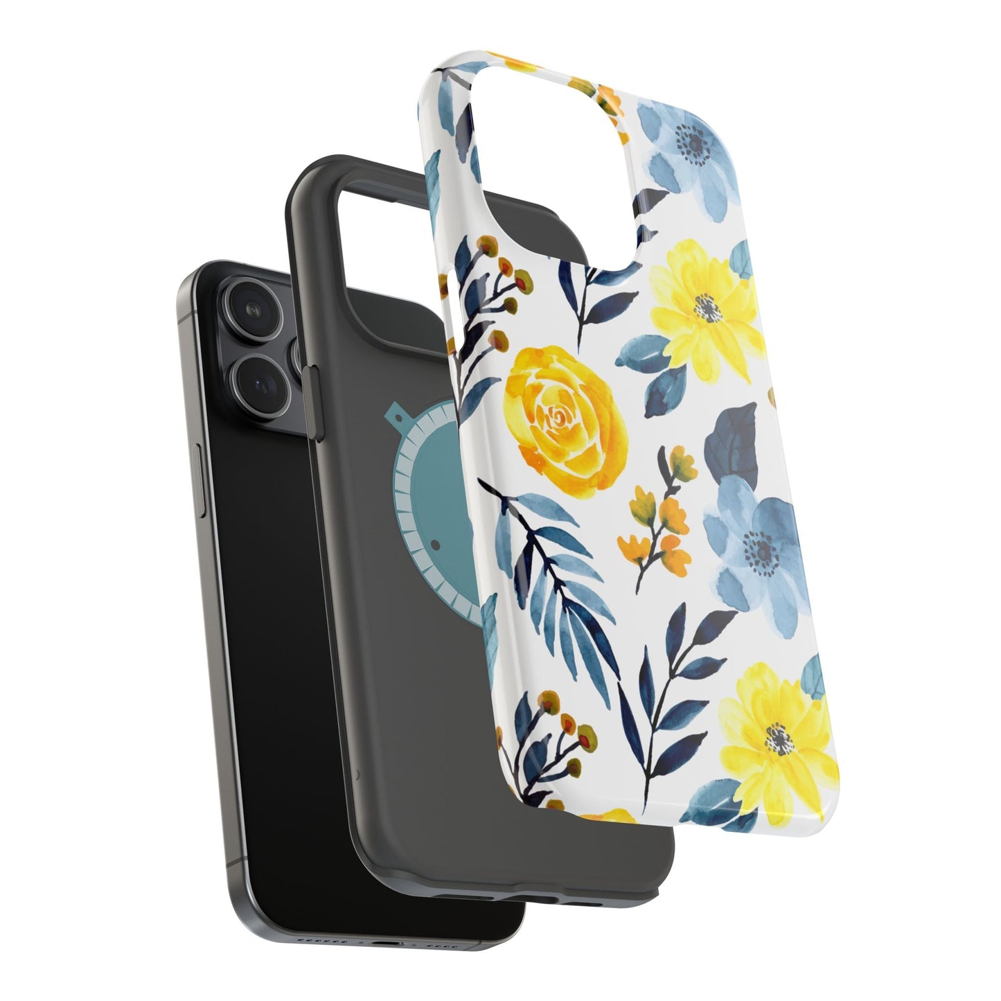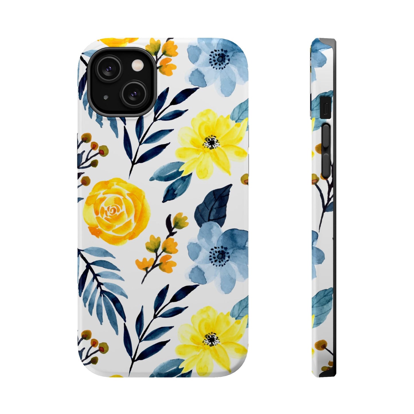 Golden Yellow & Sky Blue Floral – Watercolor Botanical MagSafe iPhone Case