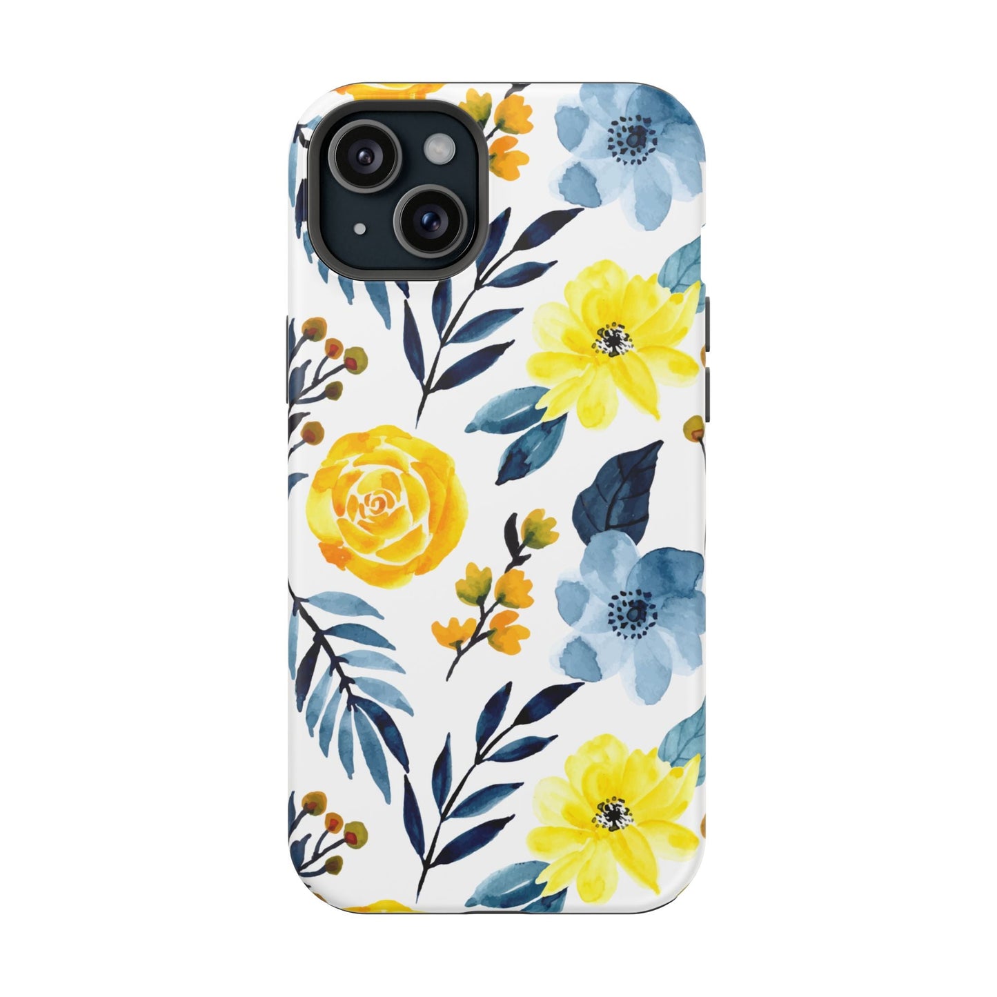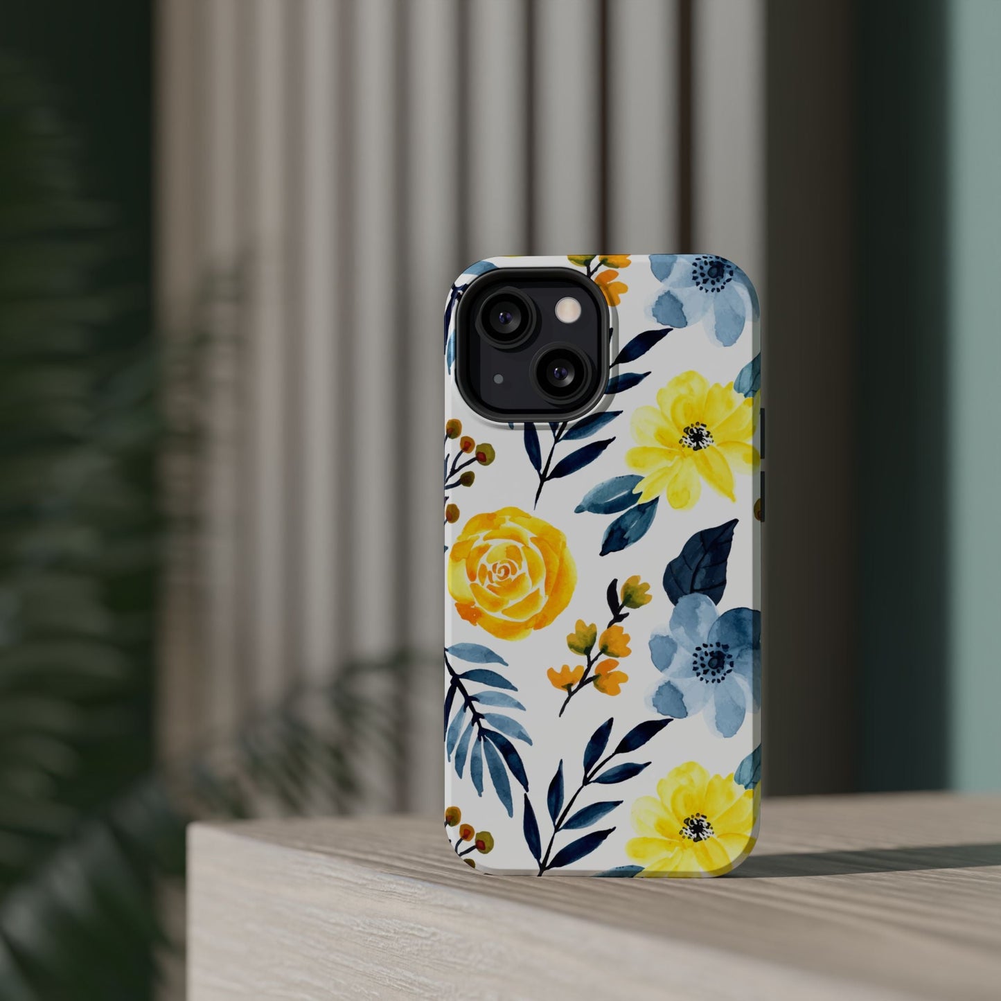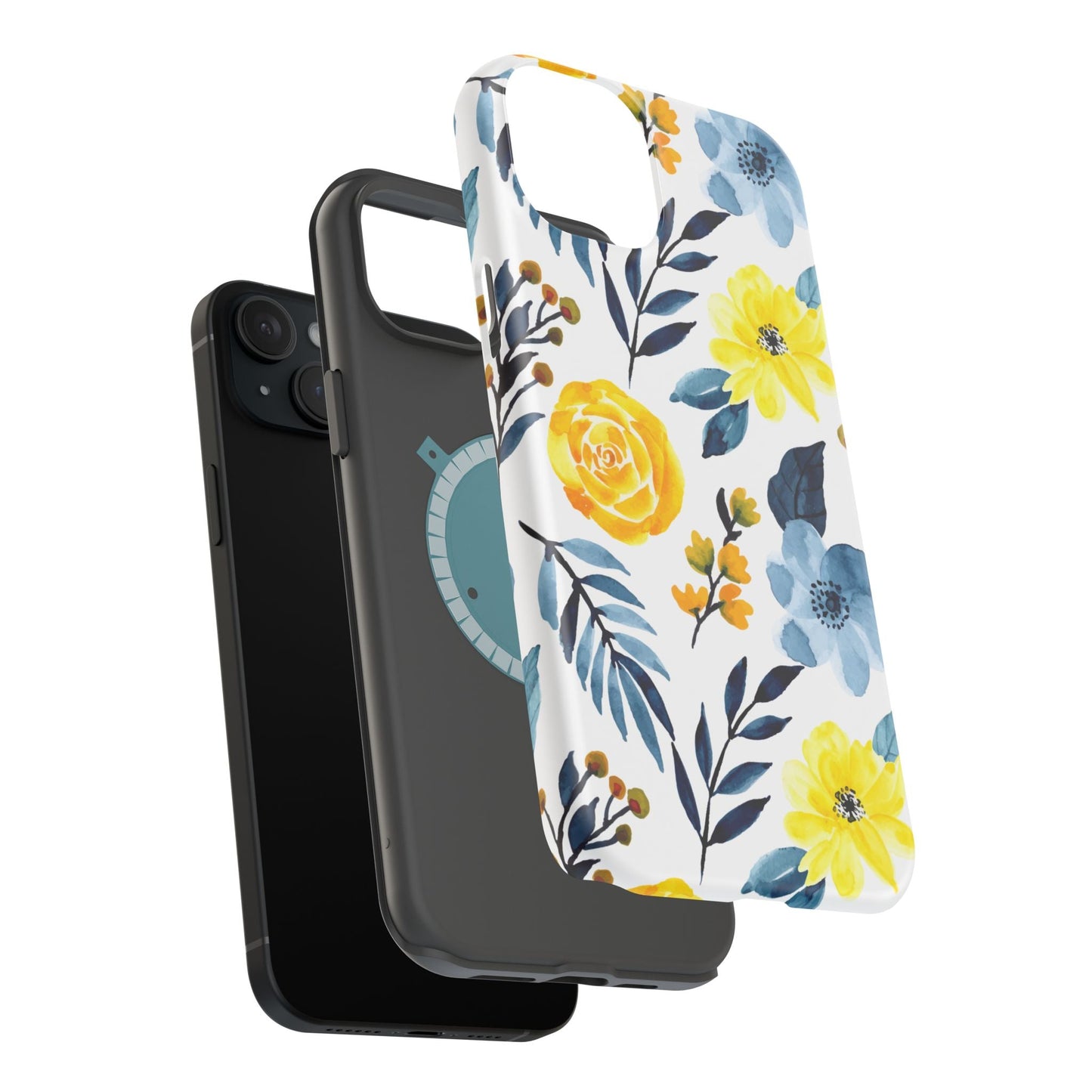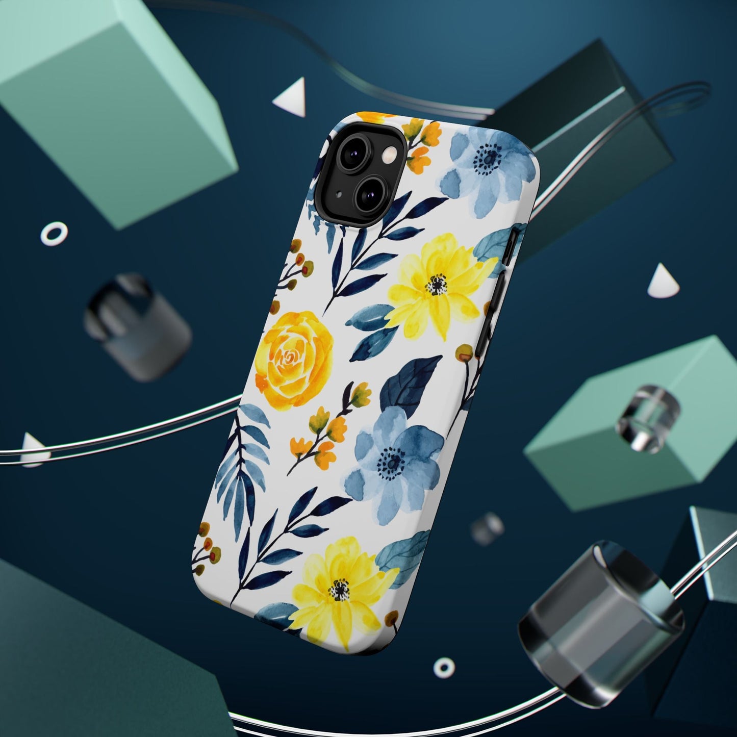 Golden Yellow & Sky Blue Floral – Watercolor Botanical MagSafe iPhone Case