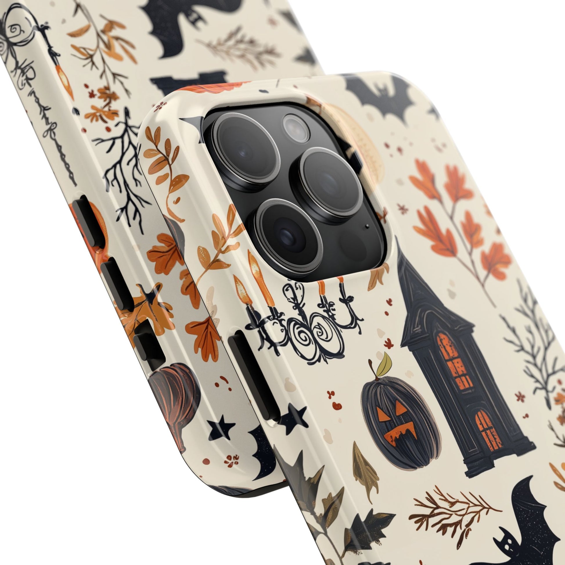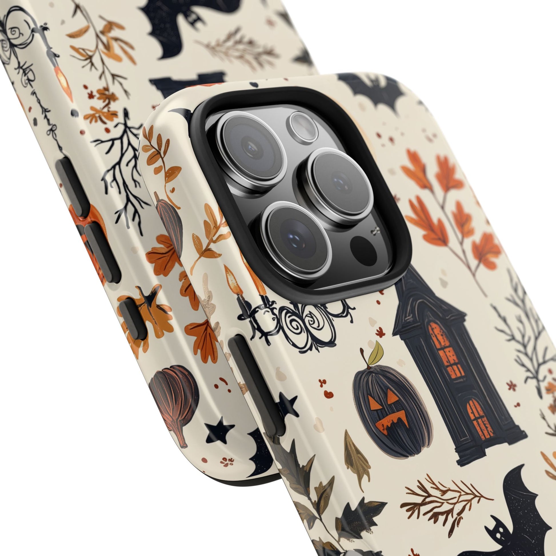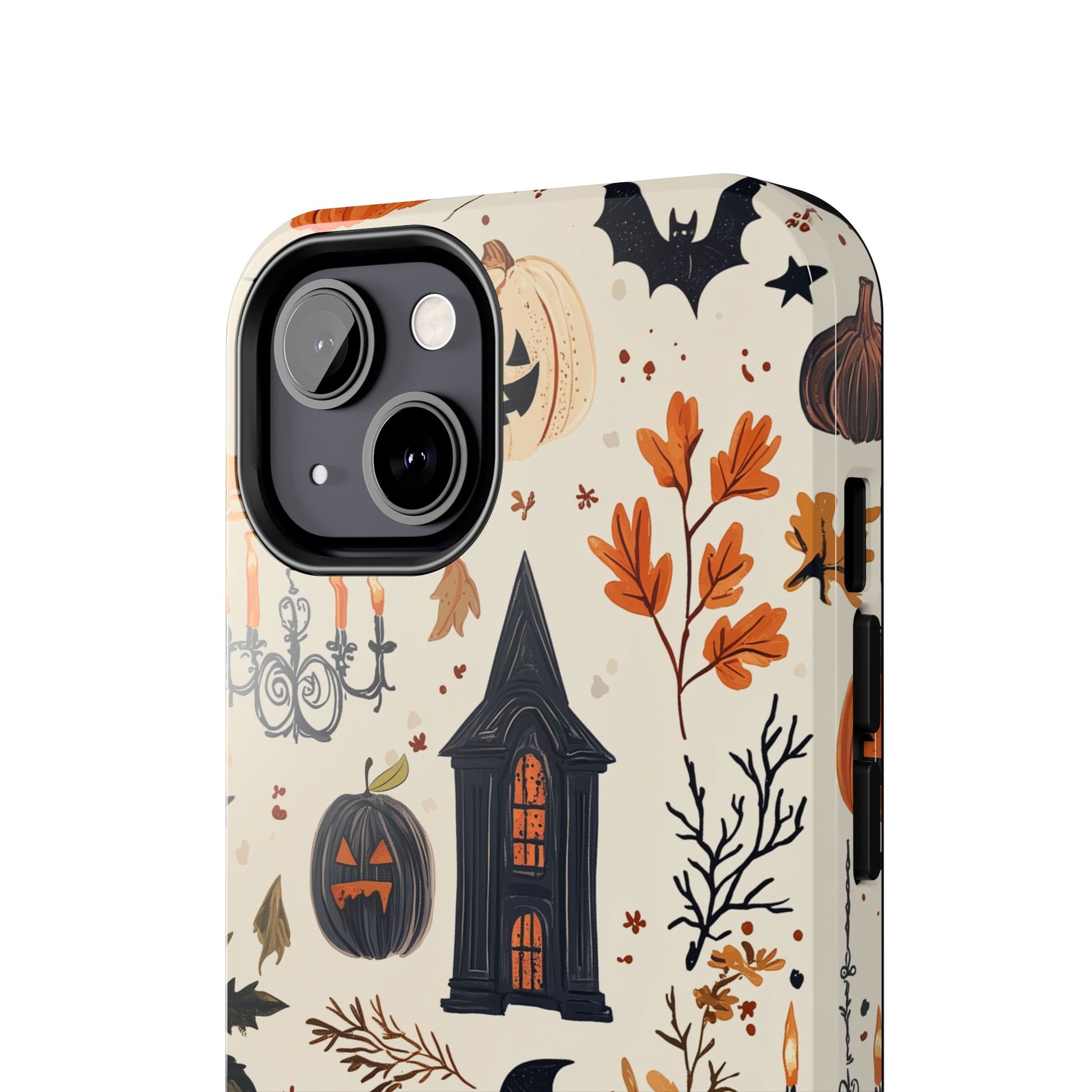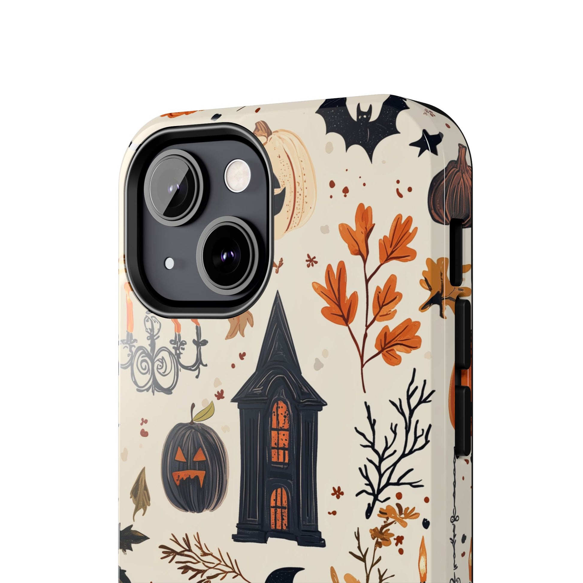 Add a touch of spooky charm to your iPhone this Halloween with this Haunted Halloween iPhone Case. The design features classic Halloween elements like haunted houses, pumpkins, chandeliers, bats, and autumn leaves, creating a whimsical yet eerie scene to complement your Halloween vibe.