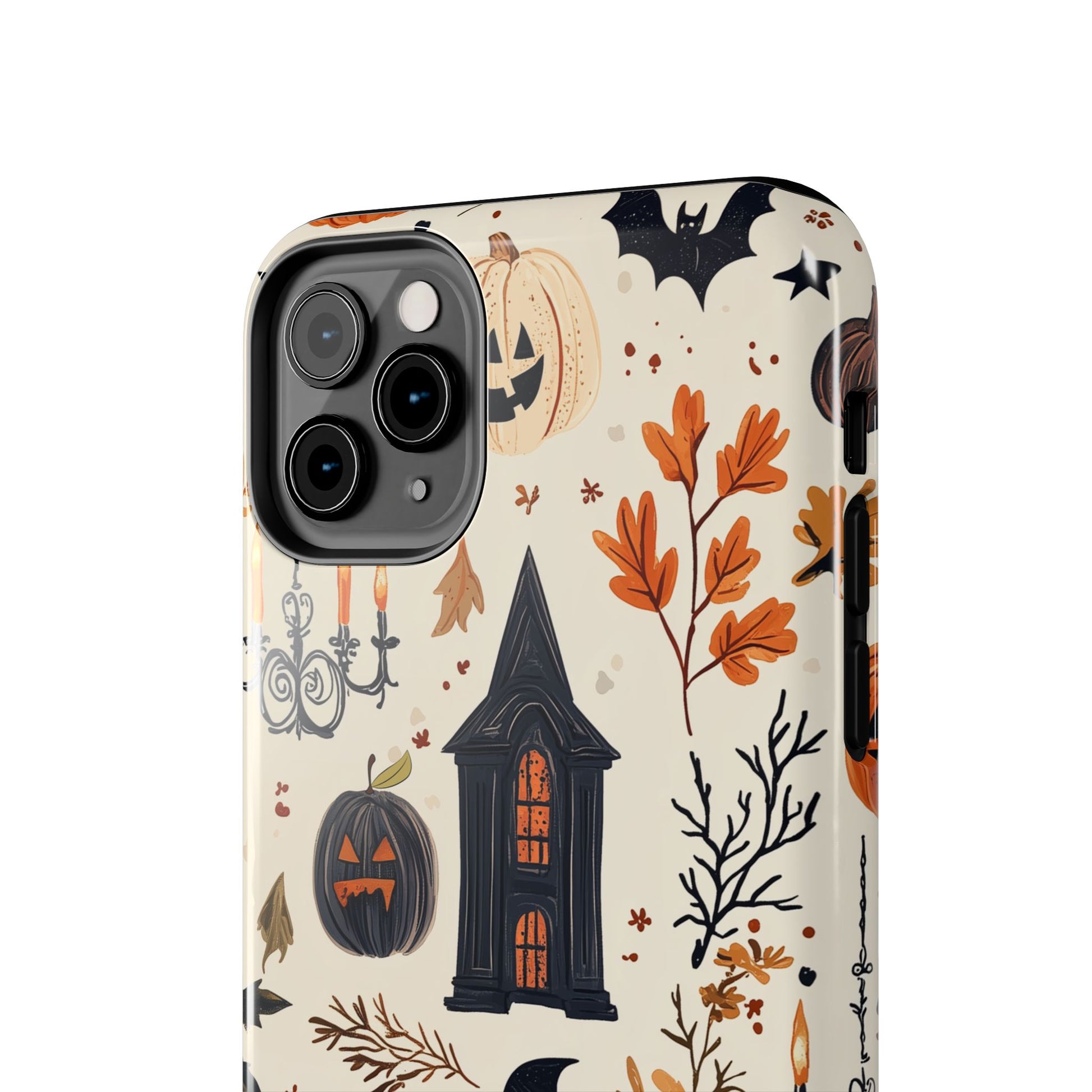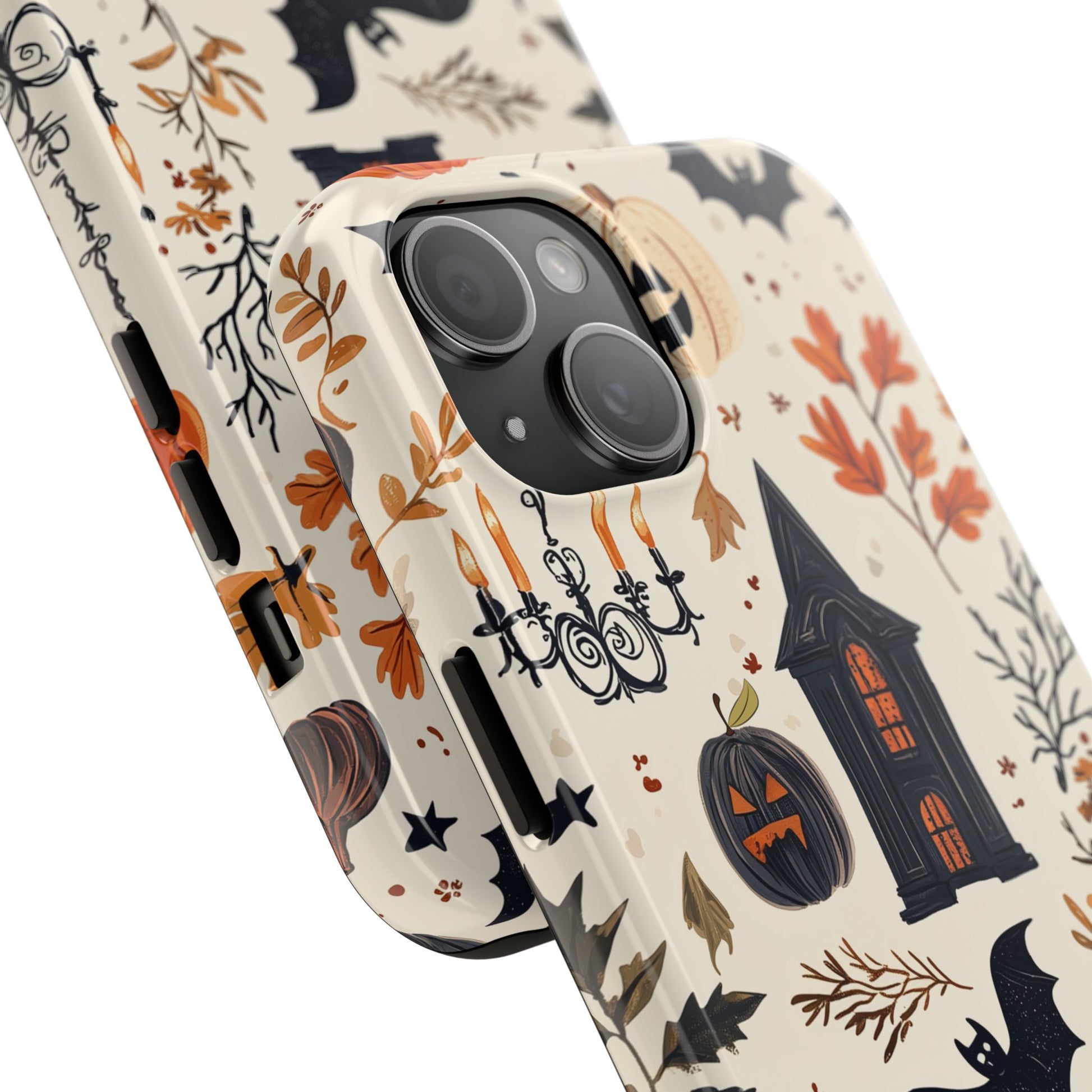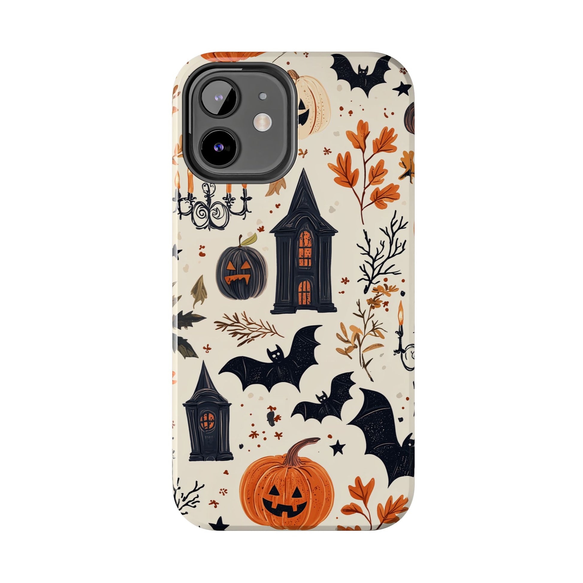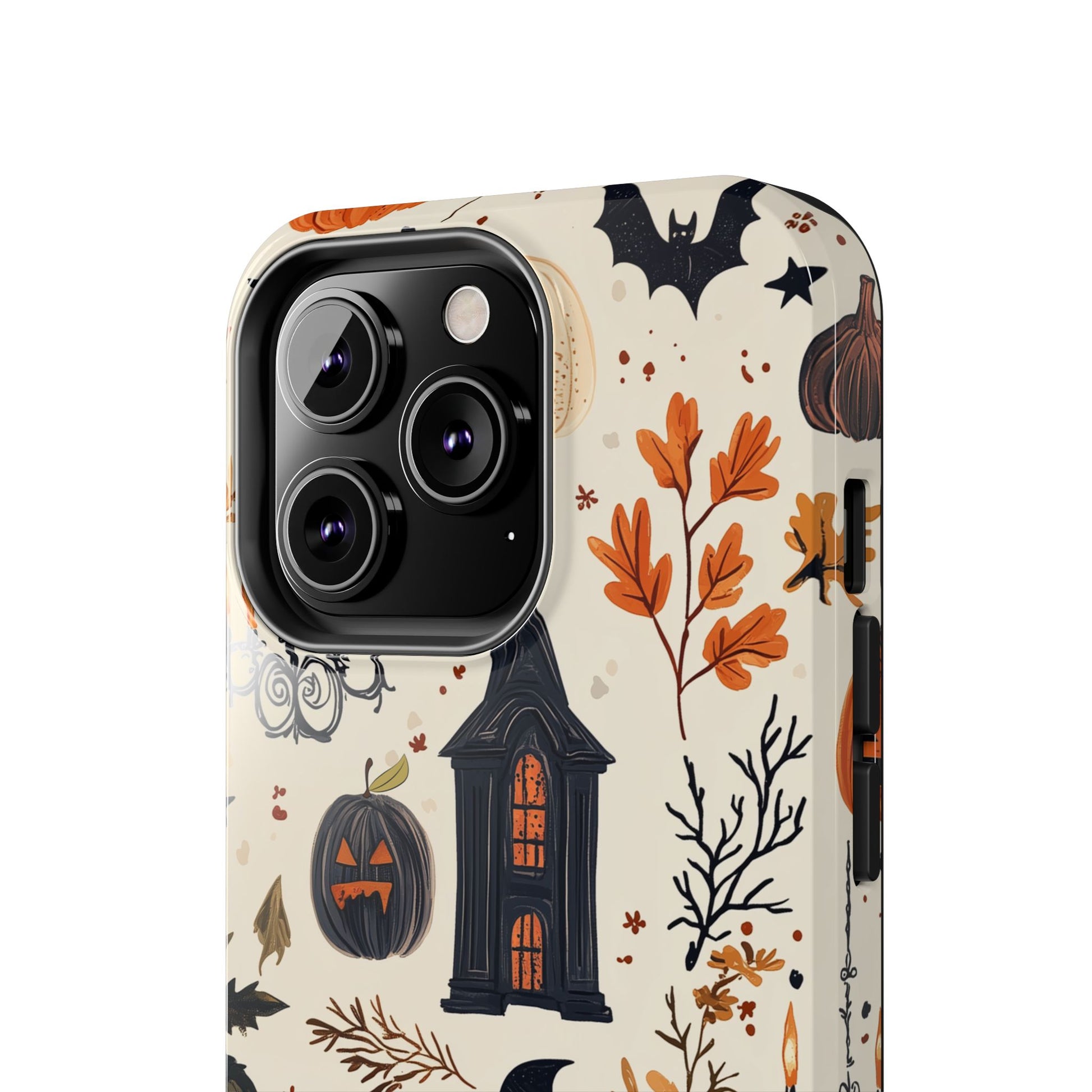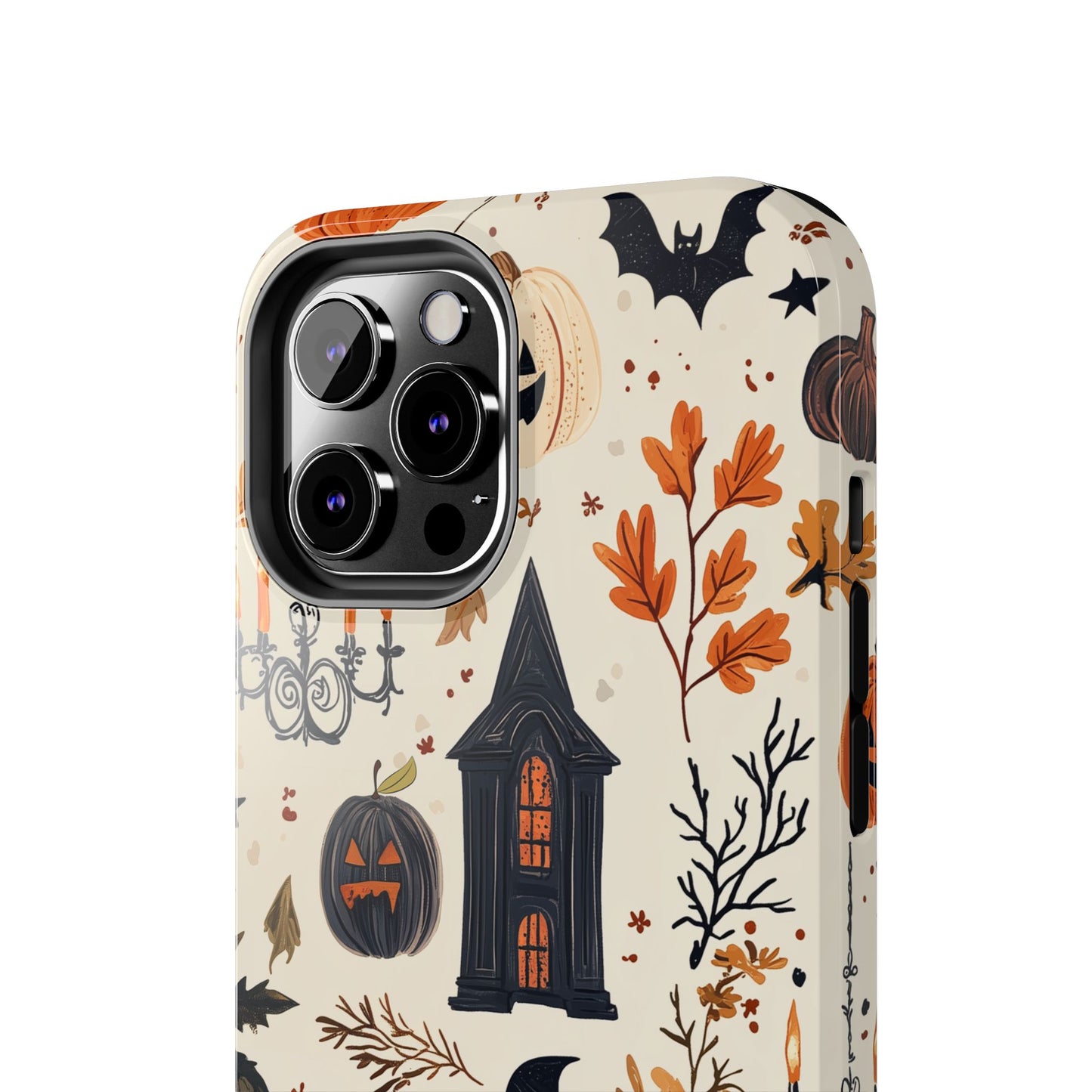 Add a touch of spooky charm to your iPhone this Halloween with this Haunted Halloween iPhone Case. The design features classic Halloween elements like haunted houses, pumpkins, chandeliers, bats, and autumn leaves, creating a whimsical yet eerie scene to complement your Halloween vibe.