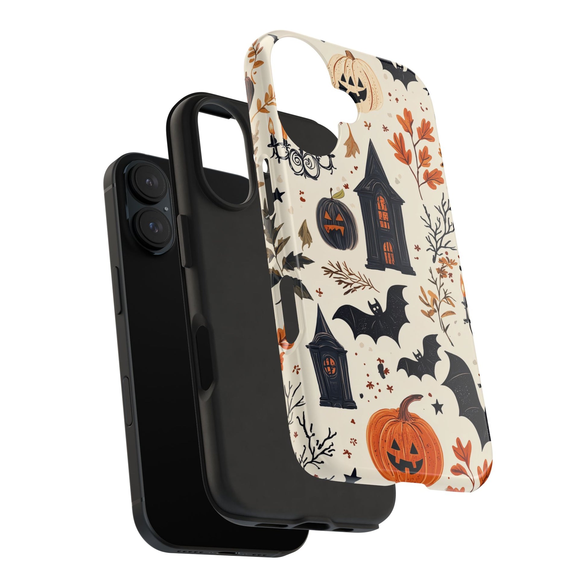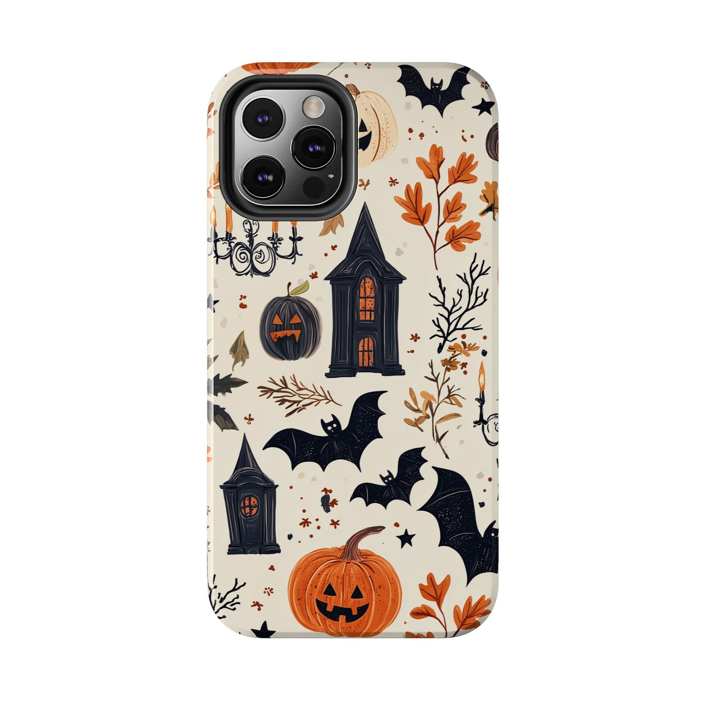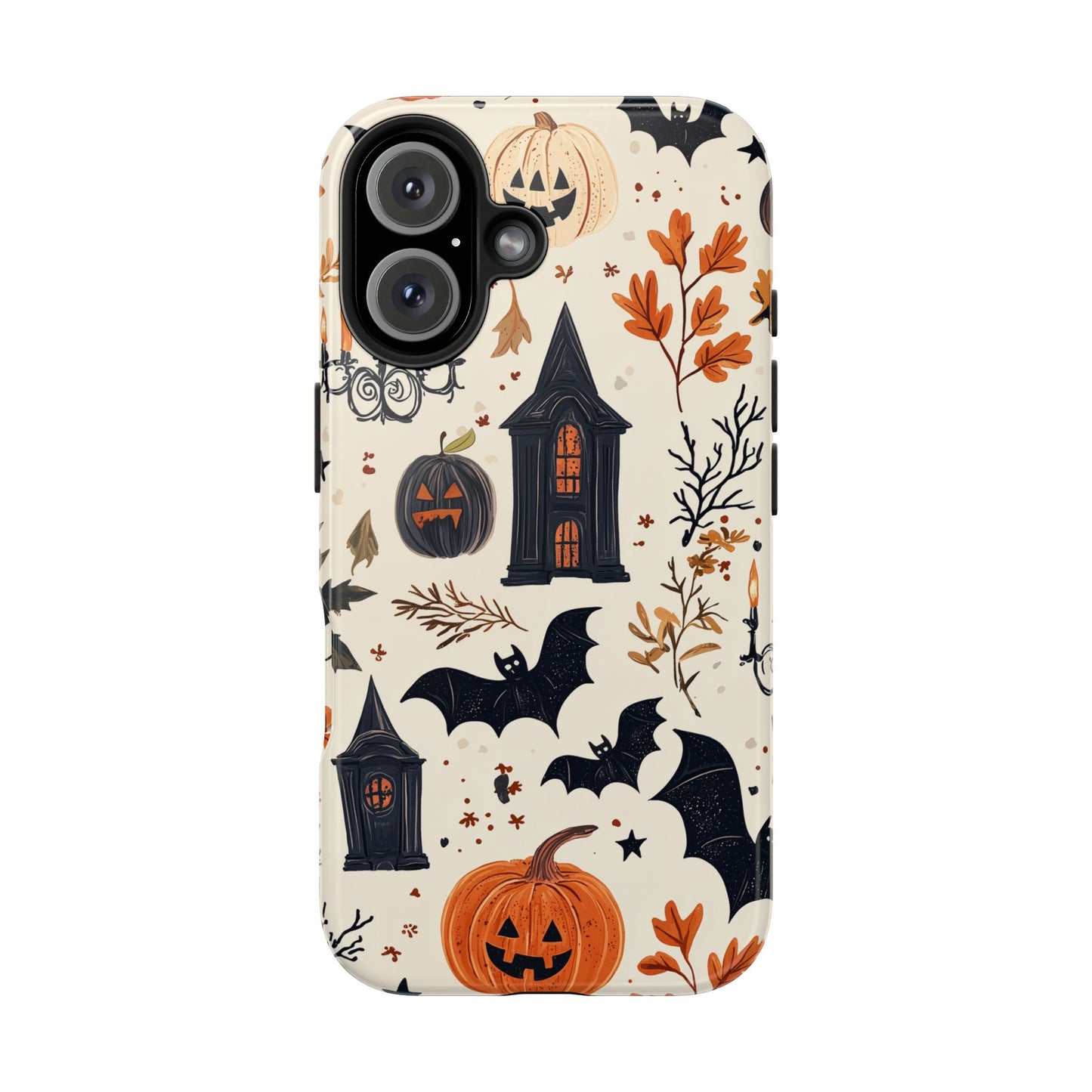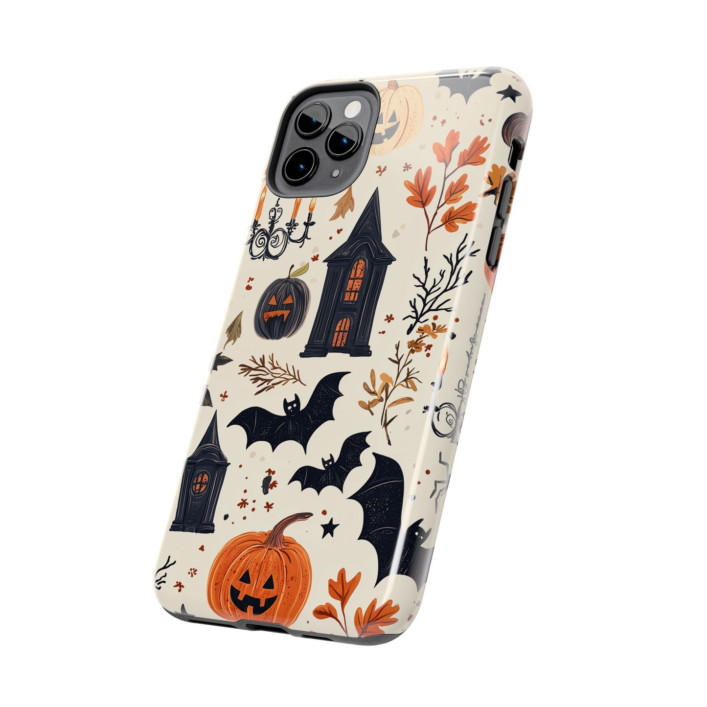 Add a touch of spooky charm to your iPhone this Halloween with this Haunted Halloween iPhone Case. The design features classic Halloween elements like haunted houses, pumpkins, chandeliers, bats, and autumn leaves, creating a whimsical yet eerie scene to complement your Halloween vibe.