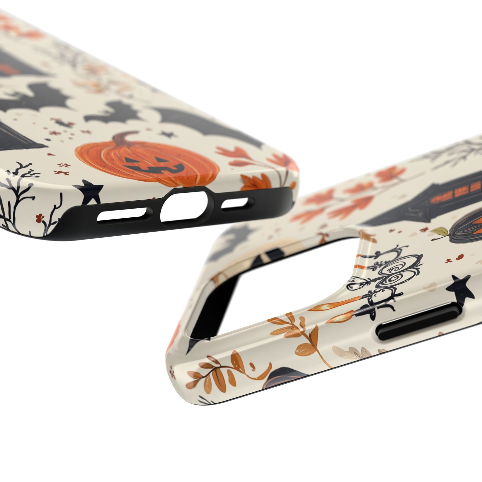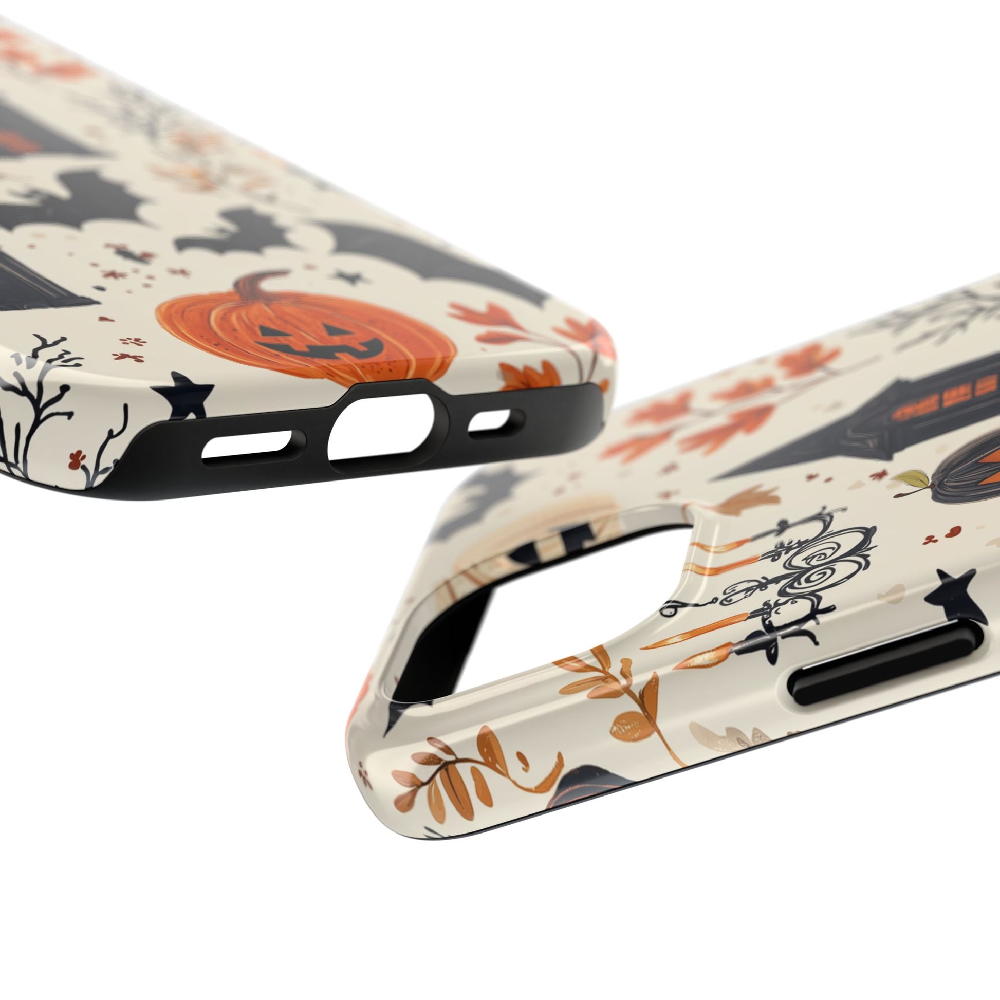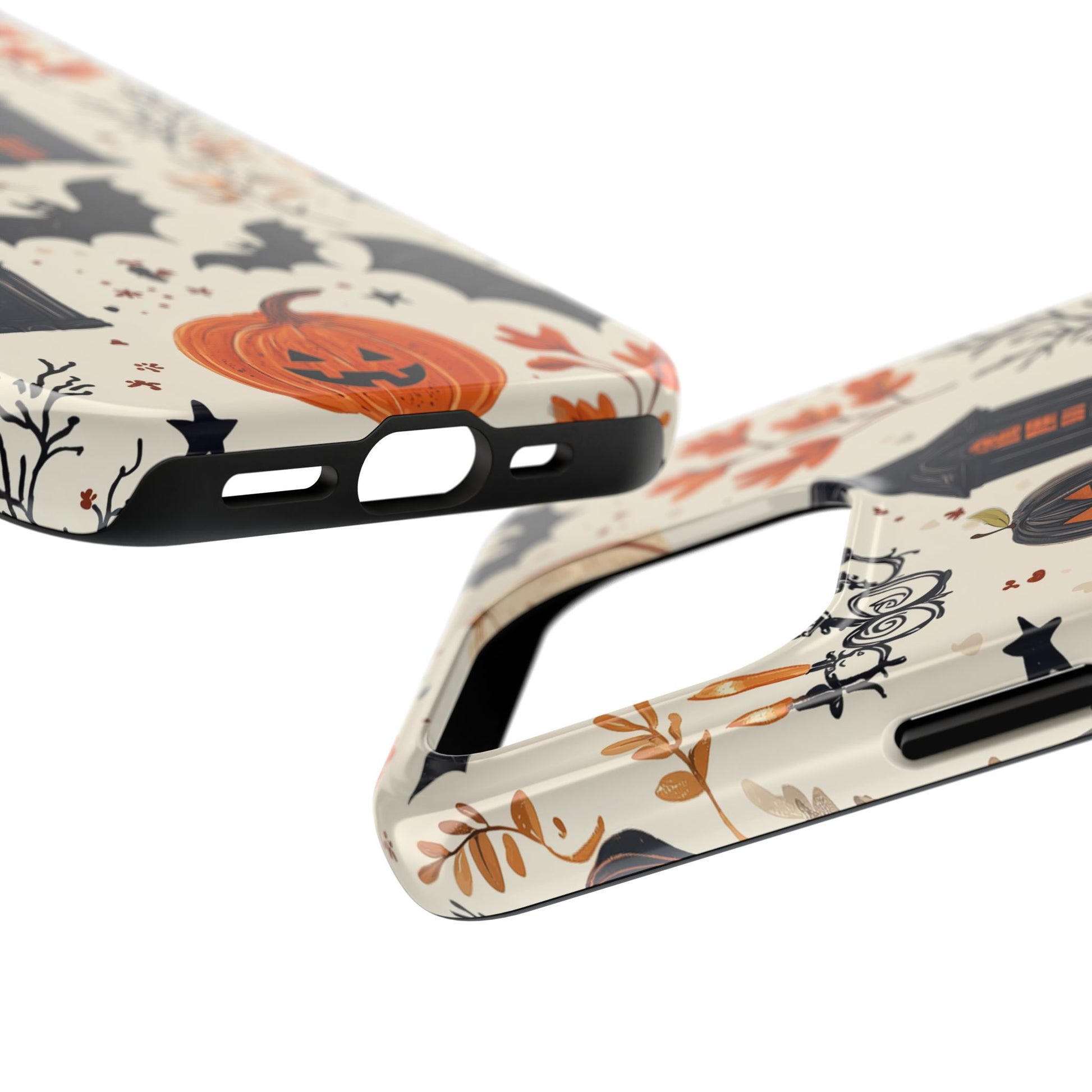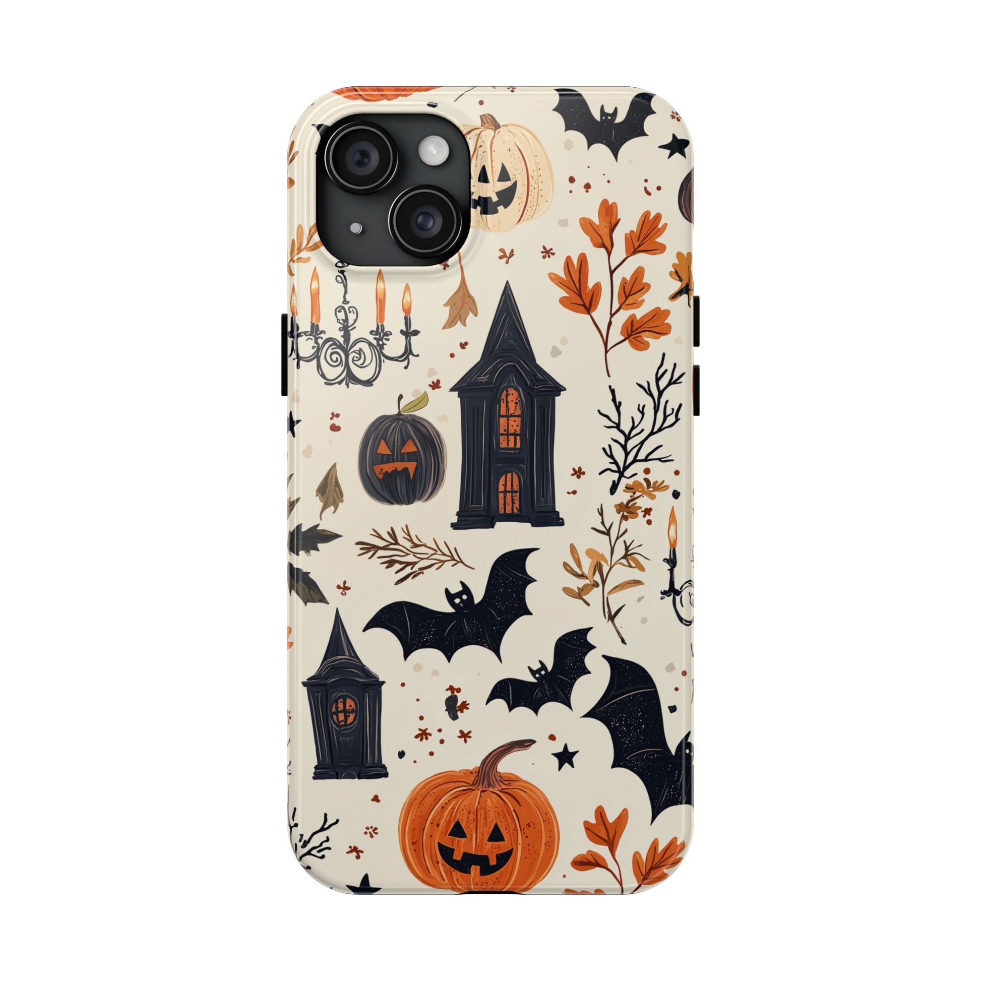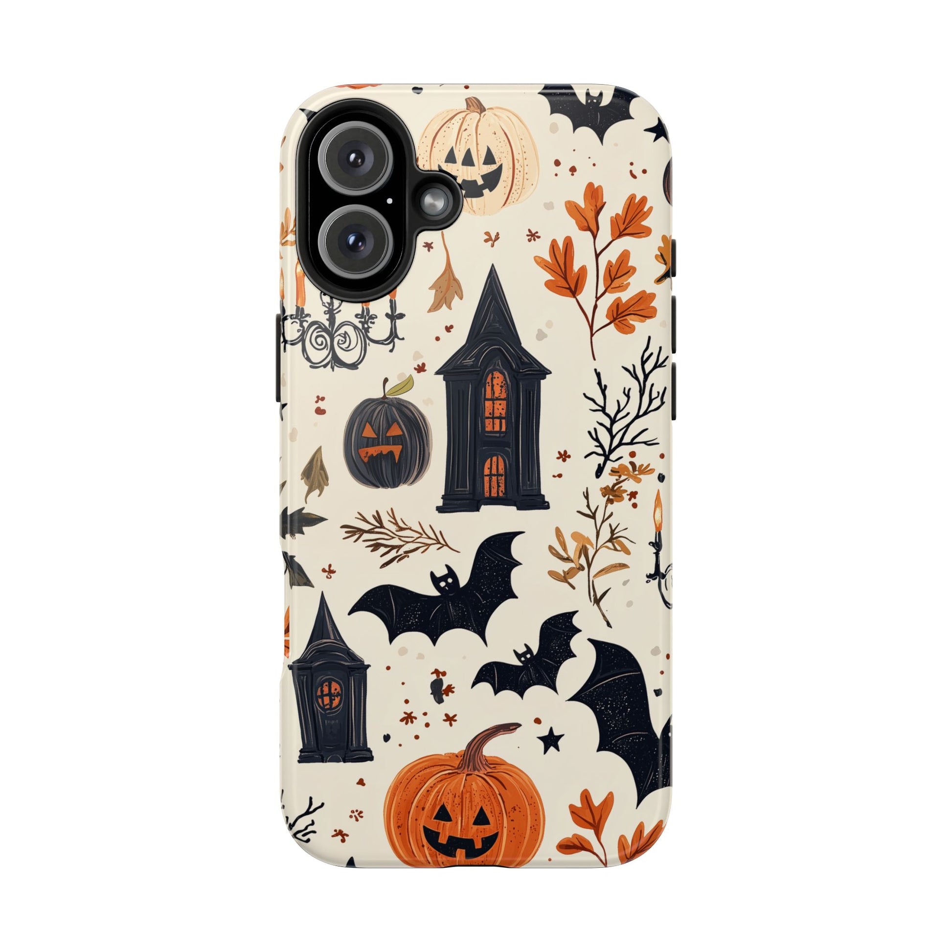 Add a touch of spooky charm to your iPhone this Halloween with this Haunted Halloween iPhone Case. The design features classic Halloween elements like haunted houses, pumpkins, chandeliers, bats, and autumn leaves, creating a whimsical yet eerie scene to complement your Halloween vibe.