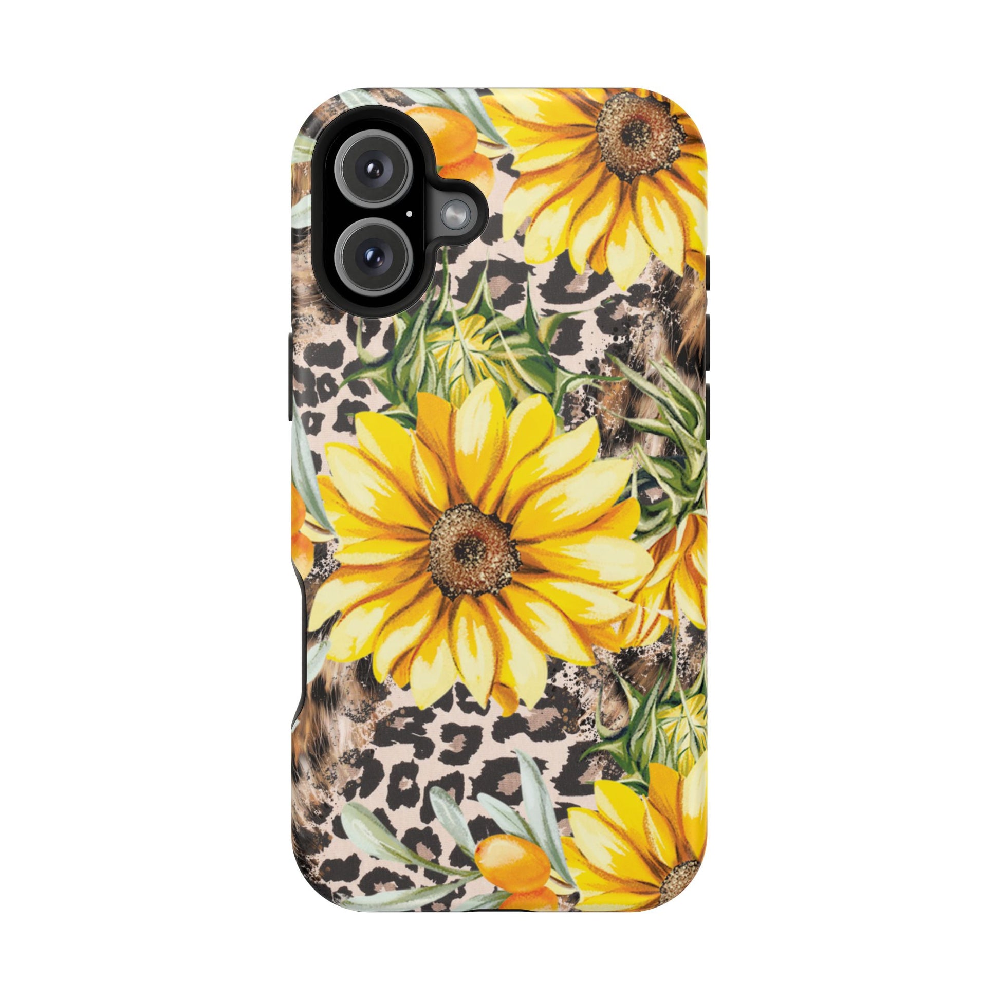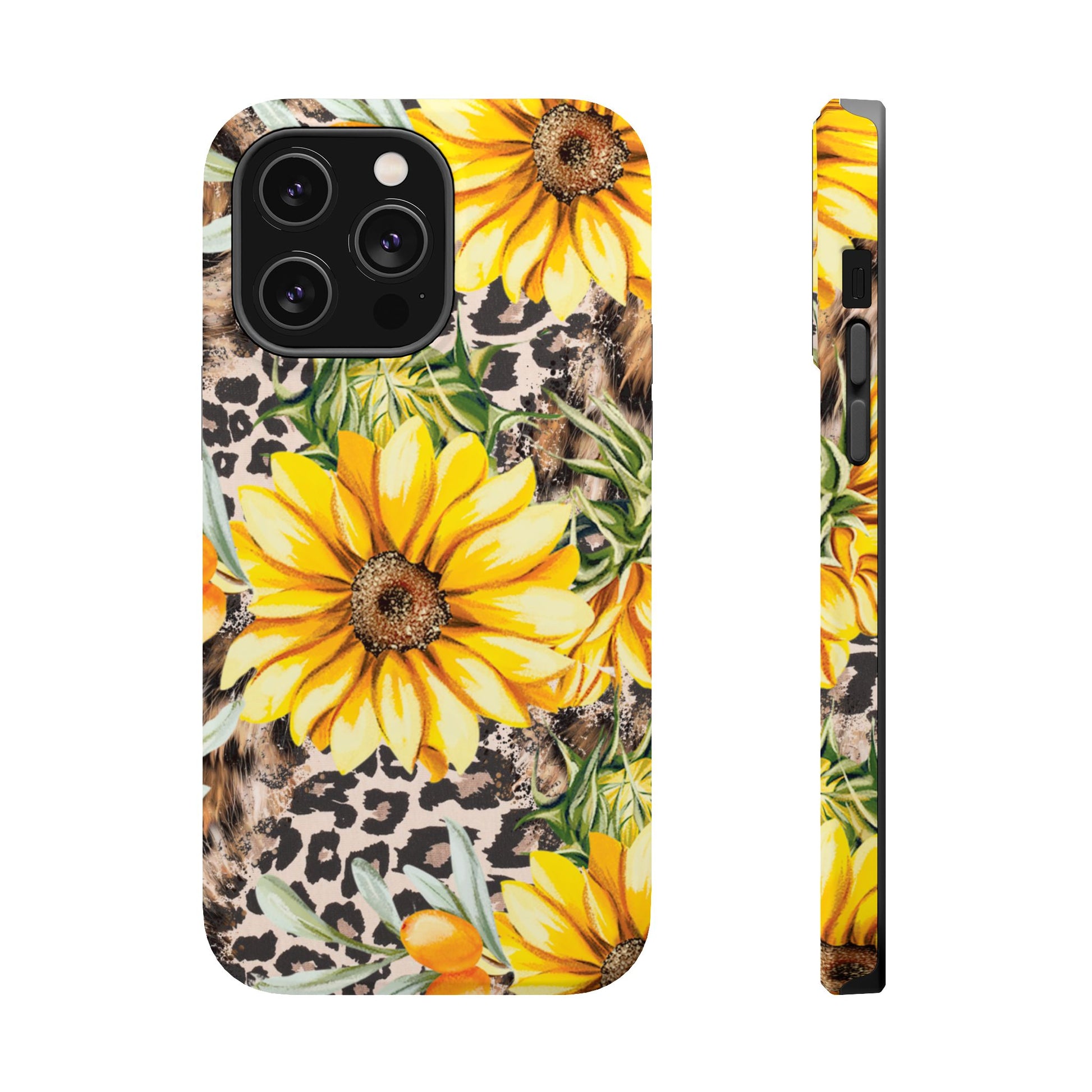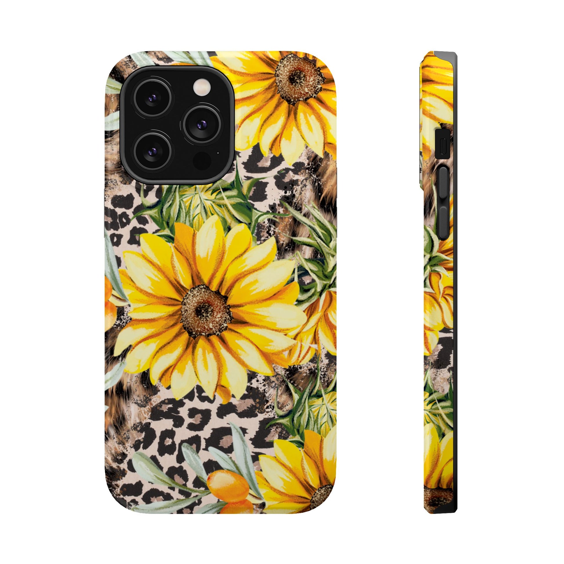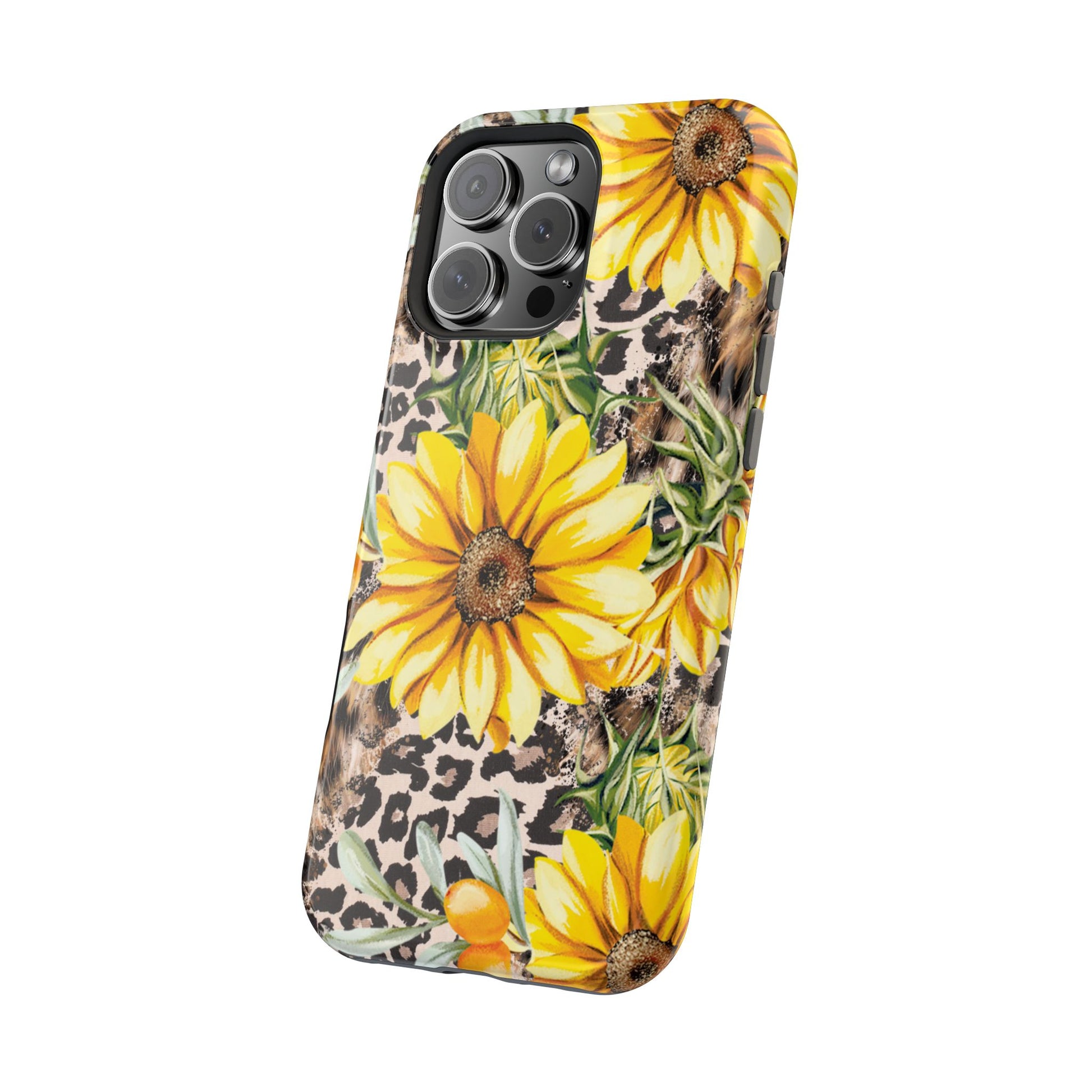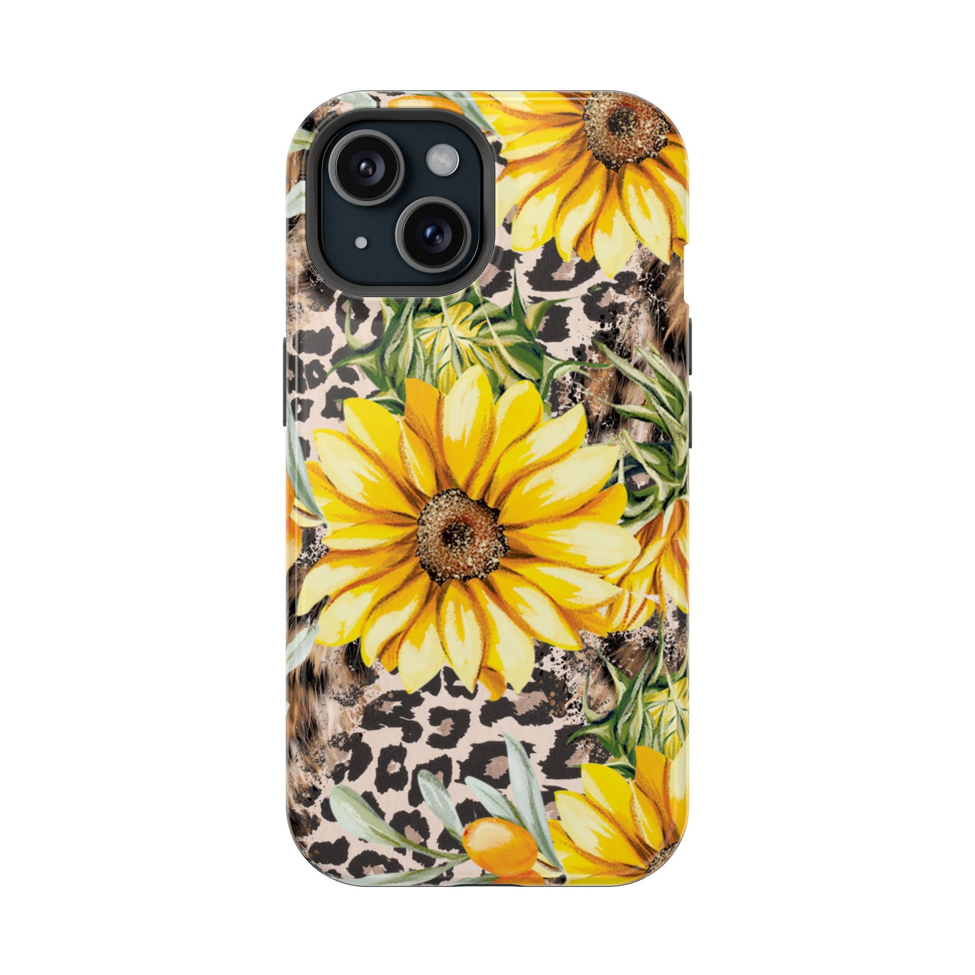 Unleash your wild side with this Leopard Sunflower Chic MagSafe iPhone Case! This fierce and fashionable design combines vibrant yellow sunflowers with trendy leopard print and soft, neutral undertones. Touches of foliage and orange berries add a natural accent to the bold animal print background, creating a perfect blend of rustic charm and modern glam. Built with a strong polycarbonate shell and shock-absorbing TPU liner, this case offers both style and reliable protection. A must-have for trendsetters who love a little bit of edge in their accessories!
