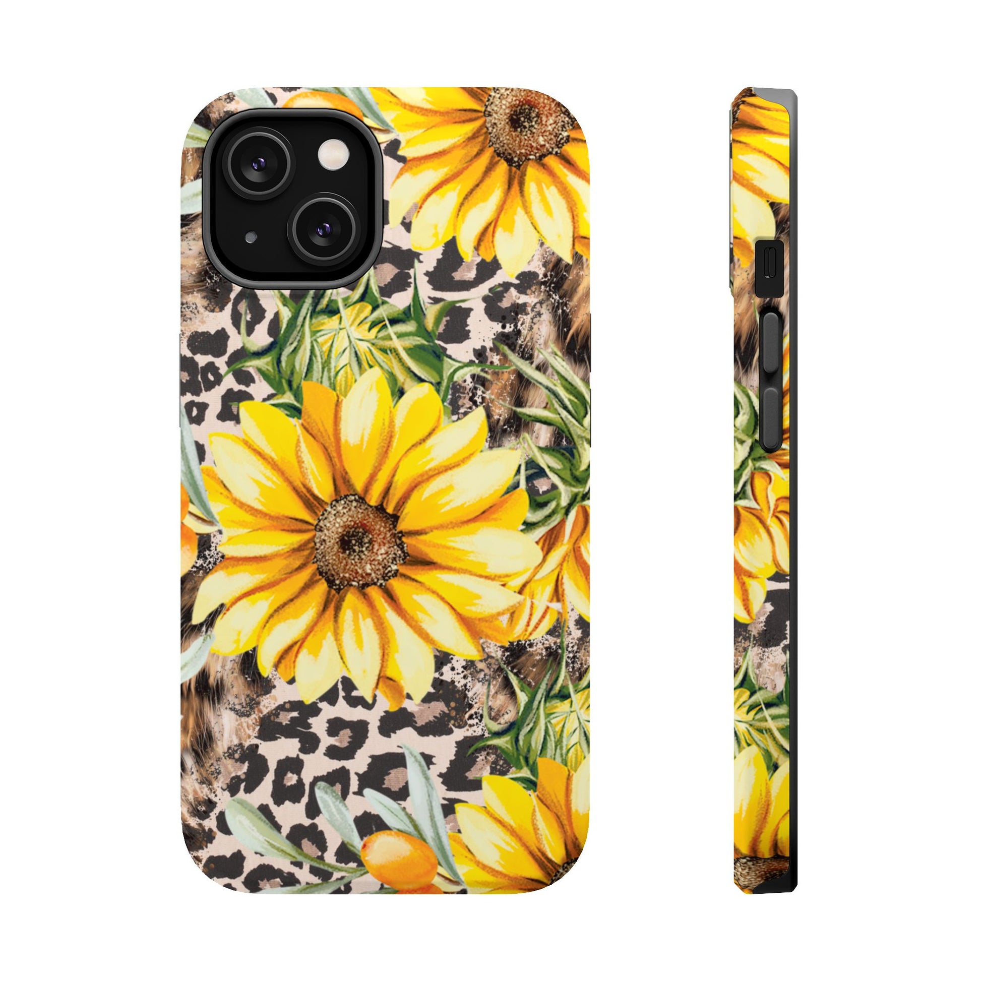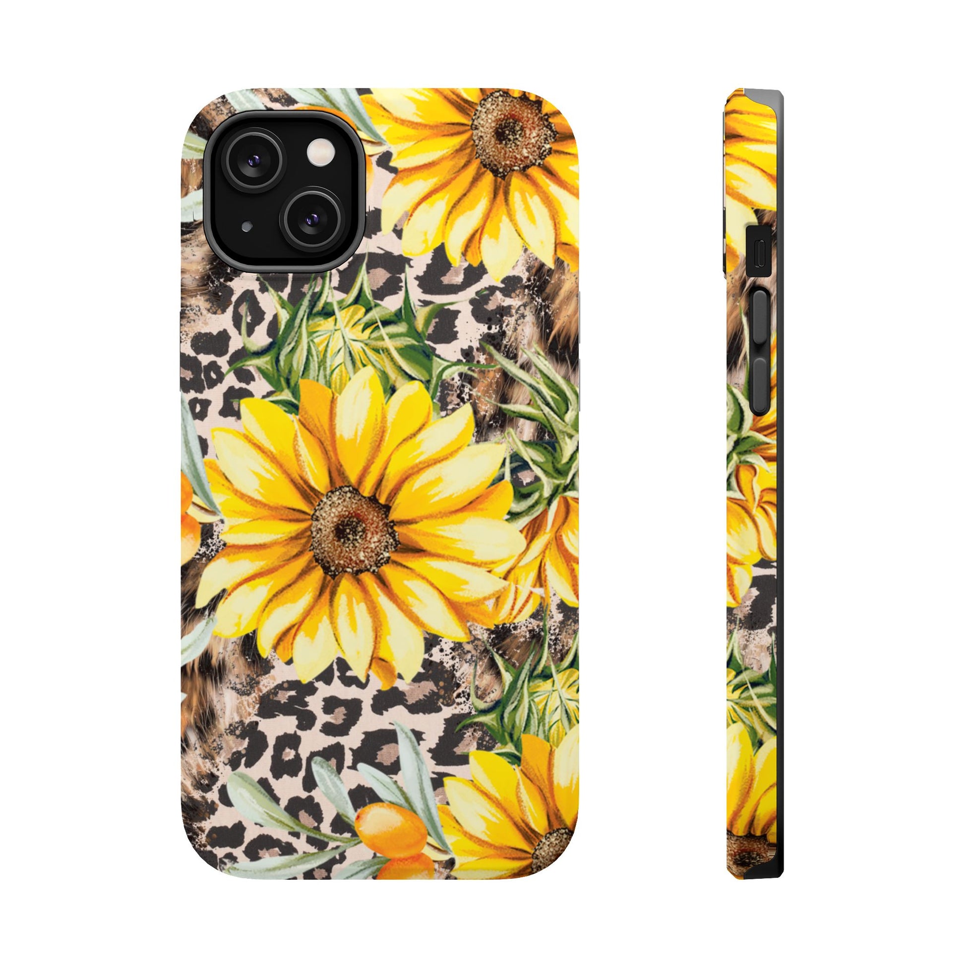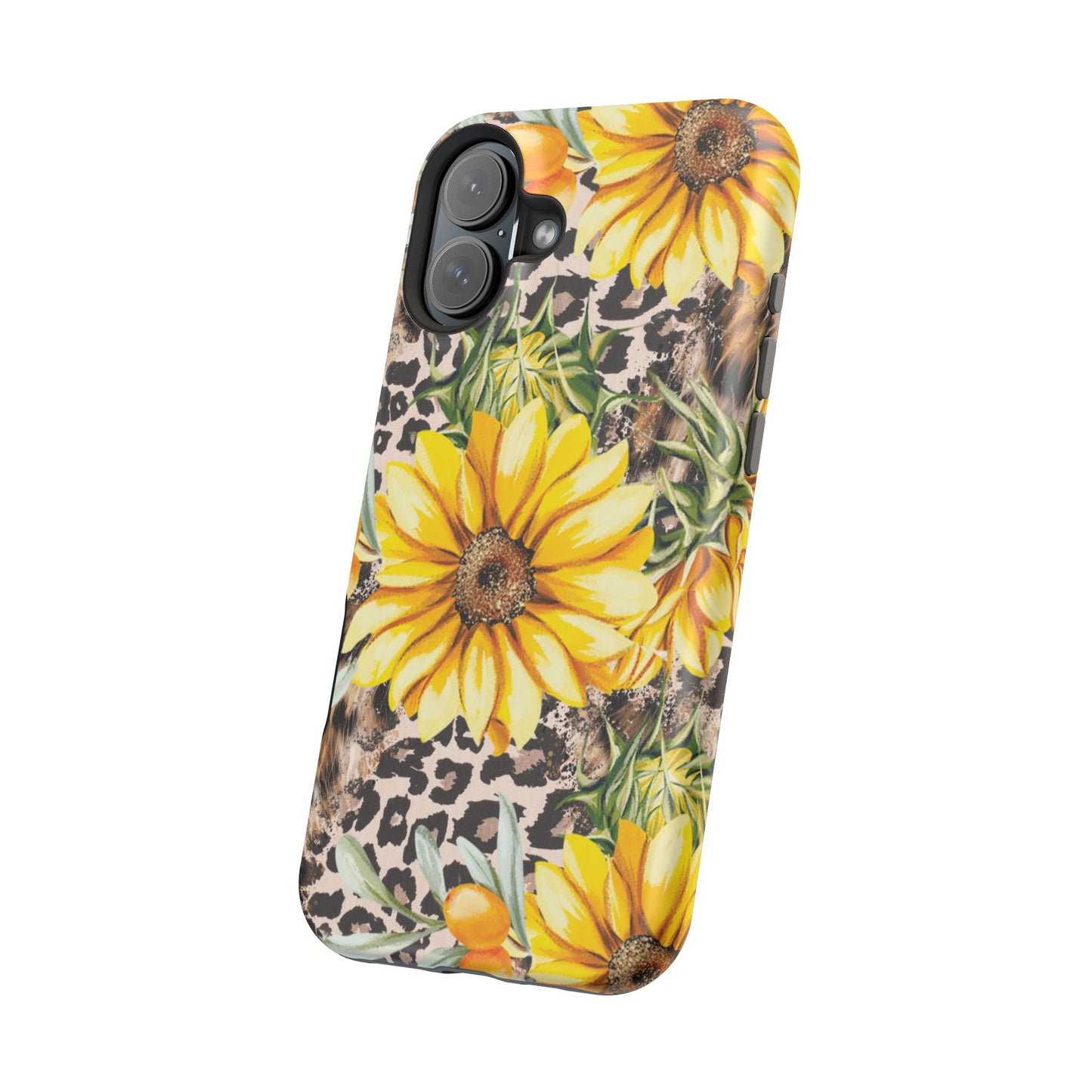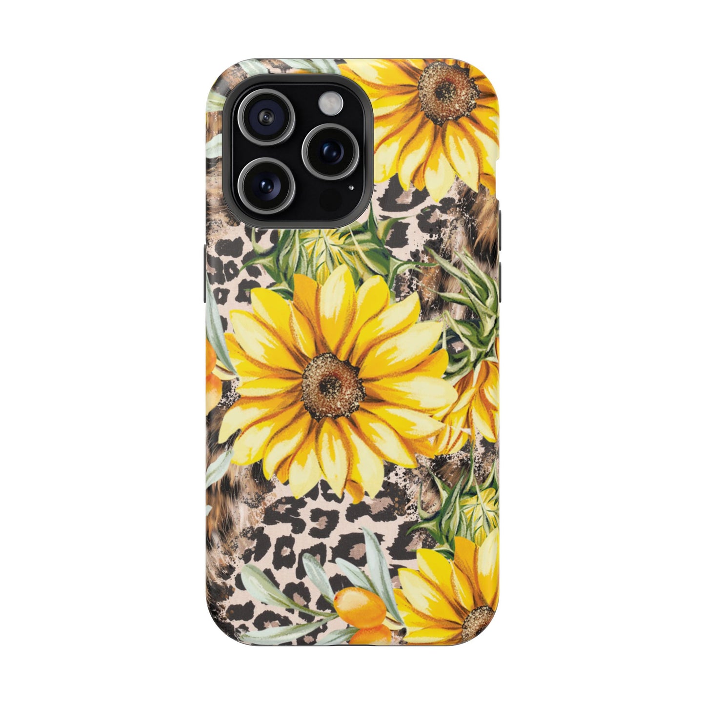 Unleash your wild side with this Leopard Sunflower Chic MagSafe iPhone Case! This fierce and fashionable design combines vibrant yellow sunflowers with trendy leopard print and soft, neutral undertones. Touches of foliage and orange berries add a natural accent to the bold animal print background, creating a perfect blend of rustic charm and modern glam. Built with a strong polycarbonate shell and shock-absorbing TPU liner, this case offers both style and reliable protection. A must-have for trendsetters who love a little bit of edge in their accessories!