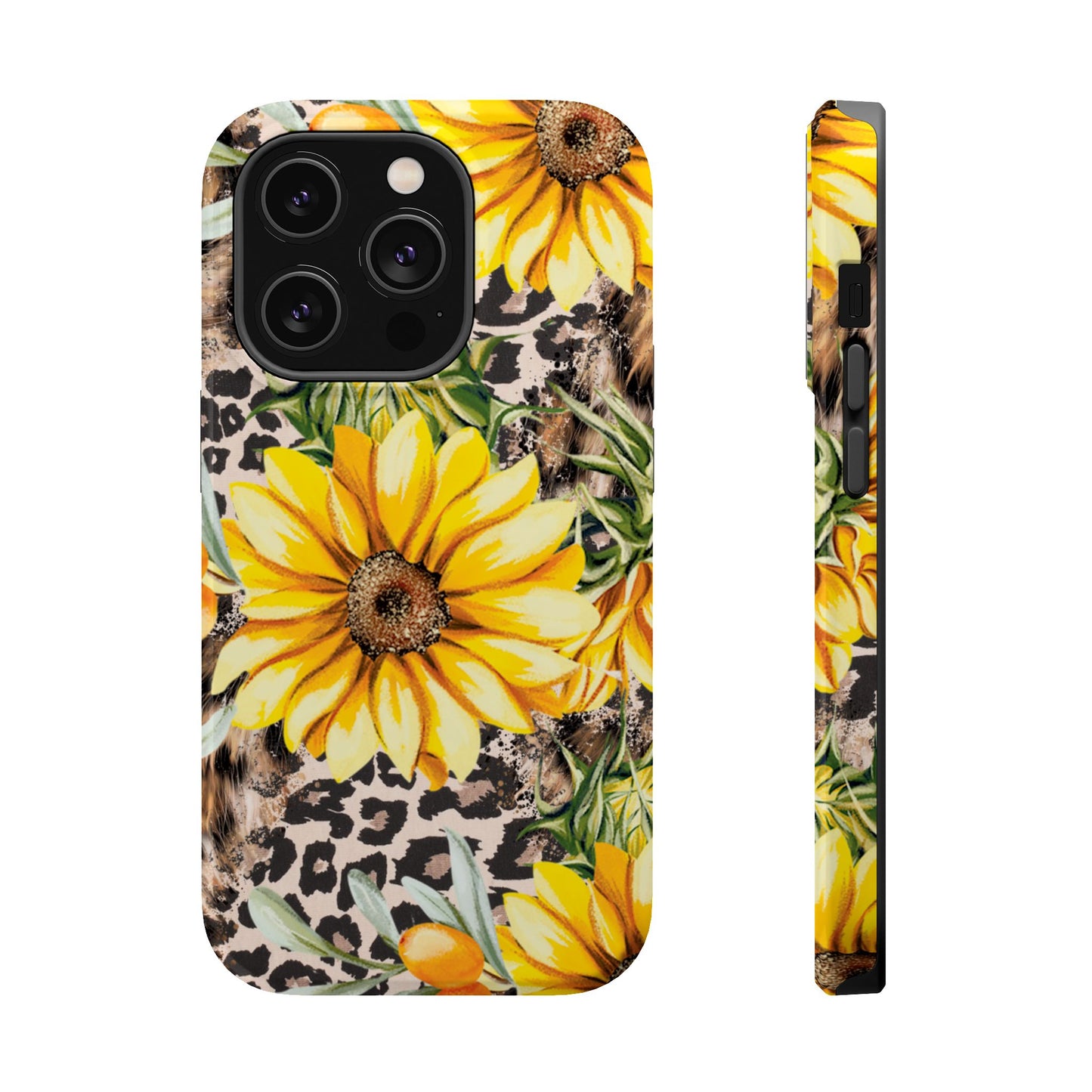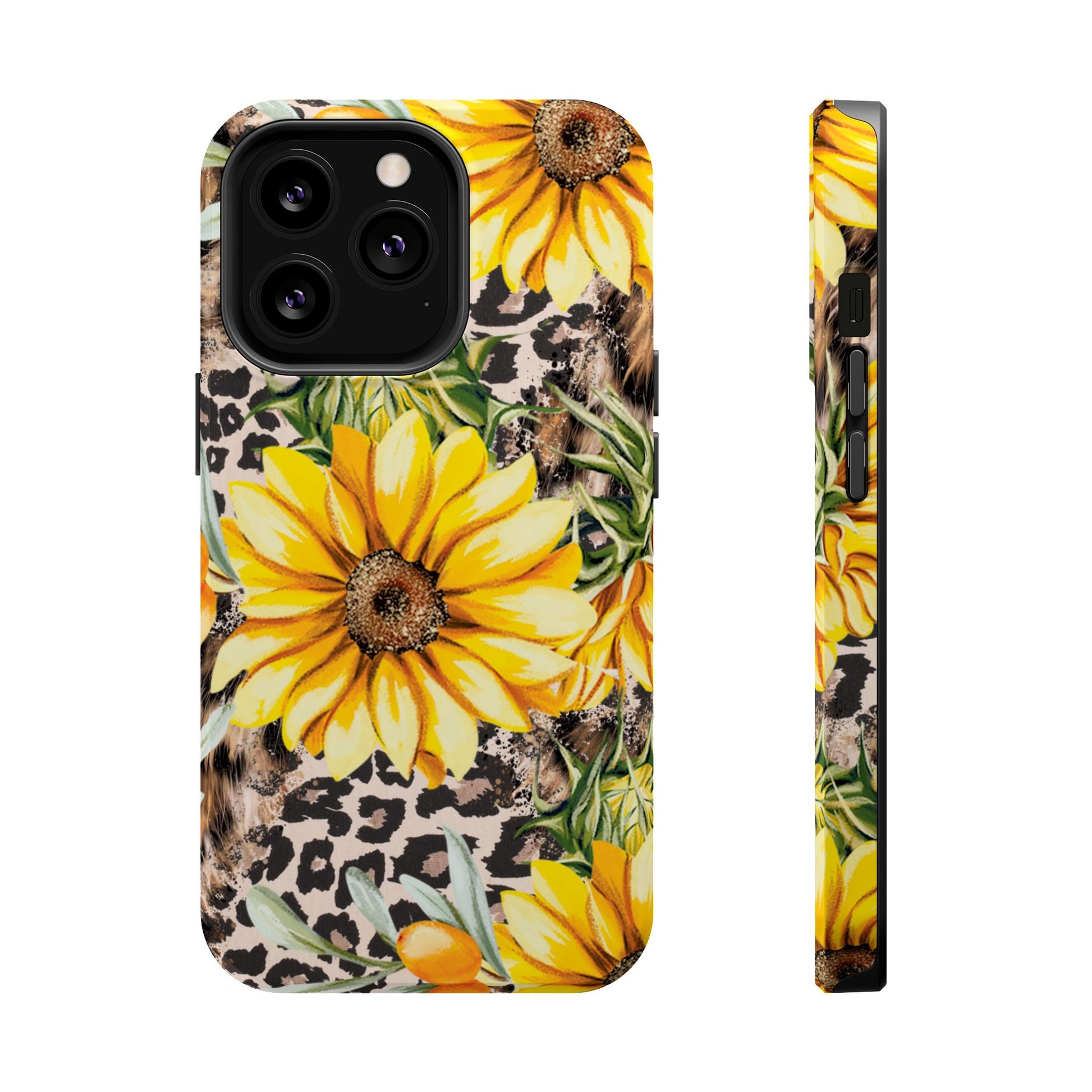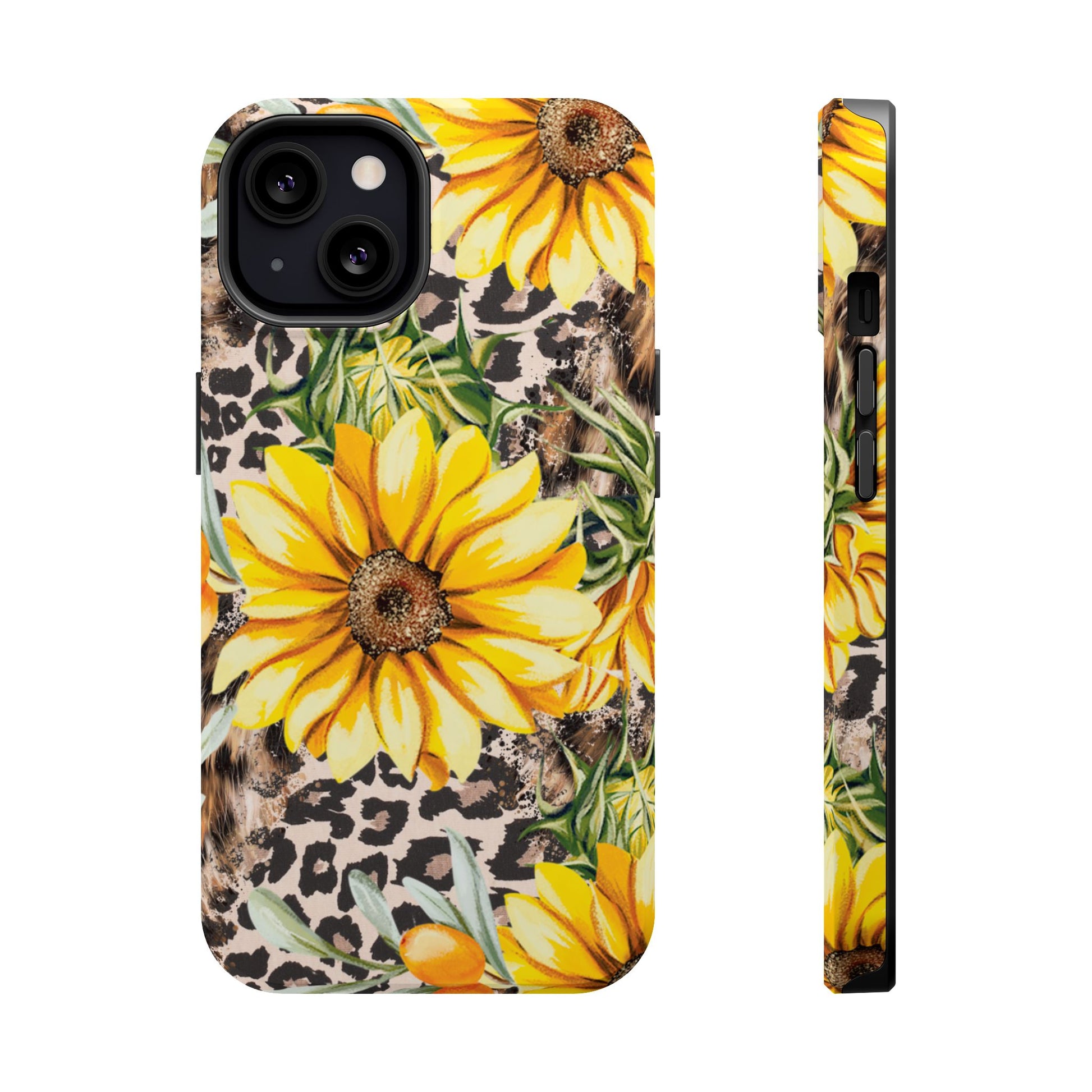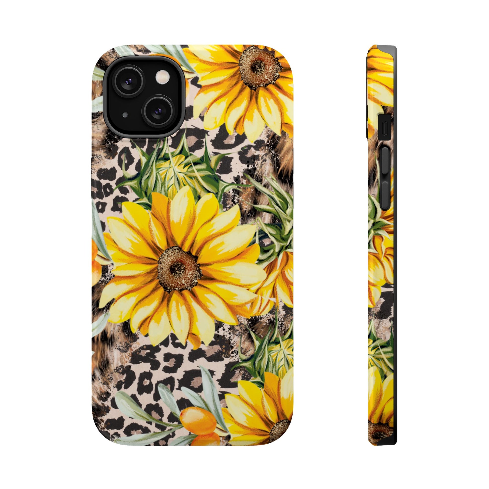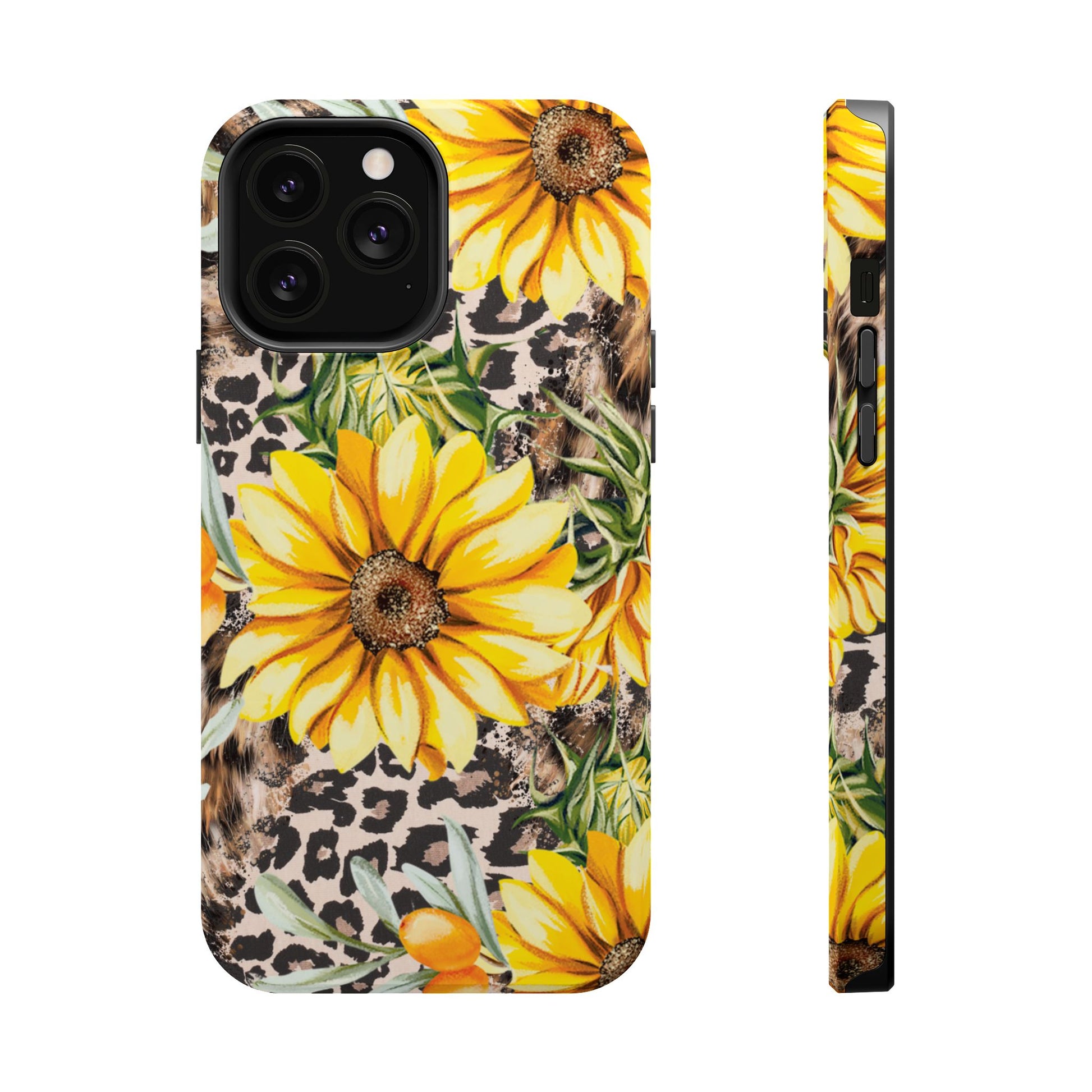 Unleash your wild side with this Leopard Sunflower Chic MagSafe iPhone Case! This fierce and fashionable design combines vibrant yellow sunflowers with trendy leopard print and soft, neutral undertones. Touches of foliage and orange berries add a natural accent to the bold animal print background, creating a perfect blend of rustic charm and modern glam. Built with a strong polycarbonate shell and shock-absorbing TPU liner, this case offers both style and reliable protection. A must-have for trendsetters who love a little bit of edge in their accessories!