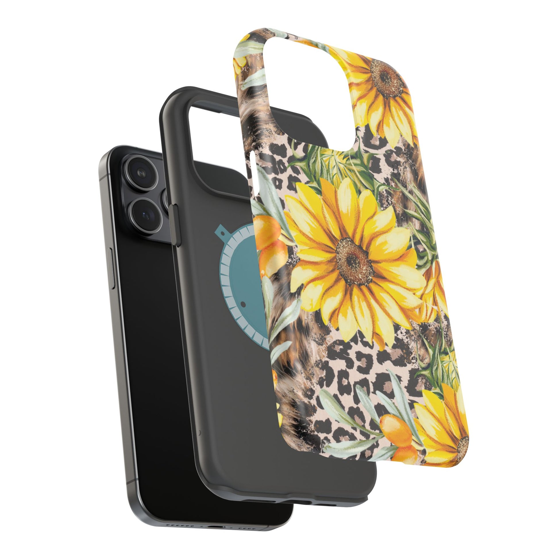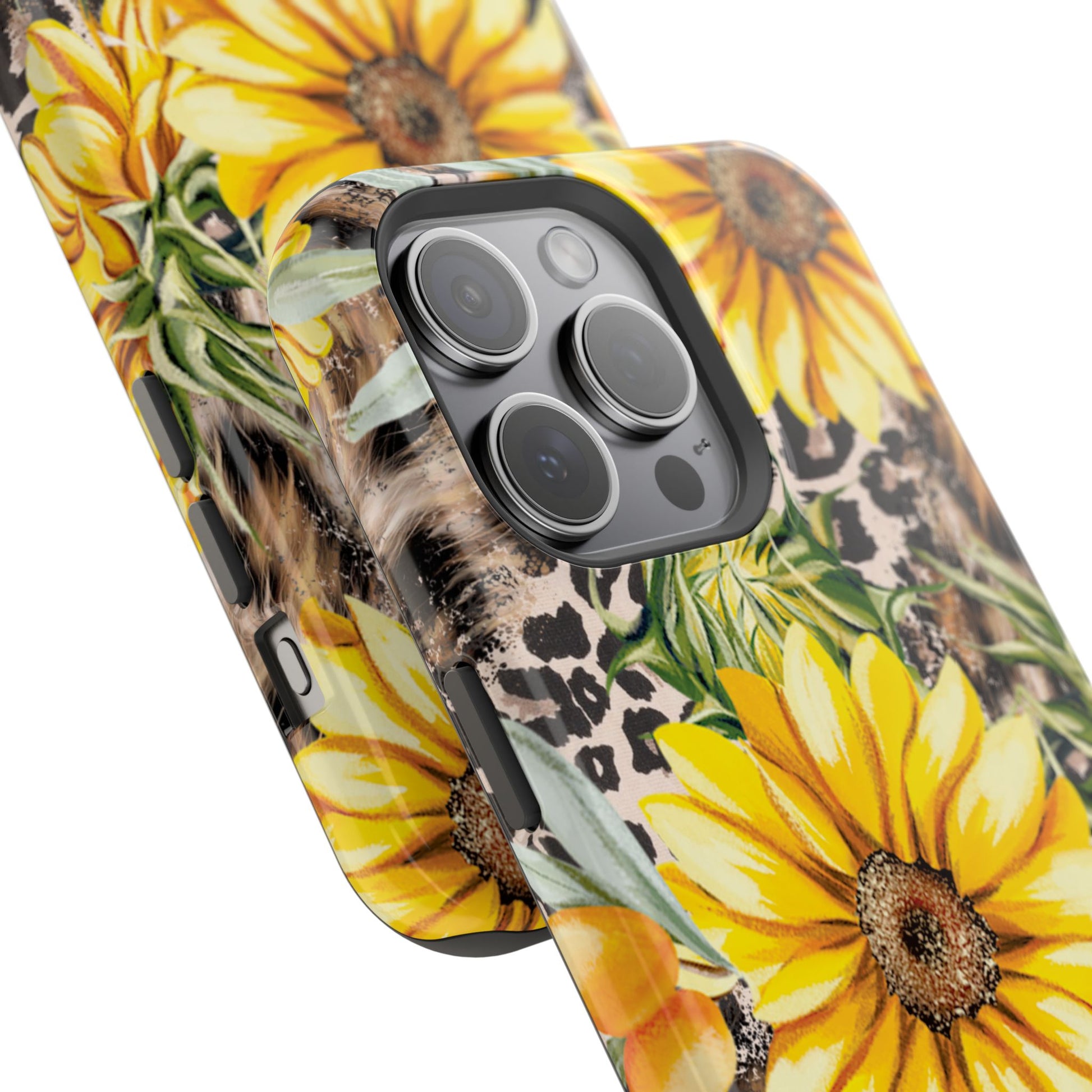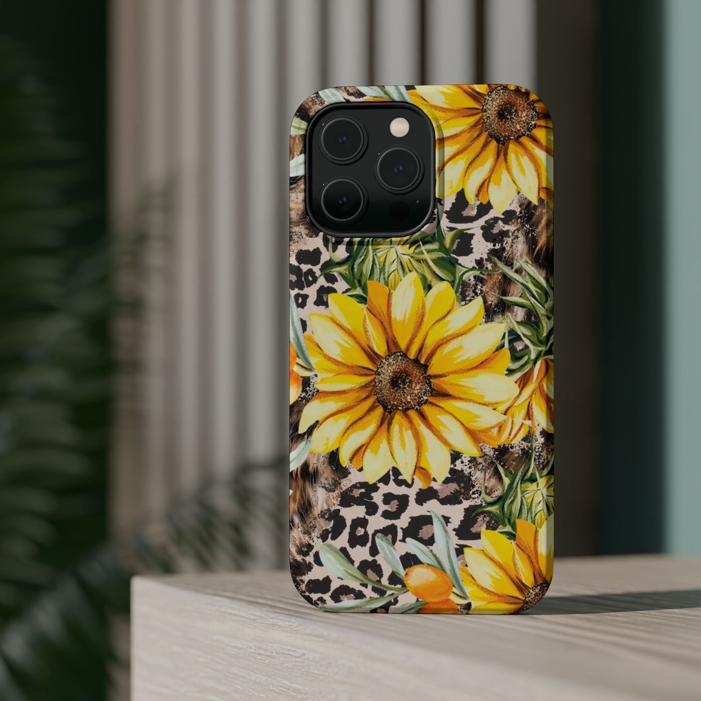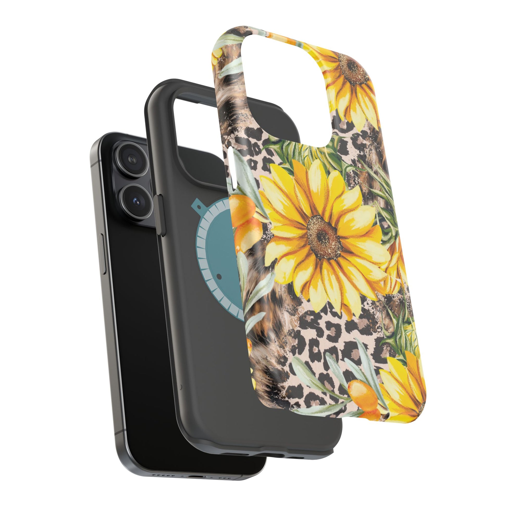 Unleash your wild side with this Leopard Sunflower Chic MagSafe iPhone Case! This fierce and fashionable design combines vibrant yellow sunflowers with trendy leopard print and soft, neutral undertones. Touches of foliage and orange berries add a natural accent to the bold animal print background, creating a perfect blend of rustic charm and modern glam. Built with a strong polycarbonate shell and shock-absorbing TPU liner, this case offers both style and reliable protection. A must-have for trendsetters who love a little bit of edge in their accessories!