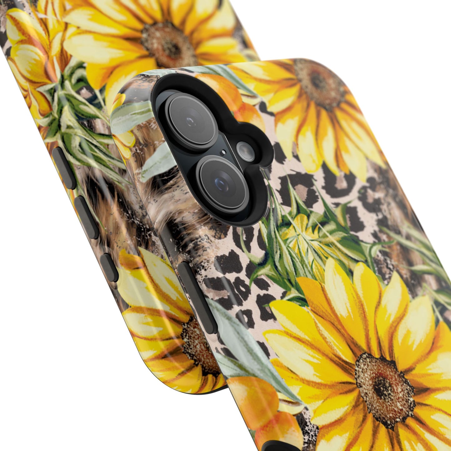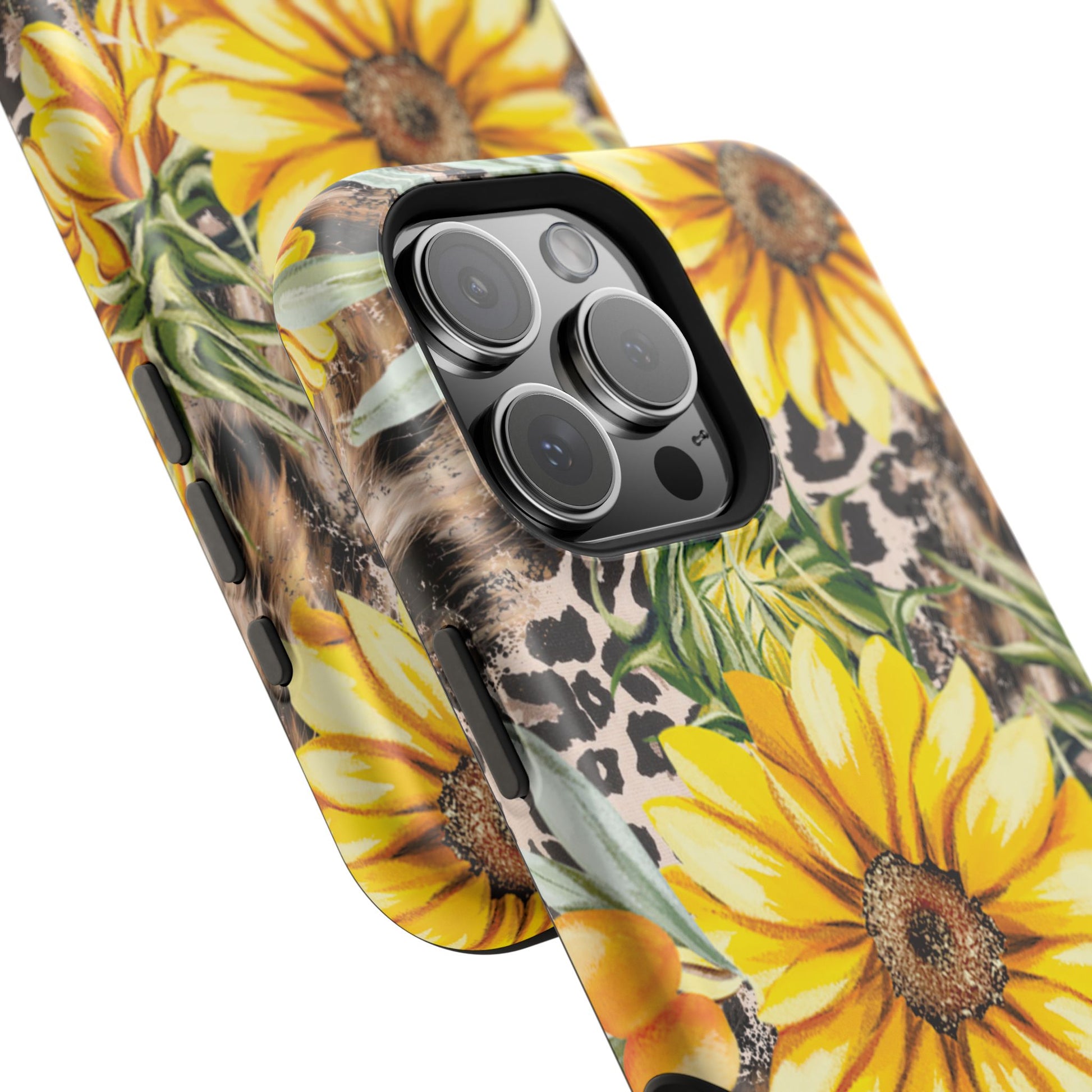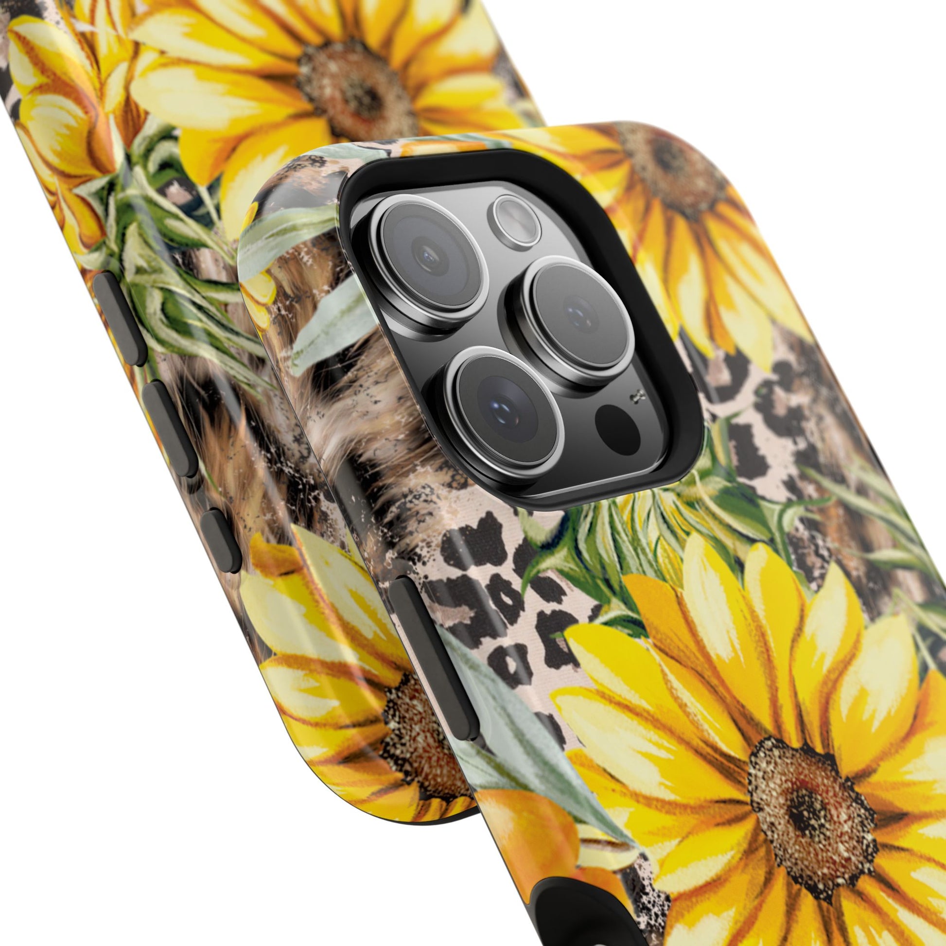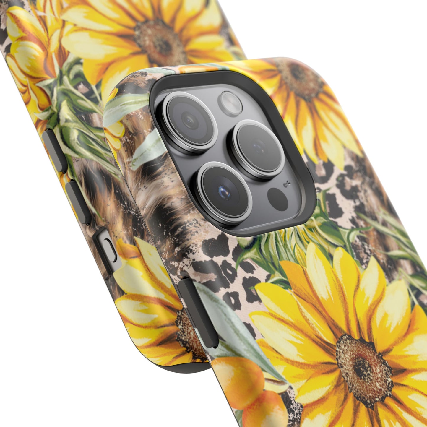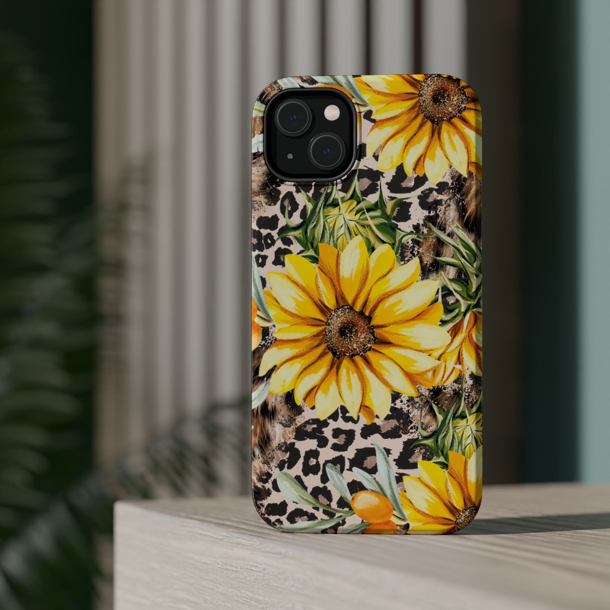 Unleash your wild side with this Leopard Sunflower Chic MagSafe iPhone Case! This fierce and fashionable design combines vibrant yellow sunflowers with trendy leopard print and soft, neutral undertones. Touches of foliage and orange berries add a natural accent to the bold animal print background, creating a perfect blend of rustic charm and modern glam. Built with a strong polycarbonate shell and shock-absorbing TPU liner, this case offers both style and reliable protection. A must-have for trendsetters who love a little bit of edge in their accessories!