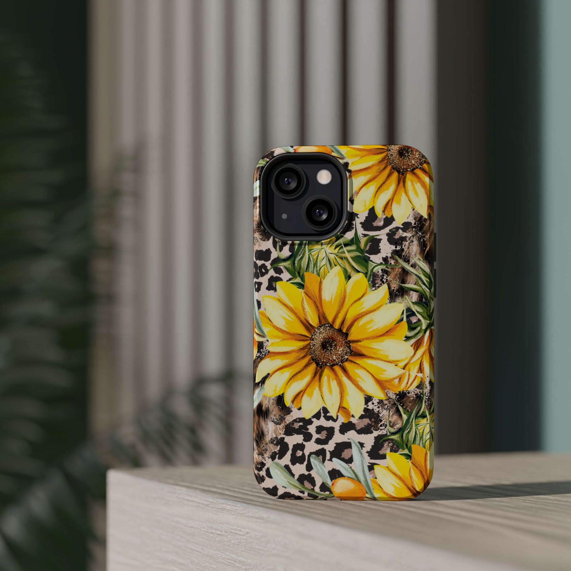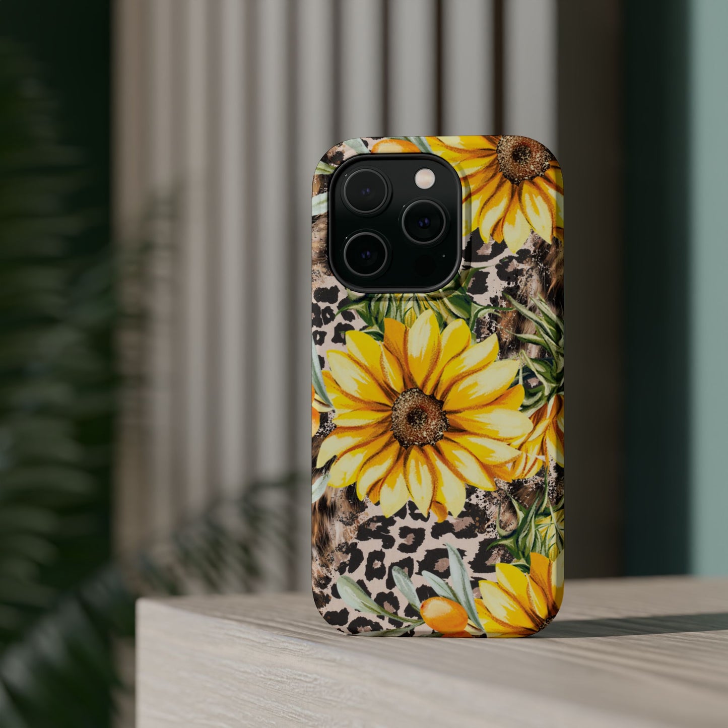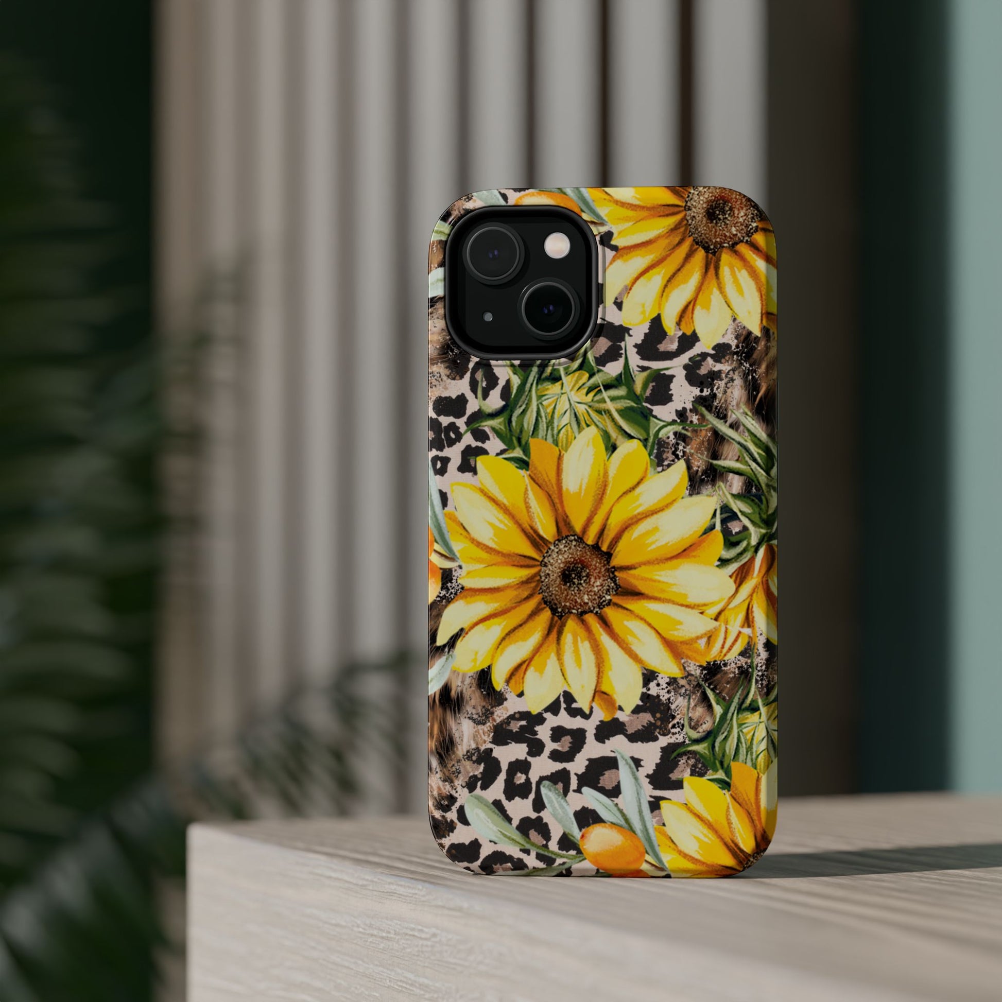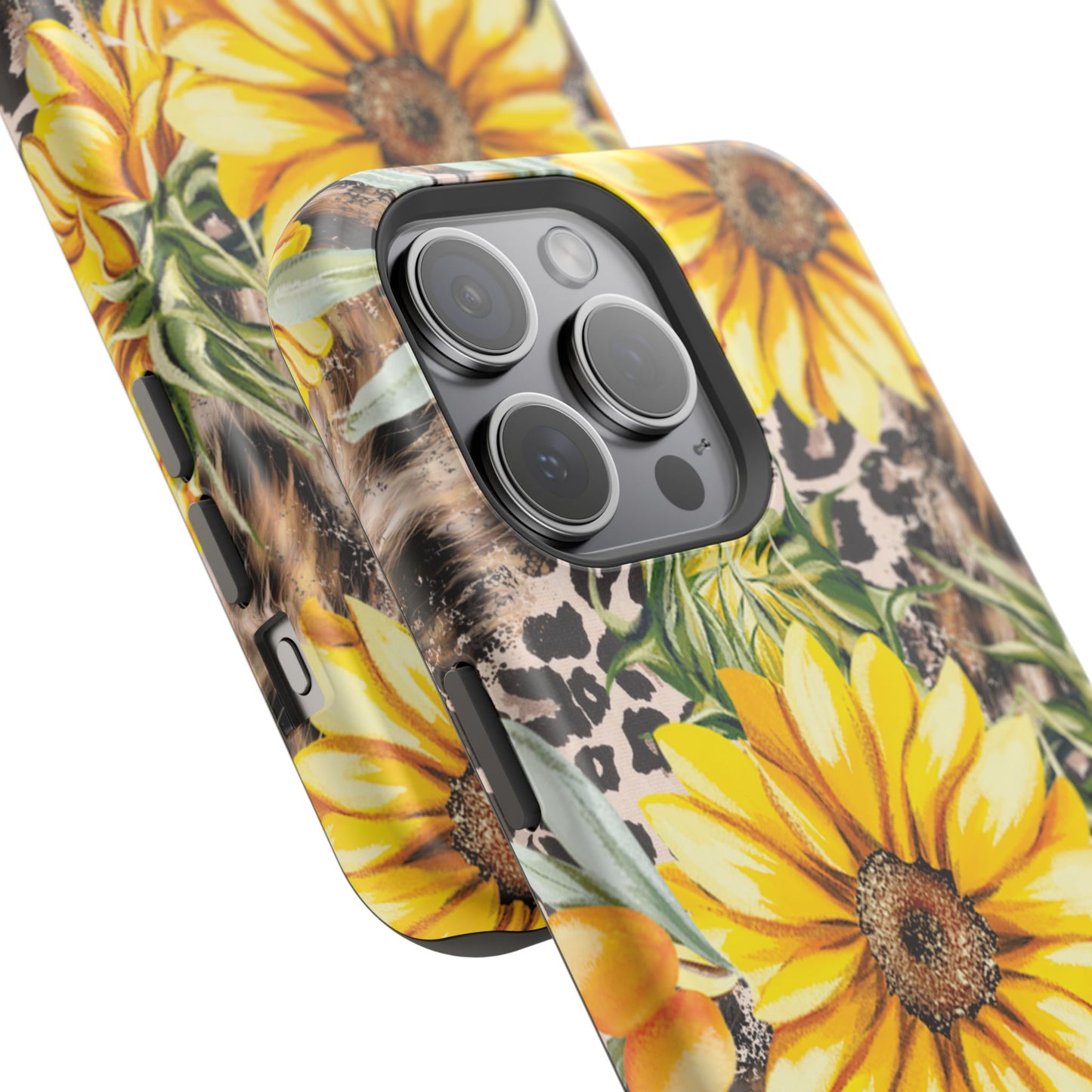 Unleash your wild side with this Leopard Sunflower Chic MagSafe iPhone Case! This fierce and fashionable design combines vibrant yellow sunflowers with trendy leopard print and soft, neutral undertones. Touches of foliage and orange berries add a natural accent to the bold animal print background, creating a perfect blend of rustic charm and modern glam. Built with a strong polycarbonate shell and shock-absorbing TPU liner, this case offers both style and reliable protection. A must-have for trendsetters who love a little bit of edge in their accessories!