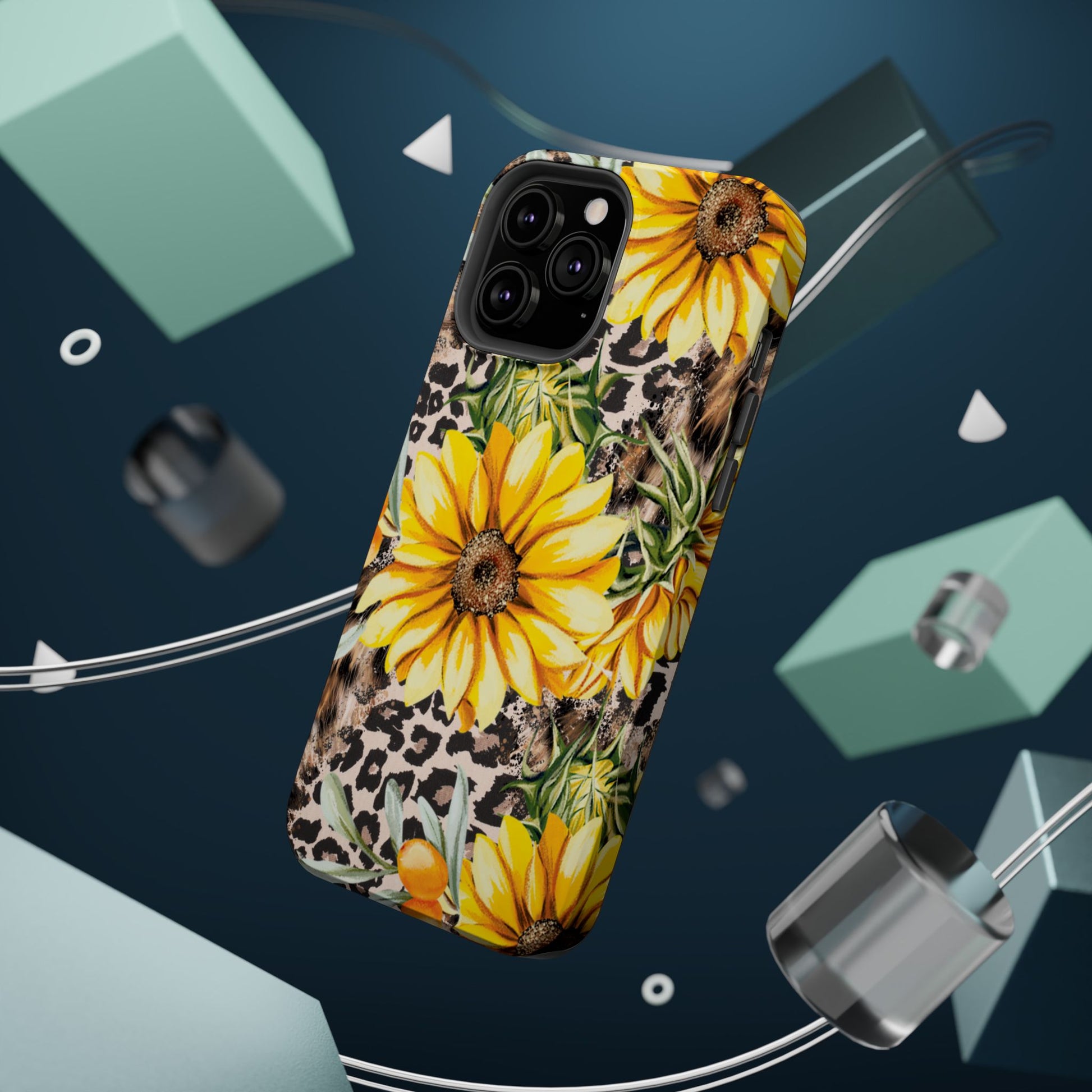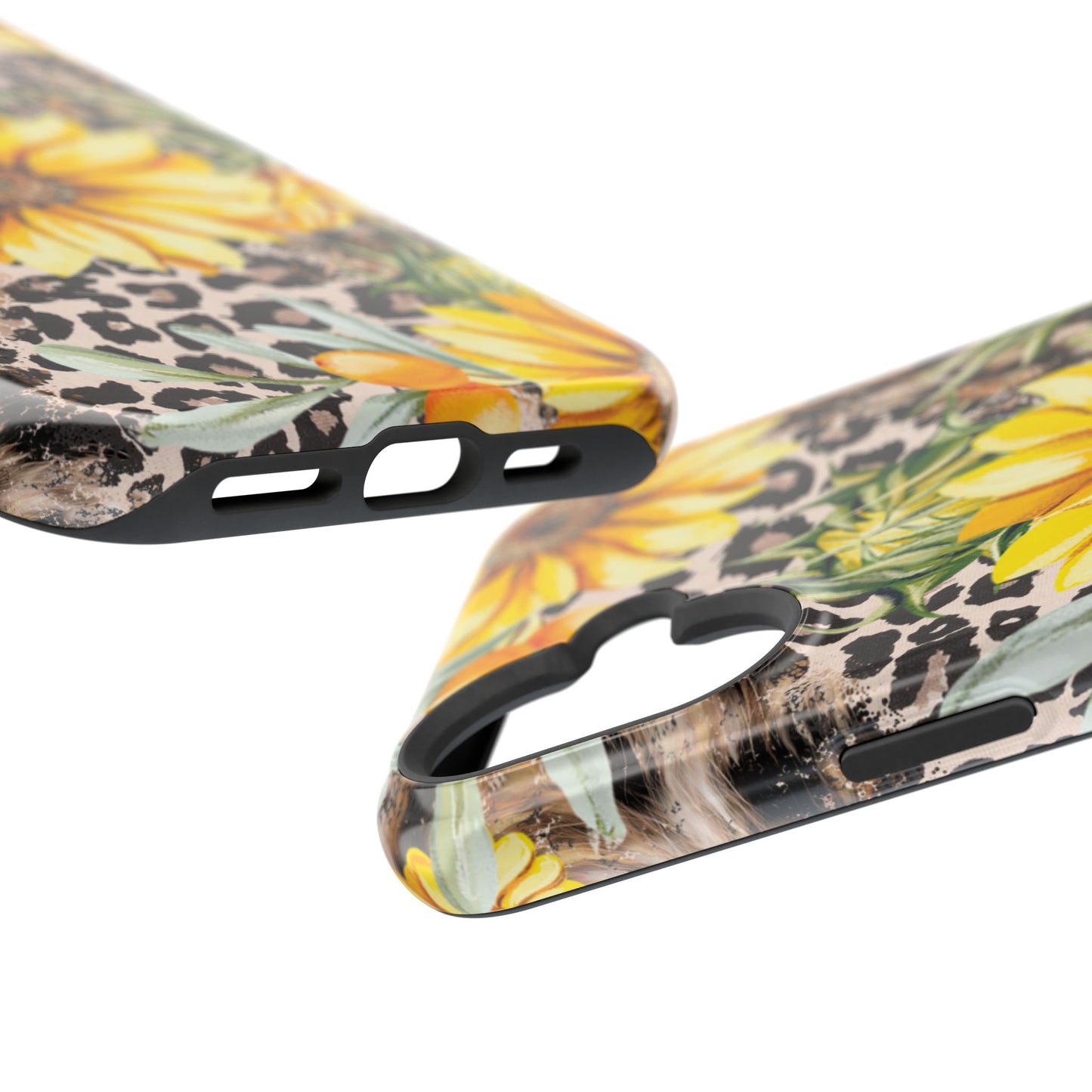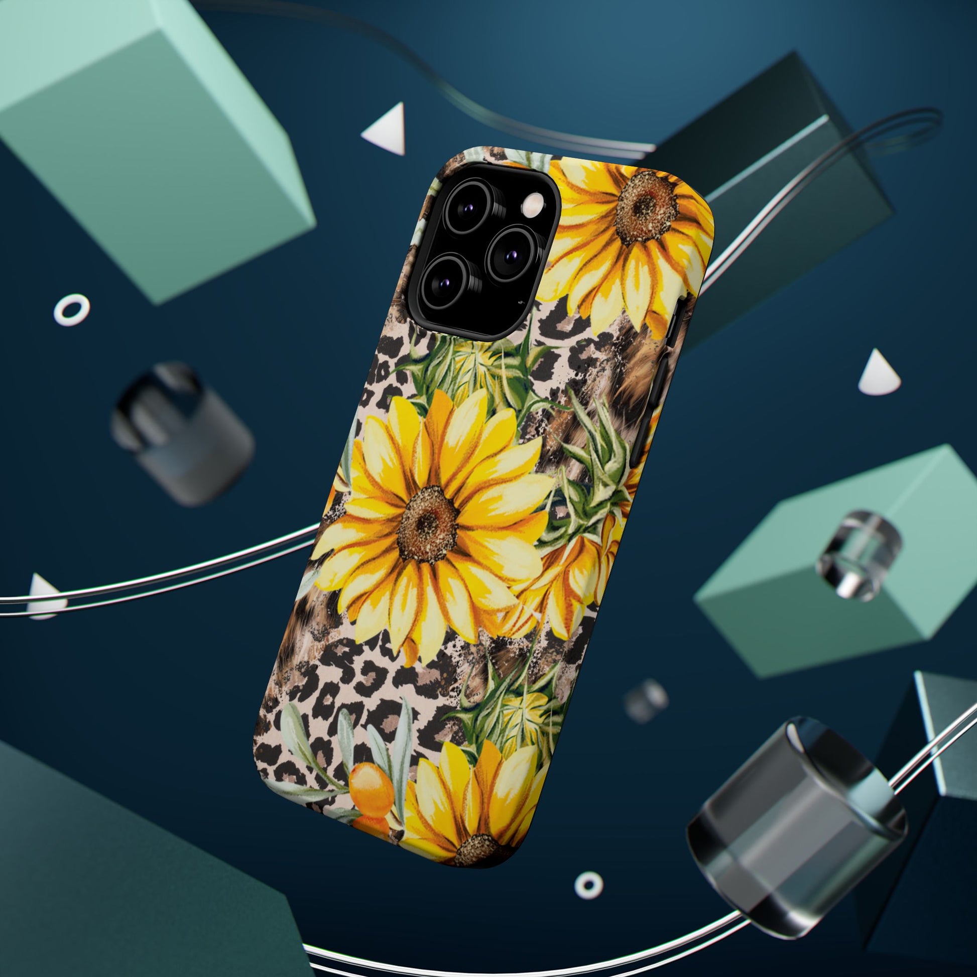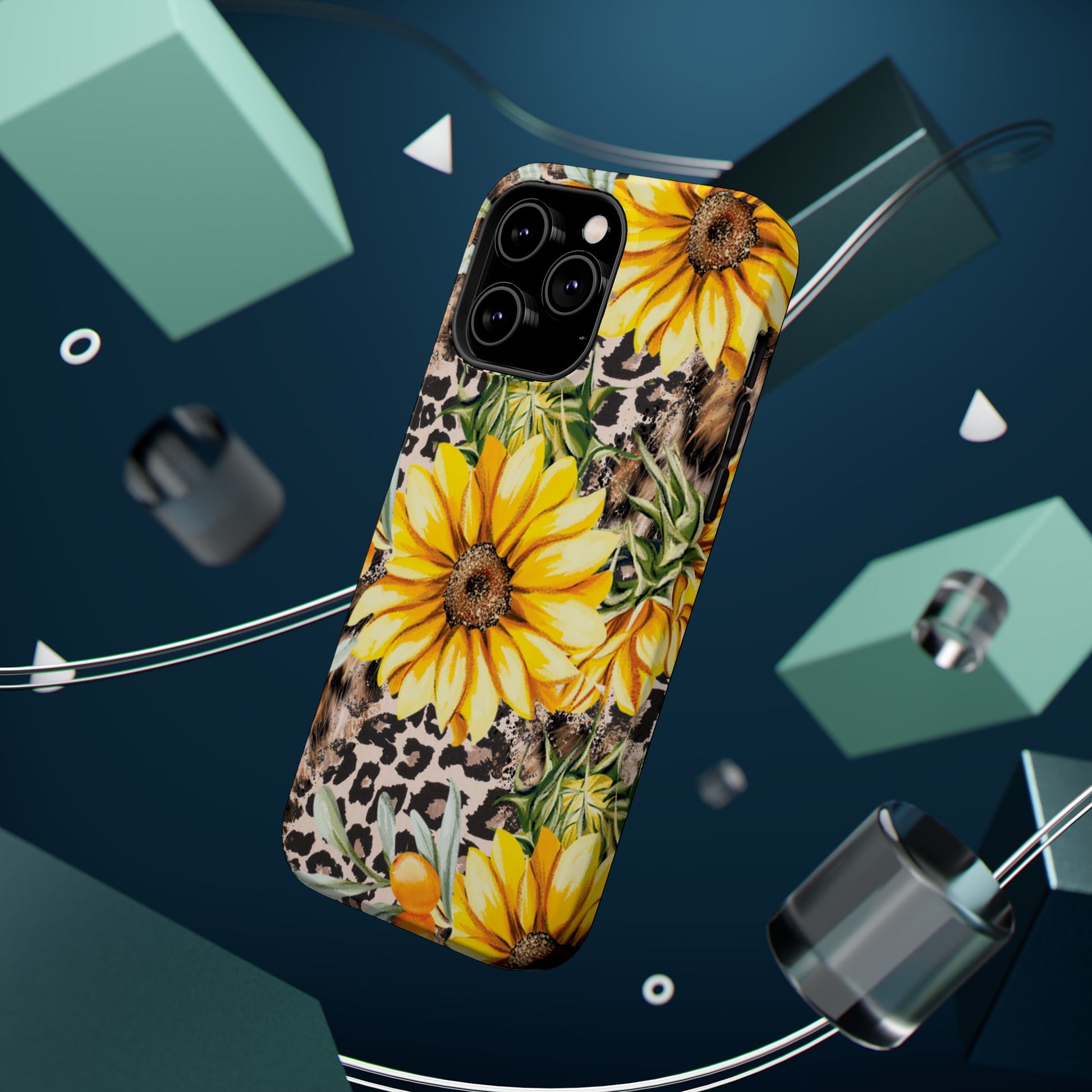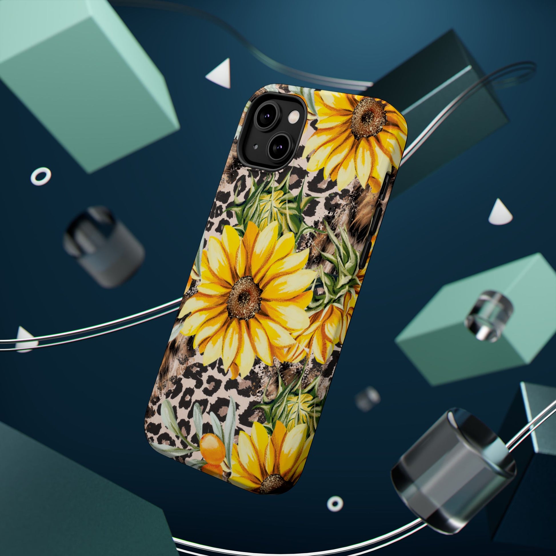 Unleash your wild side with this Leopard Sunflower Chic MagSafe iPhone Case! This fierce and fashionable design combines vibrant yellow sunflowers with trendy leopard print and soft, neutral undertones. Touches of foliage and orange berries add a natural accent to the bold animal print background, creating a perfect blend of rustic charm and modern glam. Built with a strong polycarbonate shell and shock-absorbing TPU liner, this case offers both style and reliable protection. A must-have for trendsetters who love a little bit of edge in their accessories!