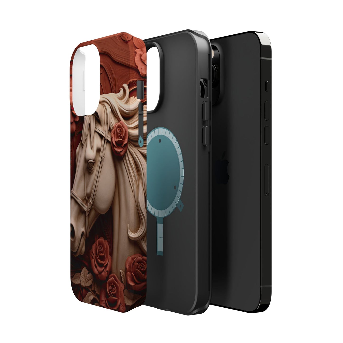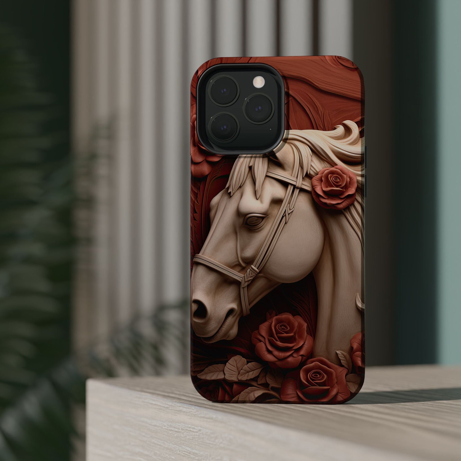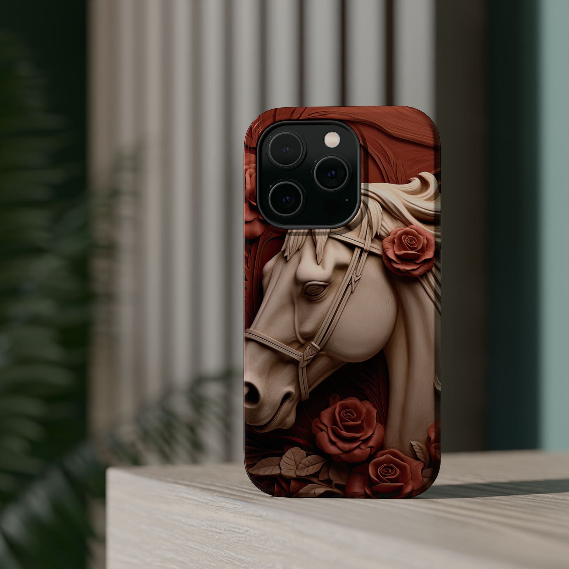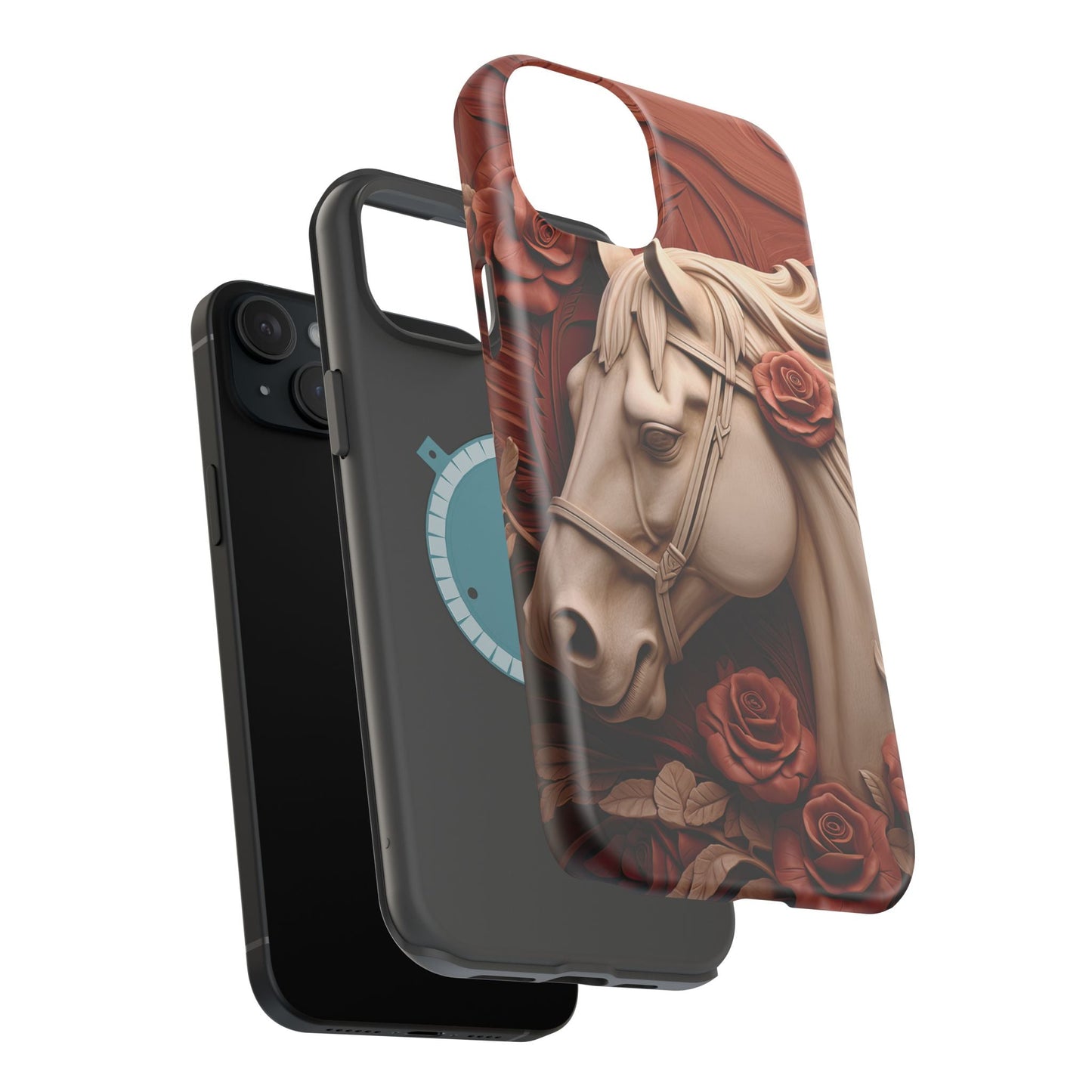 Embrace elegance with our Noble Horse MagSafe iPhone Case! This captivating design features a sculpted horse's head adorned with delicate roses, set against a rich, textured background. It's a timeless piece that adds a touch of sophistication to your phone.