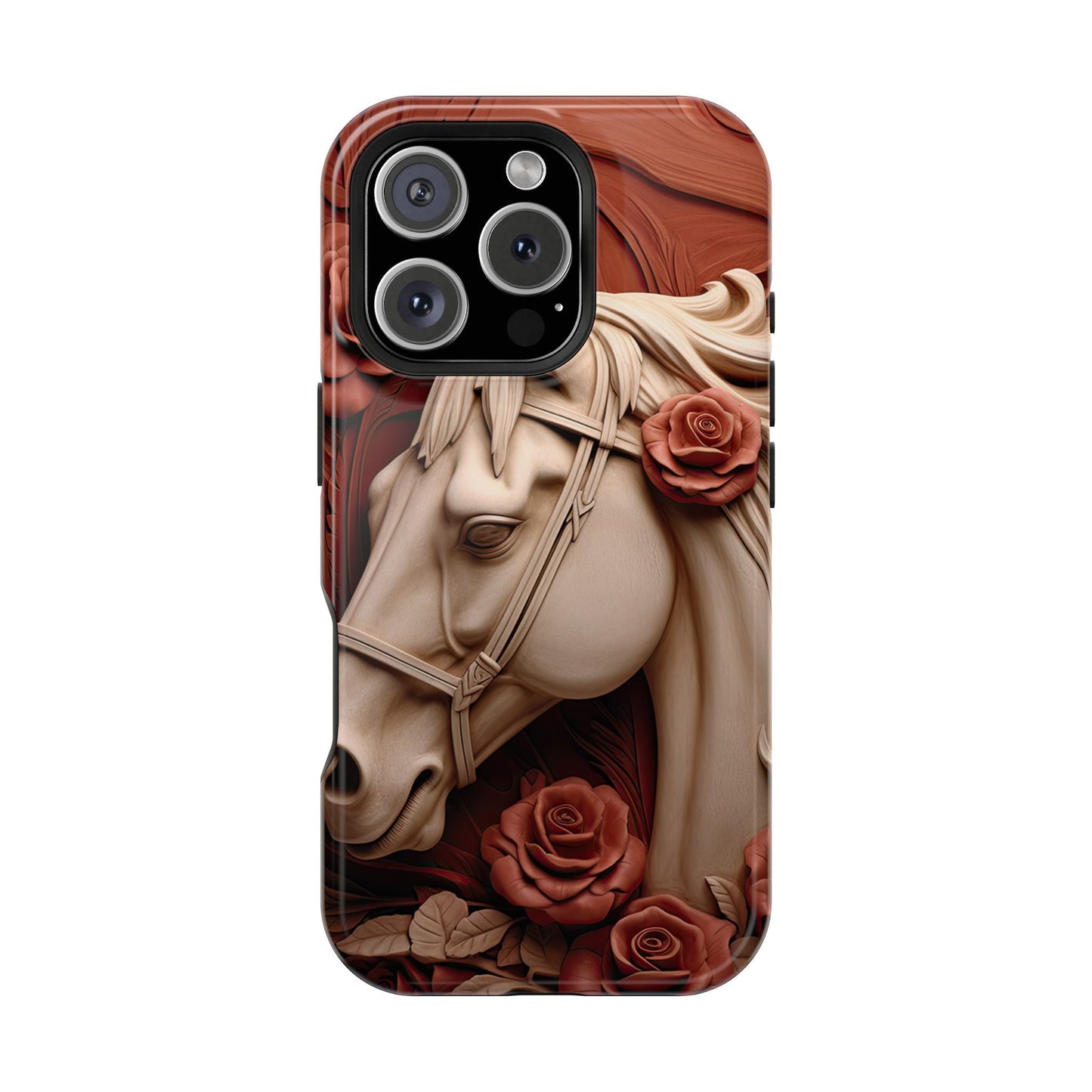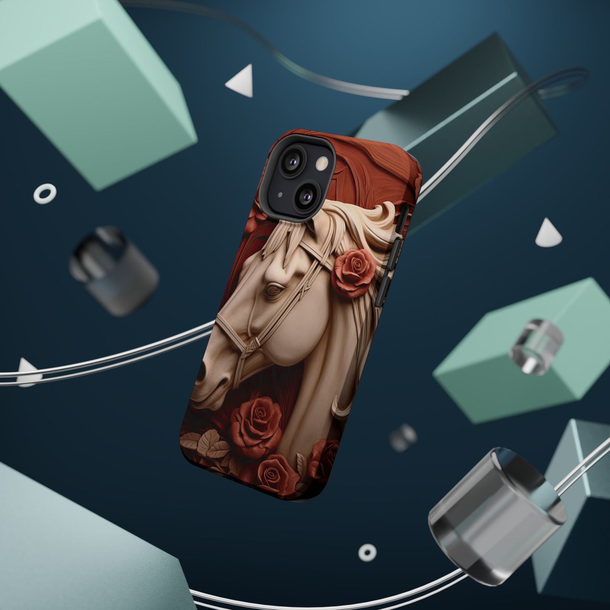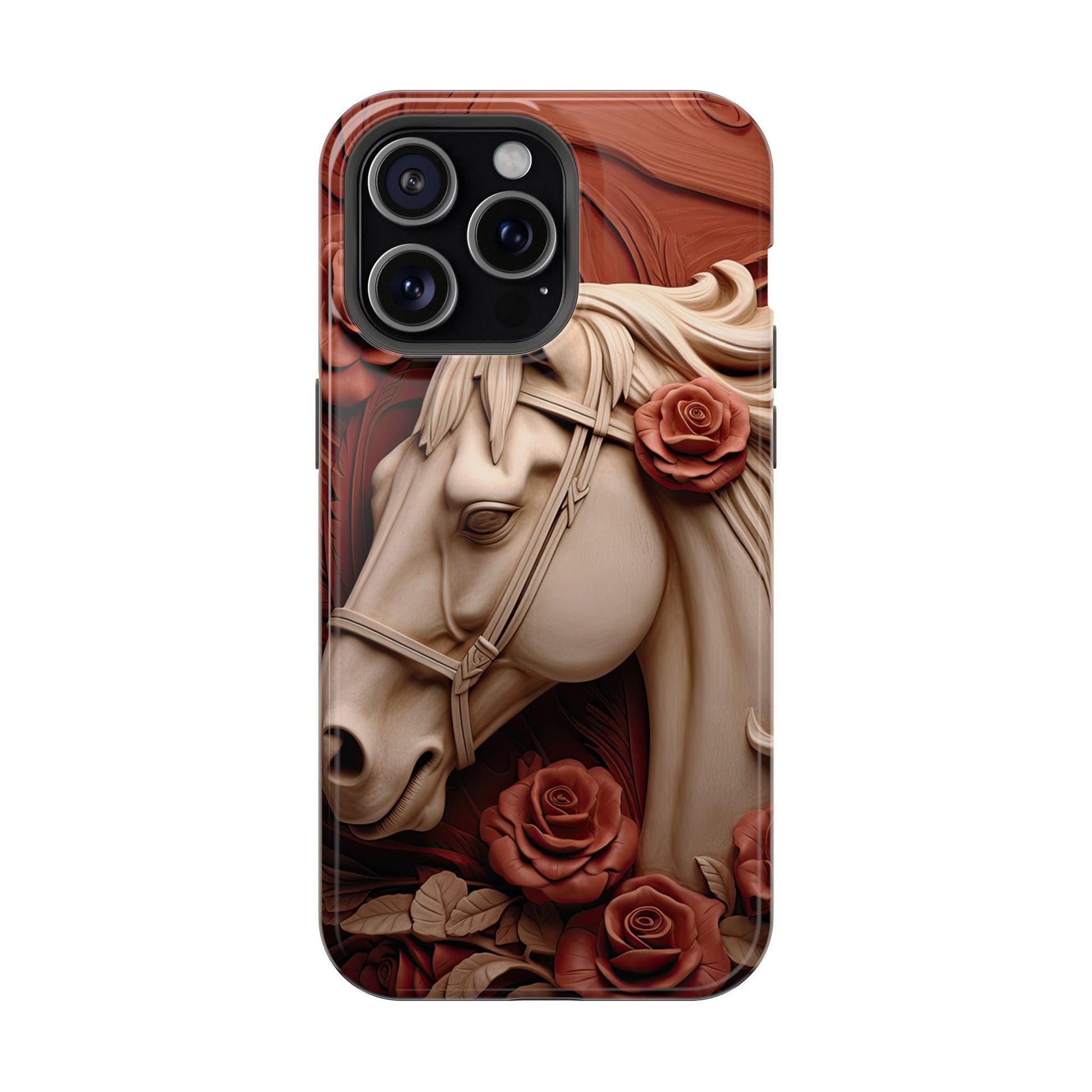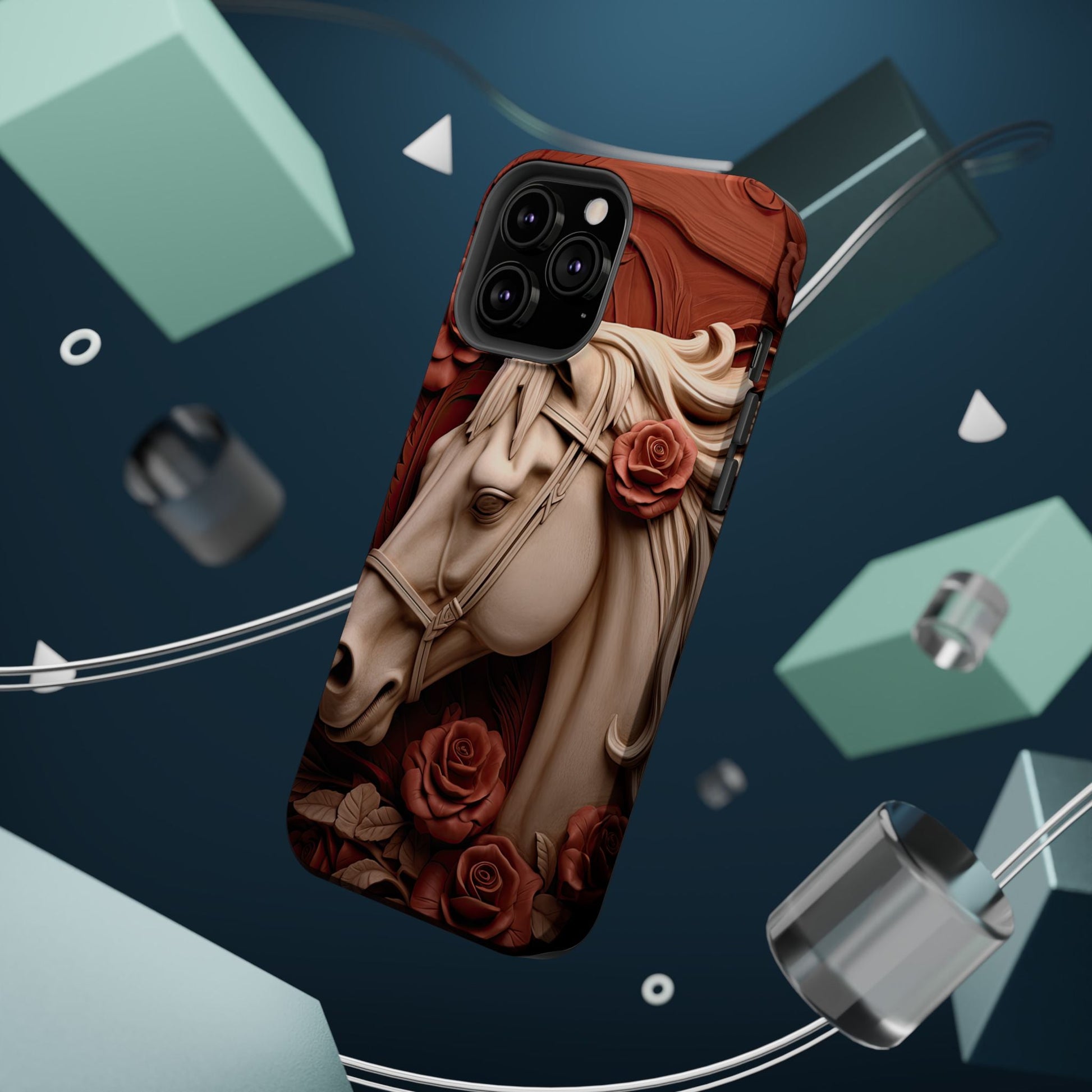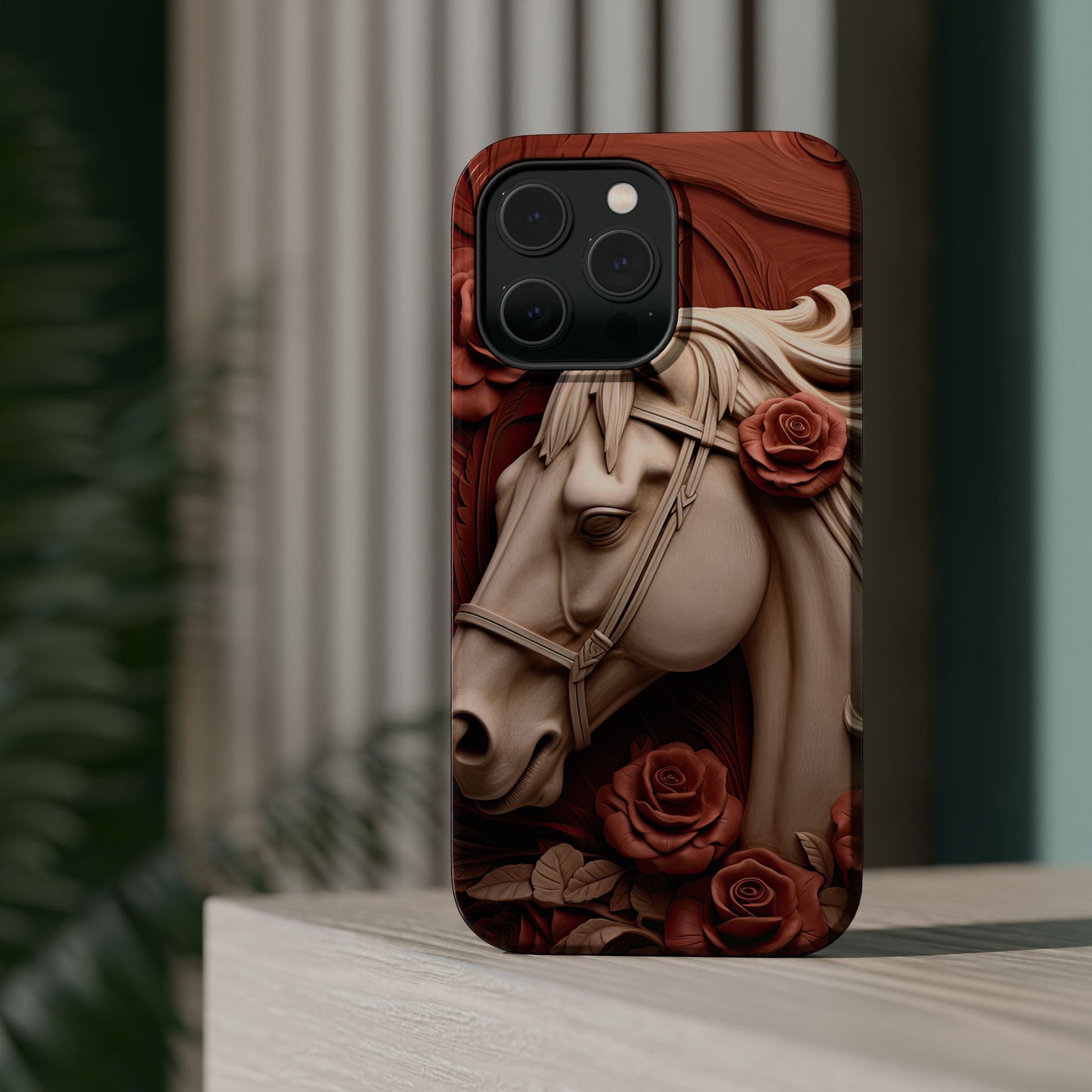 Embrace elegance with our Noble Horse MagSafe iPhone Case! This captivating design features a sculpted horse's head adorned with delicate roses, set against a rich, textured background. It's a timeless piece that adds a touch of sophistication to your phone.