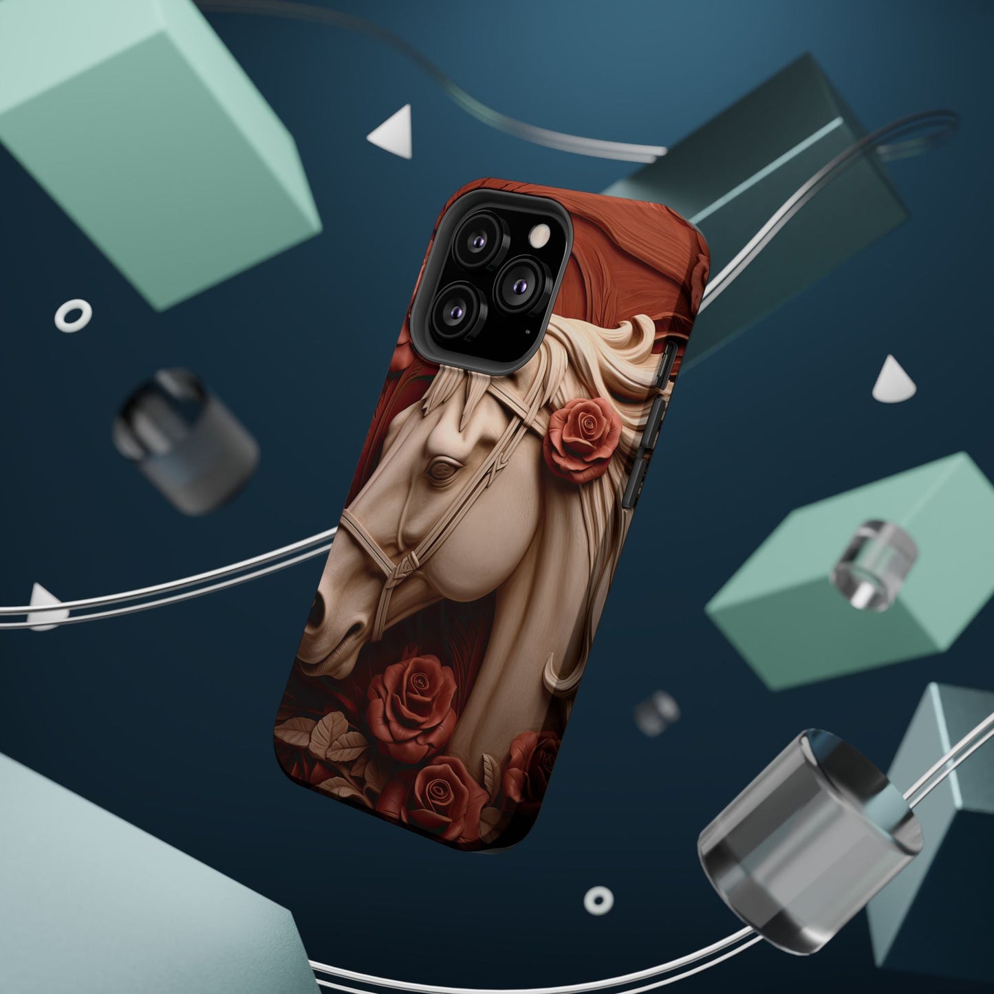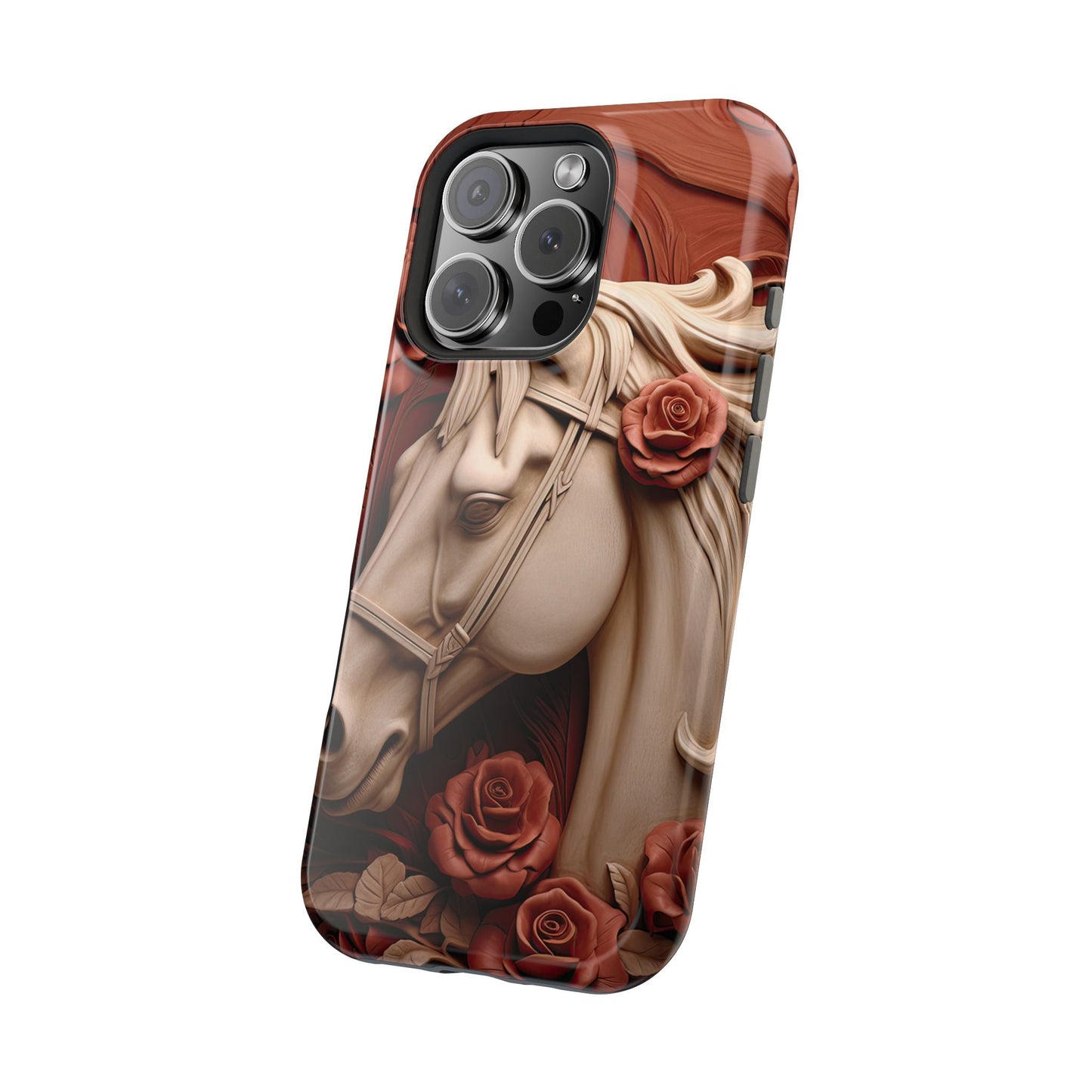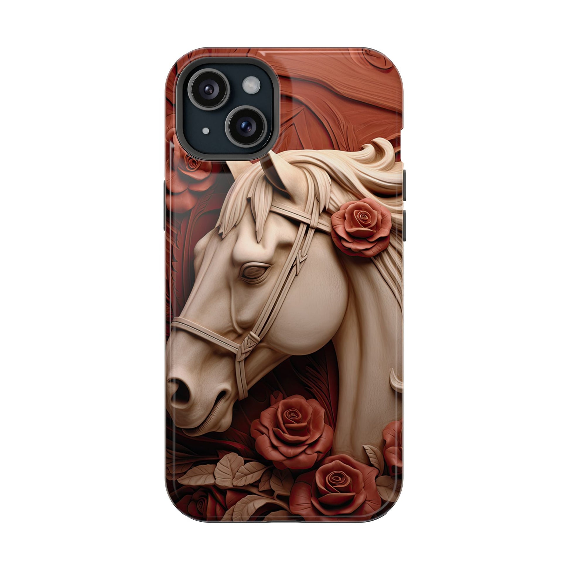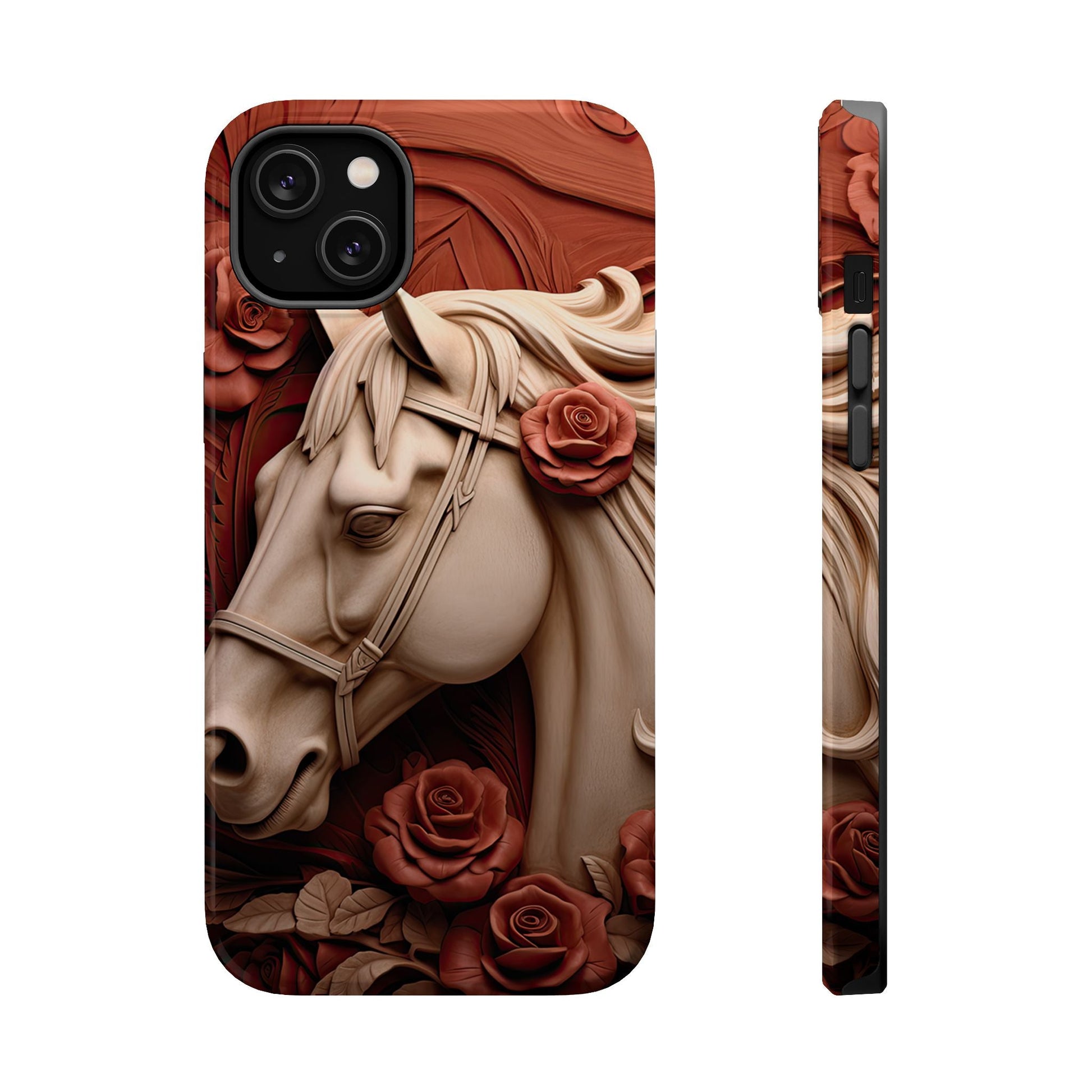 Embrace elegance with our Noble Horse MagSafe iPhone Case! This captivating design features a sculpted horse's head adorned with delicate roses, set against a rich, textured background. It's a timeless piece that adds a touch of sophistication to your phone.