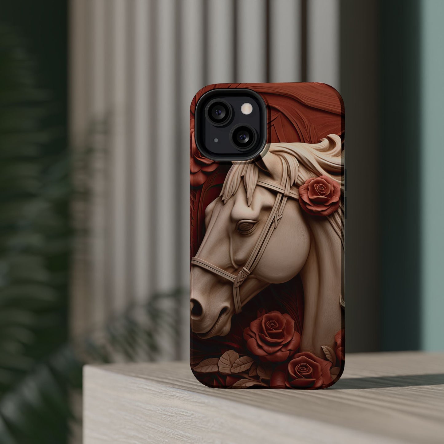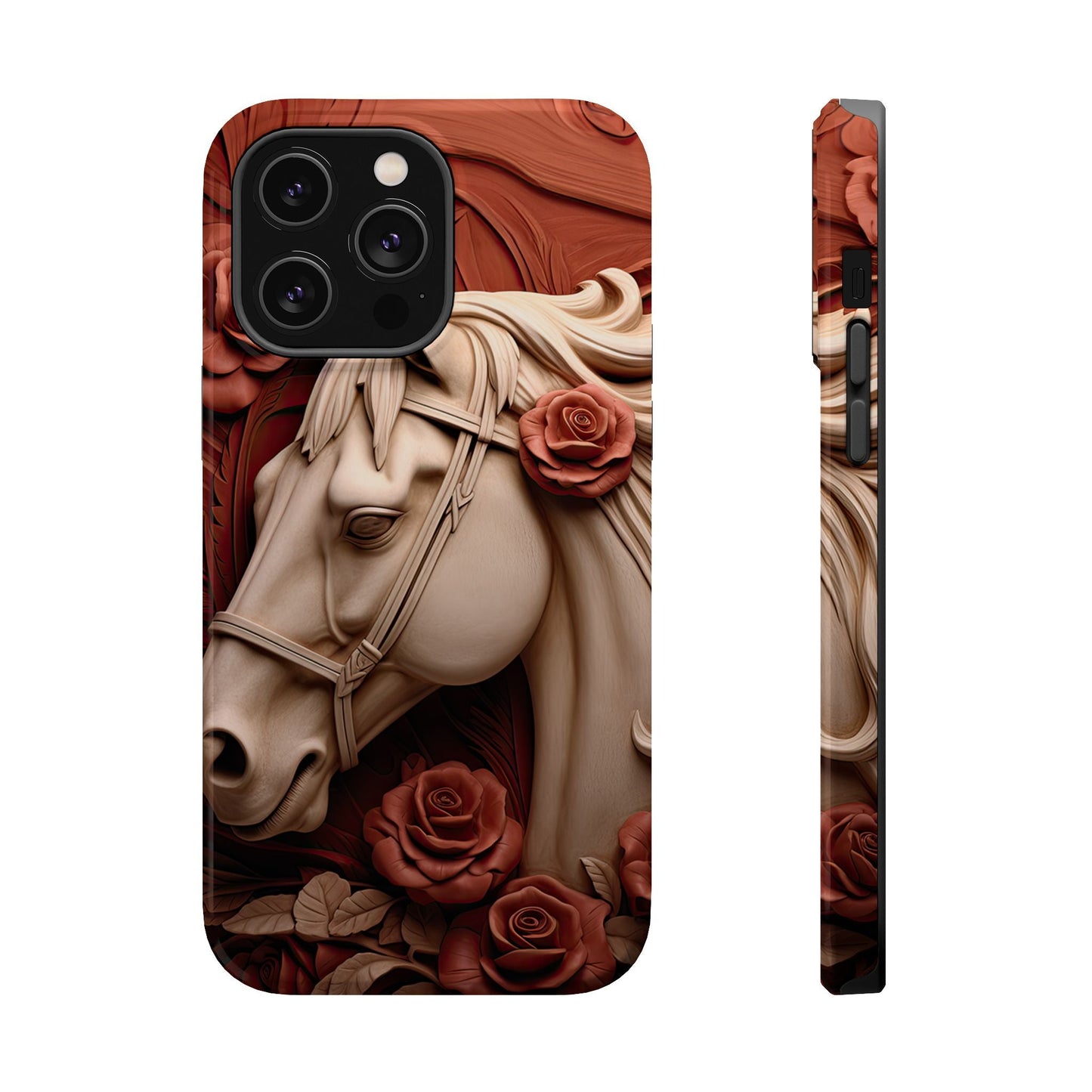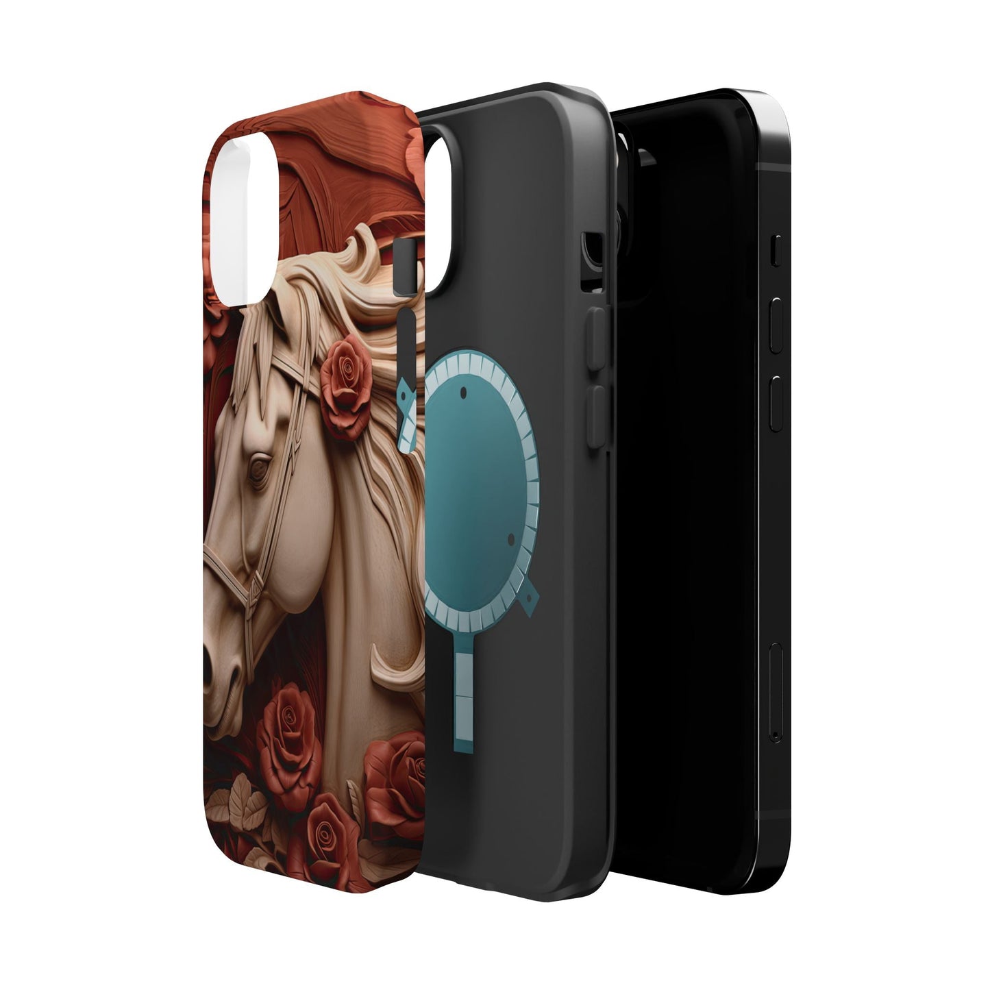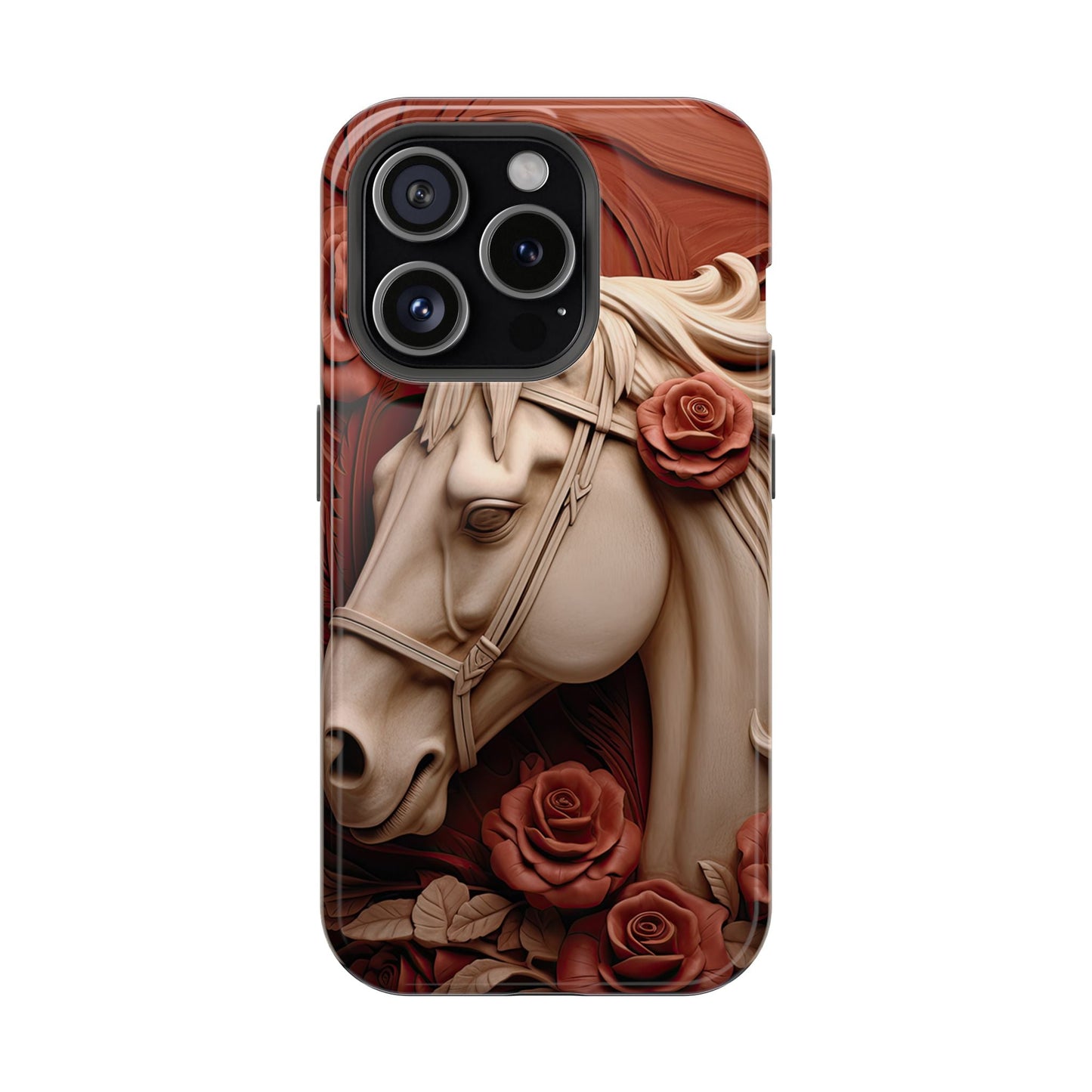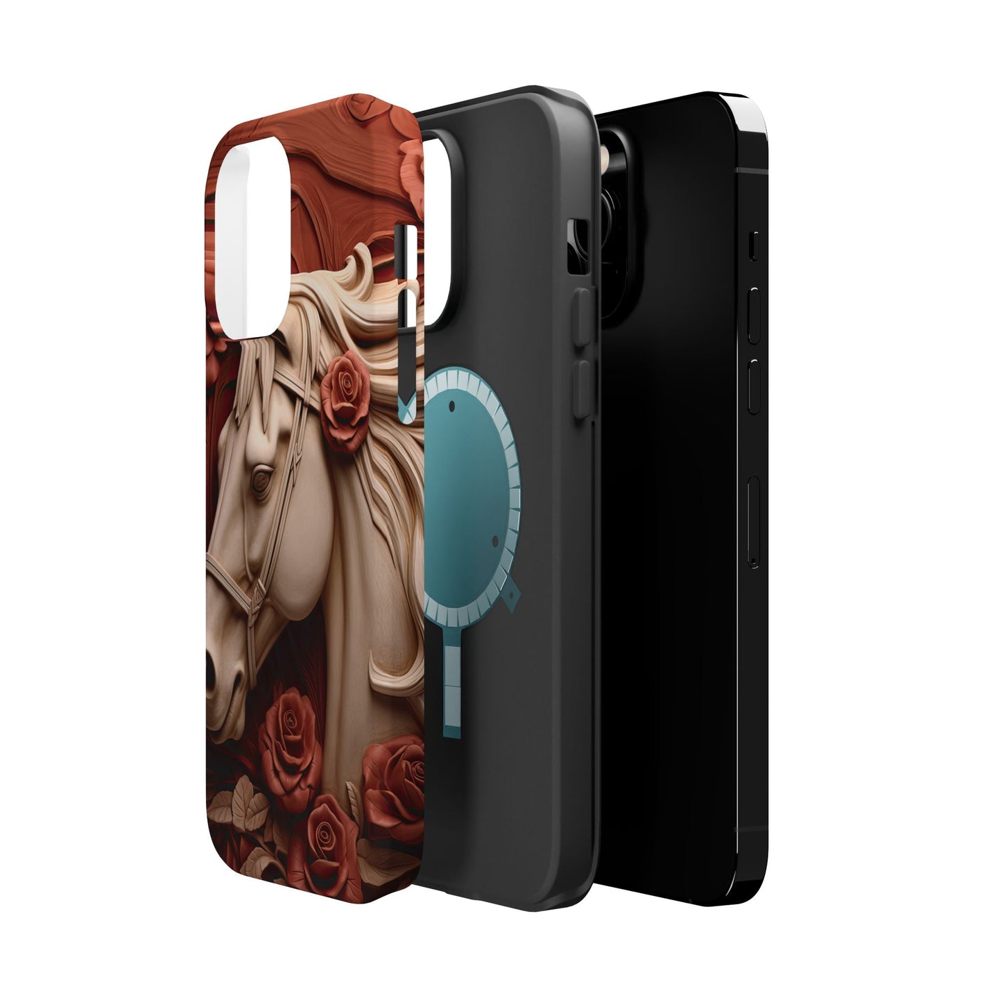 Embrace elegance with our Noble Horse MagSafe iPhone Case! This captivating design features a sculpted horse's head adorned with delicate roses, set against a rich, textured background. It's a timeless piece that adds a touch of sophistication to your phone.