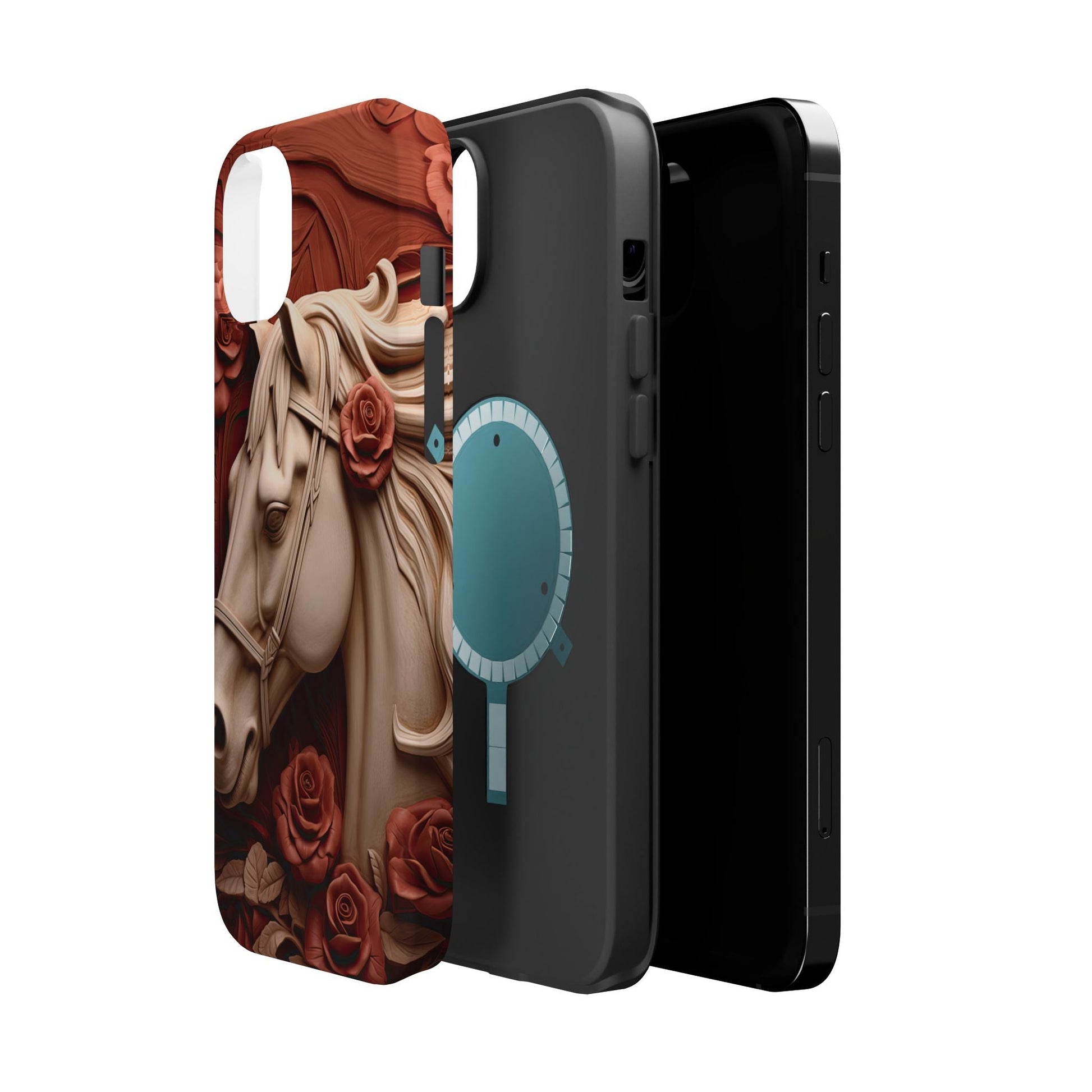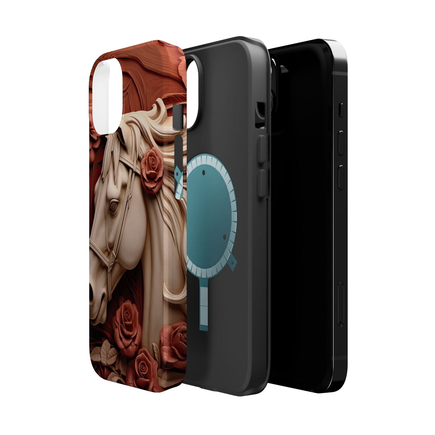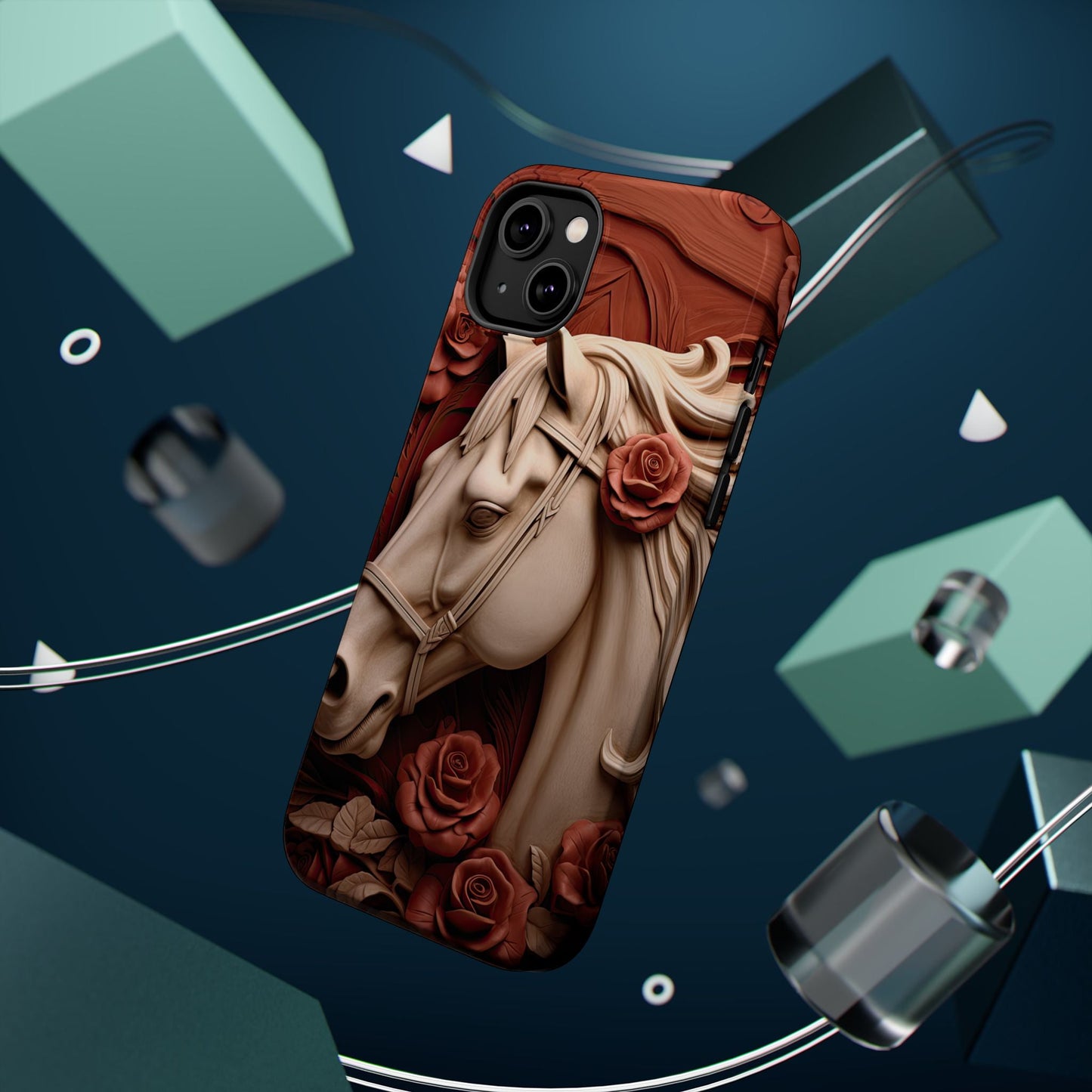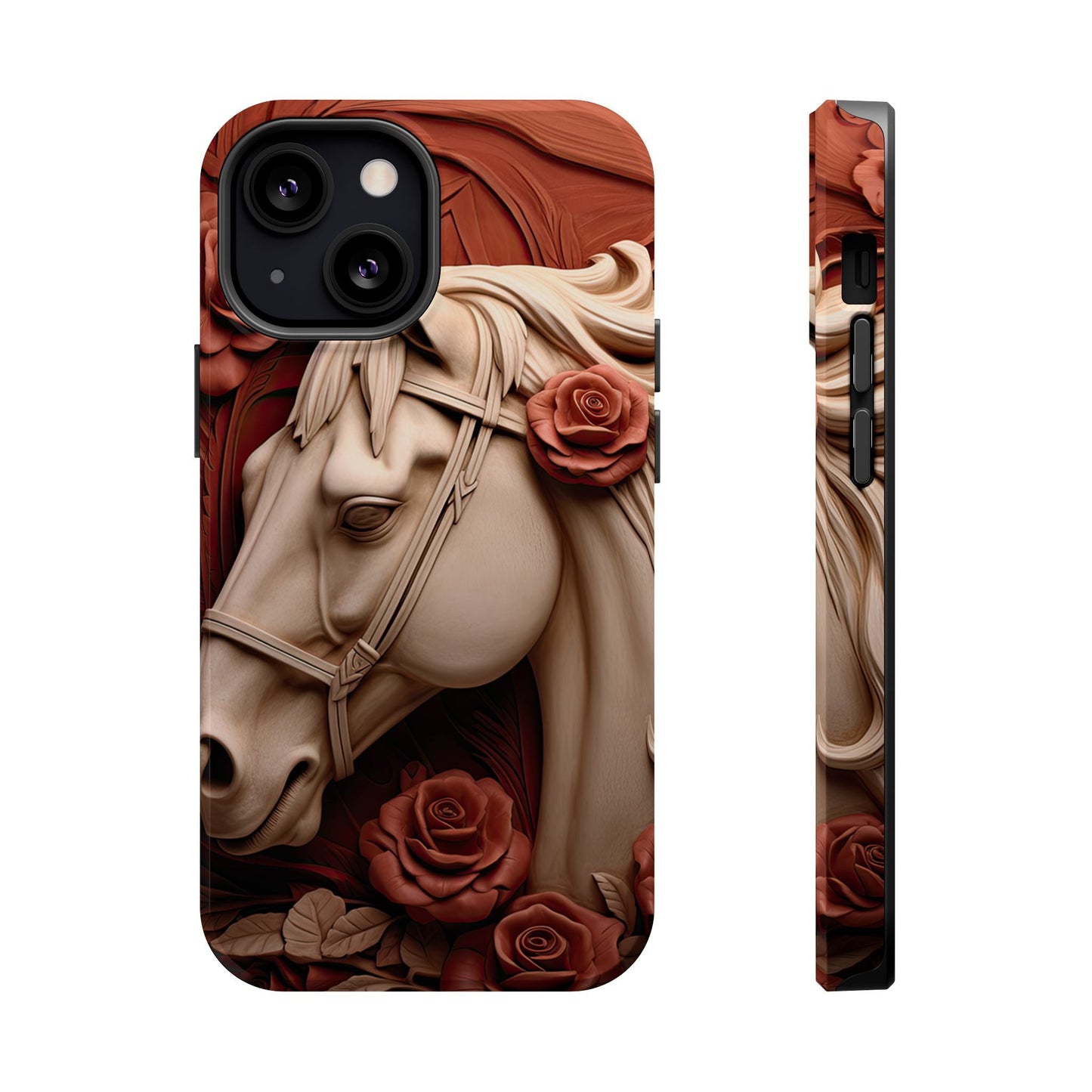 Embrace elegance with our Noble Horse MagSafe iPhone Case! This captivating design features a sculpted horse's head adorned with delicate roses, set against a rich, textured background. It's a timeless piece that adds a touch of sophistication to your phone.