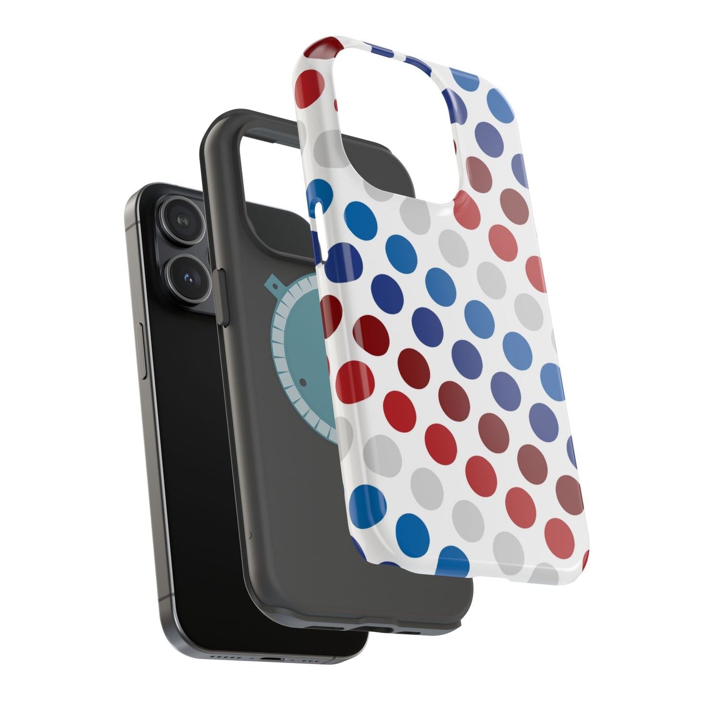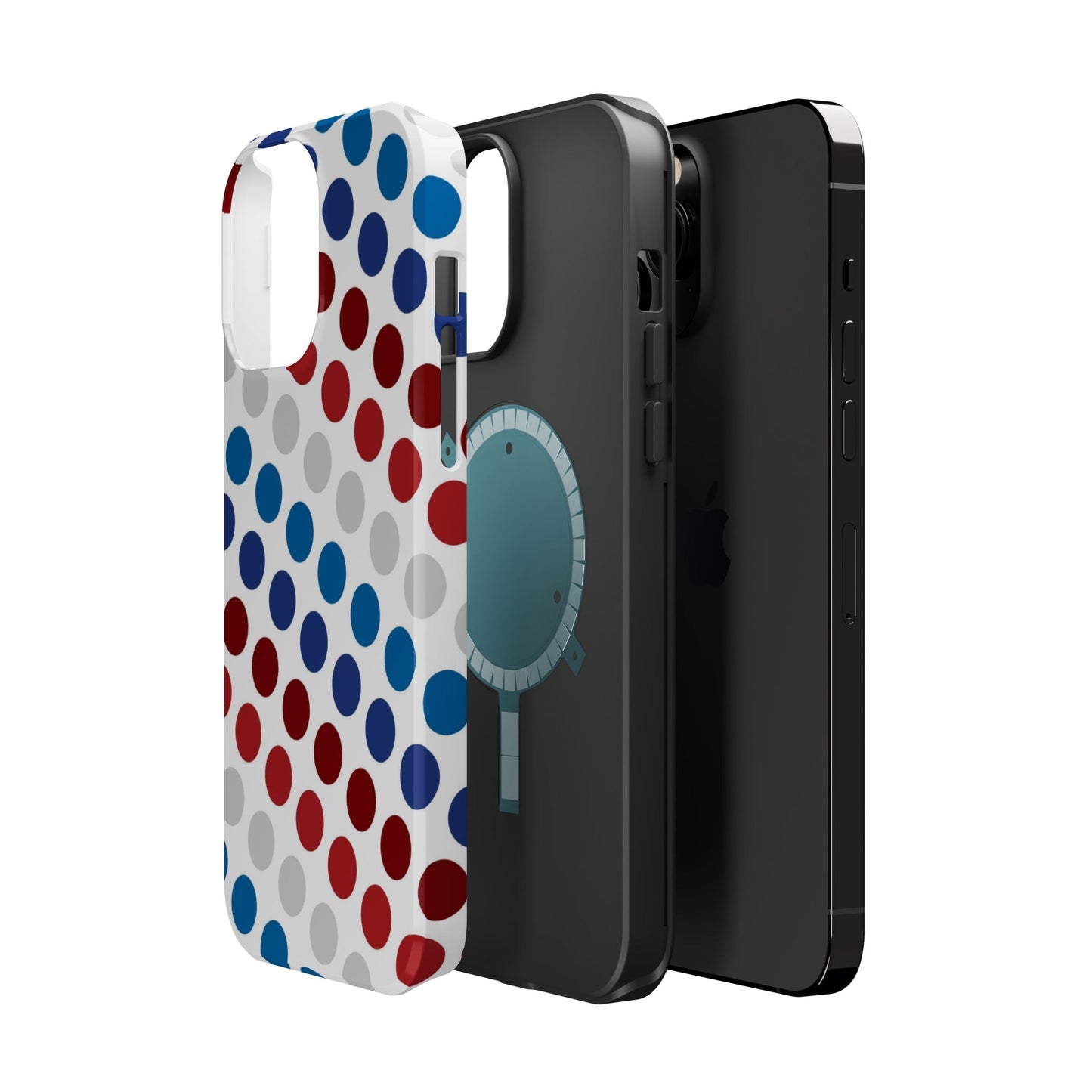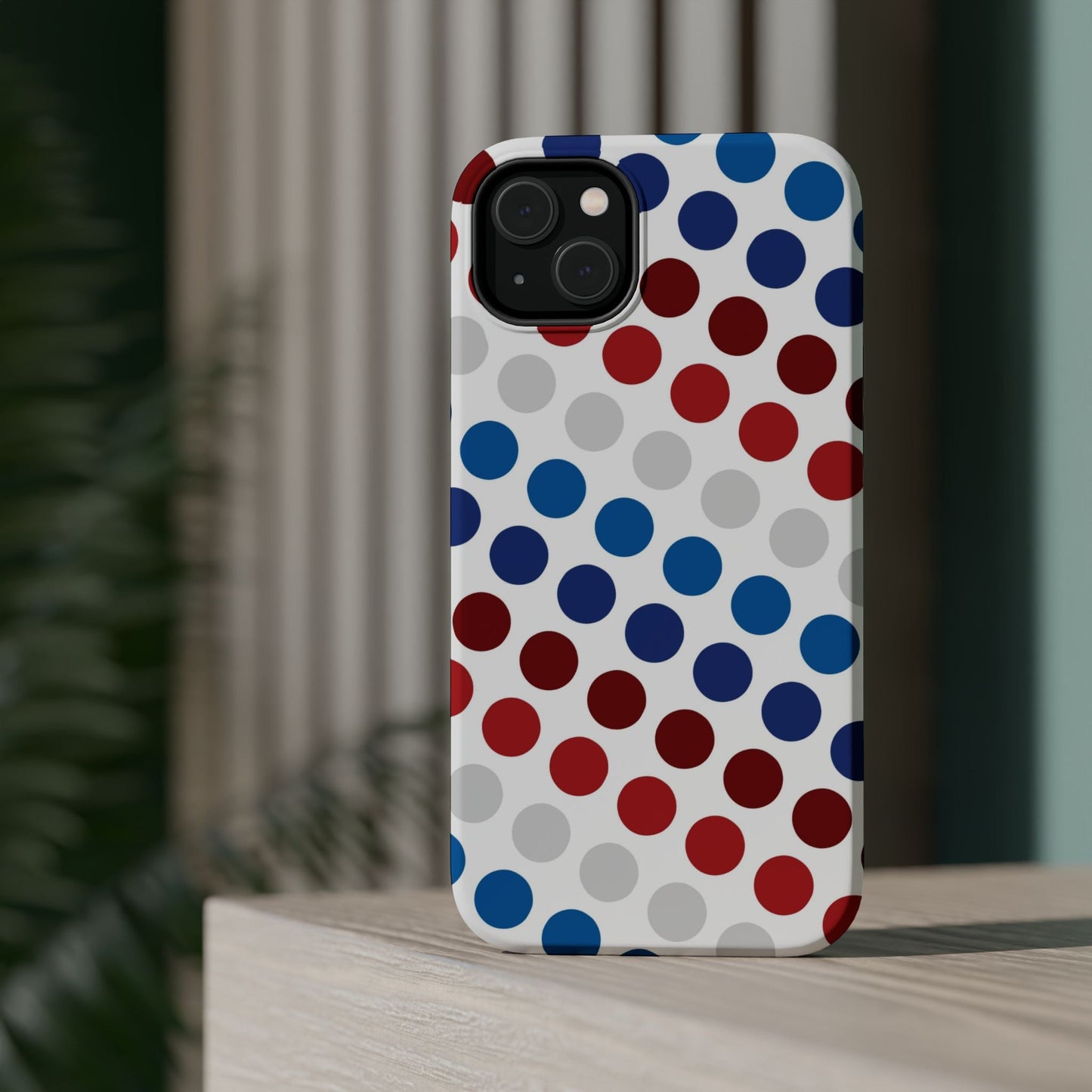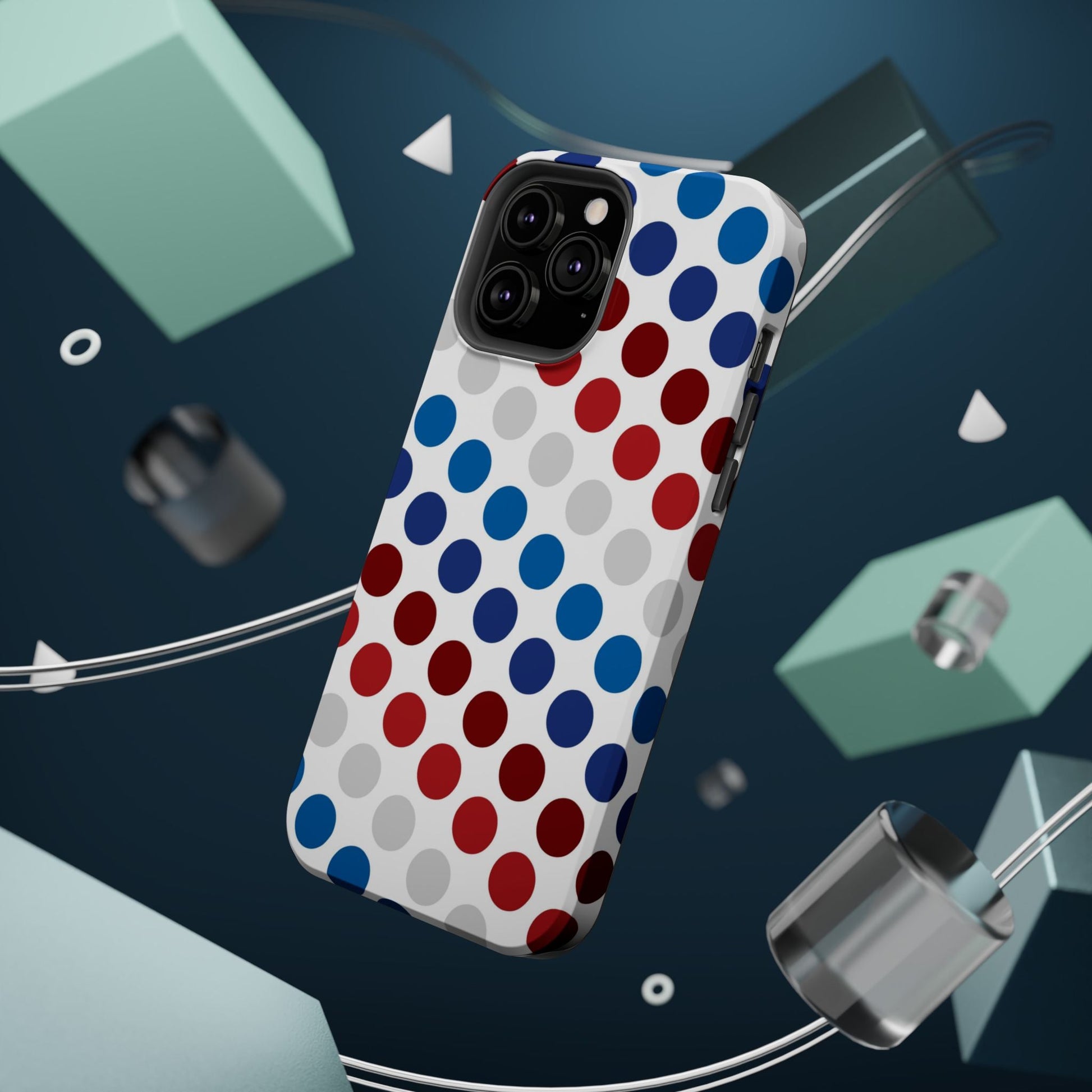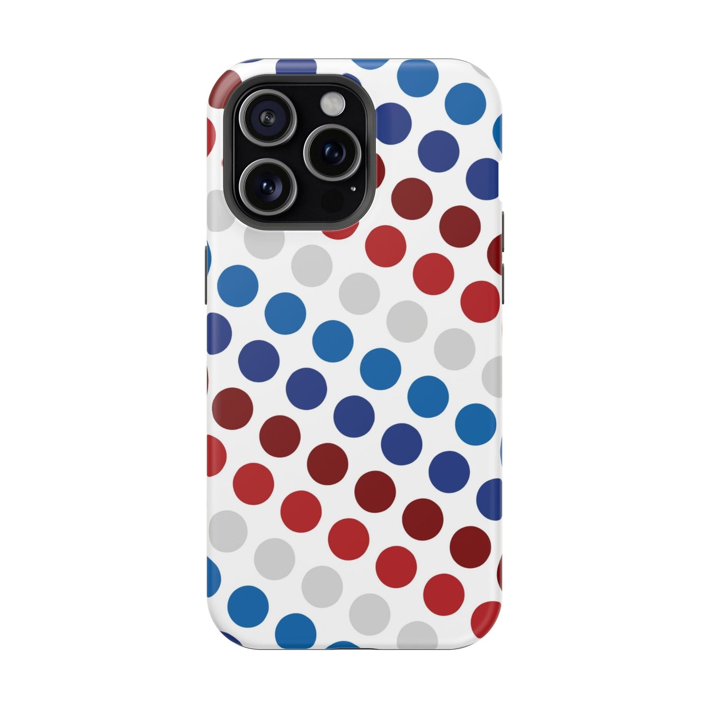 Description: Add charm and convenience to your iPhone with the Patriotic Polka Dots MagSafe case. This stylish design features a lively red, blue, and gray polka dot pattern on a crisp white background, making it a fun yet practical choice.