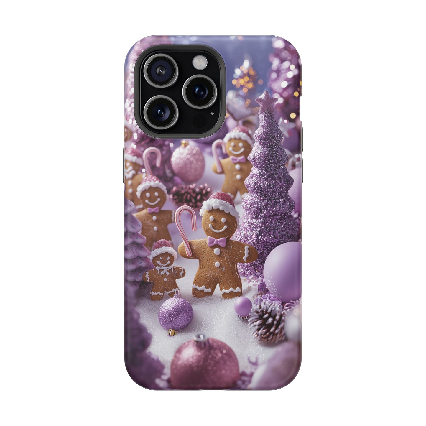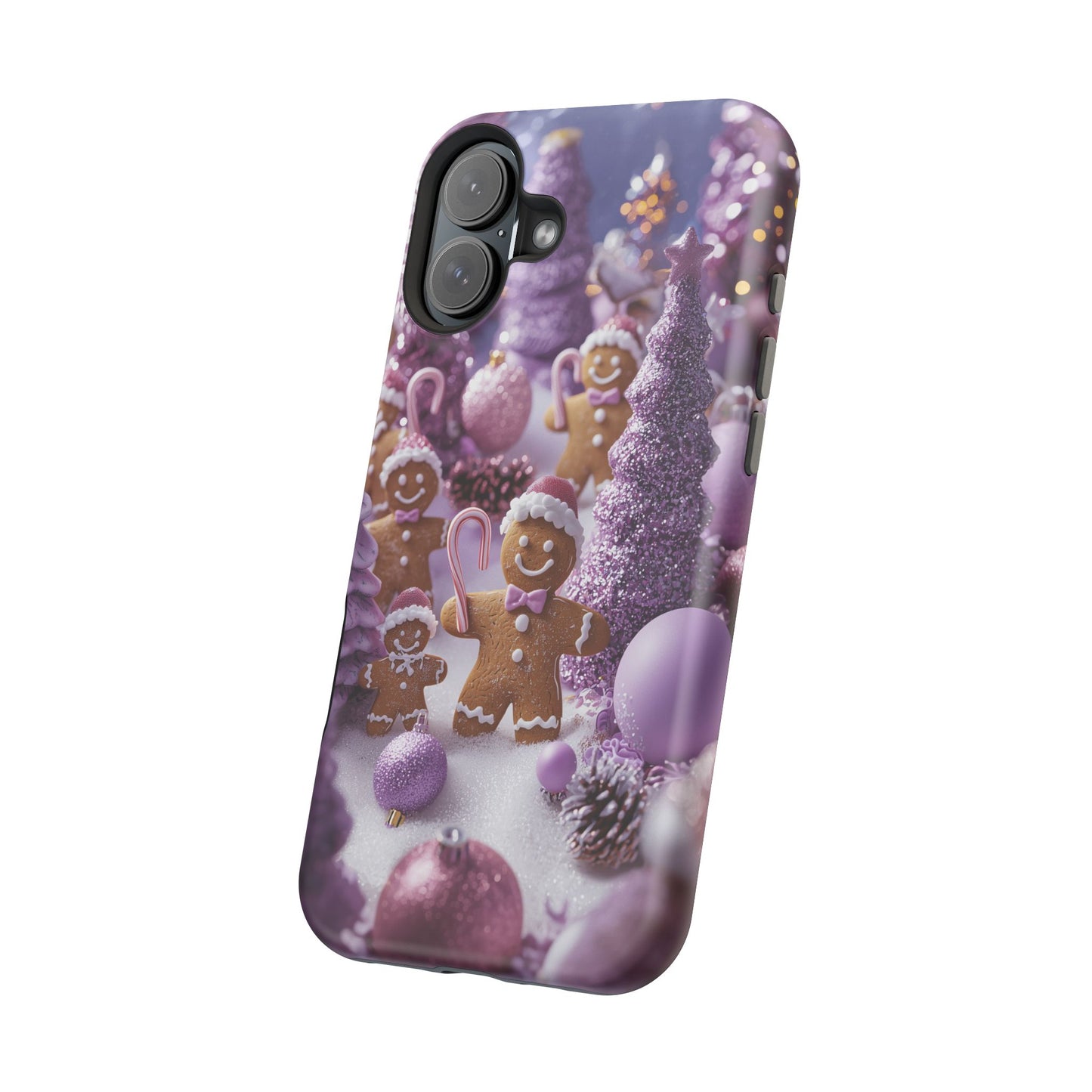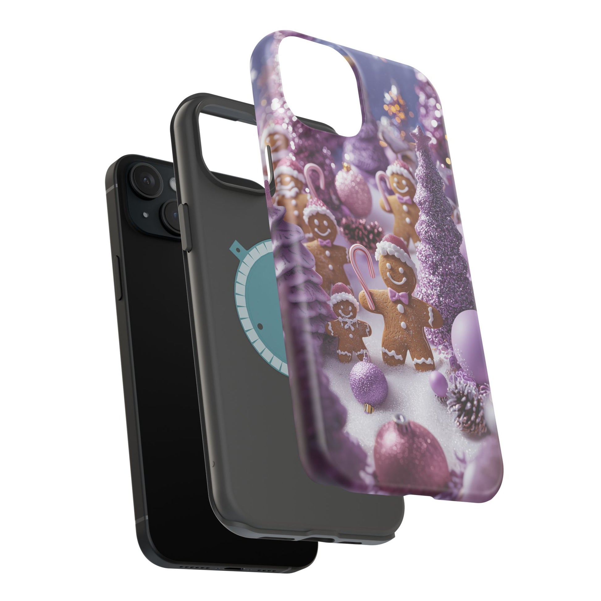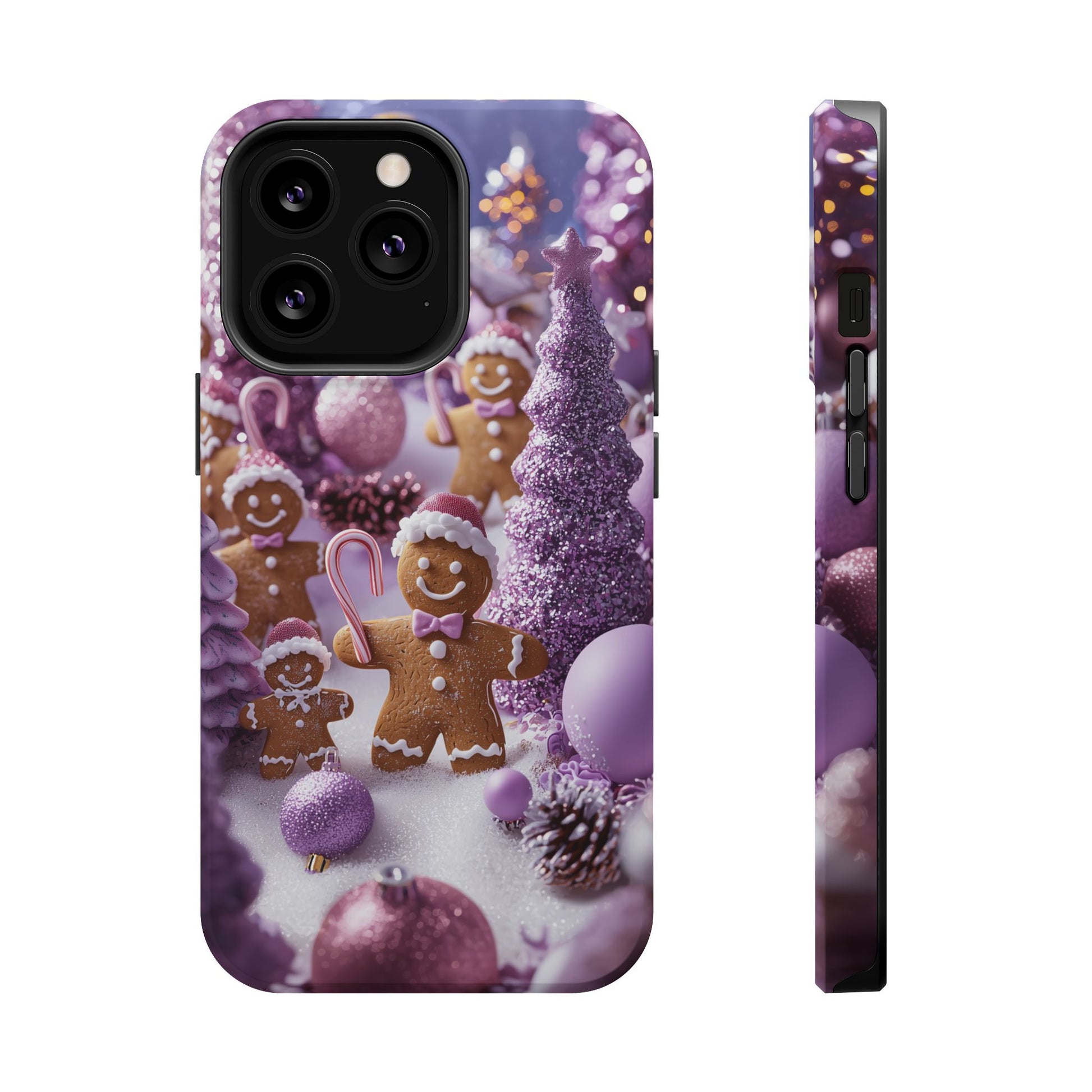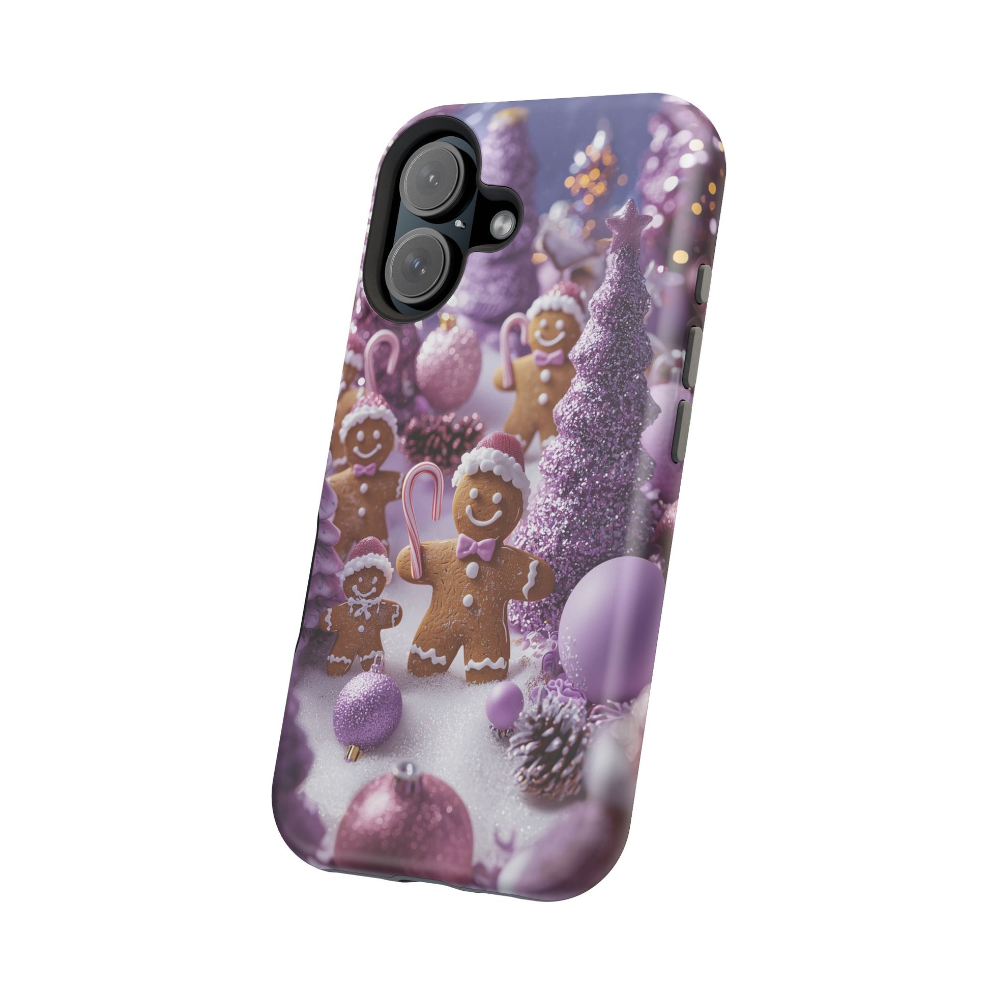 Step into a whimsical winter forest with our Pink Frosted Gingerbread Forest MagSafe iPhone case! This charming holiday design features a playful scene of gingerbread cookies dressed in Santa hats and bow ties, surrounded by sparkling pink and lavender Christmas trees, frosted ornaments, and f...